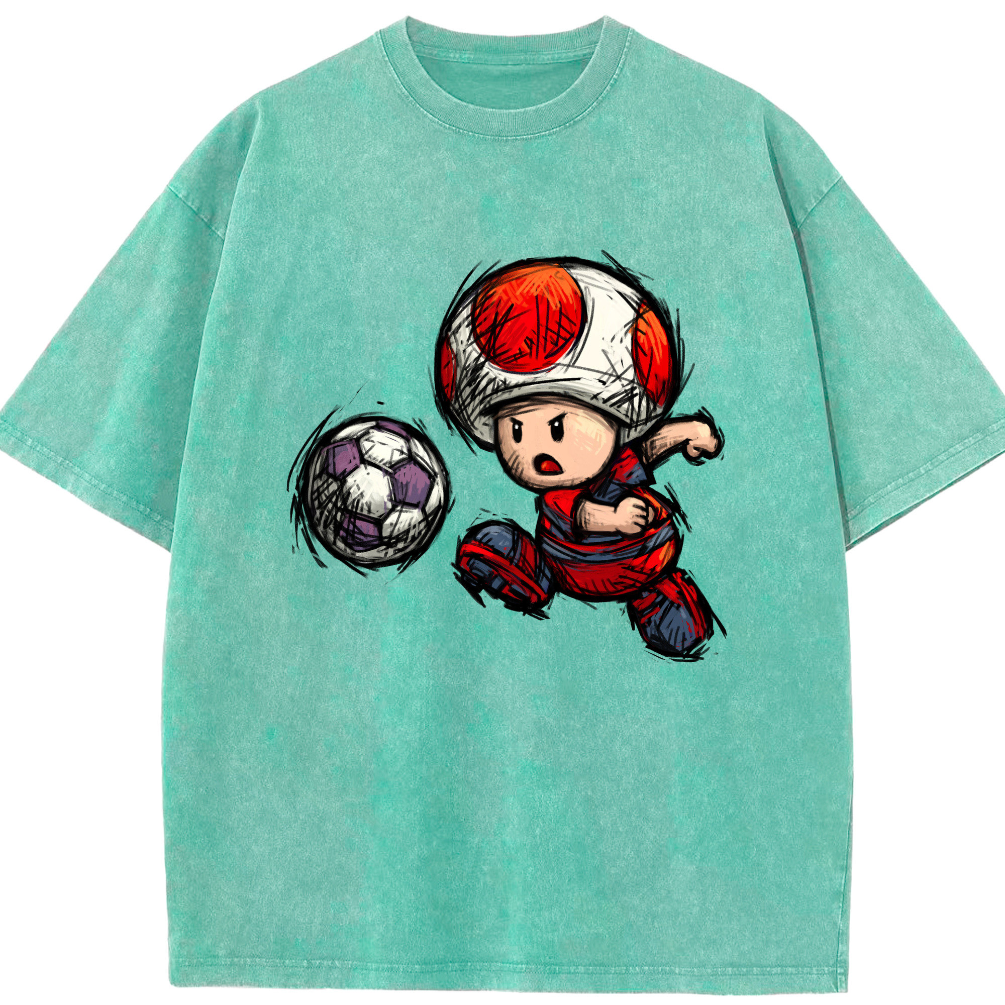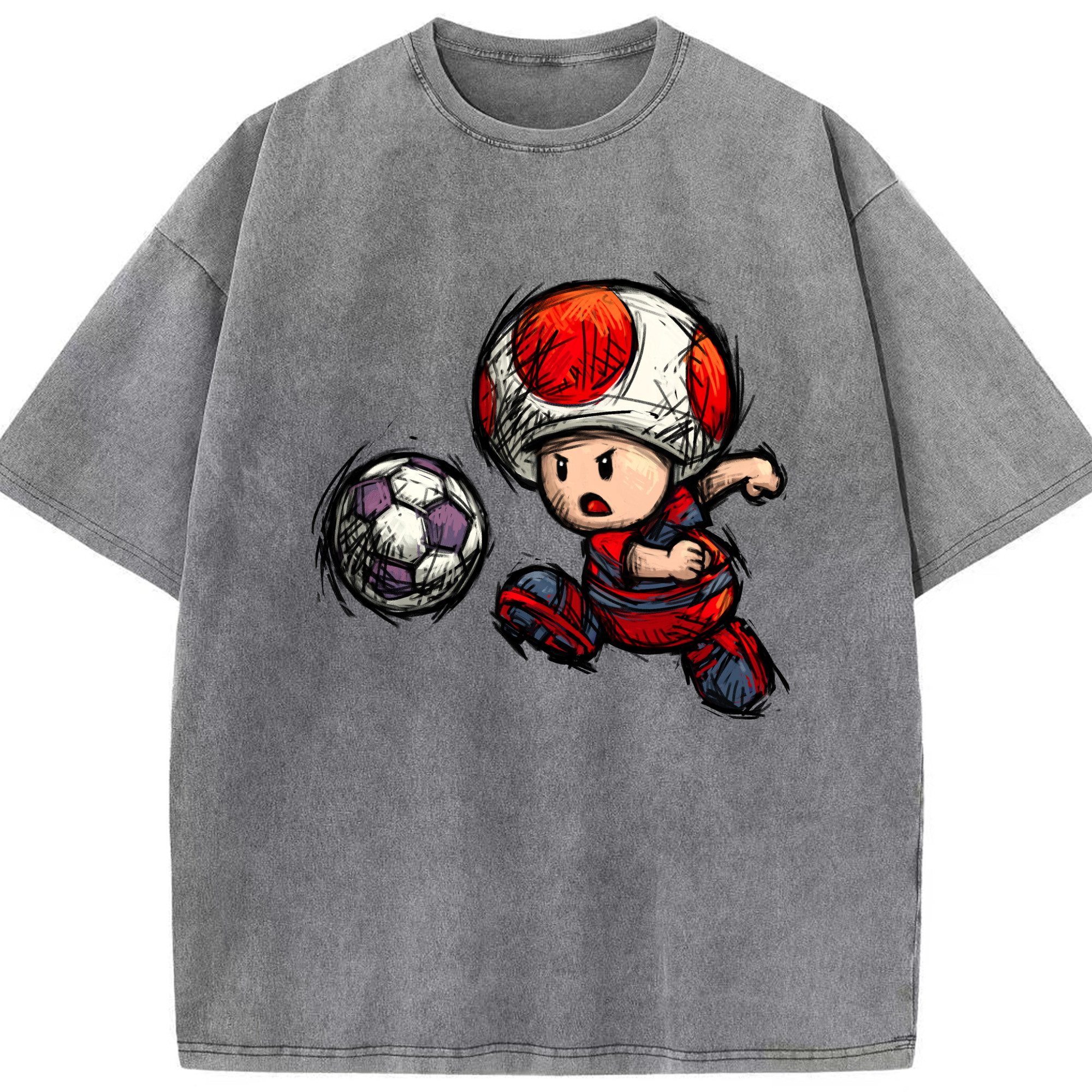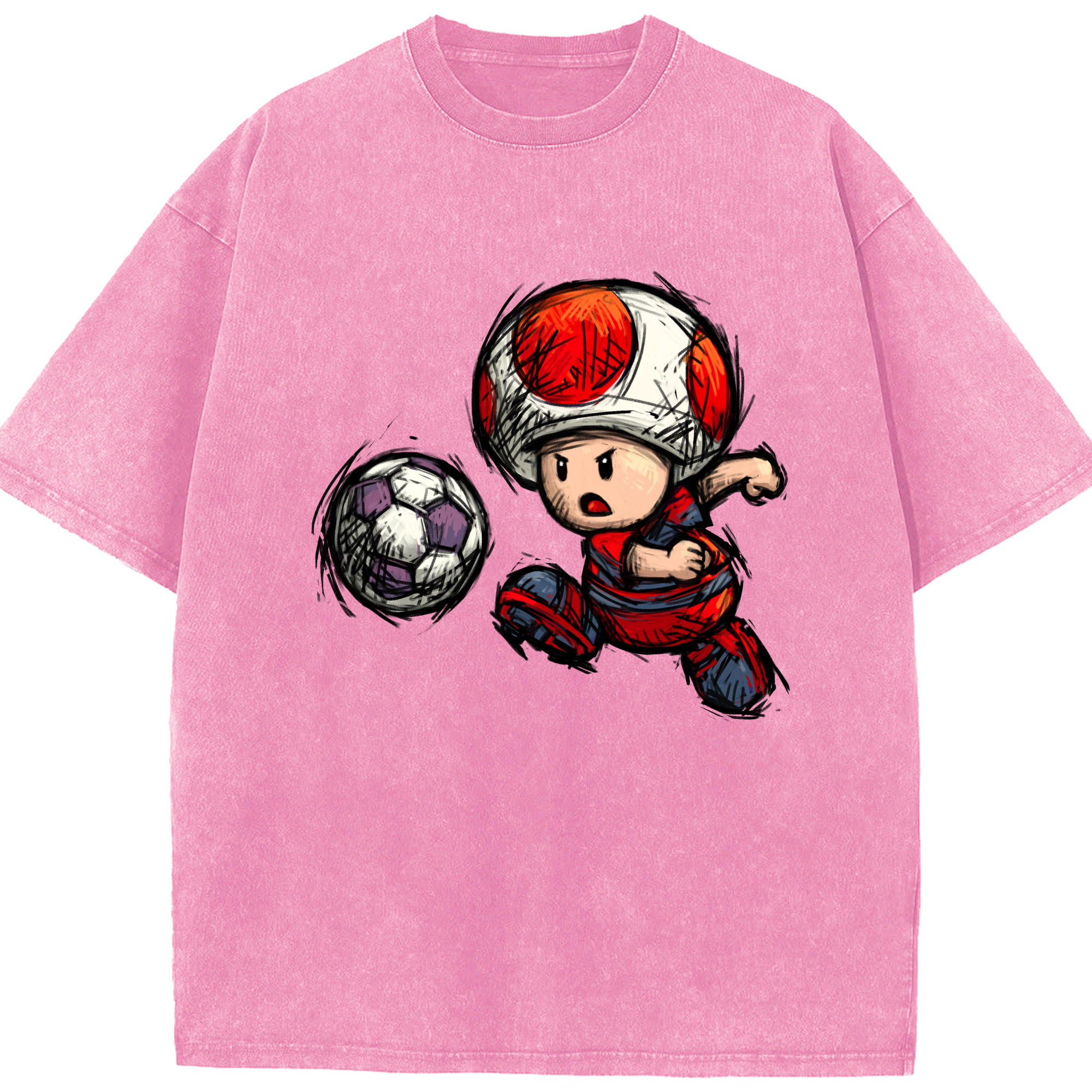 Nintendo Red 'pass football' Toad Shirt - Washed Vintage Look 230g Cotton Oversized T-Shirt With Front Heat Transfer Print – Soft, Lightweight, Stylish Fit – Comfortable Casual Wear For Sports & Everyday Use