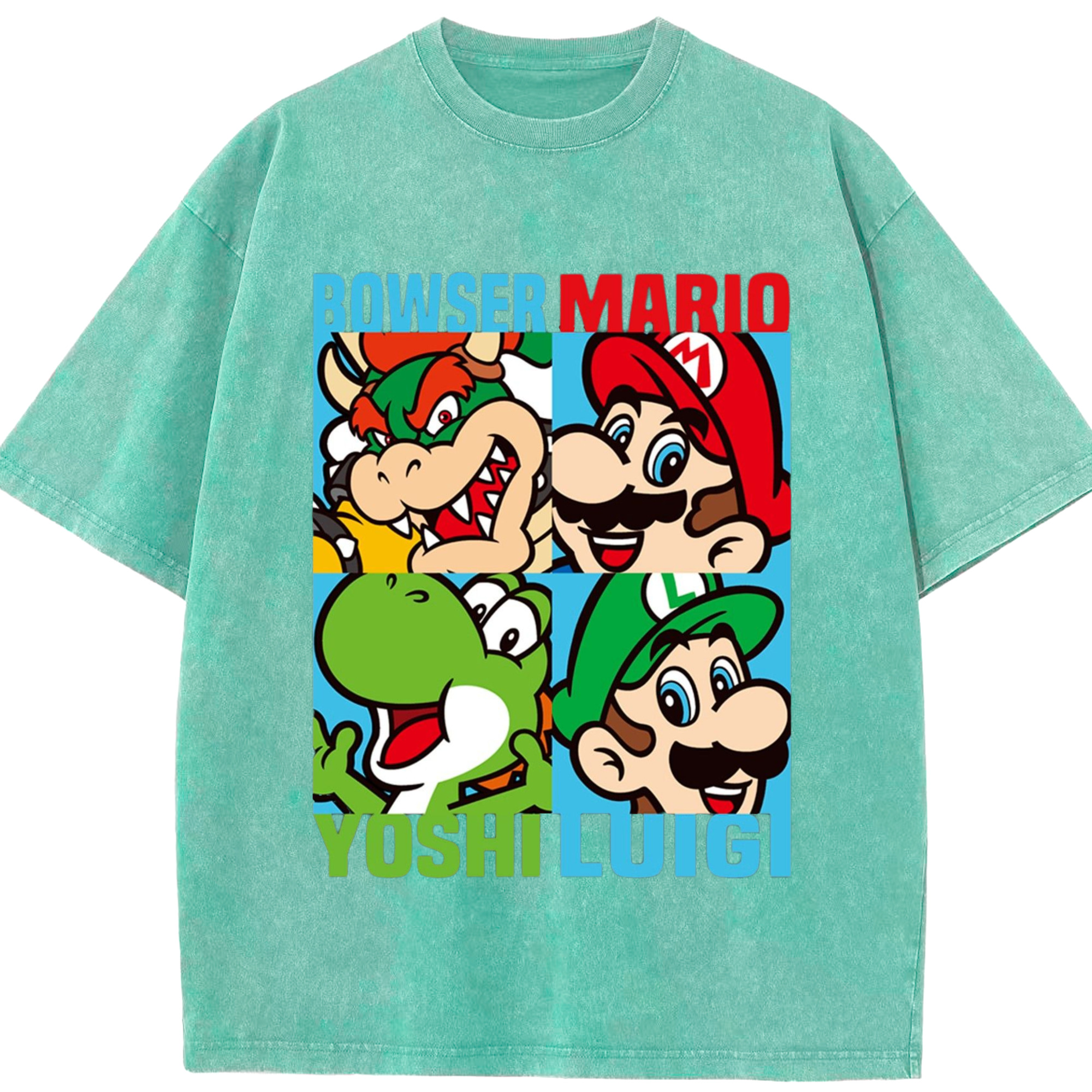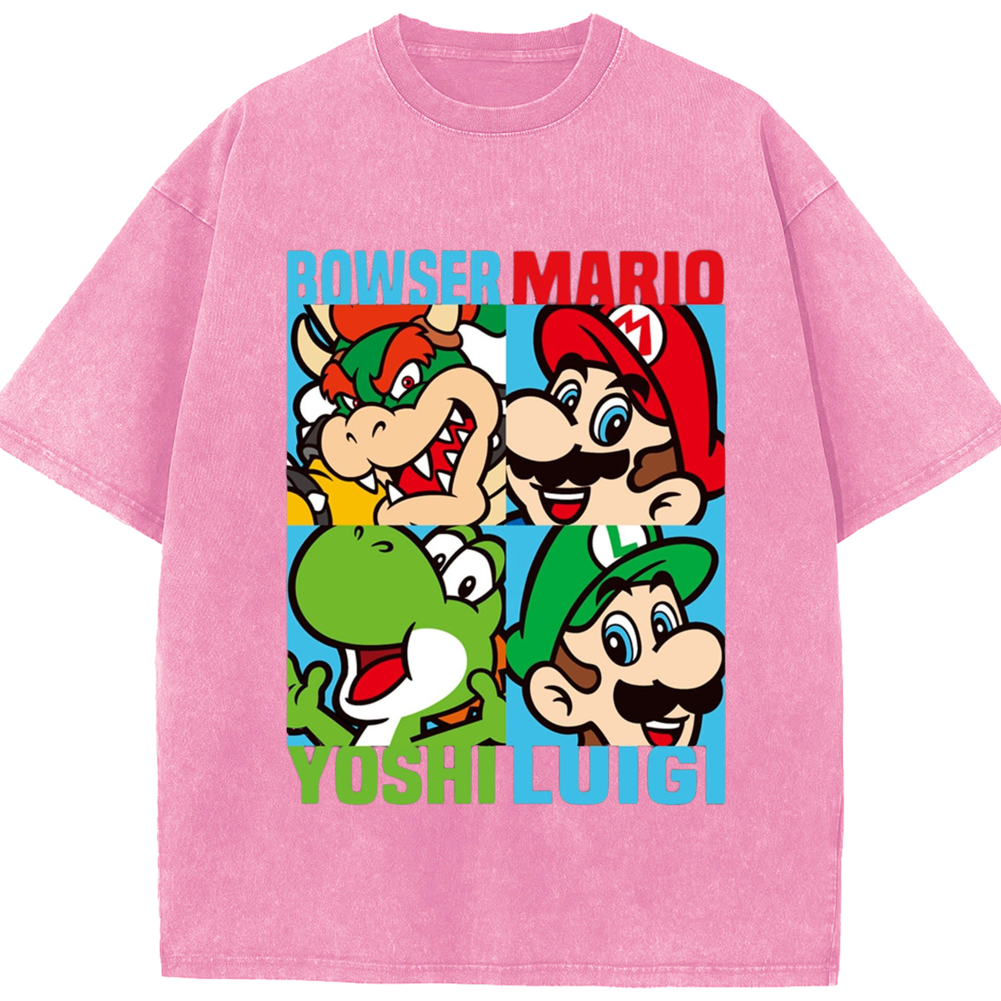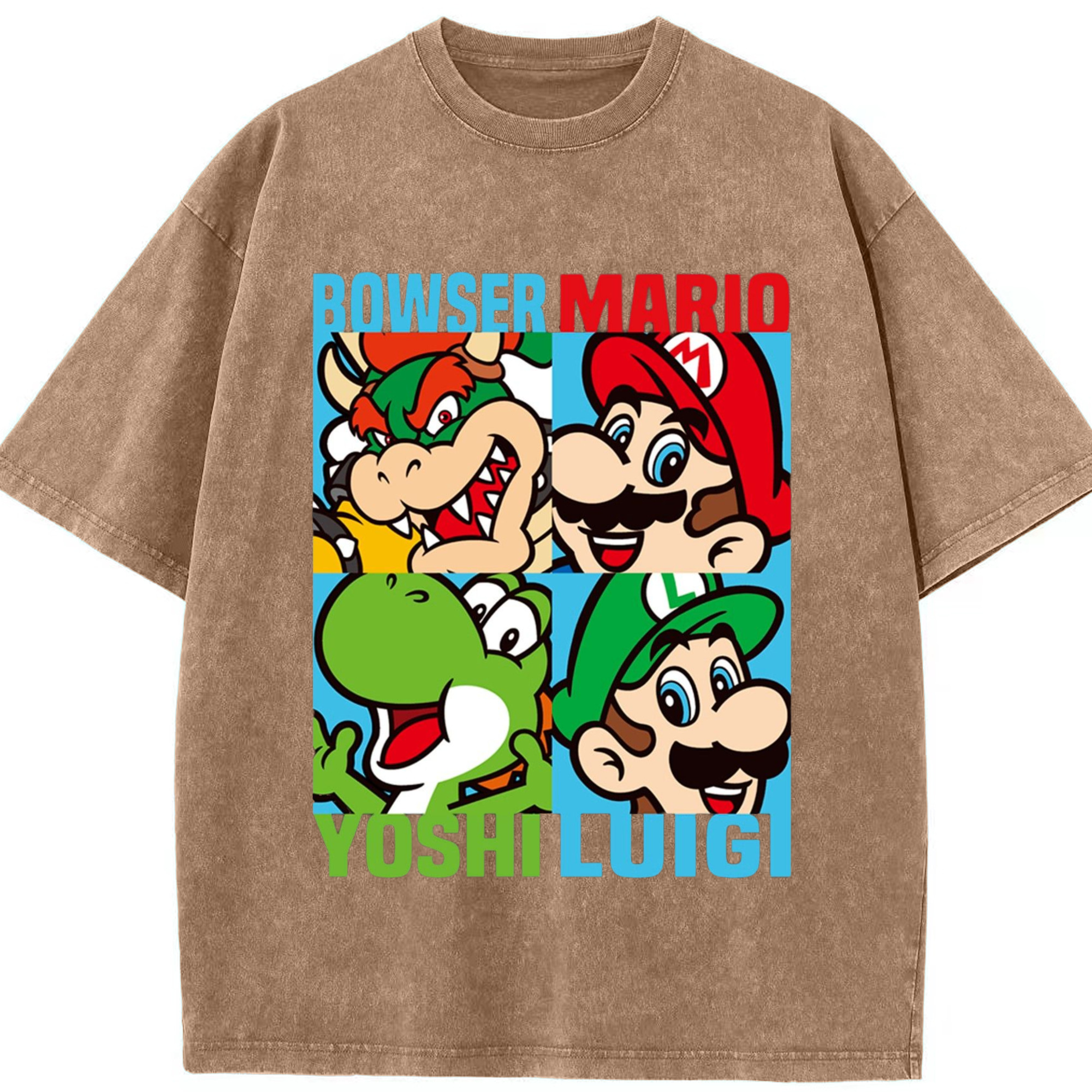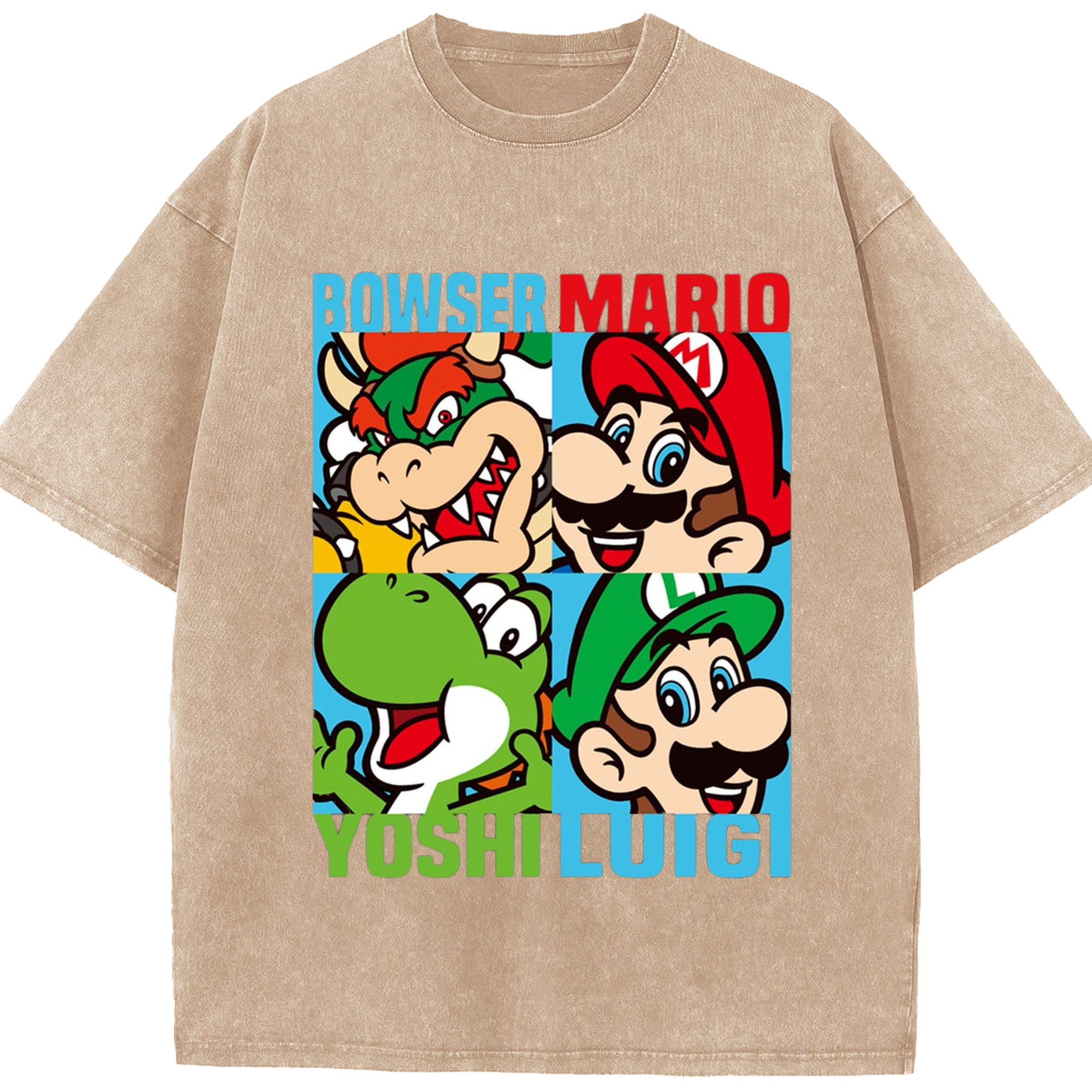 Nintendo Super Mario and firend's Shirts - Washed Vintage Look 230g Cotton Oversized T-Shirt With Front Heat Transfer Print – Soft, Lightweight, Stylish Fit – Comfortable Casual Wear For Sports & Everyday Use