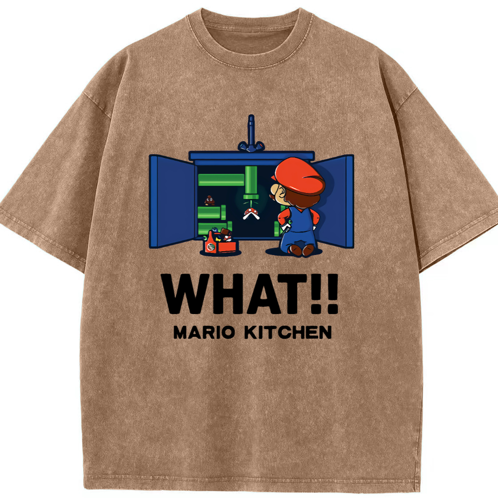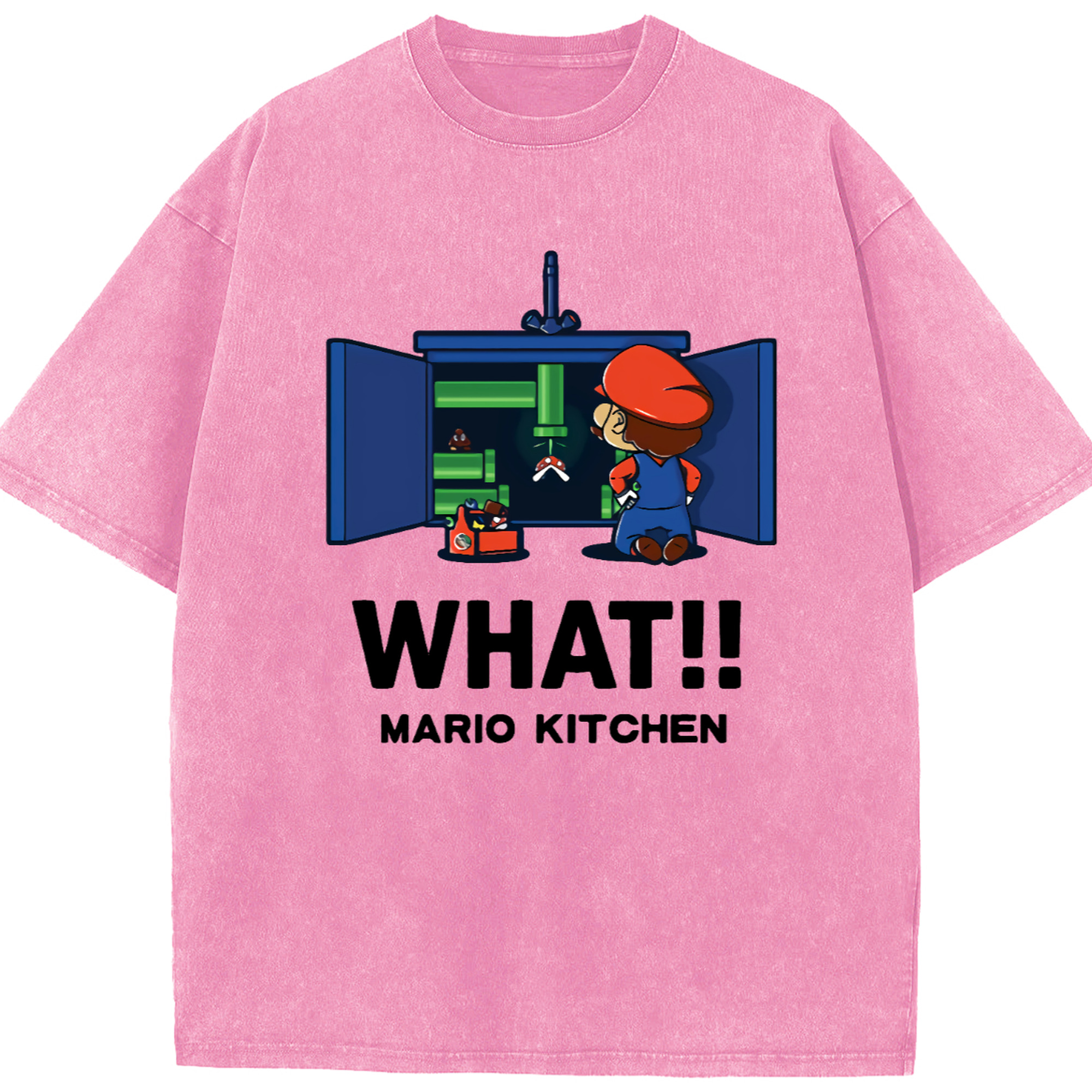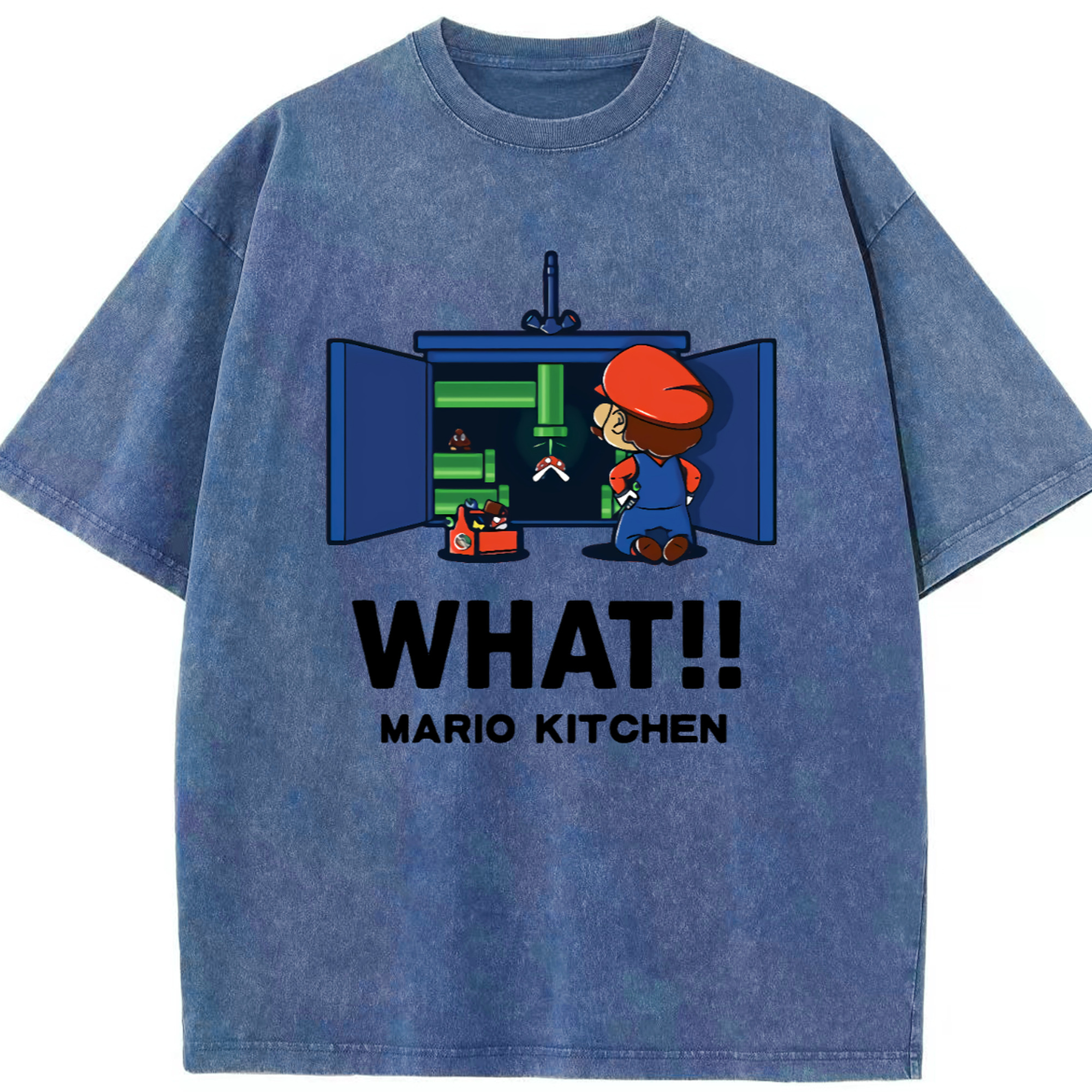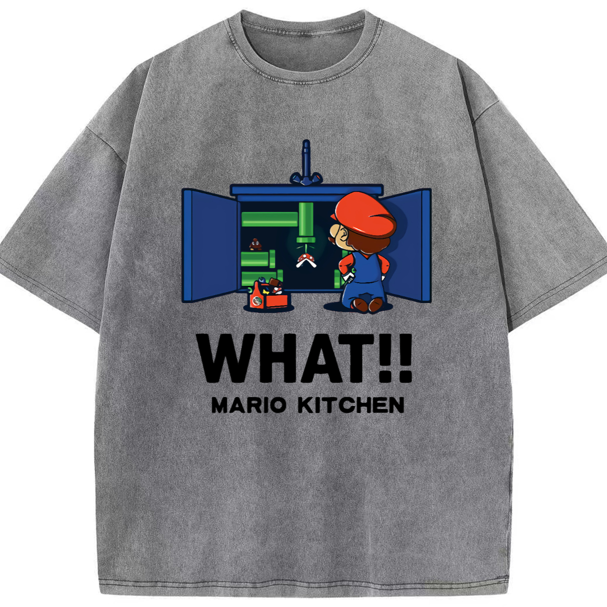 Nintendo Super Mario kitchen 'what' t-shirt - Washed Vintage Look 230g Cotton Oversized T-Shirt With Front Heat Transfer Print – Soft, Lightweight, Stylish Fit – Comfortable Casual Wear For Sports & Everyday Use