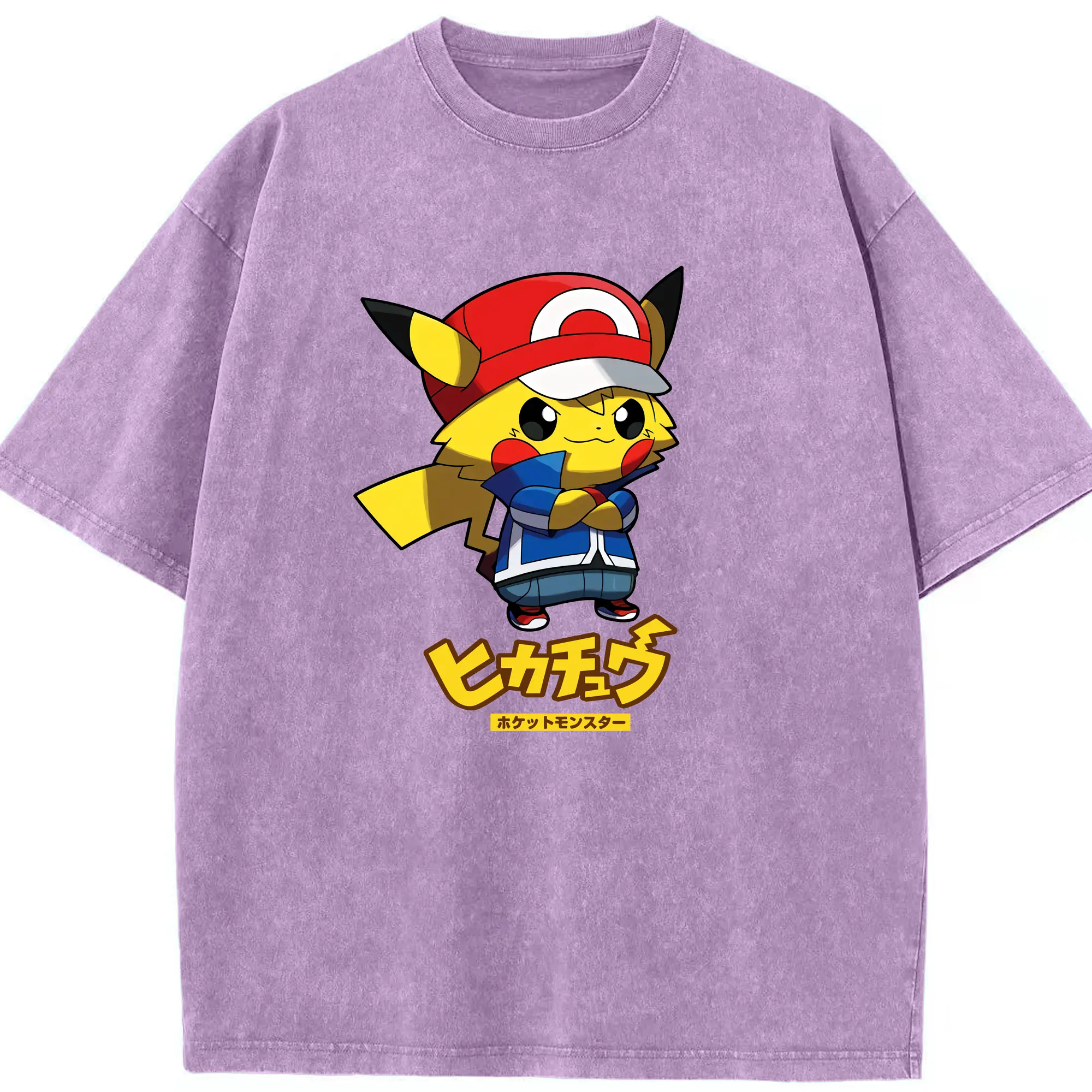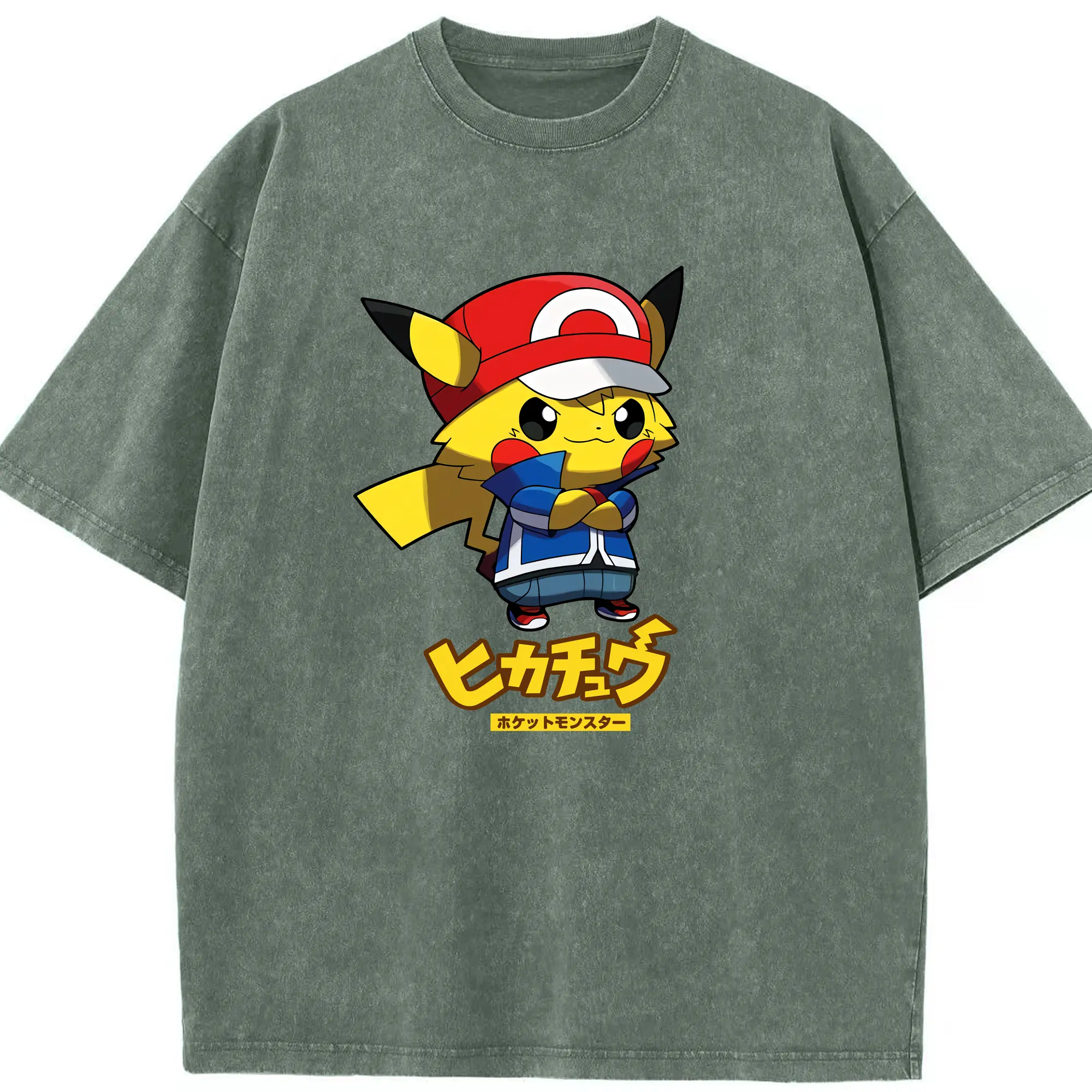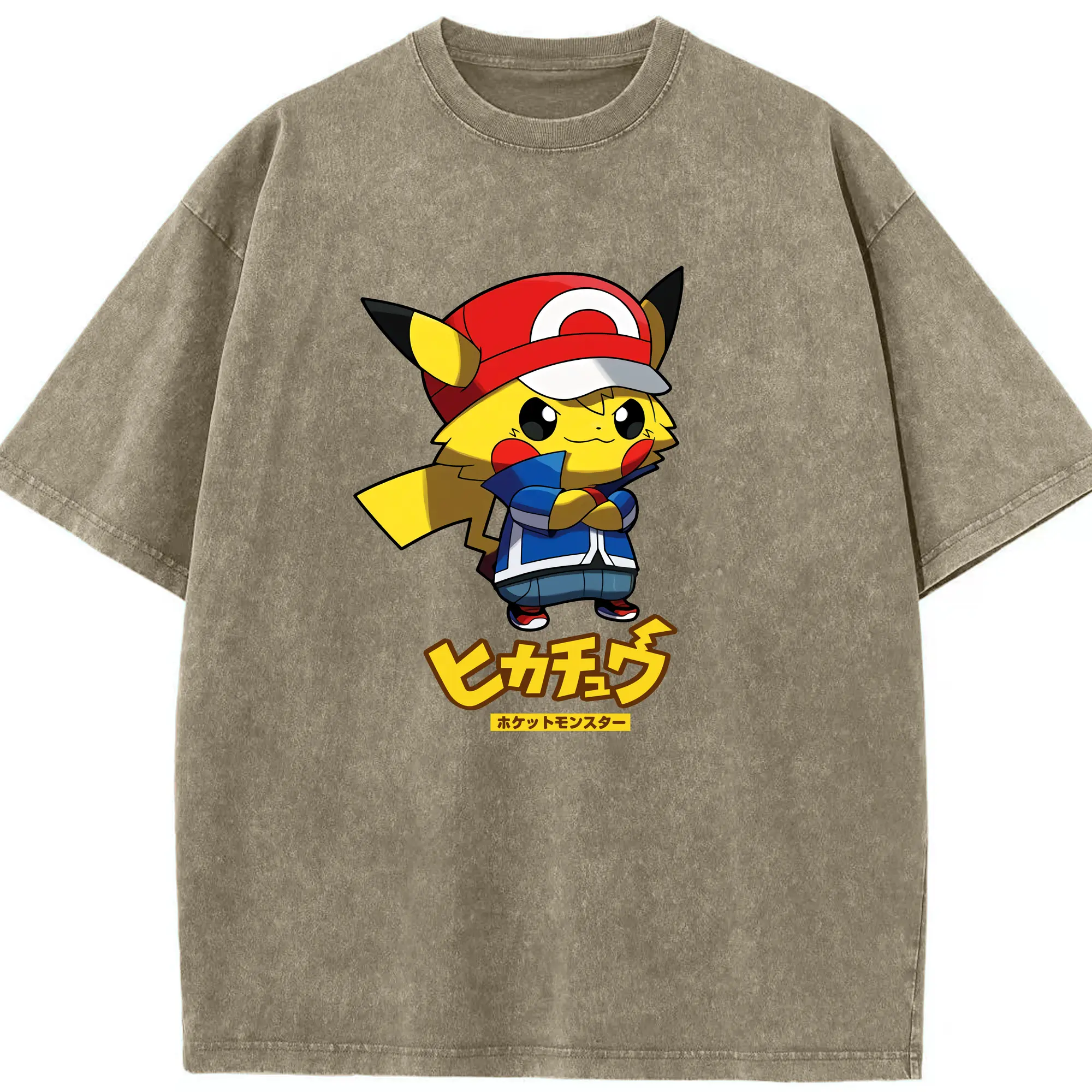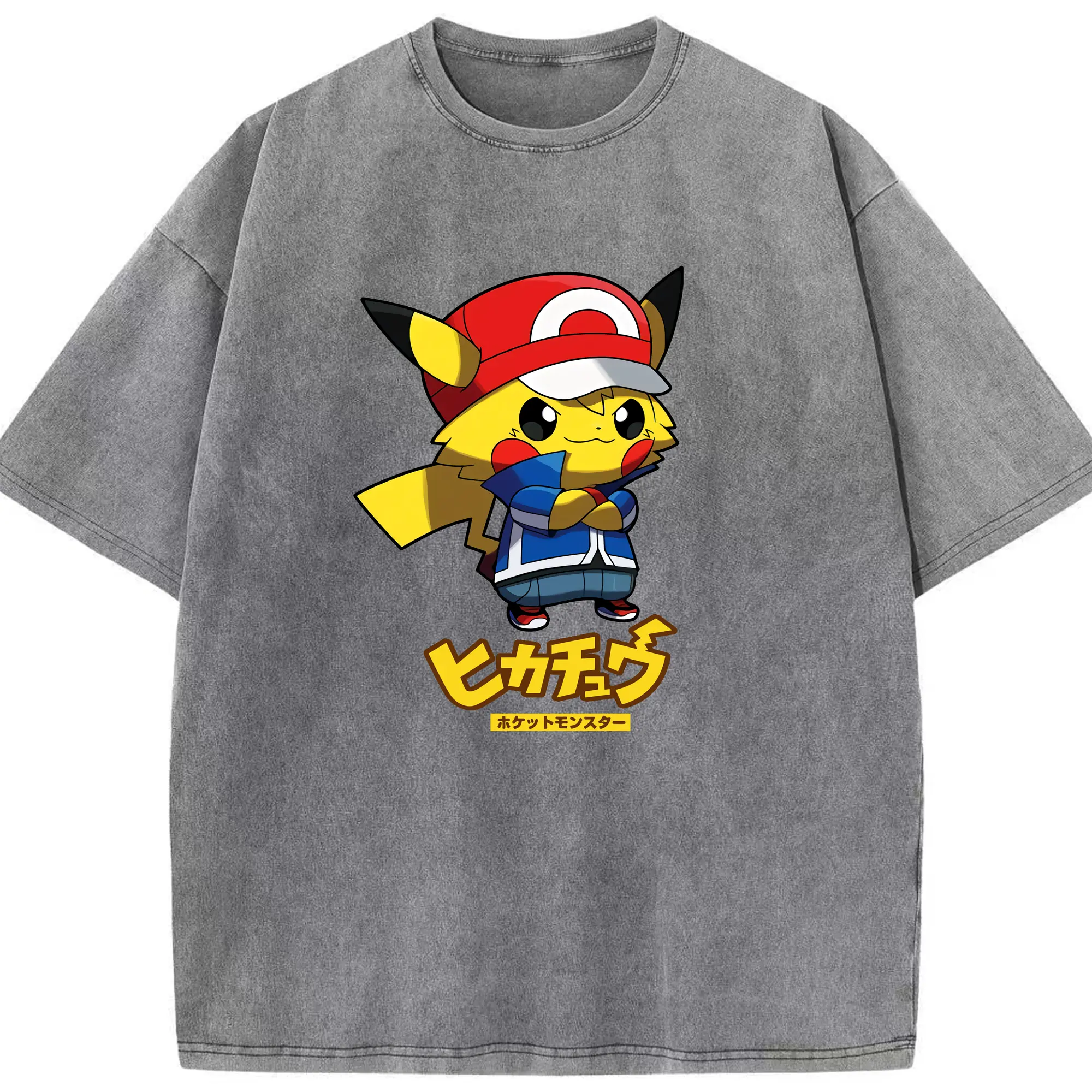 Pikachu graphic tee - Washed Vintage Look 230g Cotton Oversized T-Shirt With Front Heat Transfer Print – Soft, Lightweight, Stylish Fit – Comfortable Casual Wear For Sports & Everyday Use