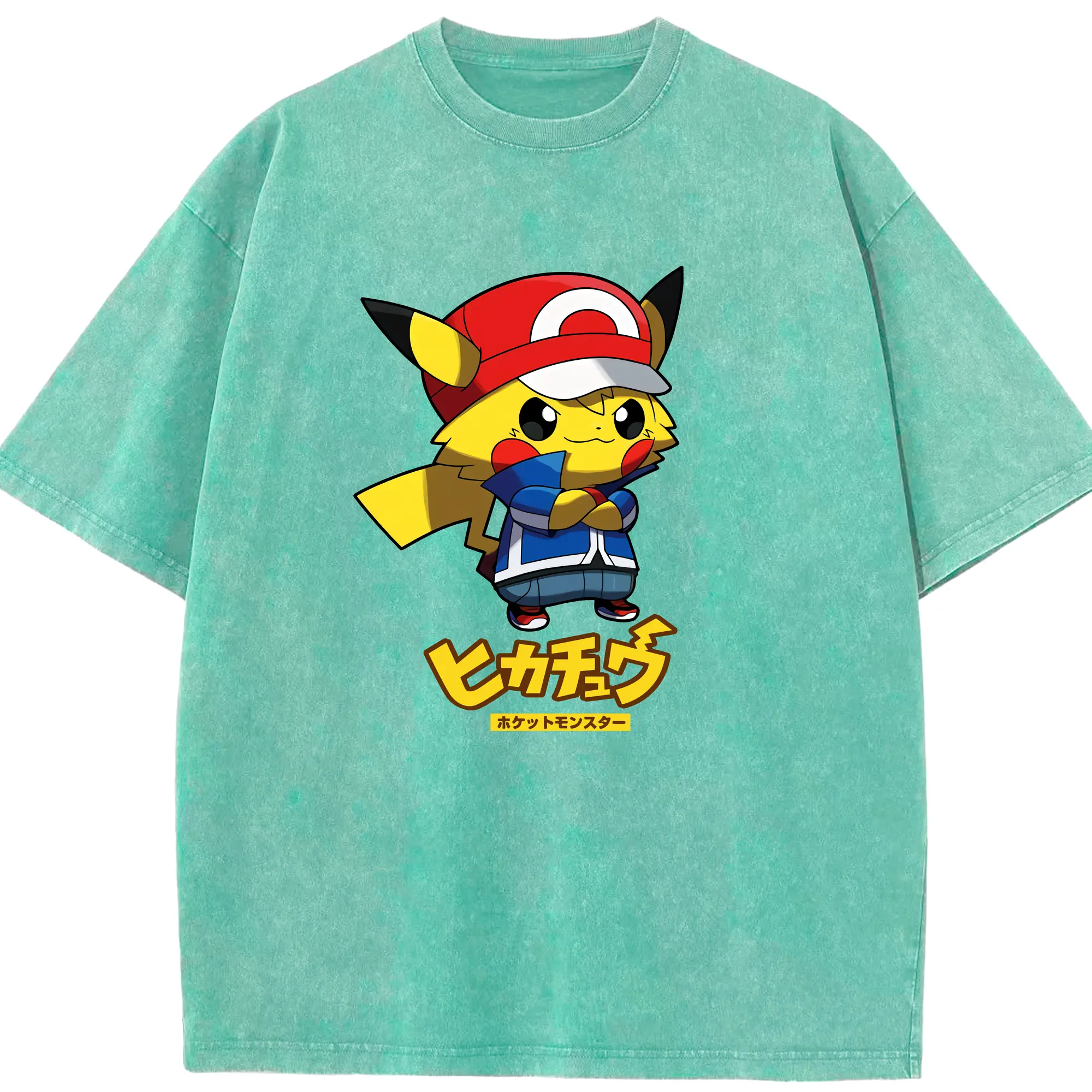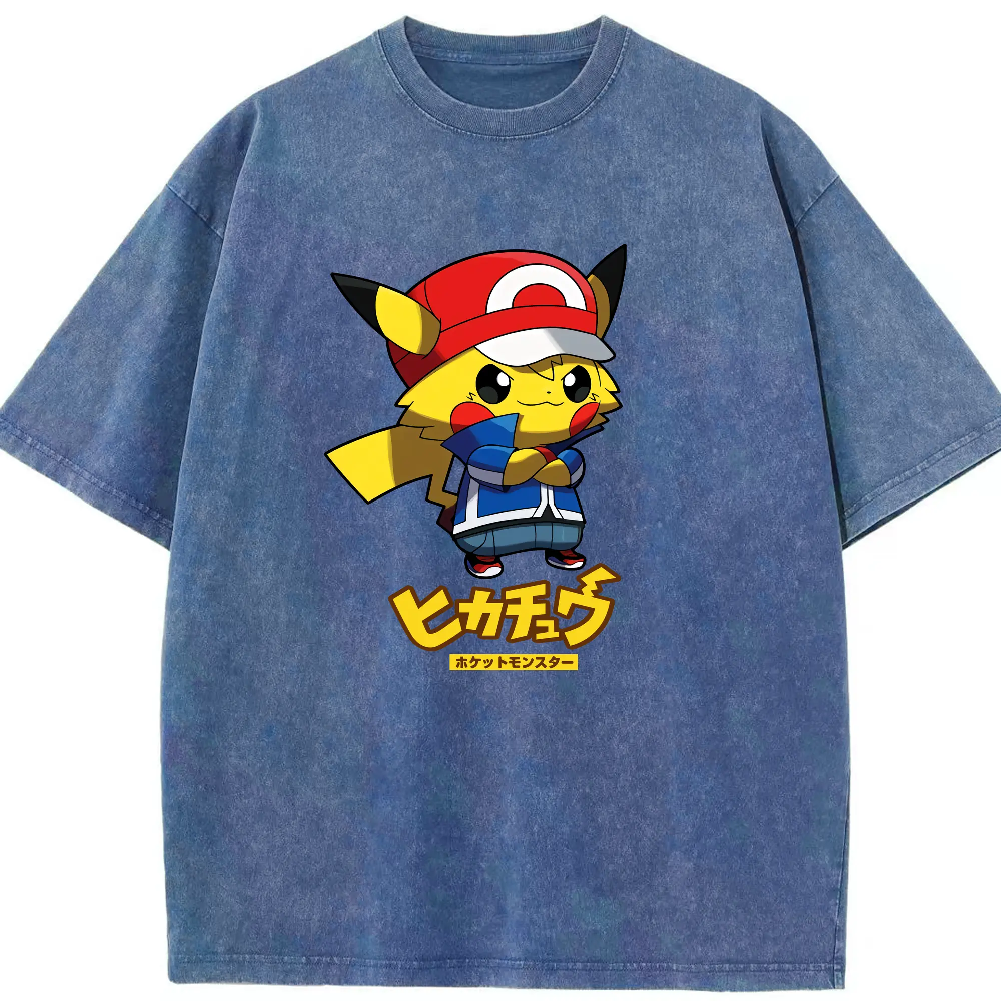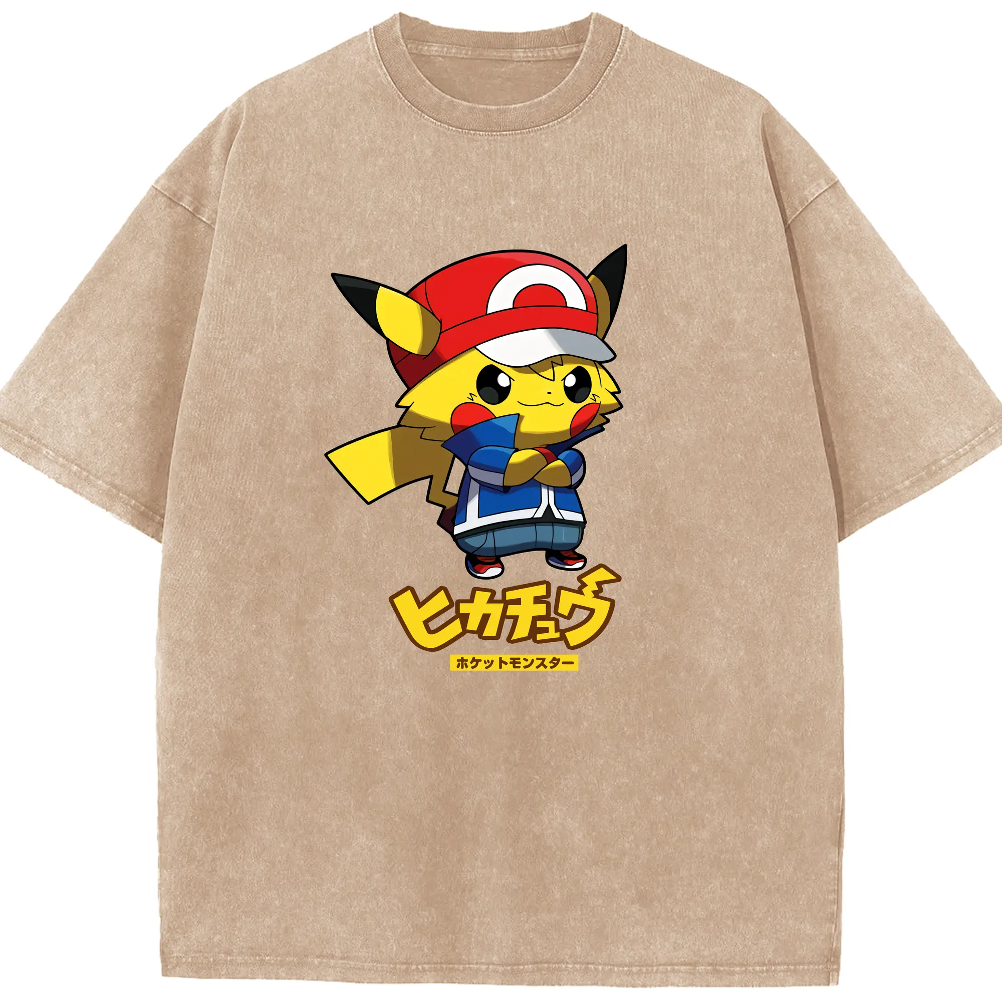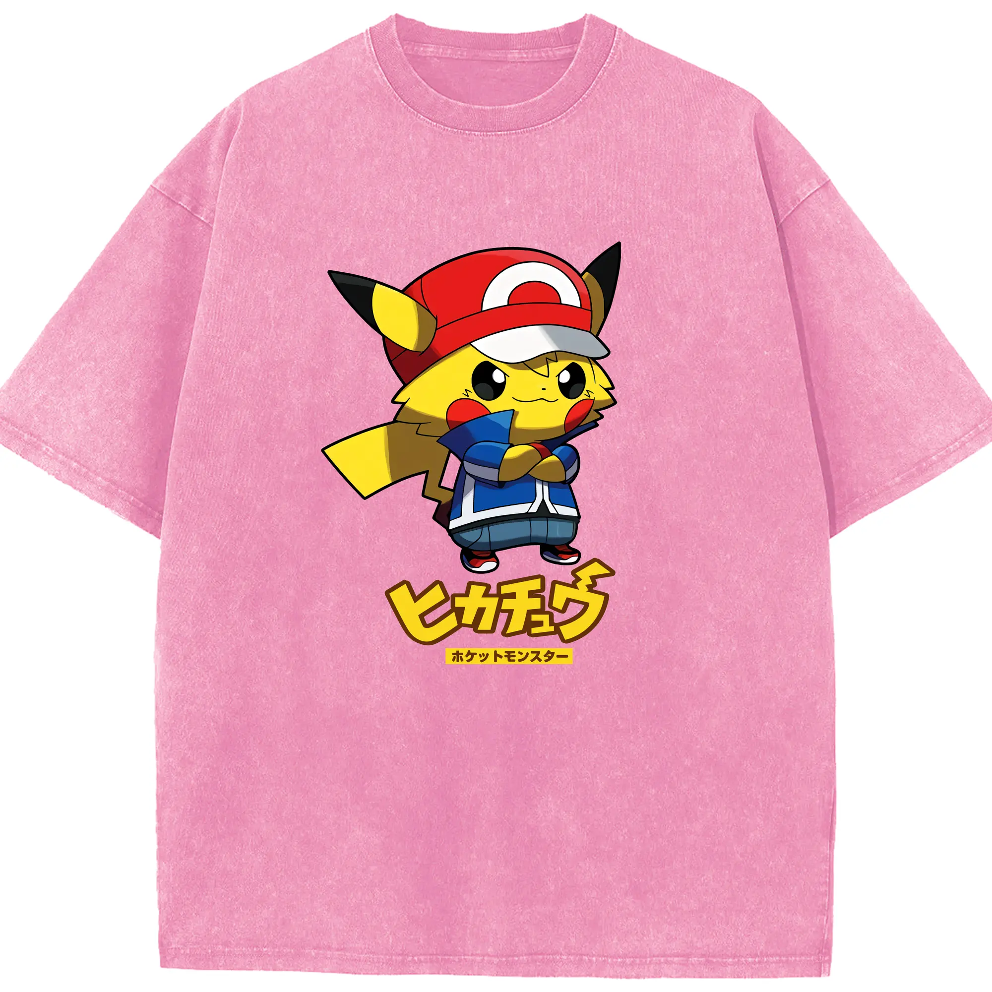 Pikachu graphic tee - Washed Vintage Look 230g Cotton Oversized T-Shirt With Front Heat Transfer Print – Soft, Lightweight, Stylish Fit – Comfortable Casual Wear For Sports & Everyday Use
