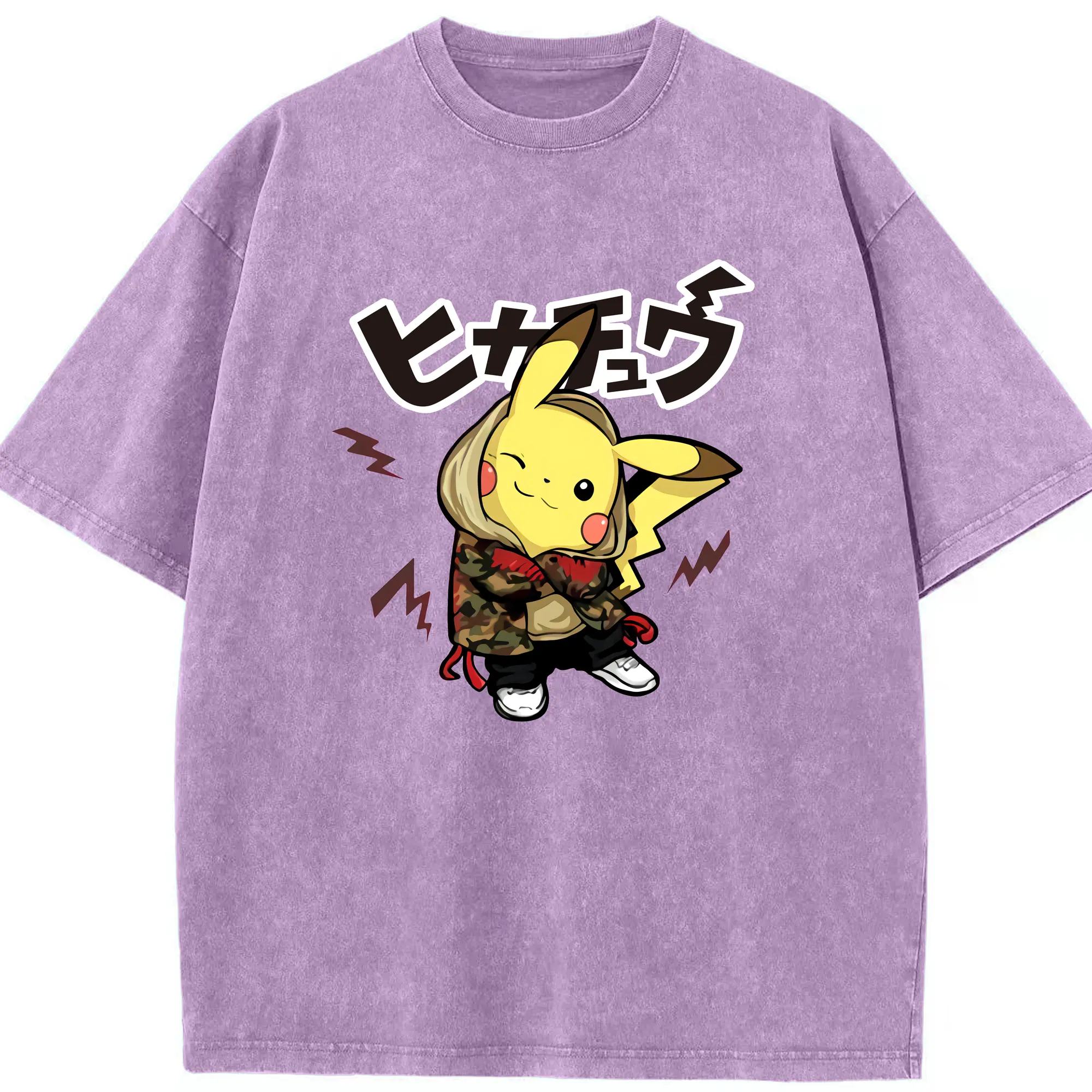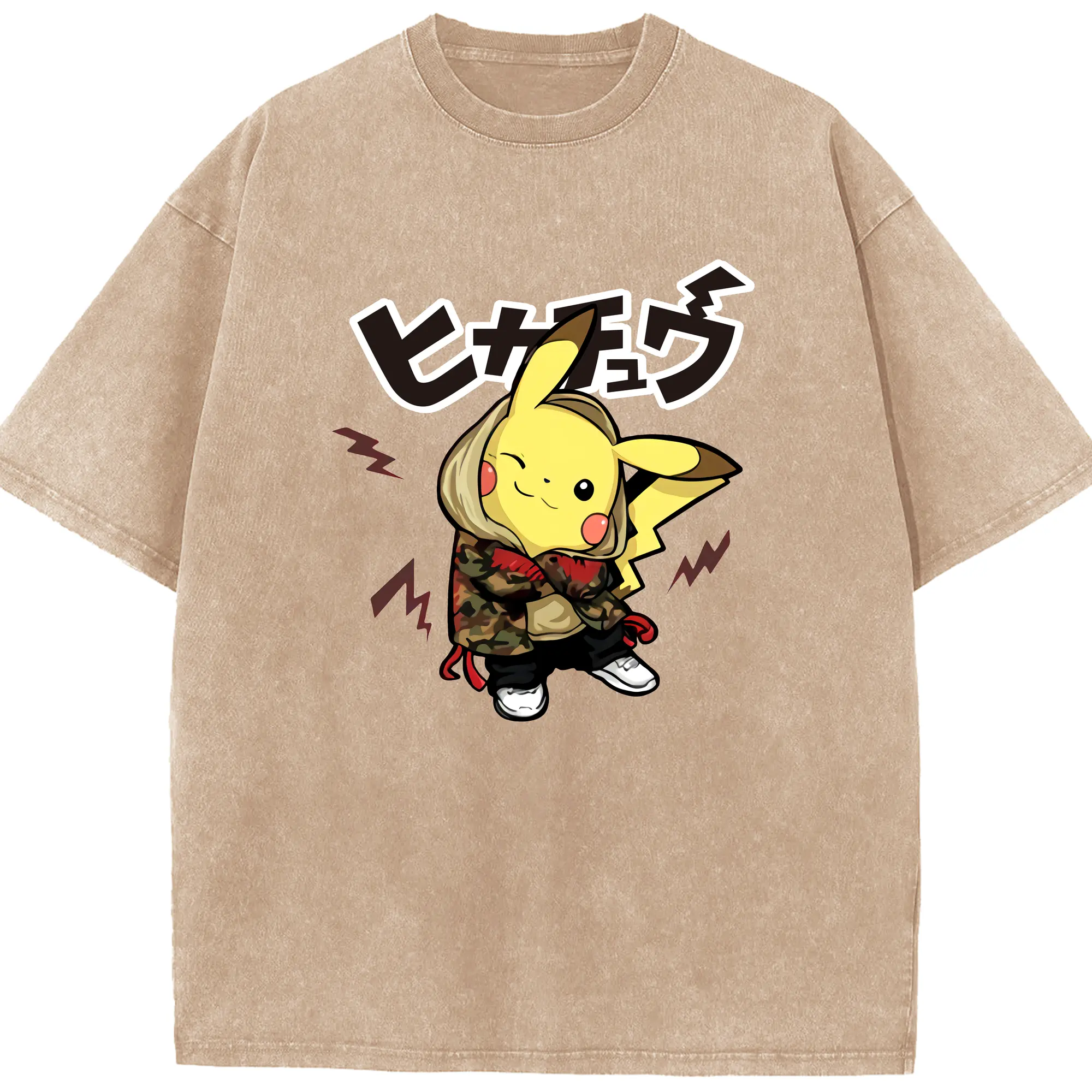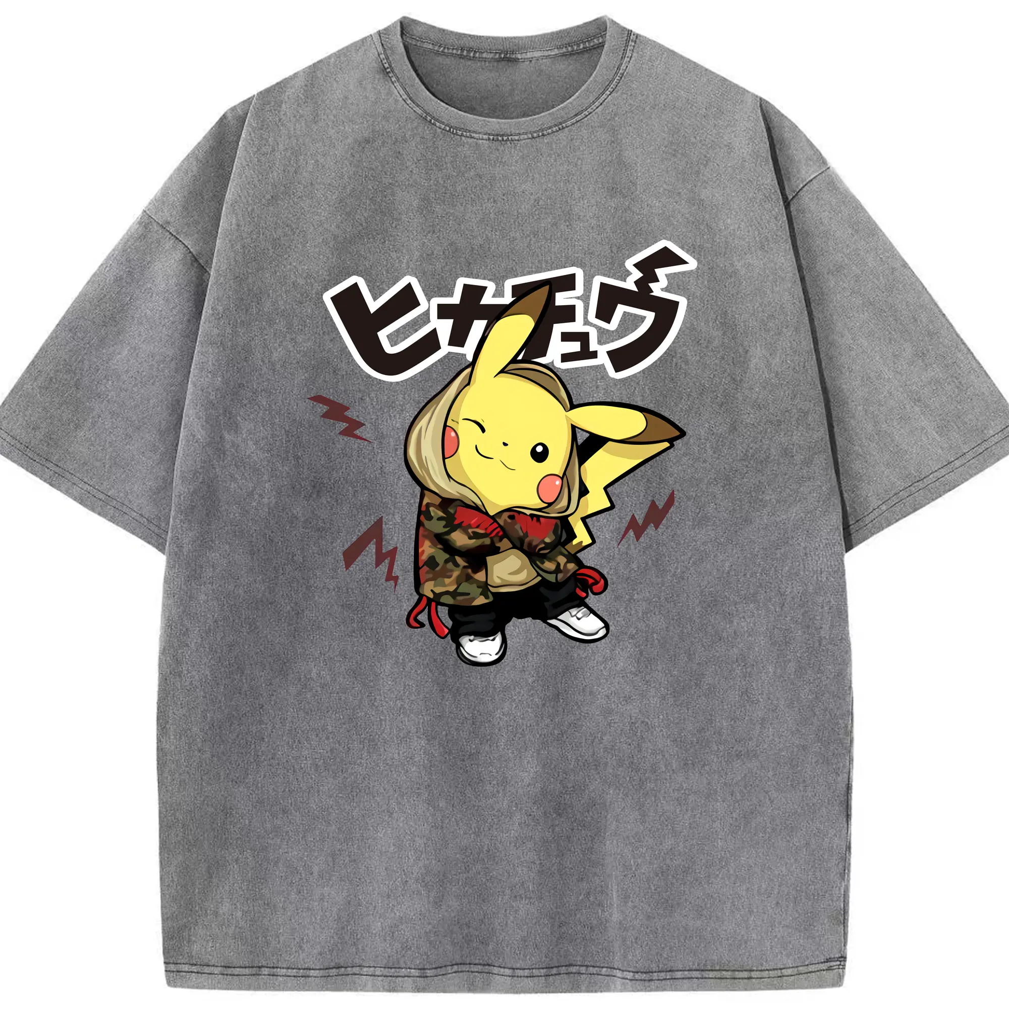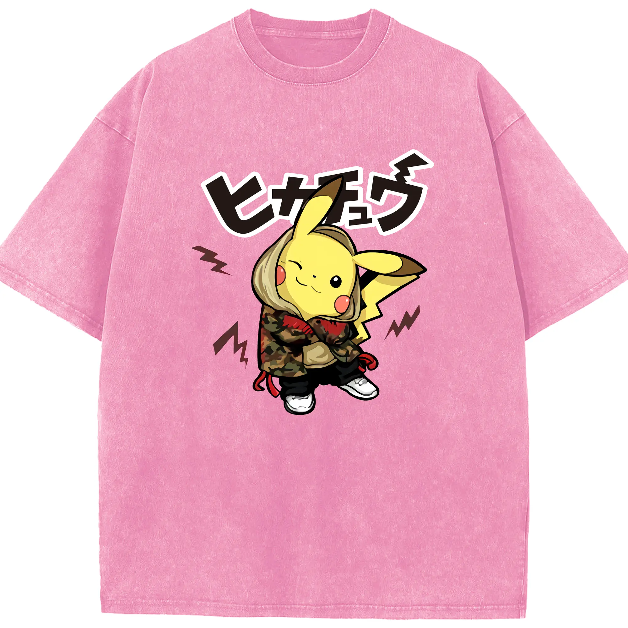Pikachu graphic tide t shirt​ - Washed Vintage Look 230g Cotton Oversized T-Shirt With Front Heat Transfer Print – Soft, Lightweight, Stylish Fit – Comfortable Casual Wear For Sports & Everyday Use
