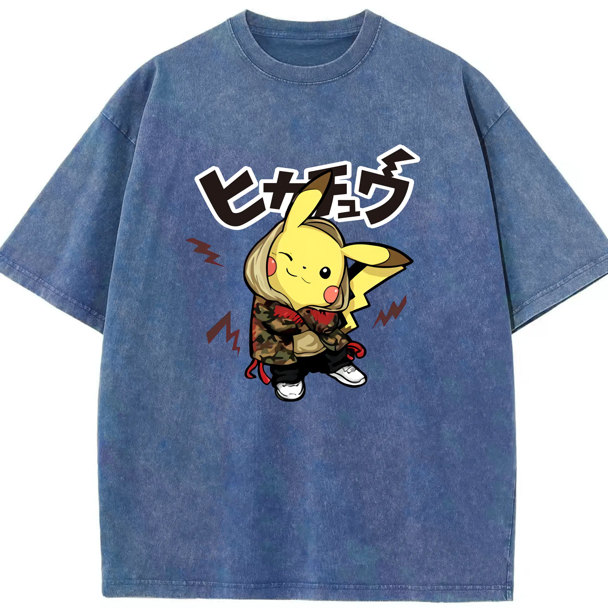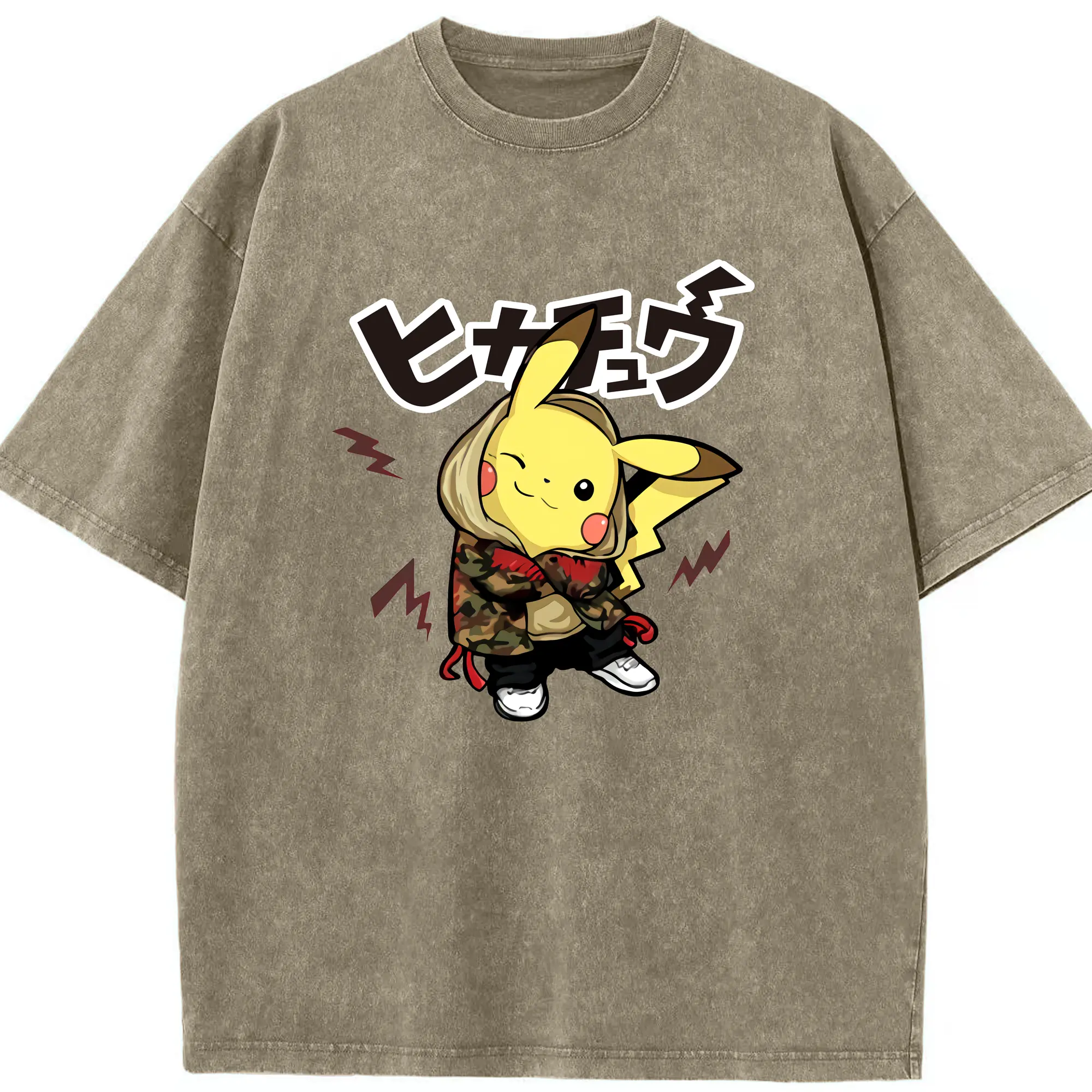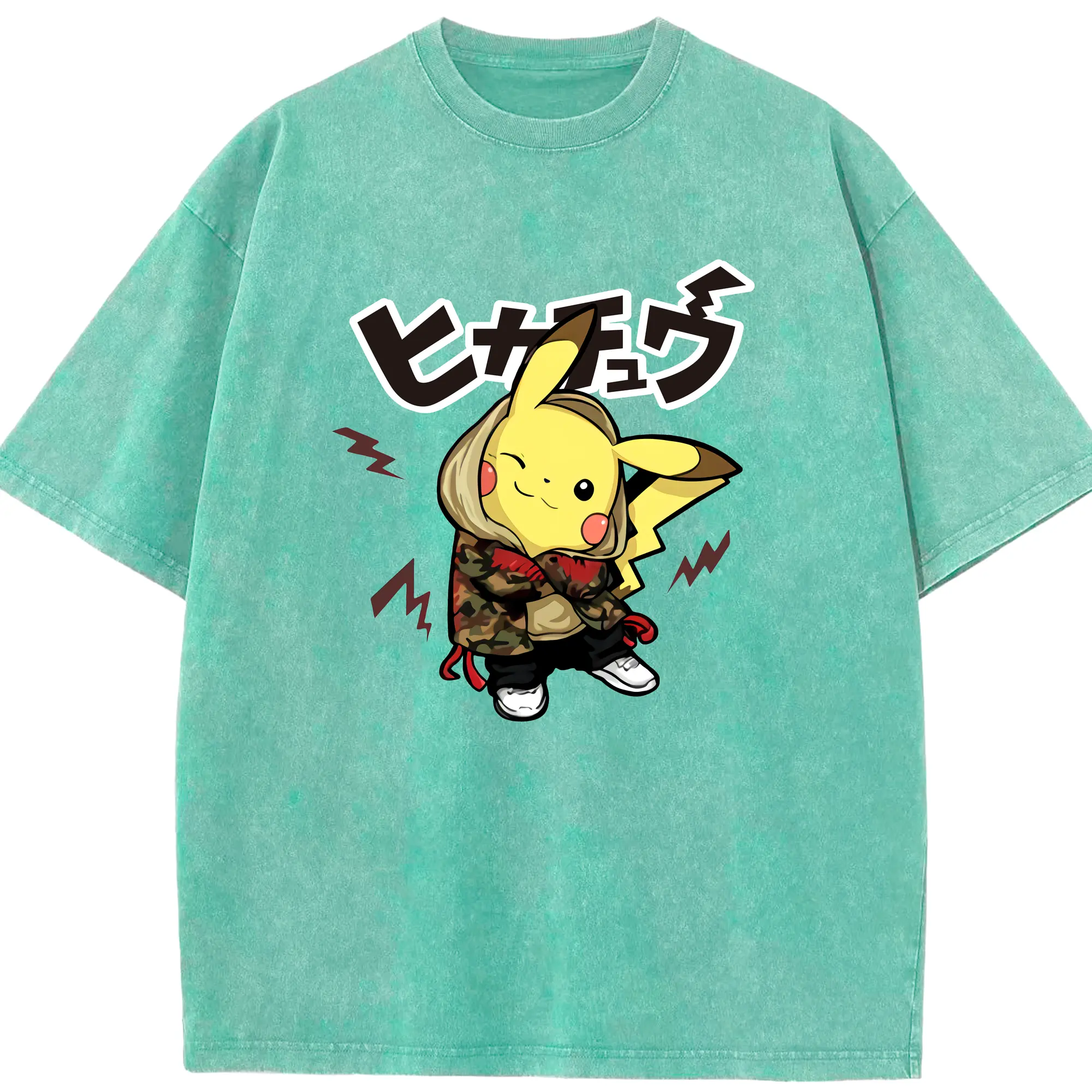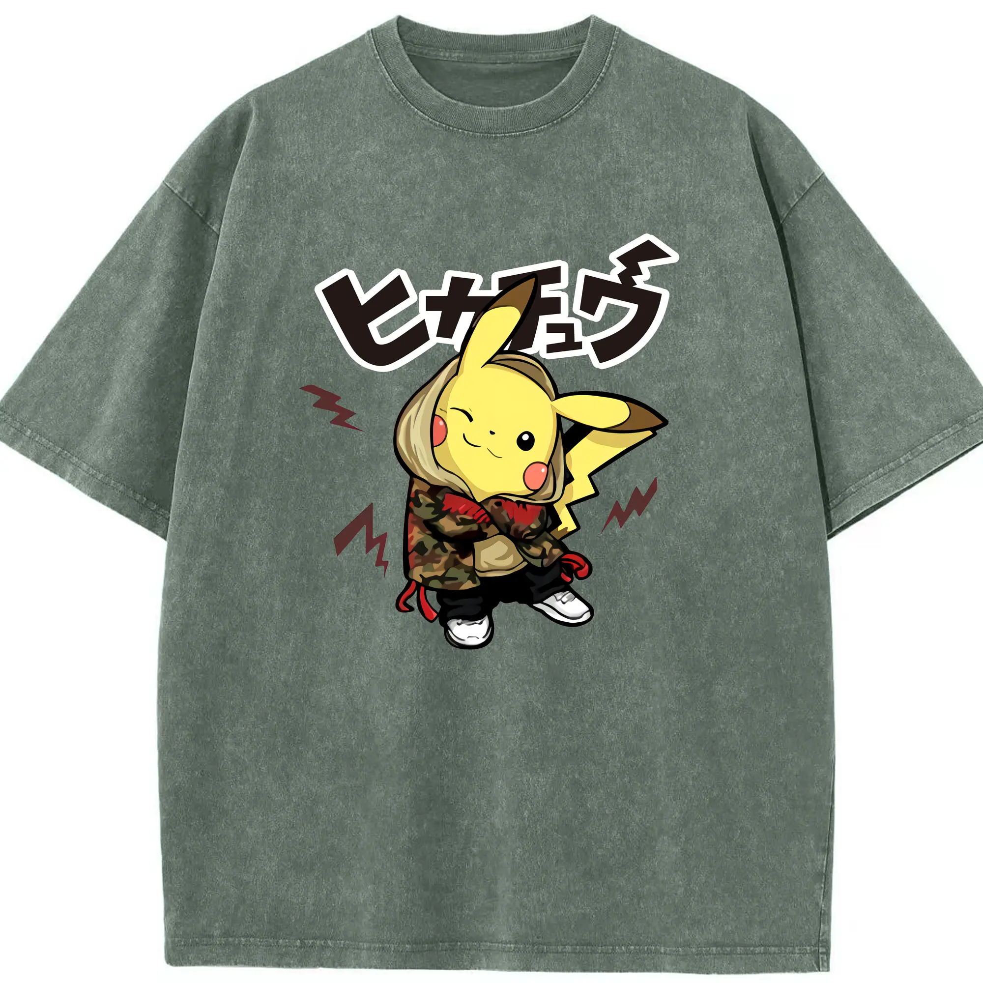 Pikachu graphic tide t shirt​ - Washed Vintage Look 230g Cotton Oversized T-Shirt With Front Heat Transfer Print – Soft, Lightweight, Stylish Fit – Comfortable Casual Wear For Sports & Everyday Use