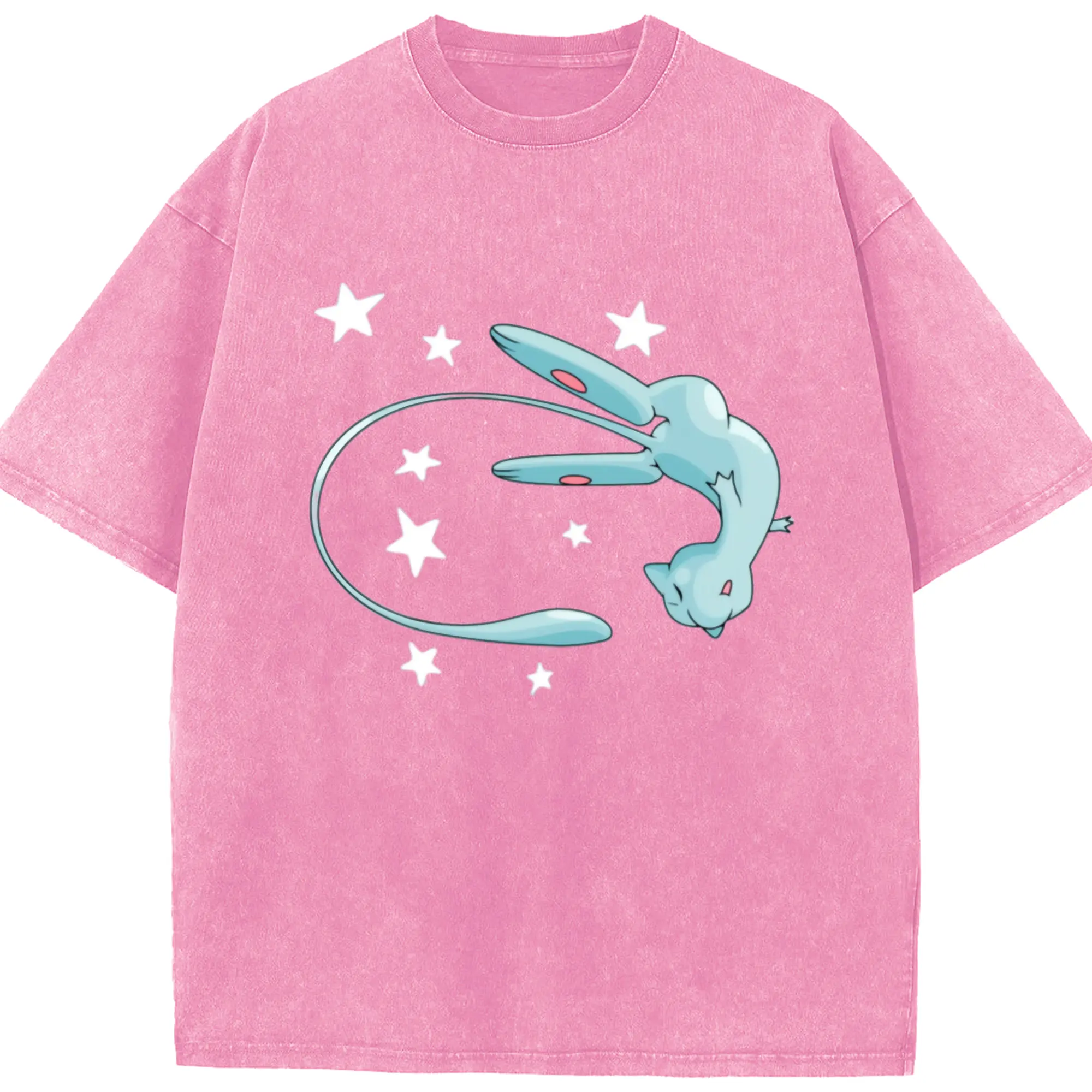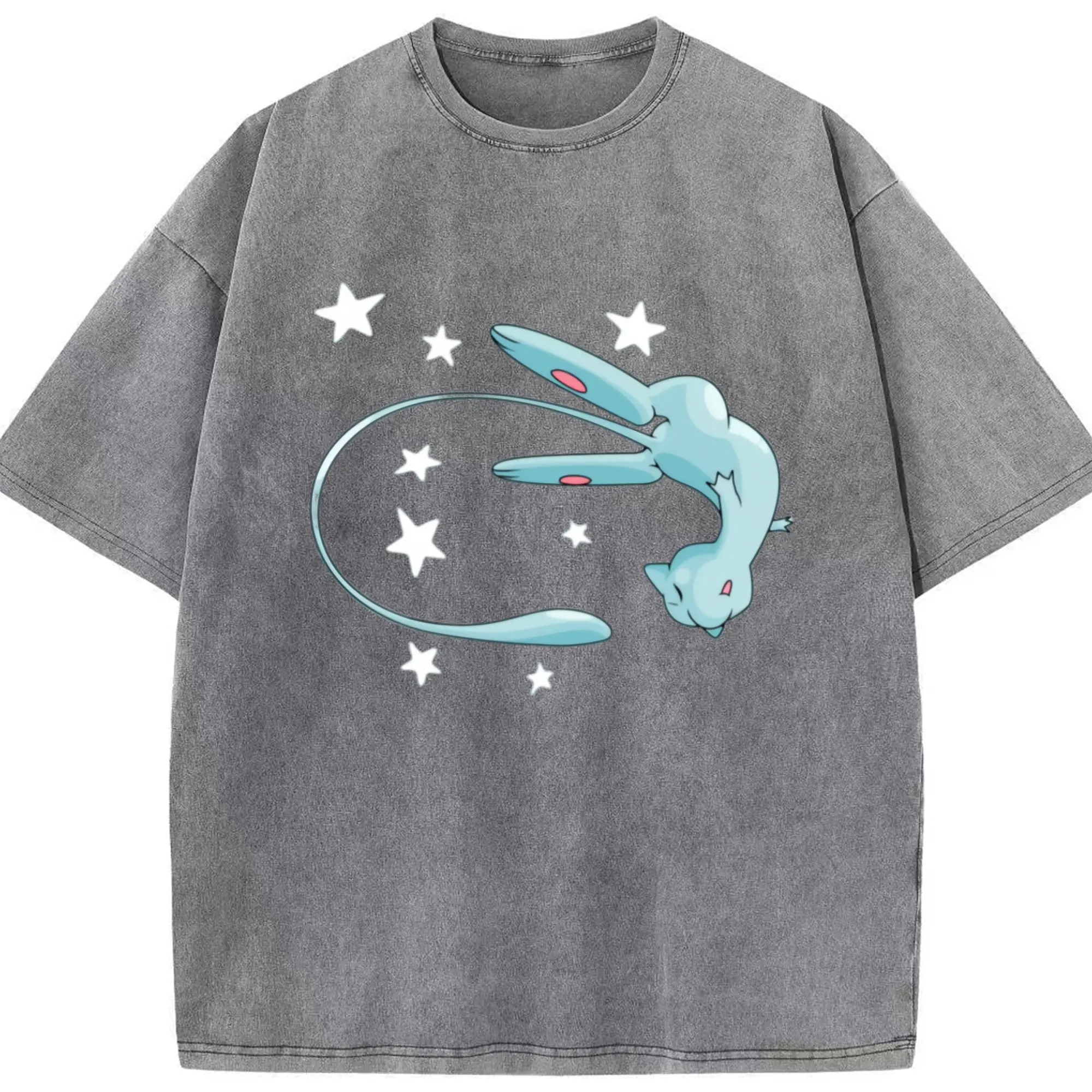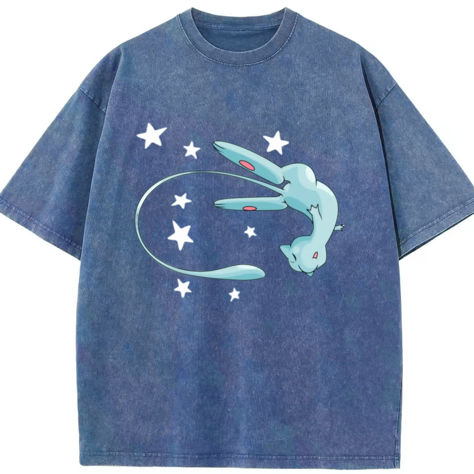 Pokemon blue mew shirt - Washed Vintage Look 230g Cotton Oversized T-Shirt With Front Heat Transfer Print – Soft, Lightweight, Stylish Fit – Comfortable Casual Wear For Sports & Everyday Use