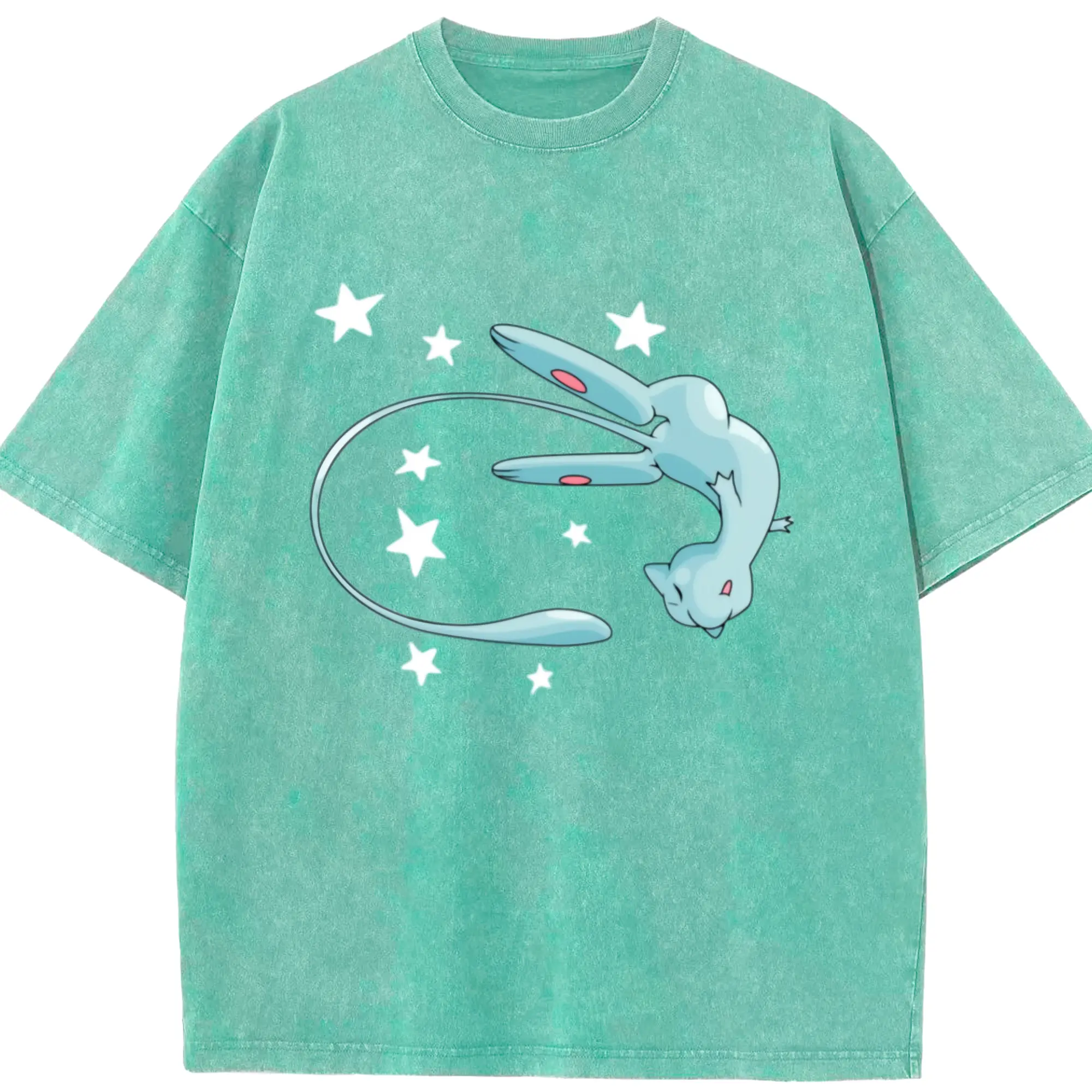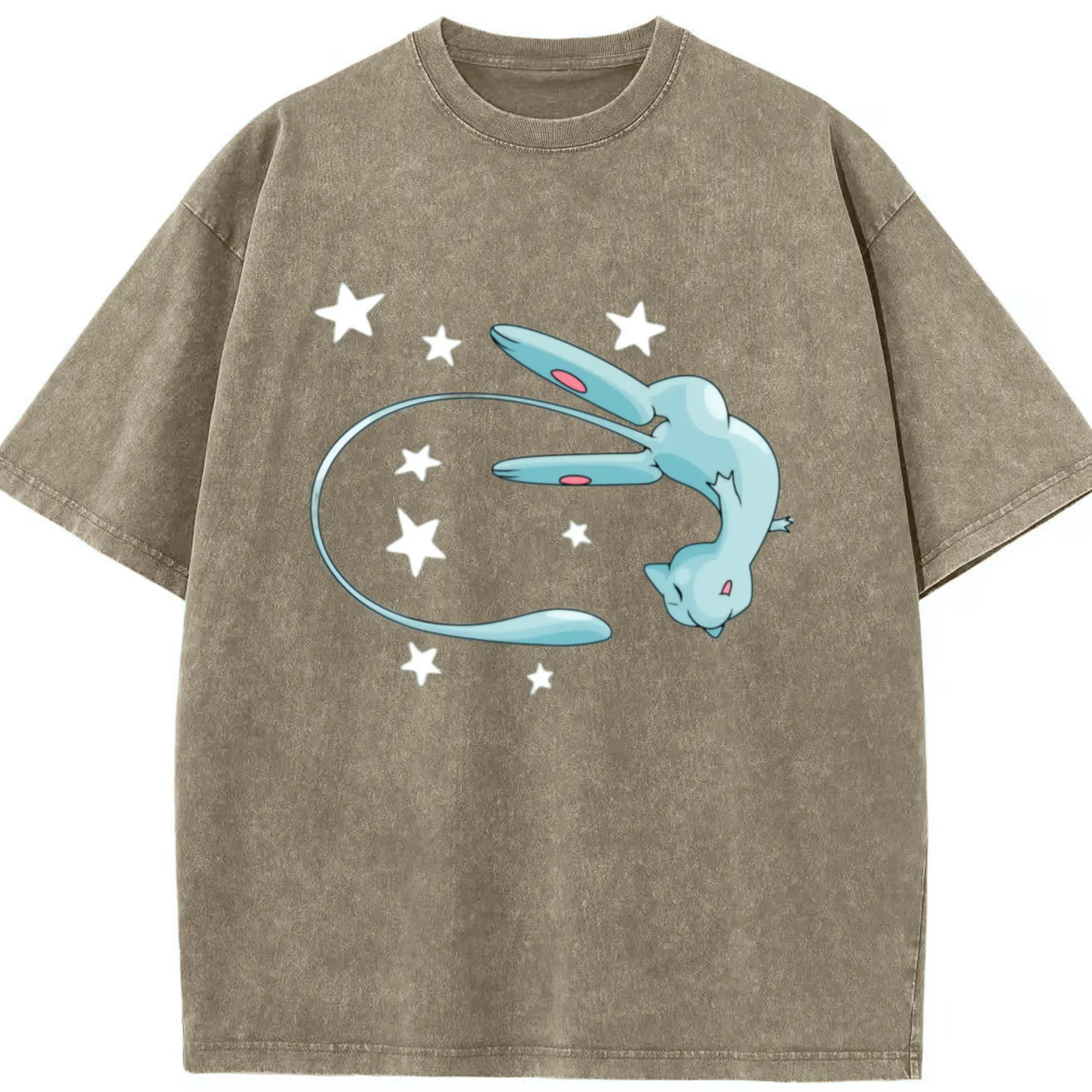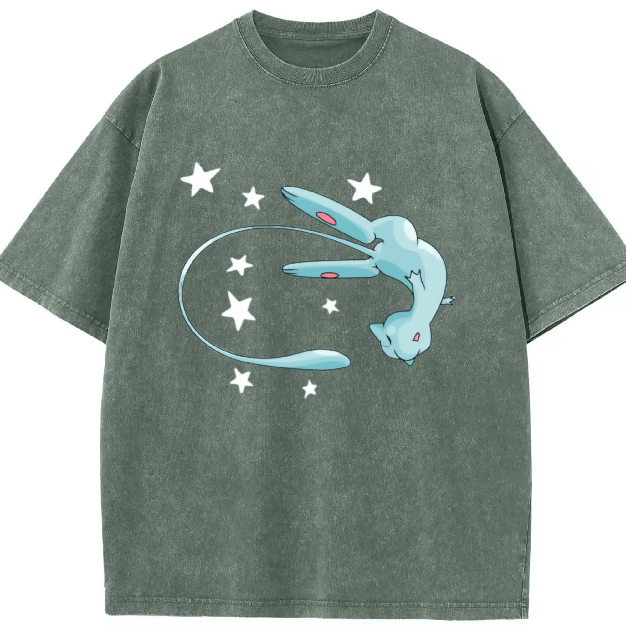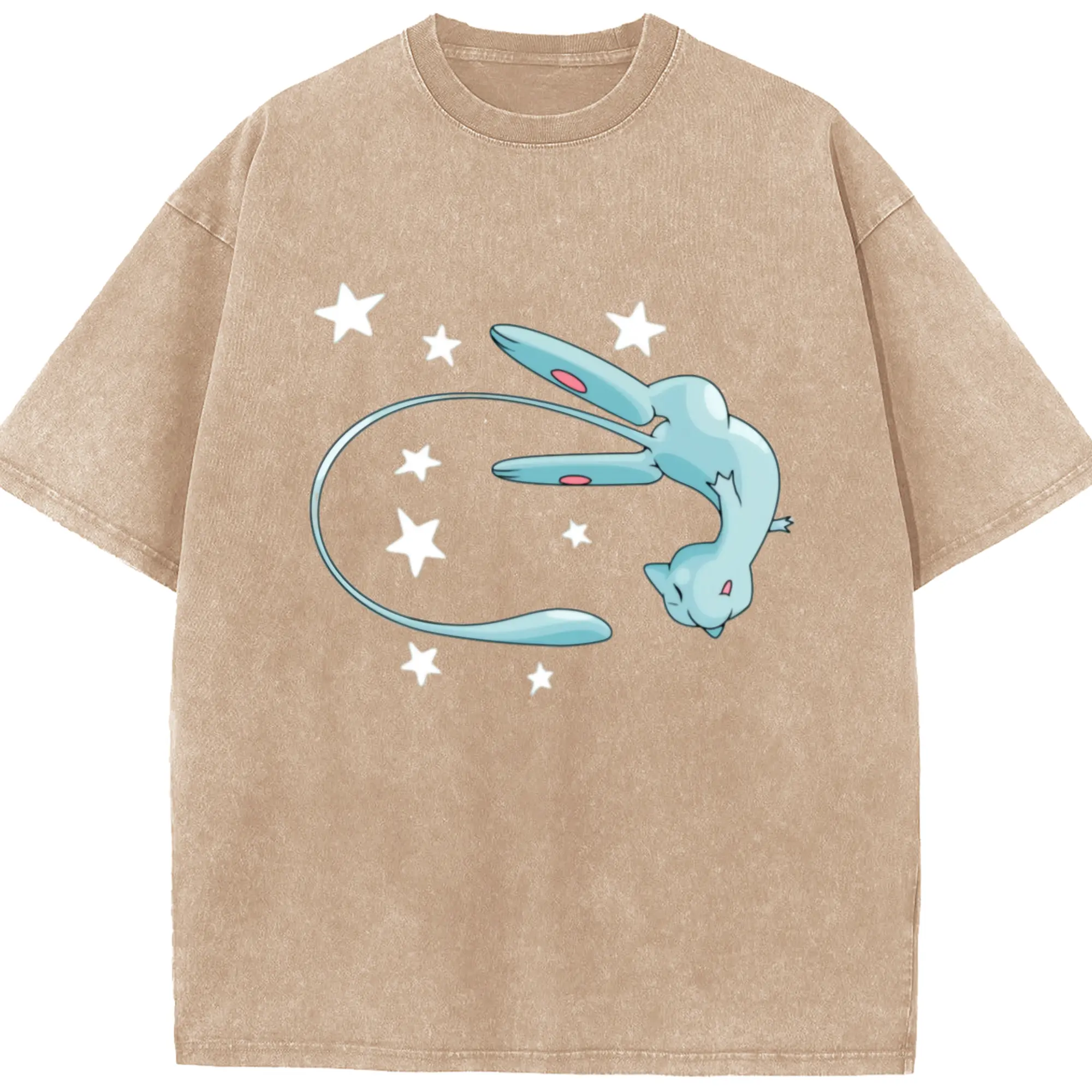 Pokemon blue mew shirt - Washed Vintage Look 230g Cotton Oversized T-Shirt With Front Heat Transfer Print – Soft, Lightweight, Stylish Fit – Comfortable Casual Wear For Sports & Everyday Use