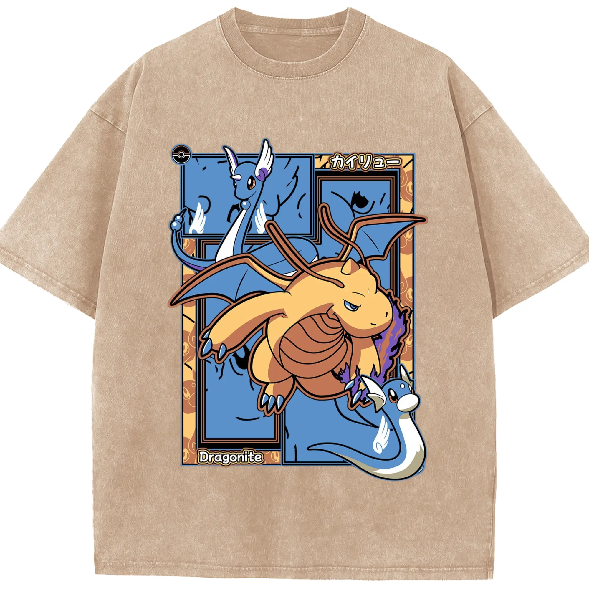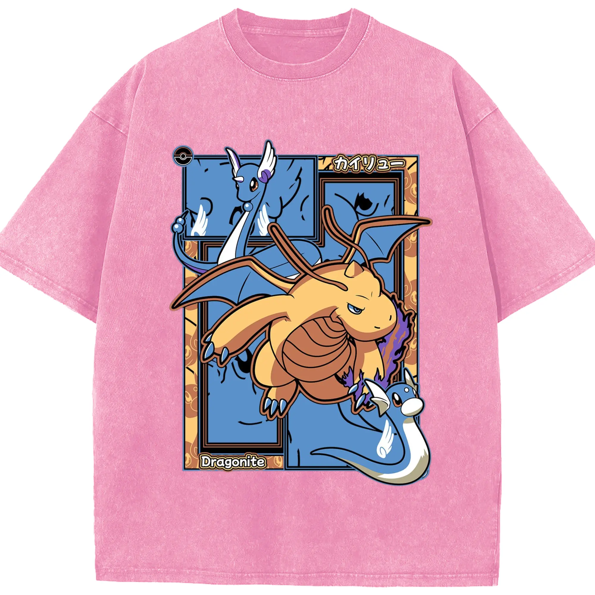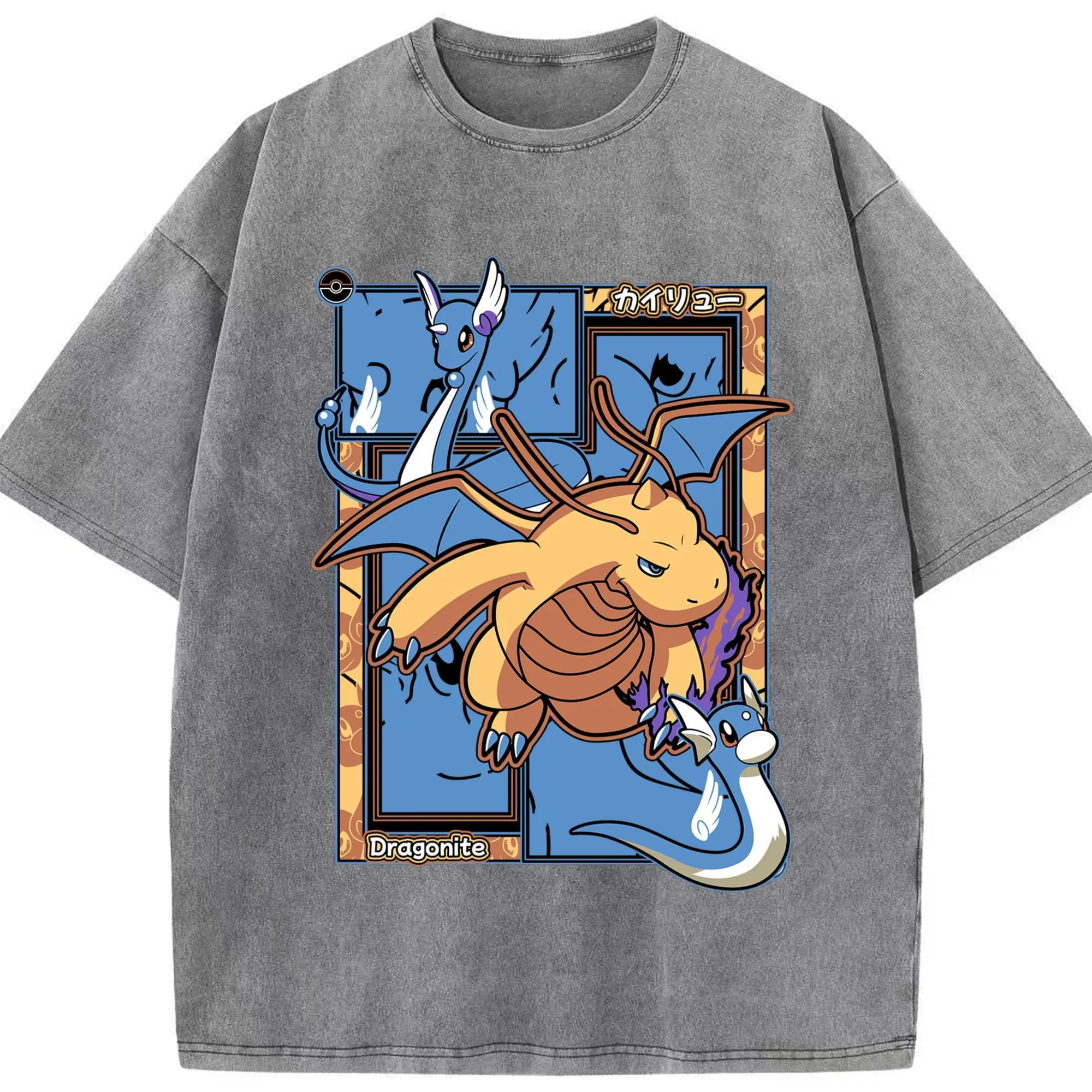 Pokemon dragonite shirt​ - Washed Vintage Look 230g Cotton Oversized T-Shirt With Front Heat Transfer Print – Soft, Lightweight, Stylish Fit – Comfortable Casual Wear For Sports & Everyday Use