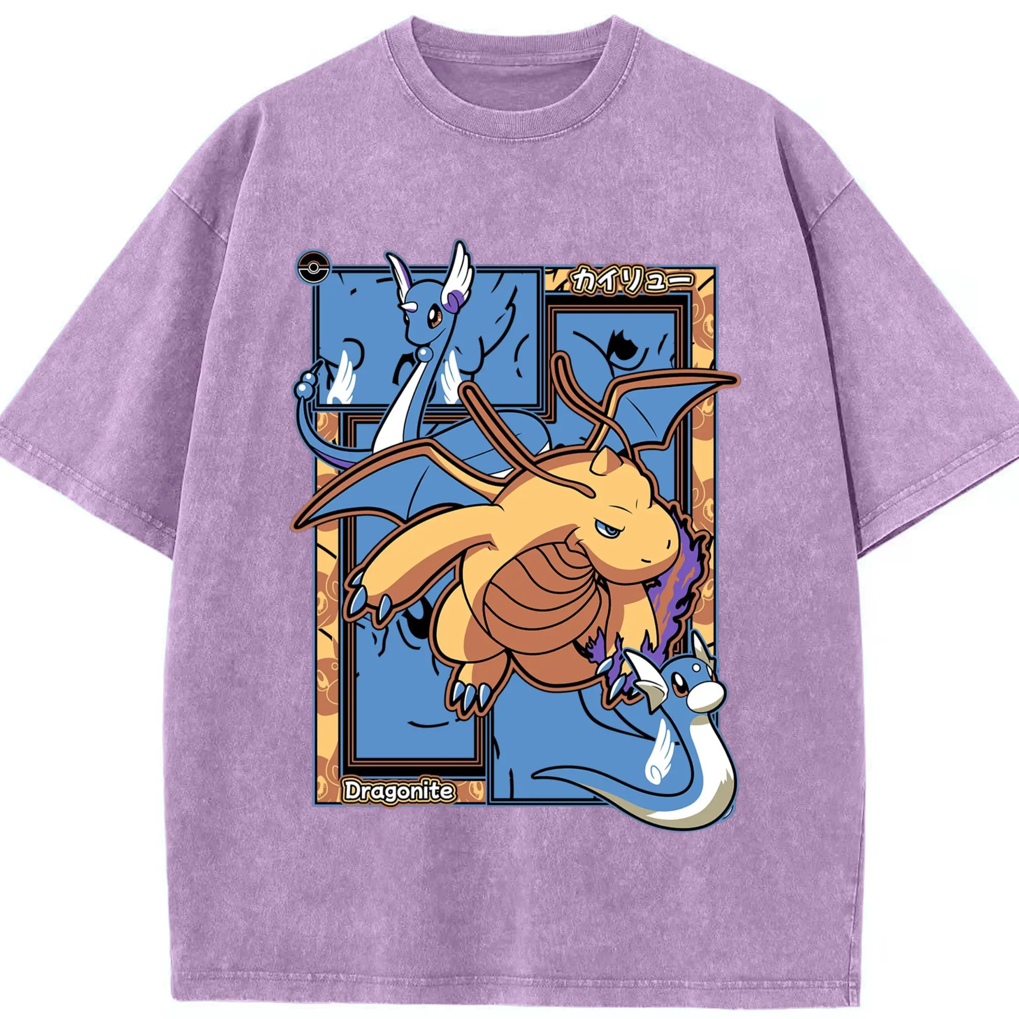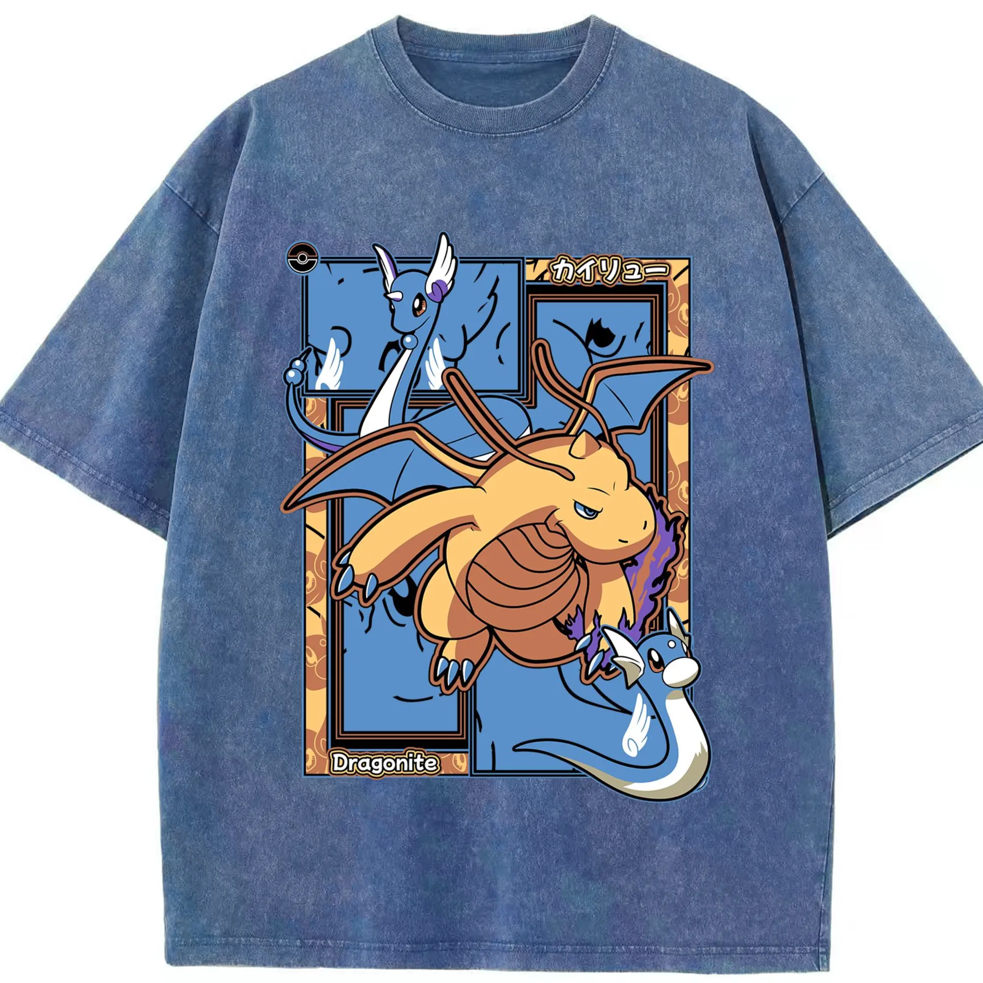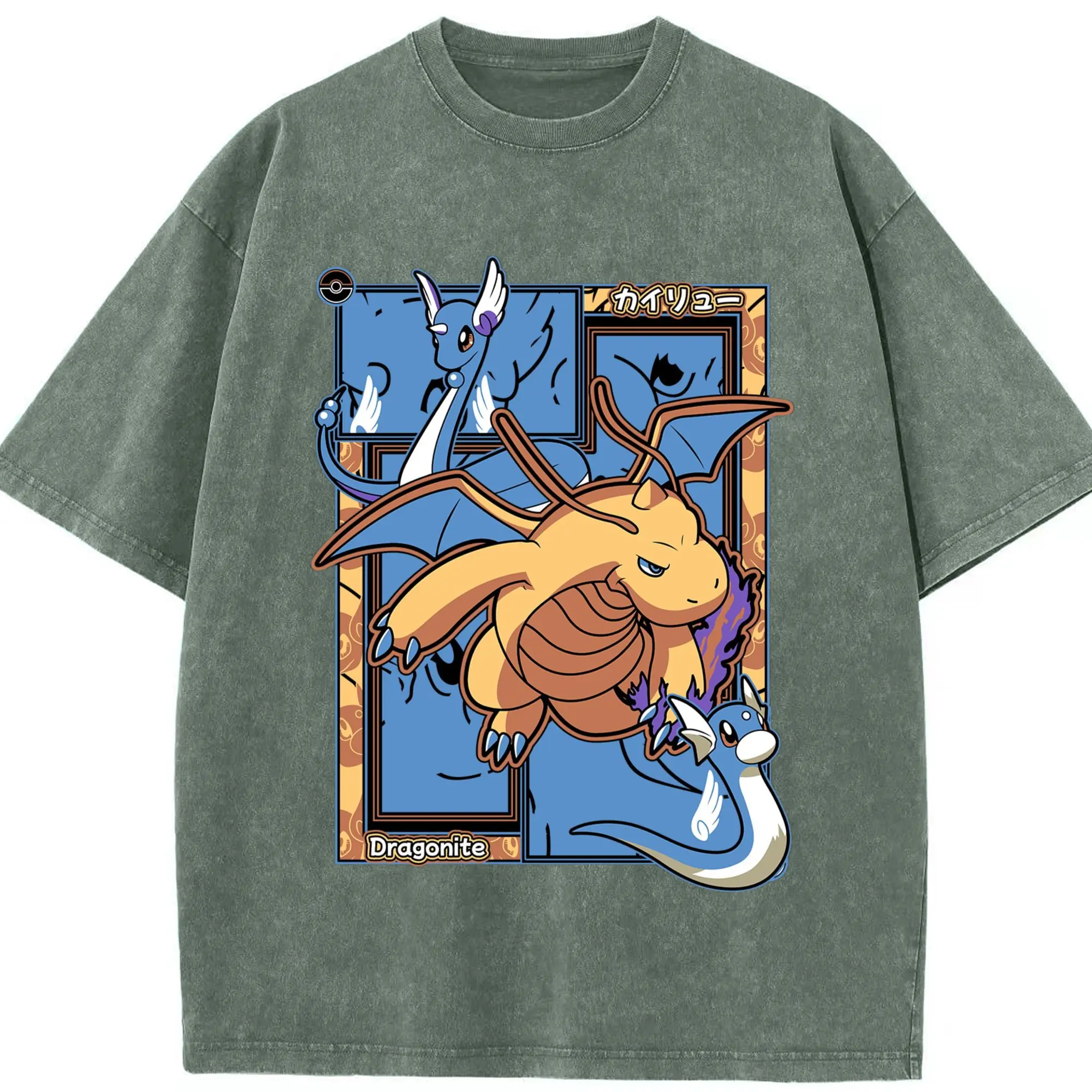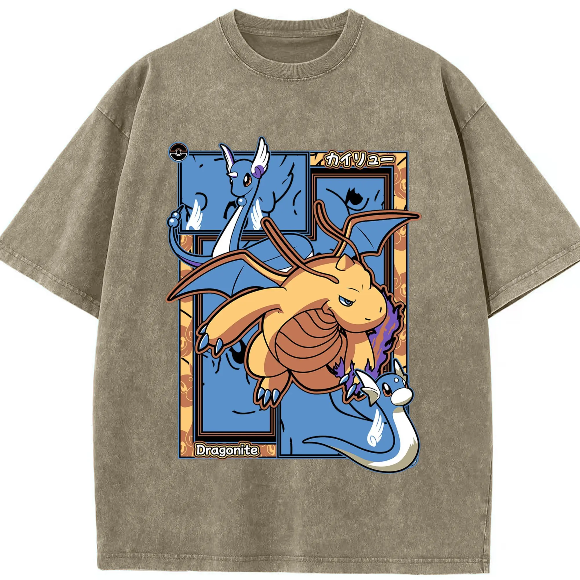 Pokemon dragonite shirt​ - Washed Vintage Look 230g Cotton Oversized T-Shirt With Front Heat Transfer Print – Soft, Lightweight, Stylish Fit – Comfortable Casual Wear For Sports & Everyday Use