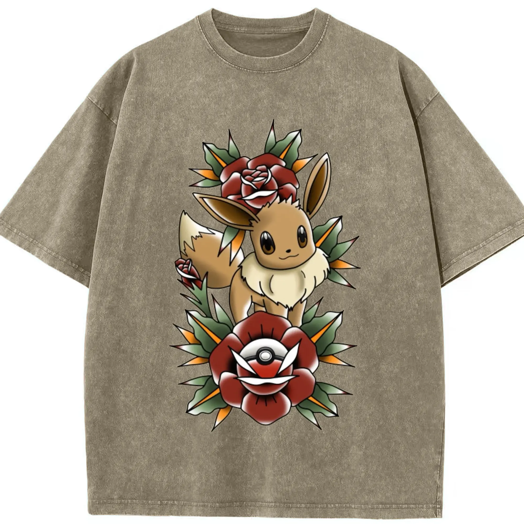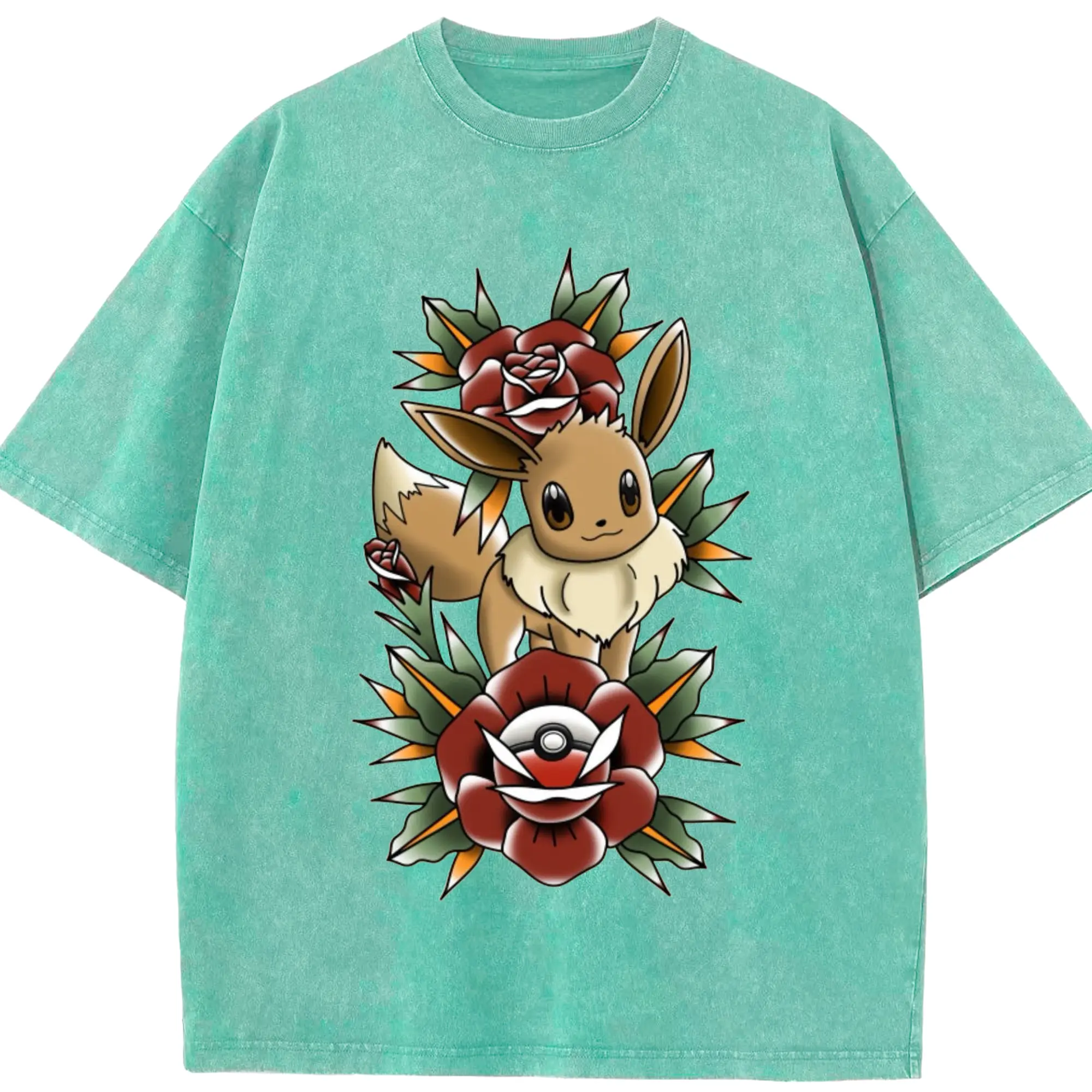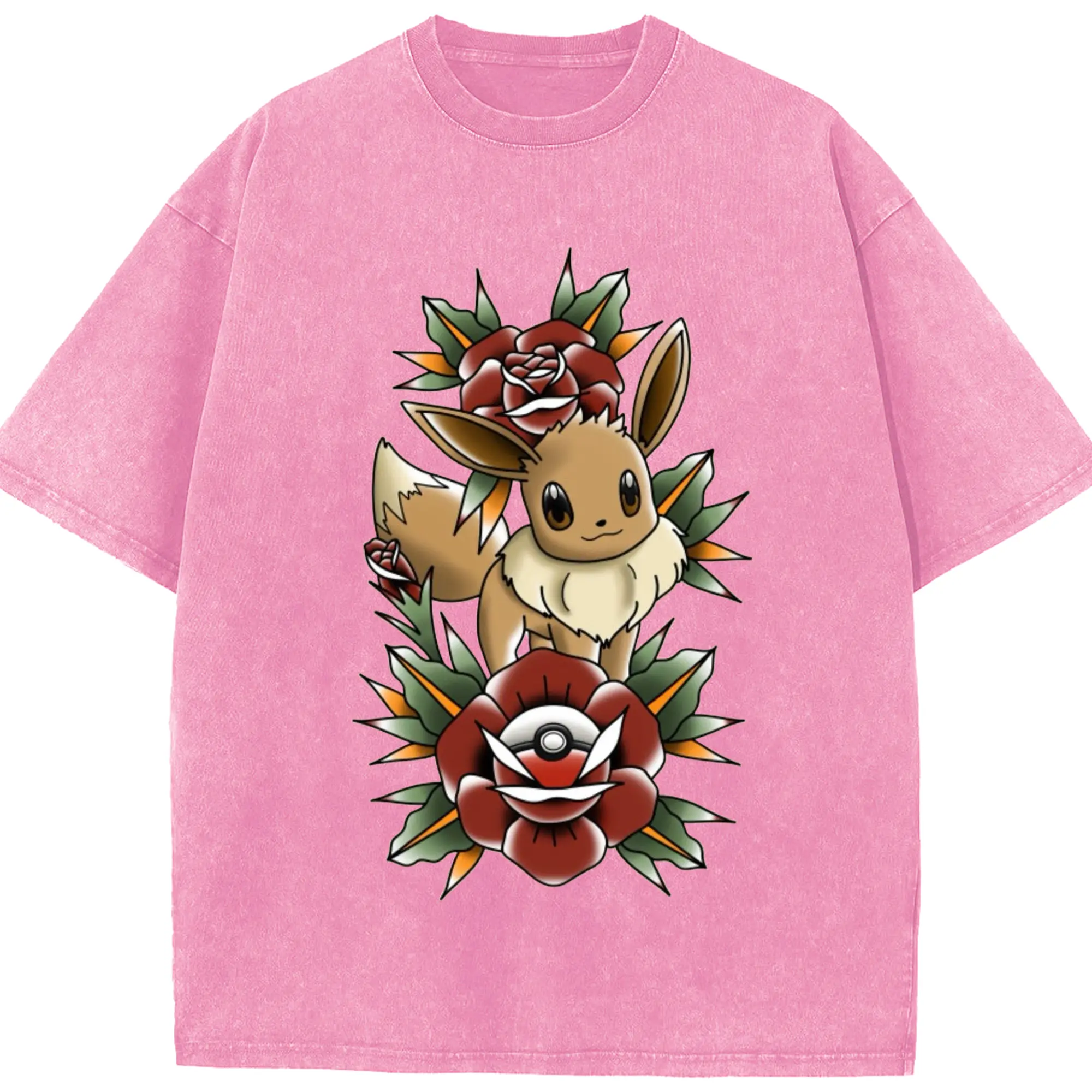 Pokemon Eevee graohic Tee - Washed Vintage Look 230g Cotton Oversized T-Shirt With Front Heat Transfer Print – Soft, Lightweight, Stylish Fit – Comfortable Casual Wear For Sports & Everyday Use