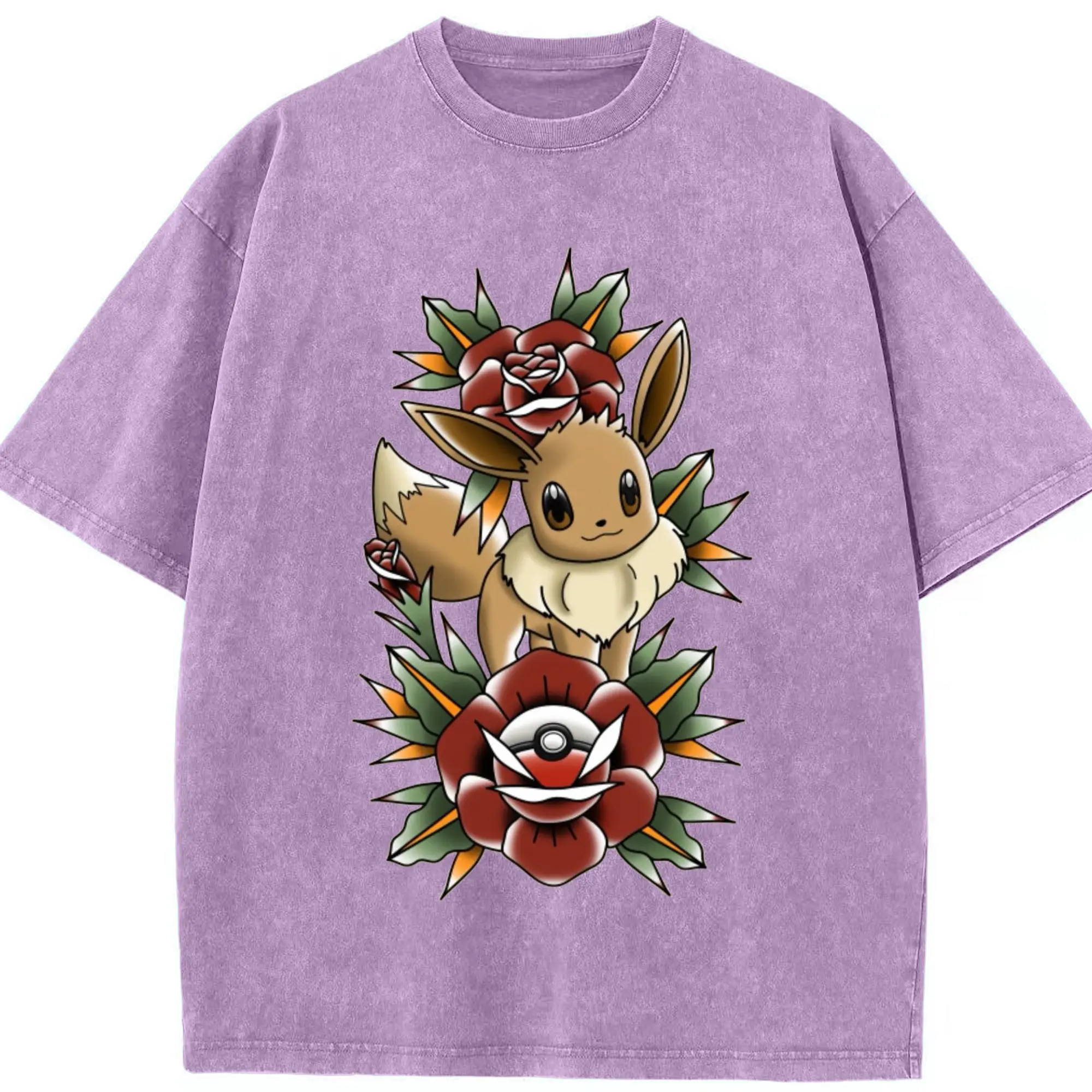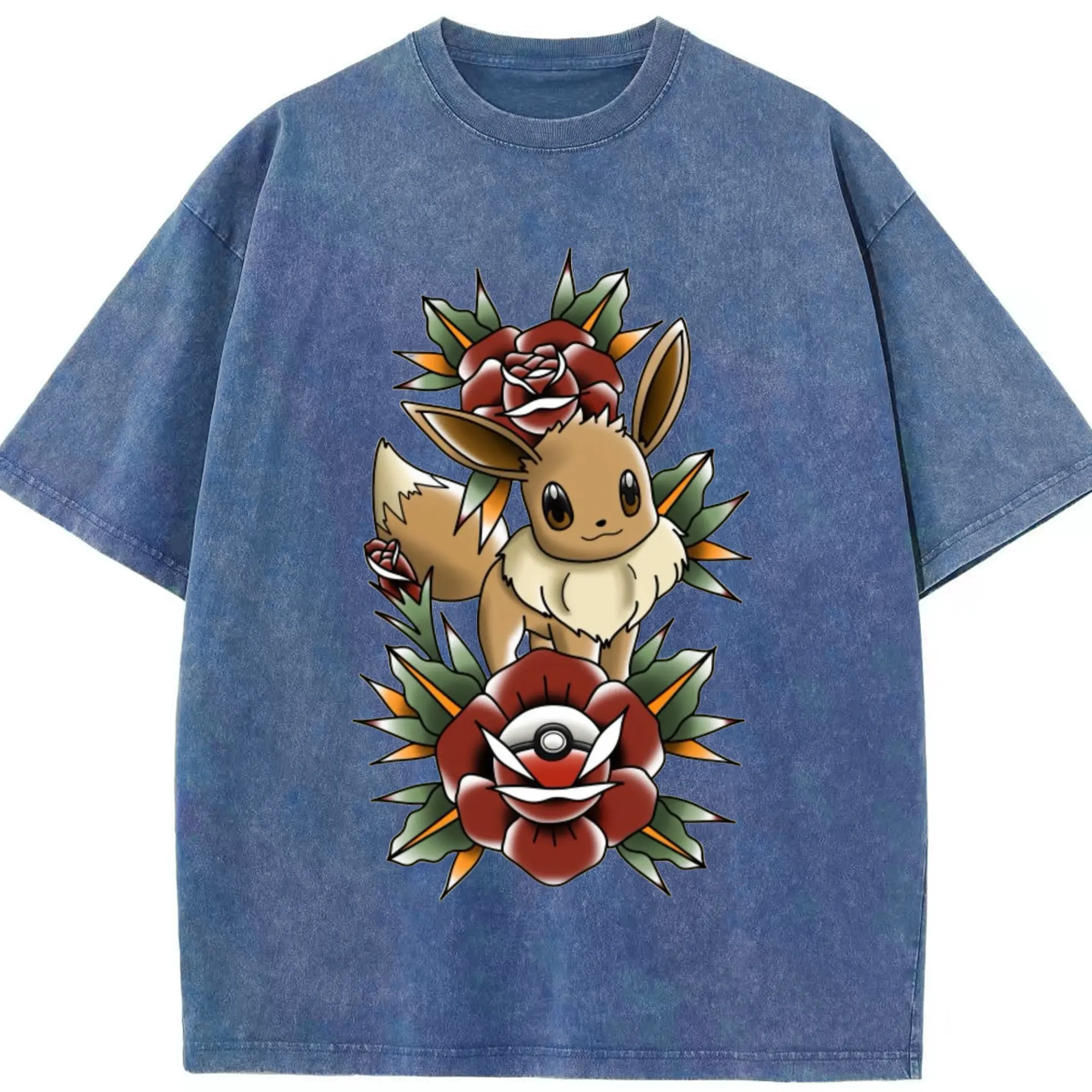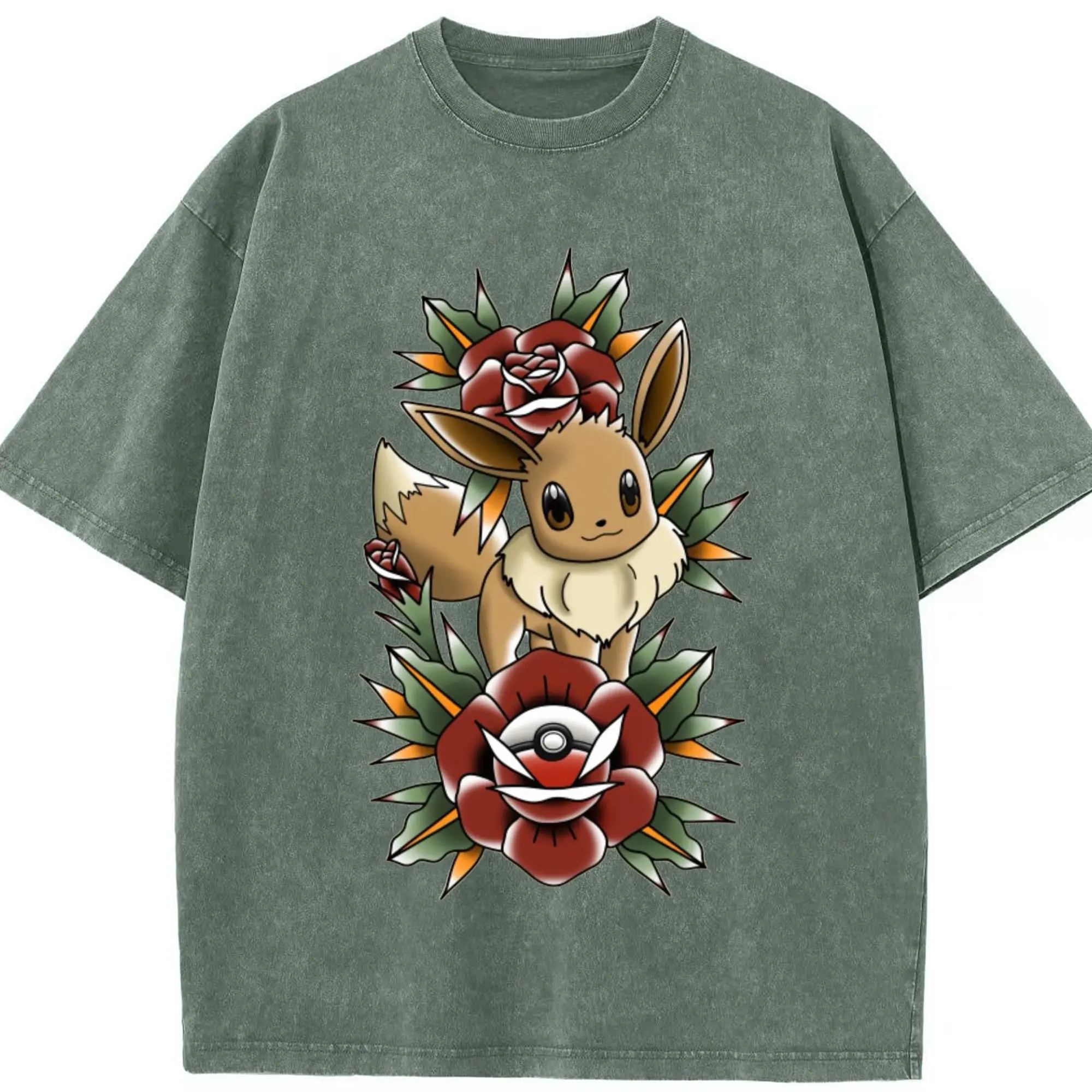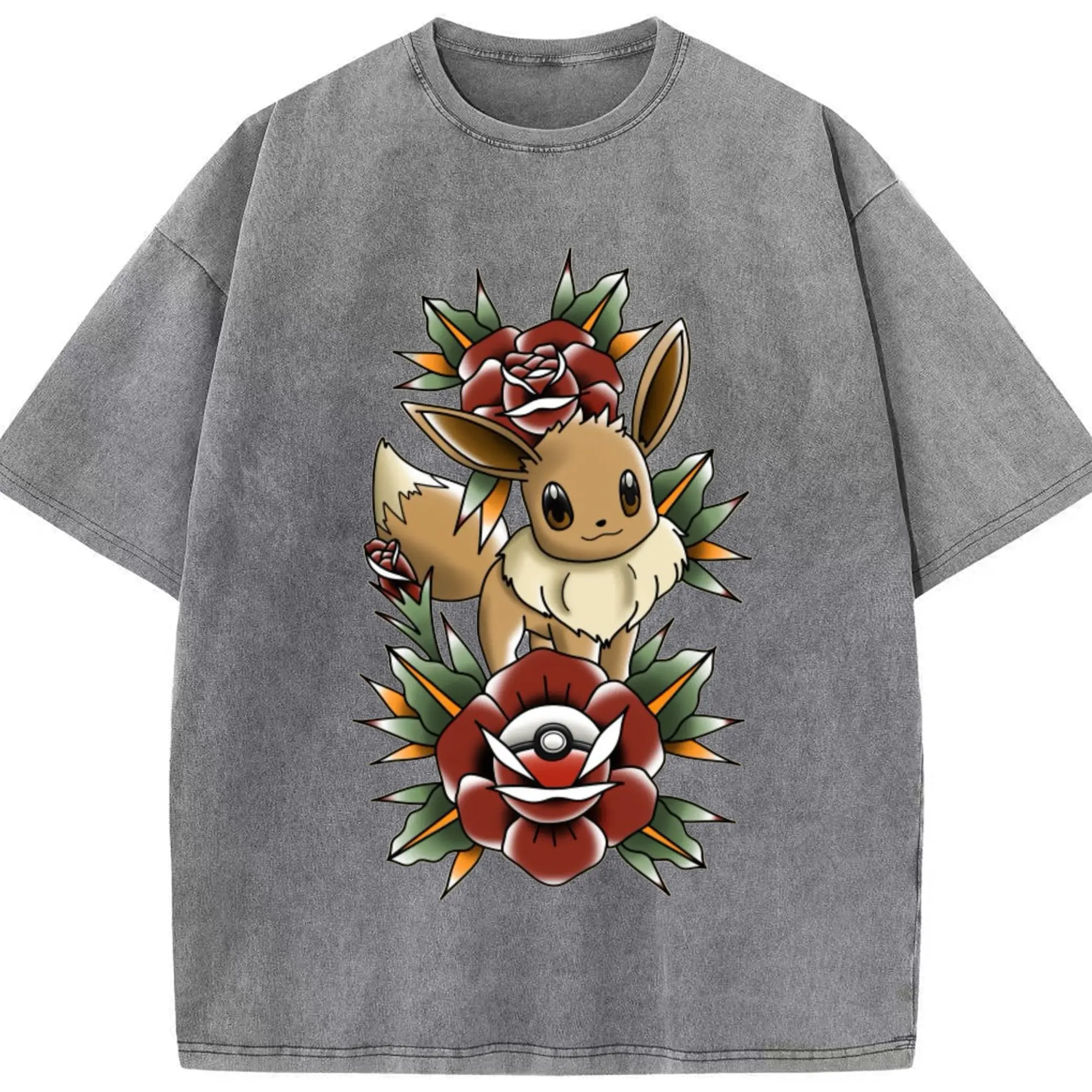 Pokemon Eevee graohic Tee - Washed Vintage Look 230g Cotton Oversized T-Shirt With Front Heat Transfer Print – Soft, Lightweight, Stylish Fit – Comfortable Casual Wear For Sports & Everyday Use