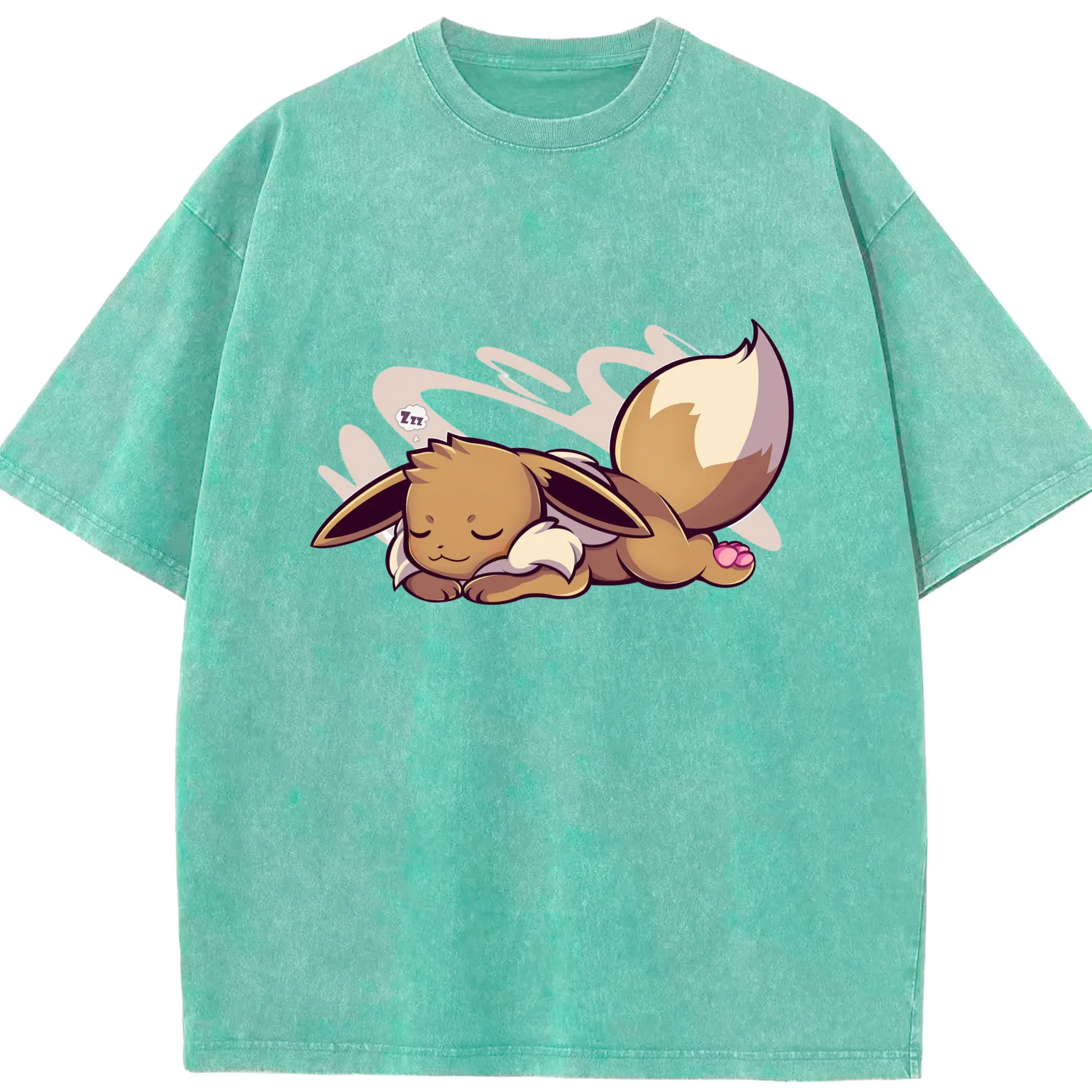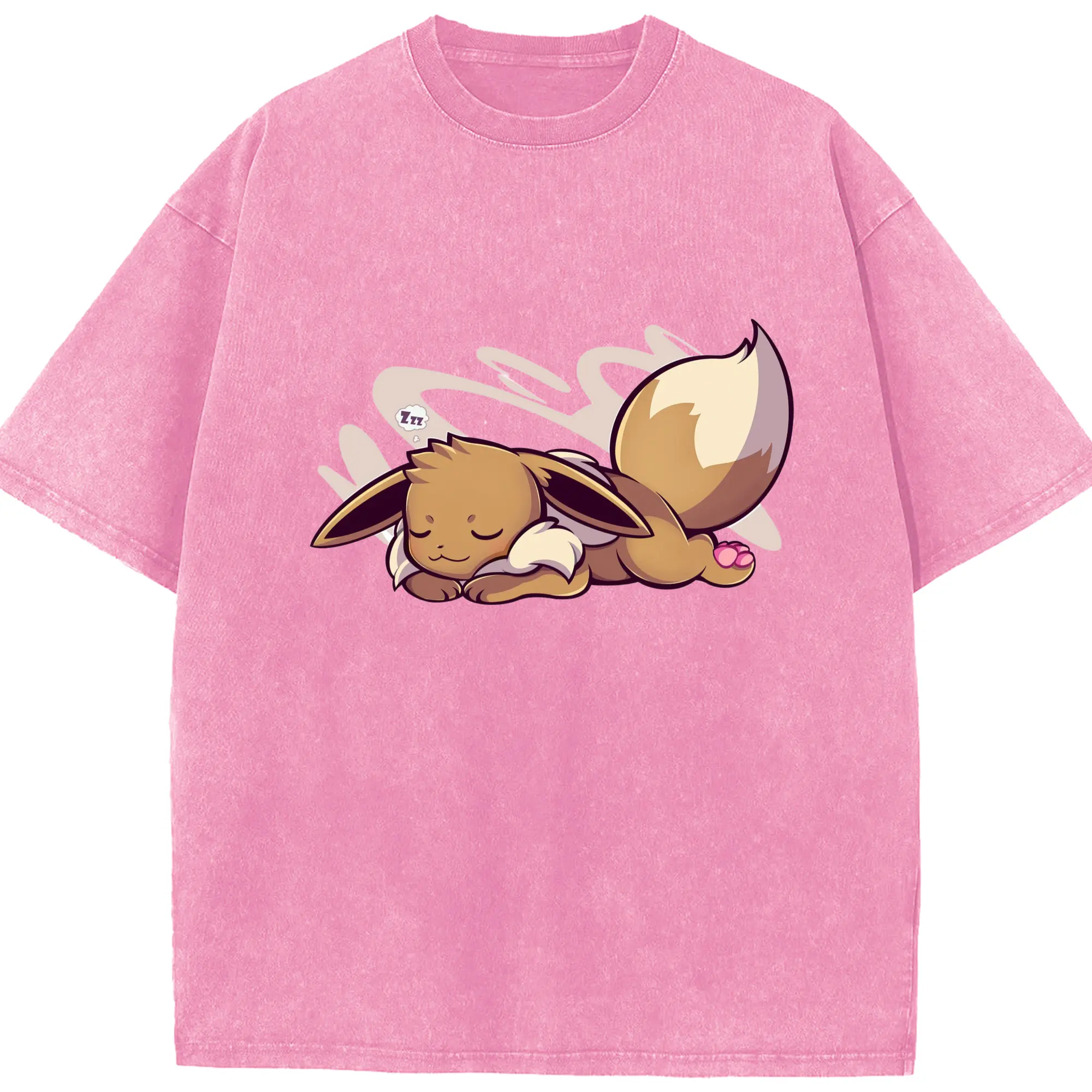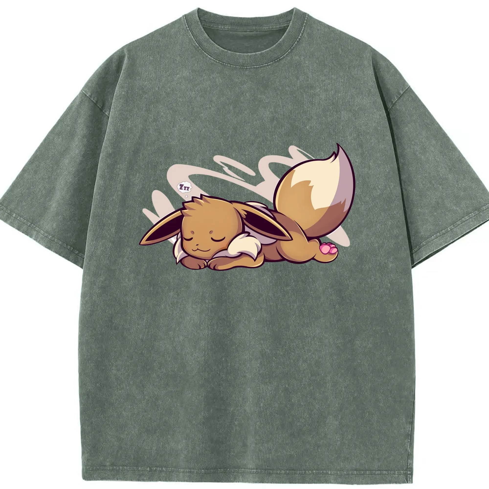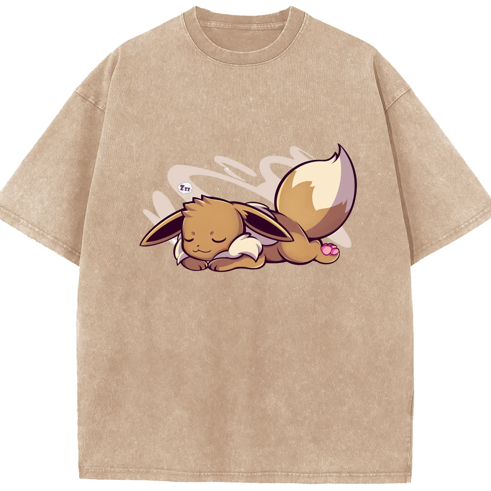 Pokemon Eevee sleeping Tee - Washed Vintage Look 230g Cotton Oversized T-Shirt With Front Heat Transfer Print – Soft, Lightweight, Stylish Fit – Comfortable Casual Wear For Sports & Everyday Use