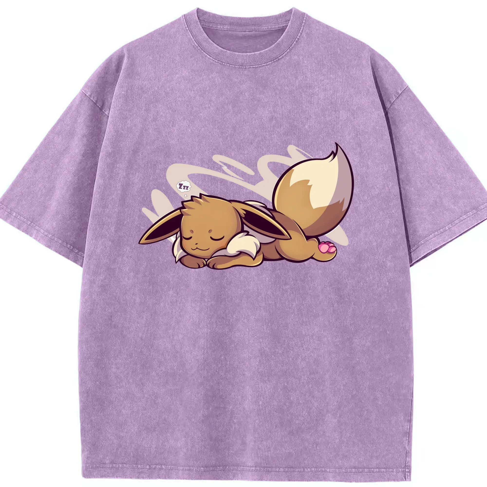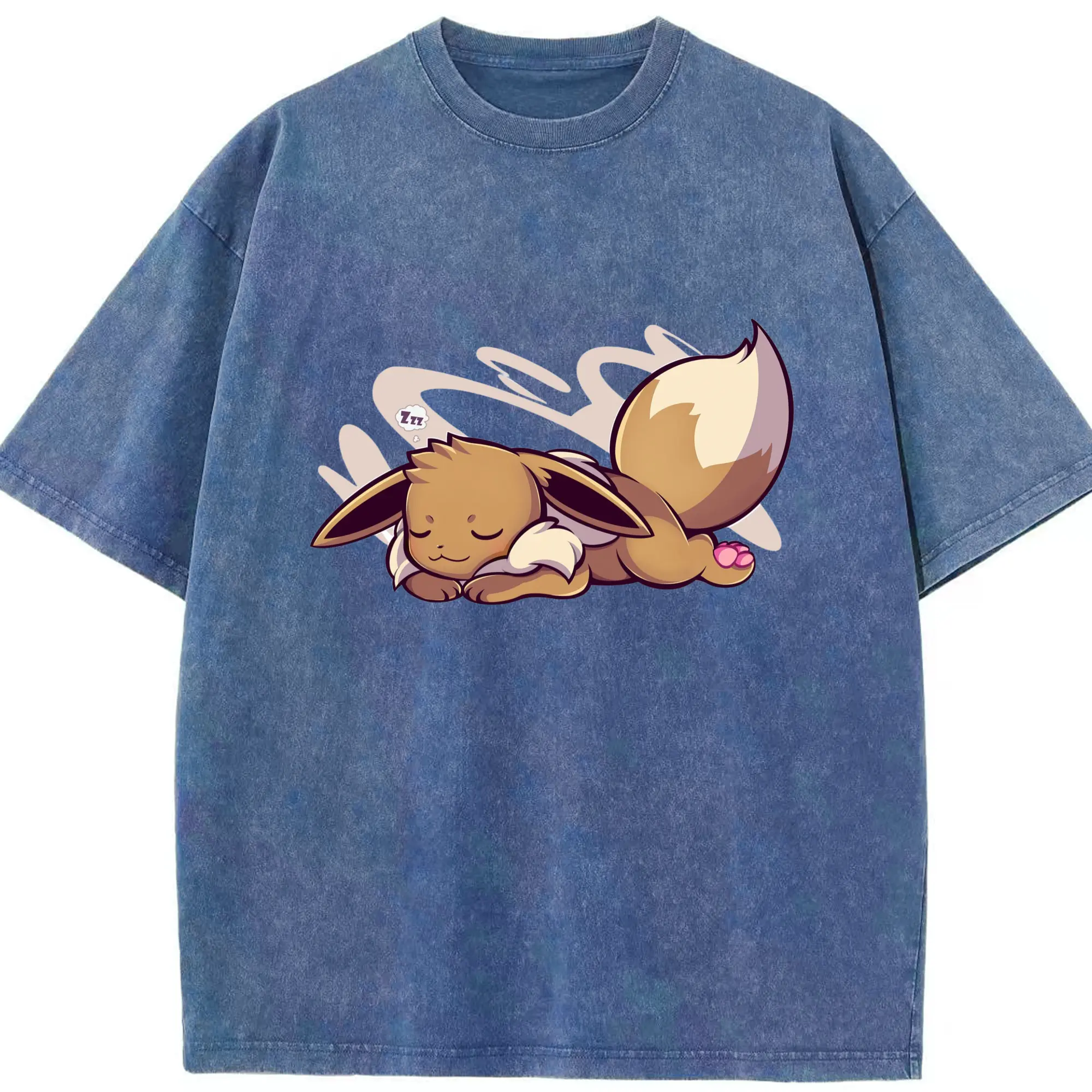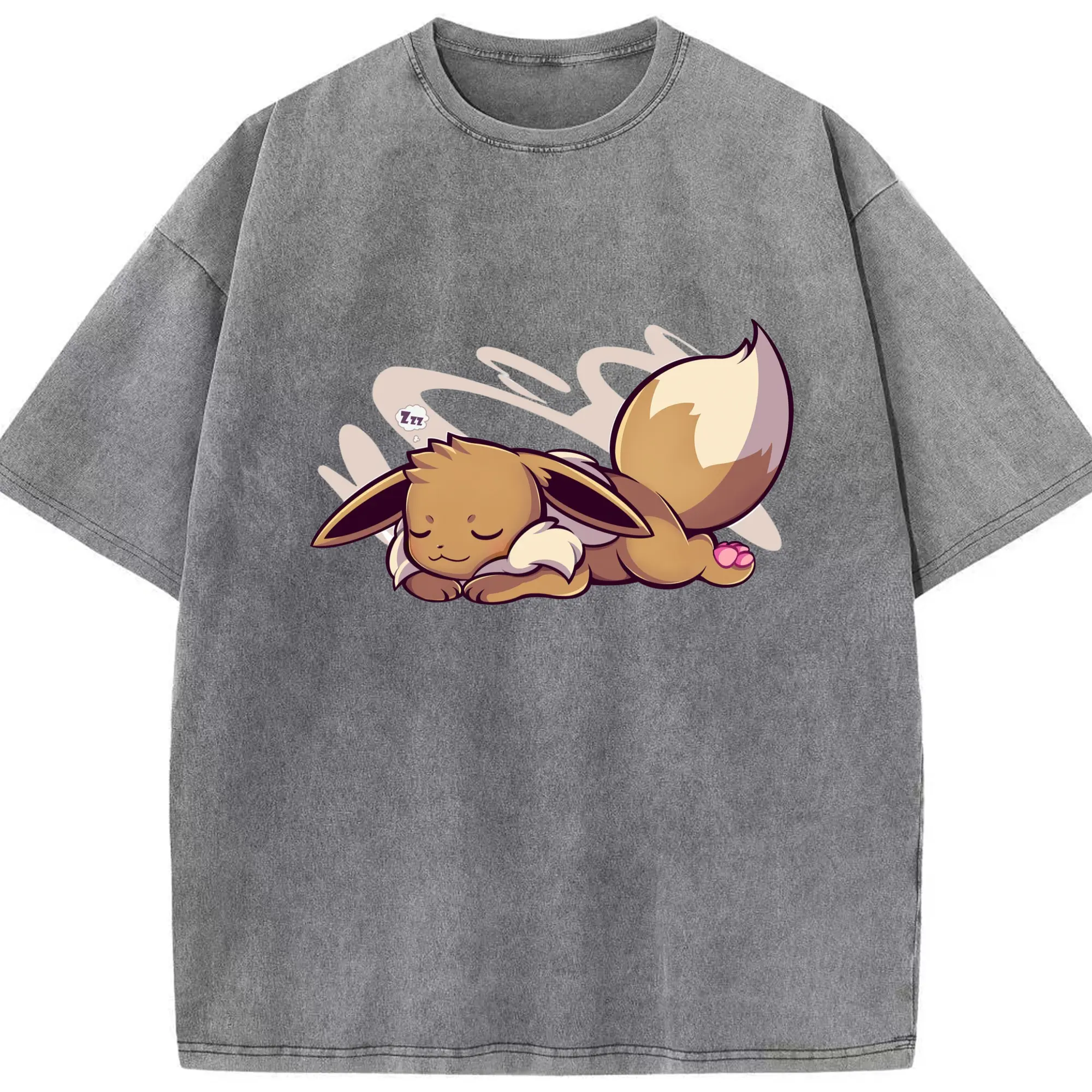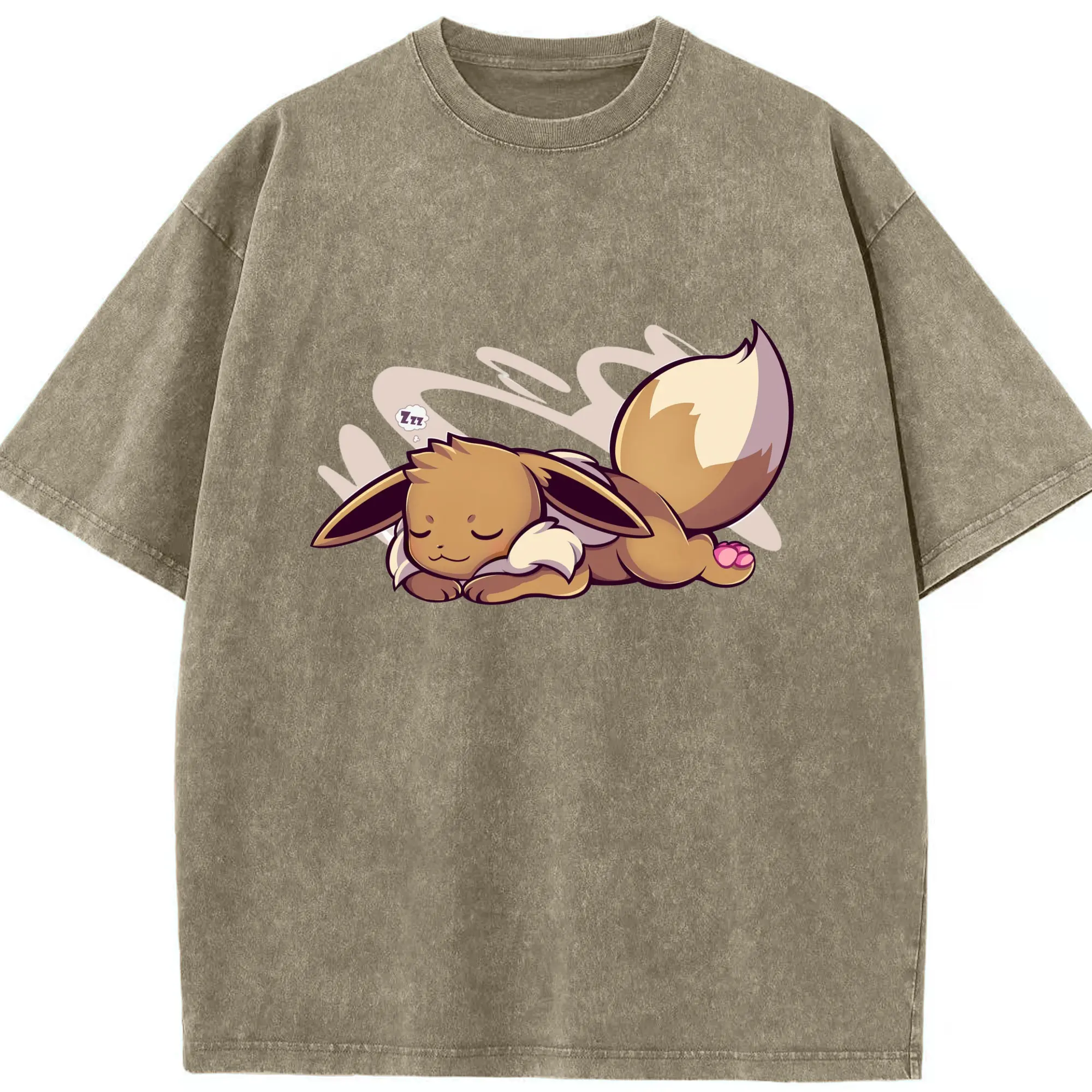 Pokemon Eevee sleeping Tee - Washed Vintage Look 230g Cotton Oversized T-Shirt With Front Heat Transfer Print – Soft, Lightweight, Stylish Fit – Comfortable Casual Wear For Sports & Everyday Use