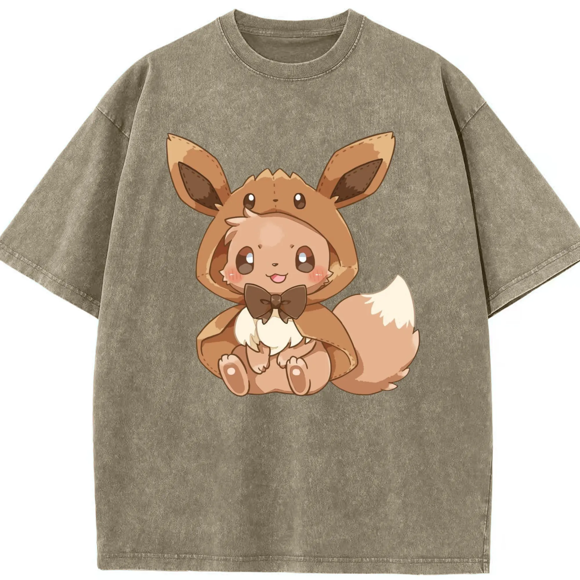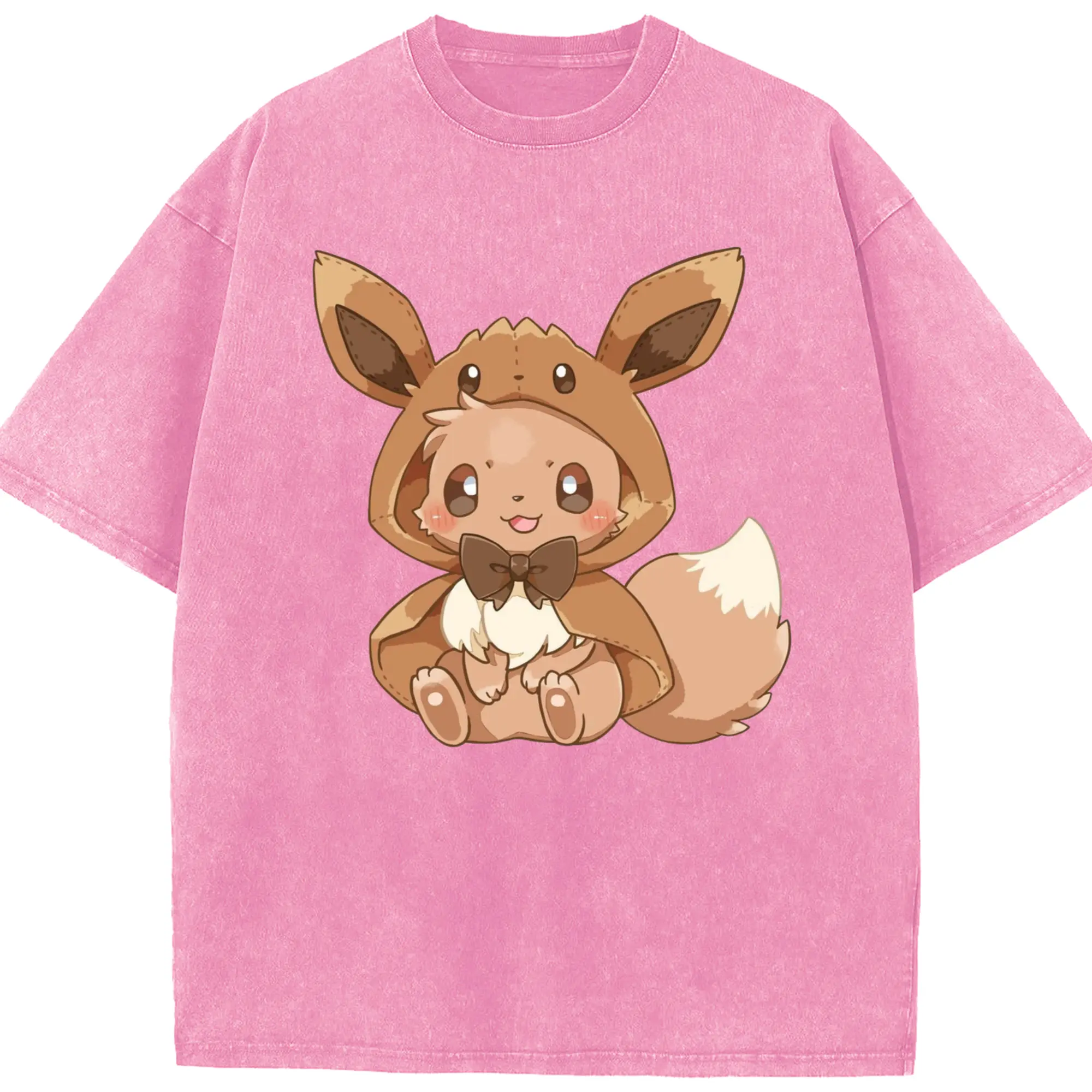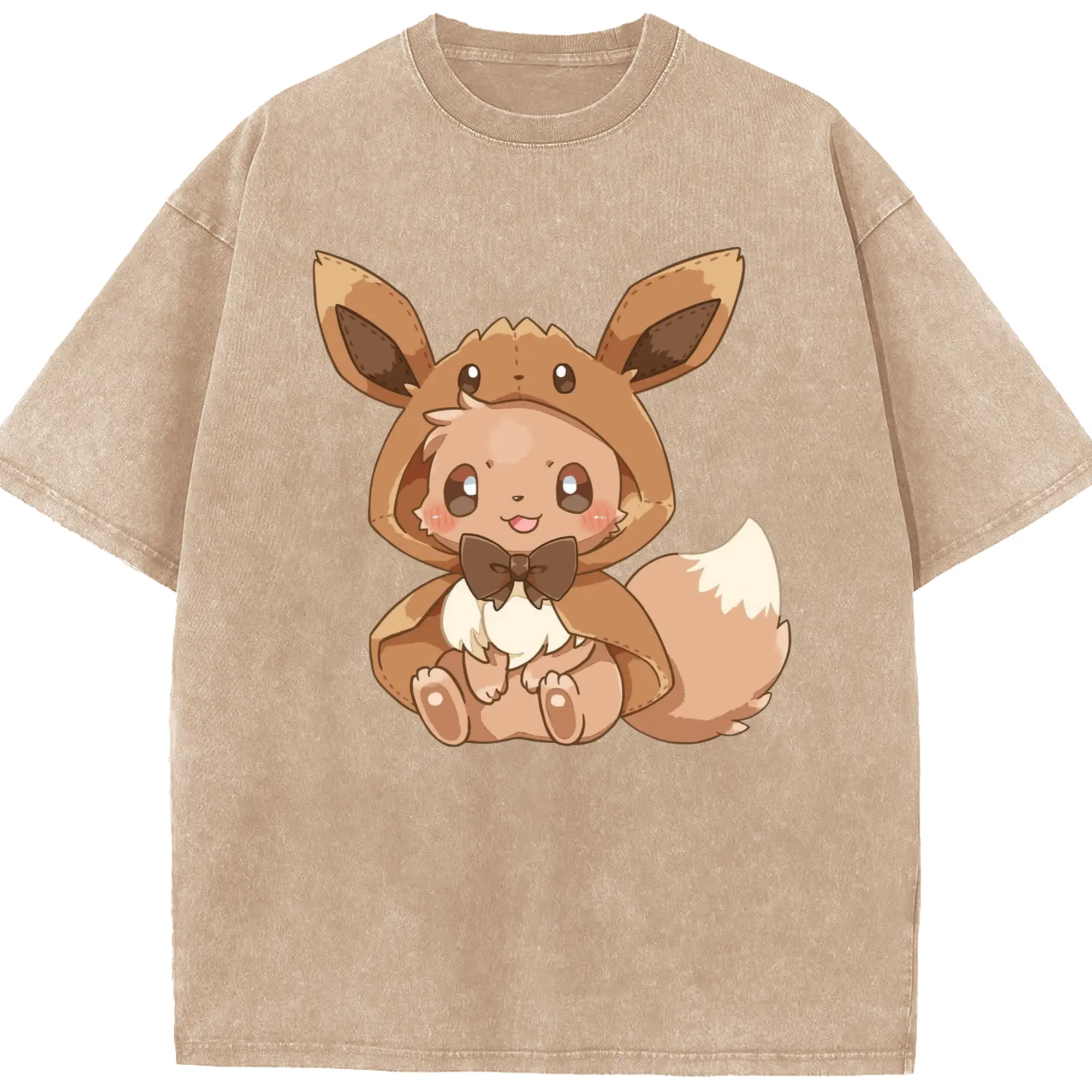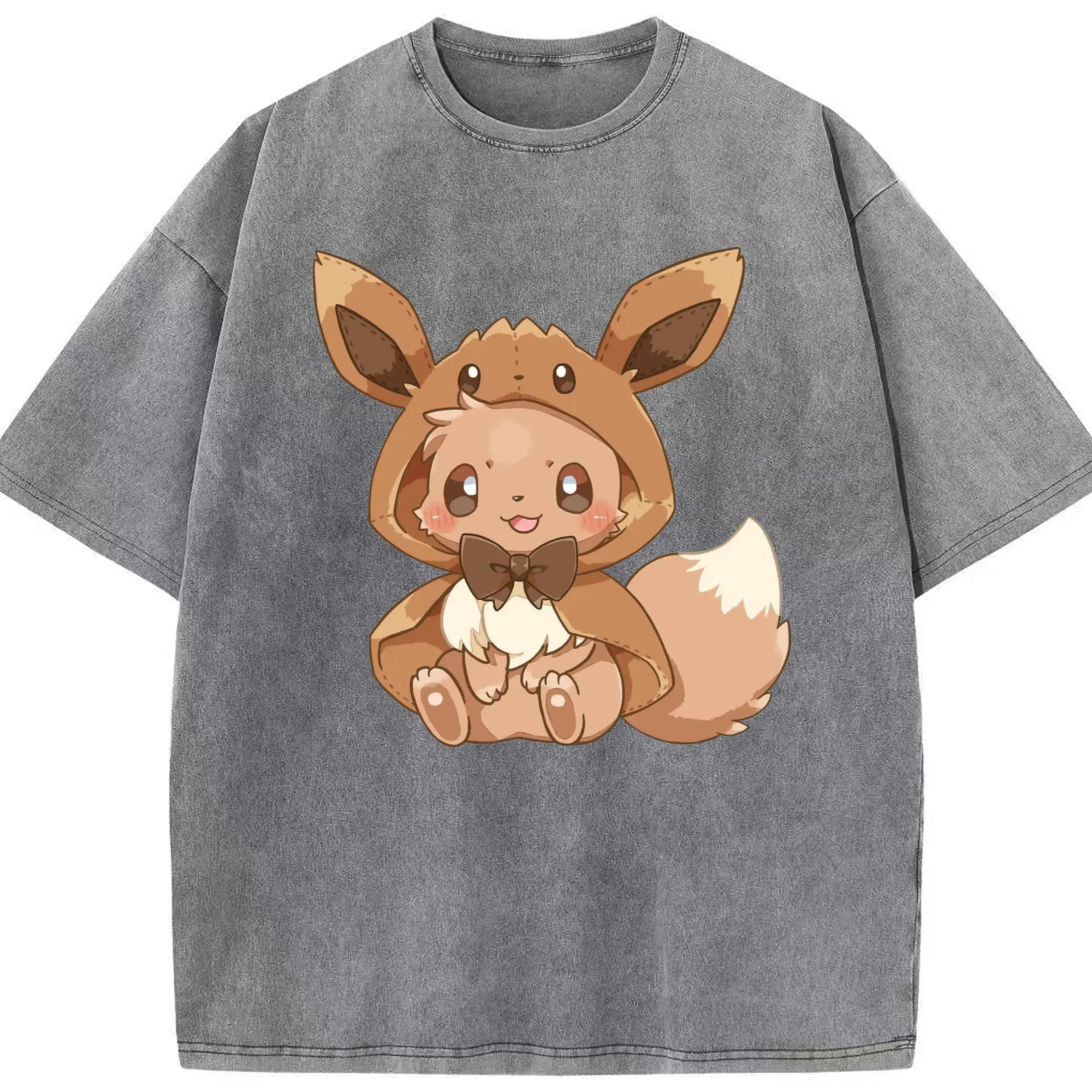 Pokemon Eevee T-shirt - Washed Vintage Look 230g Cotton Oversized T-Shirt With Front Heat Transfer Print – Soft, Lightweight, Stylish Fit – Comfortable Casual Wear For Sports & Everyday Use