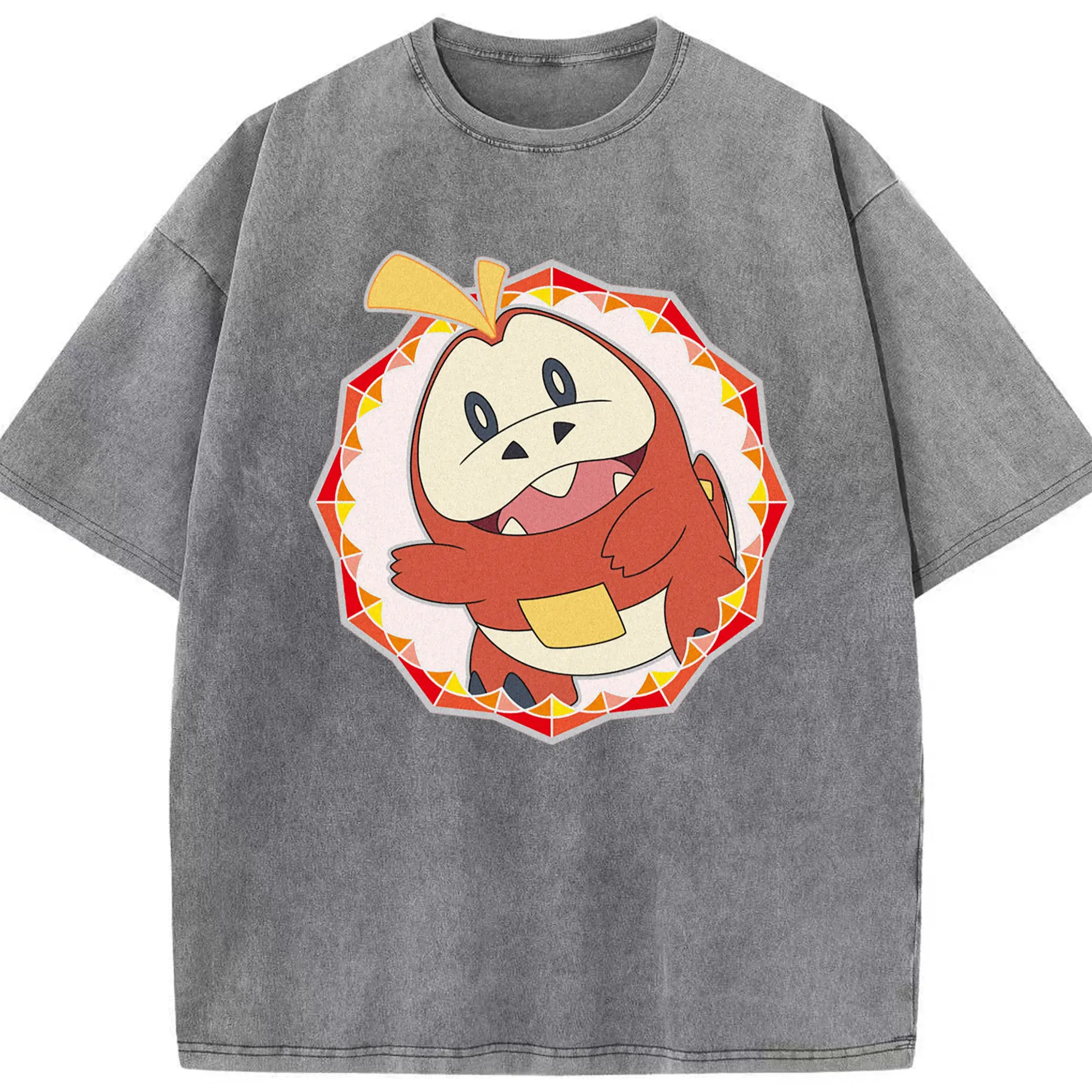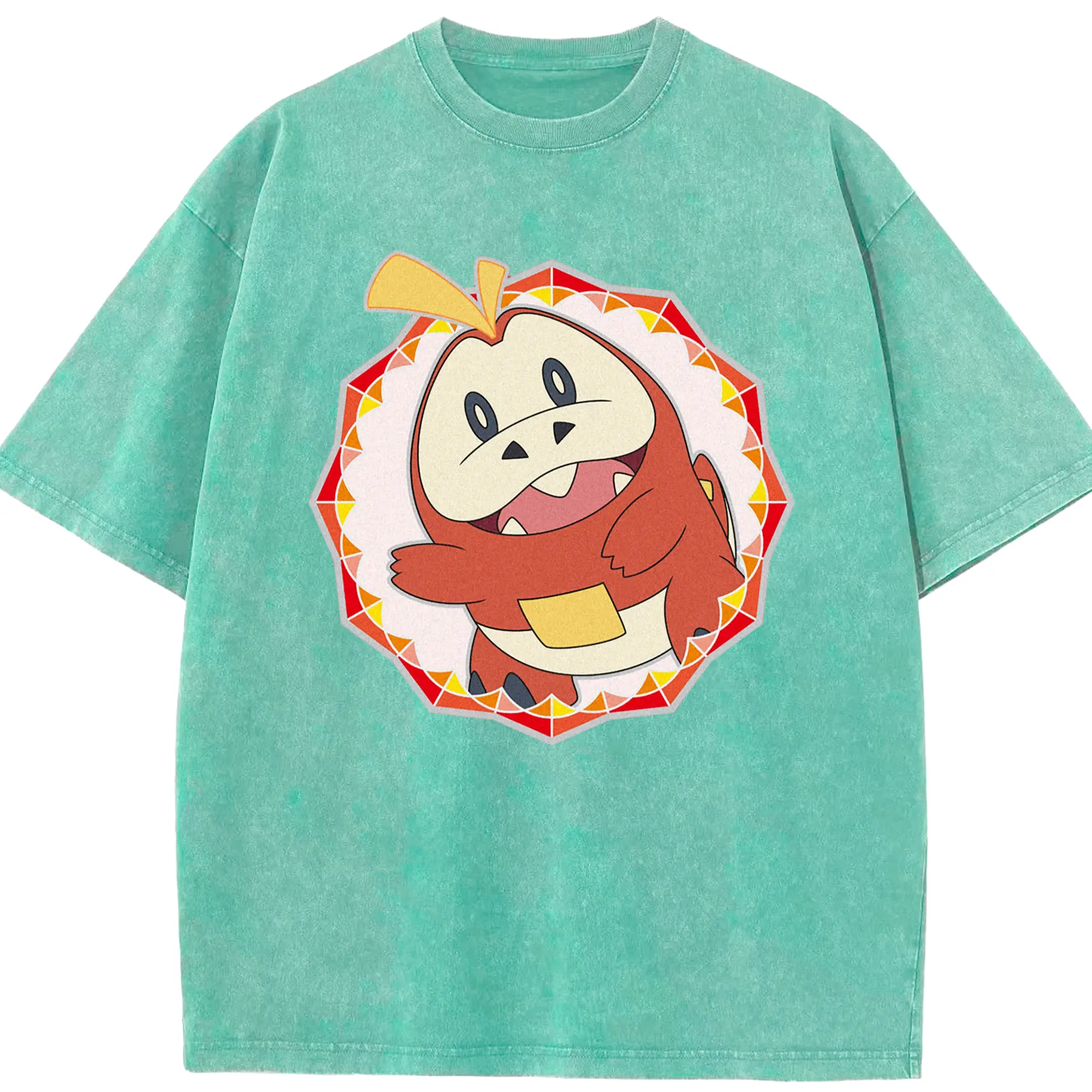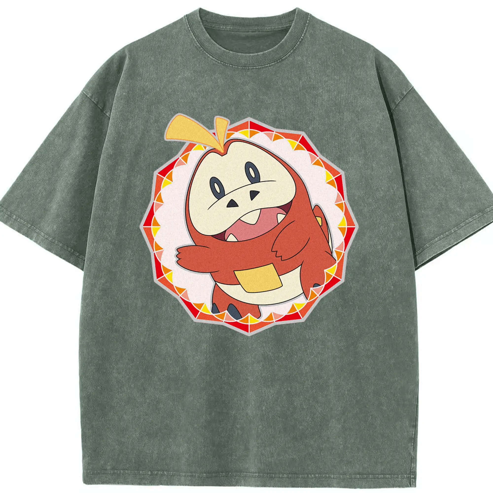 Pokemon Fuecoco T-Shirt - Washed Vintage Look 230g Cotton Oversized T-Shirt With Front Heat Transfer Print – Soft, Lightweight, Stylish Fit – Comfortable Casual Wear For Sports & Everyday Use