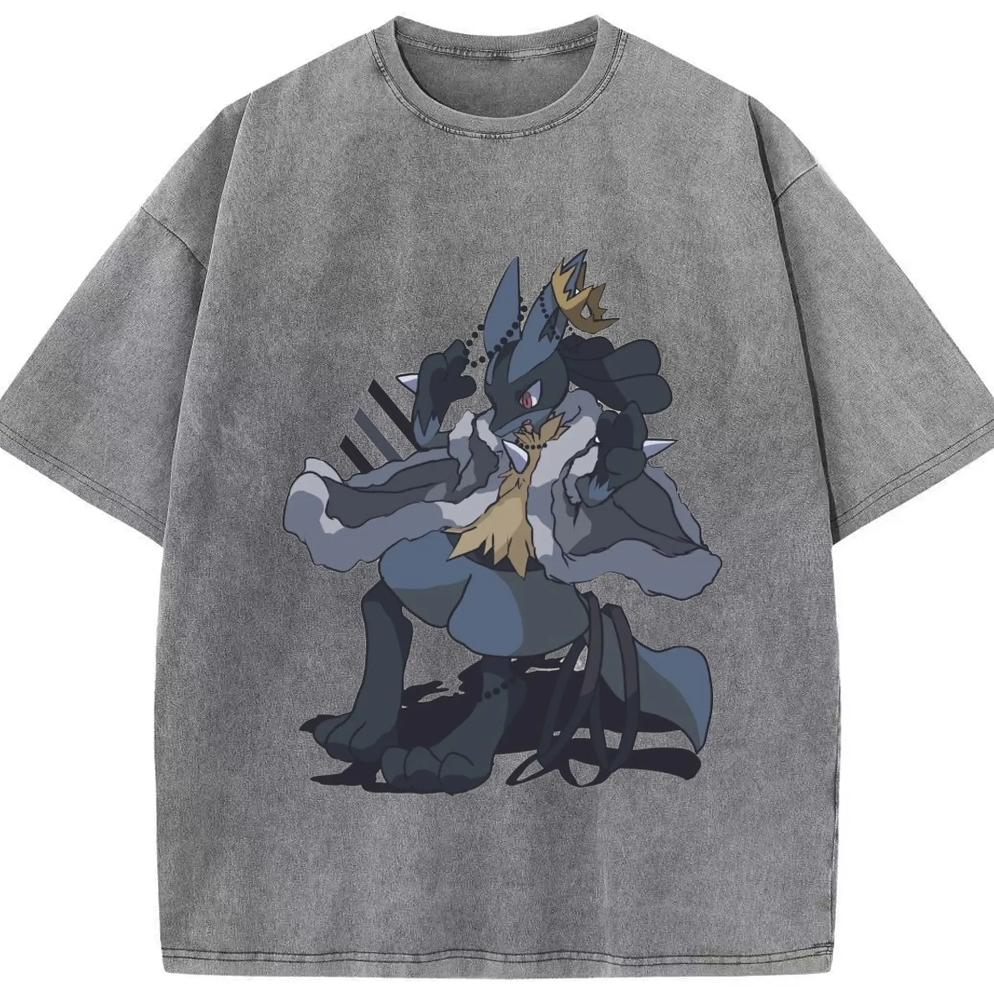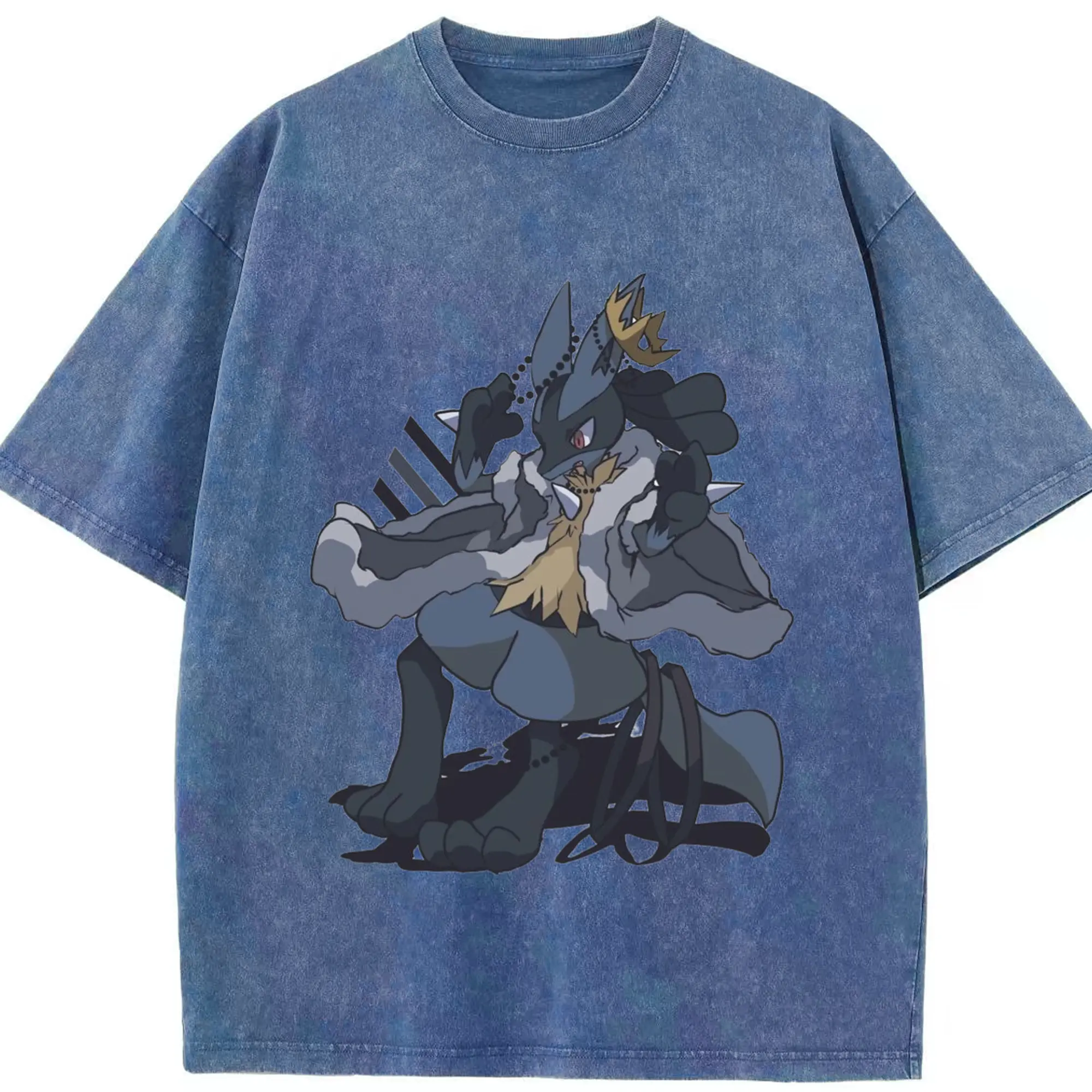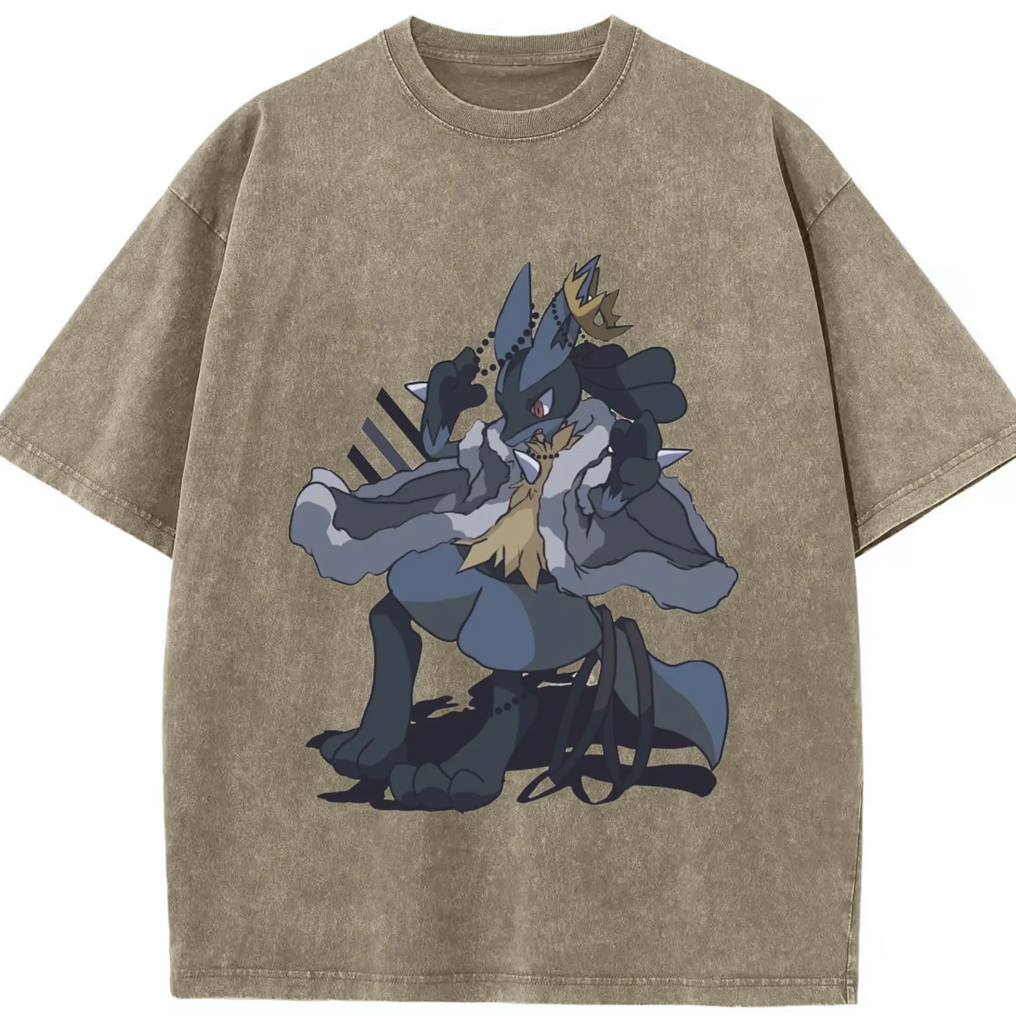 Pokemon Lucario graphic t shirt - Washed Vintage Look 230g Cotton Oversized T-Shirt With Front Heat Transfer Print – Soft, Lightweight, Stylish Fit – Comfortable Casual Wear For Sports & Everyday Use