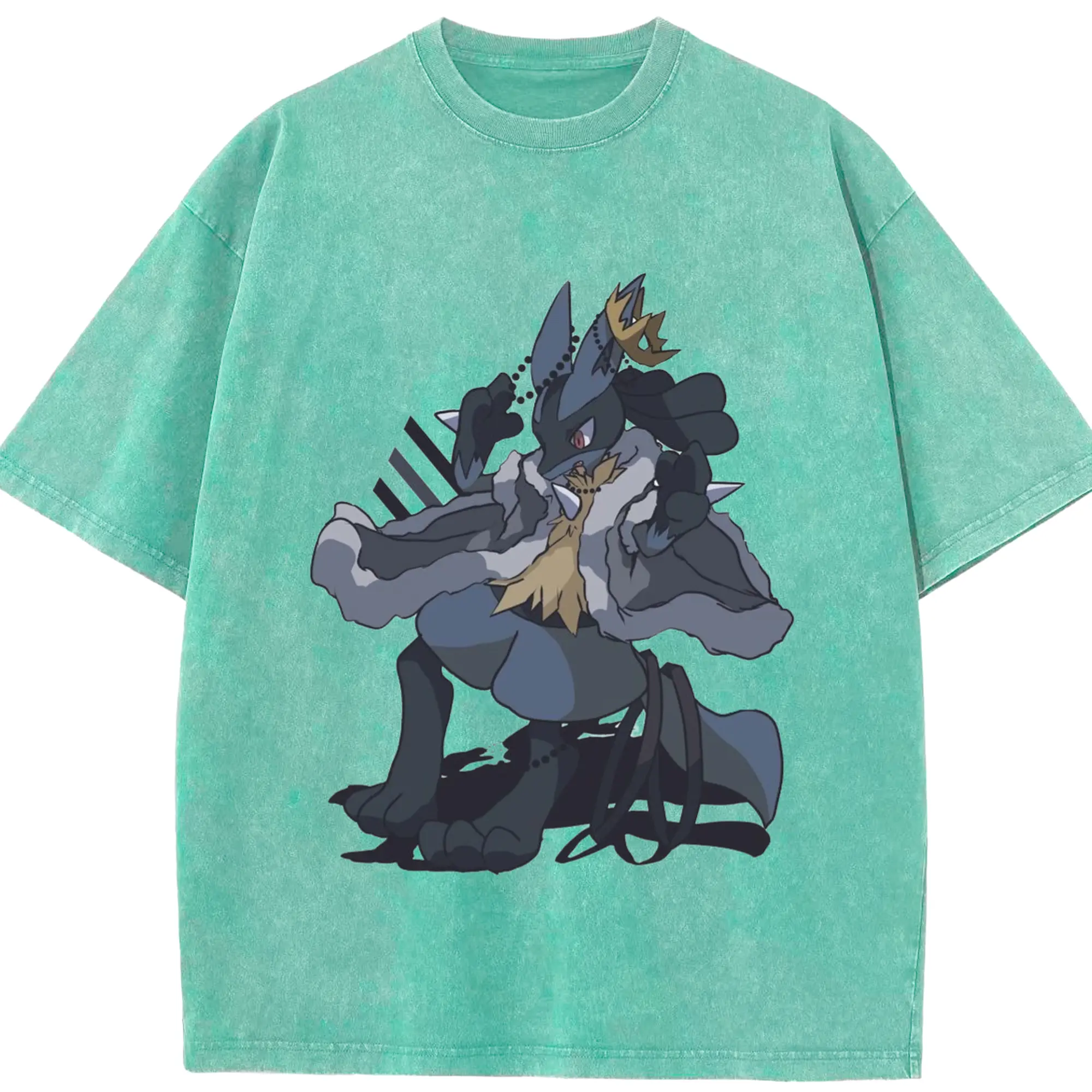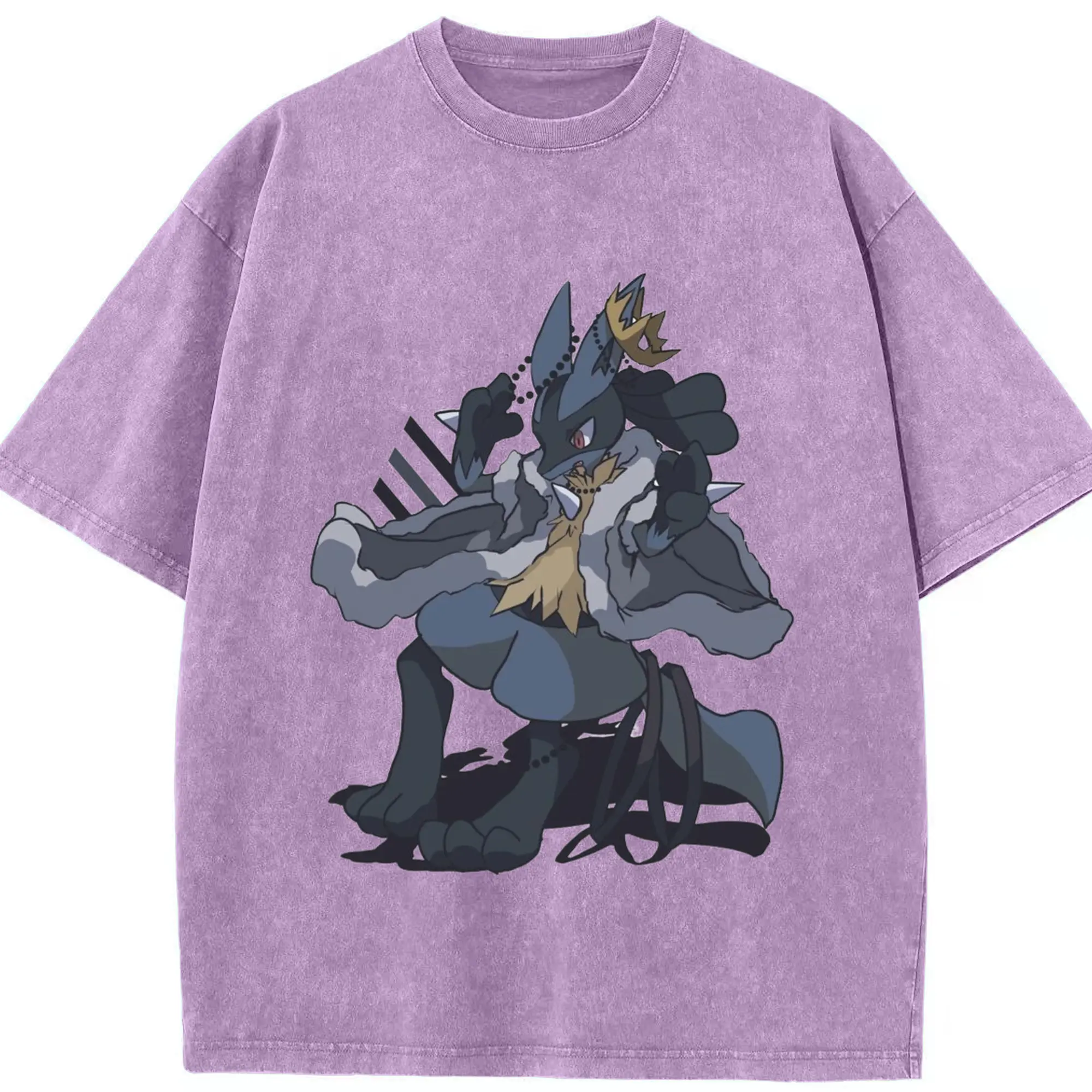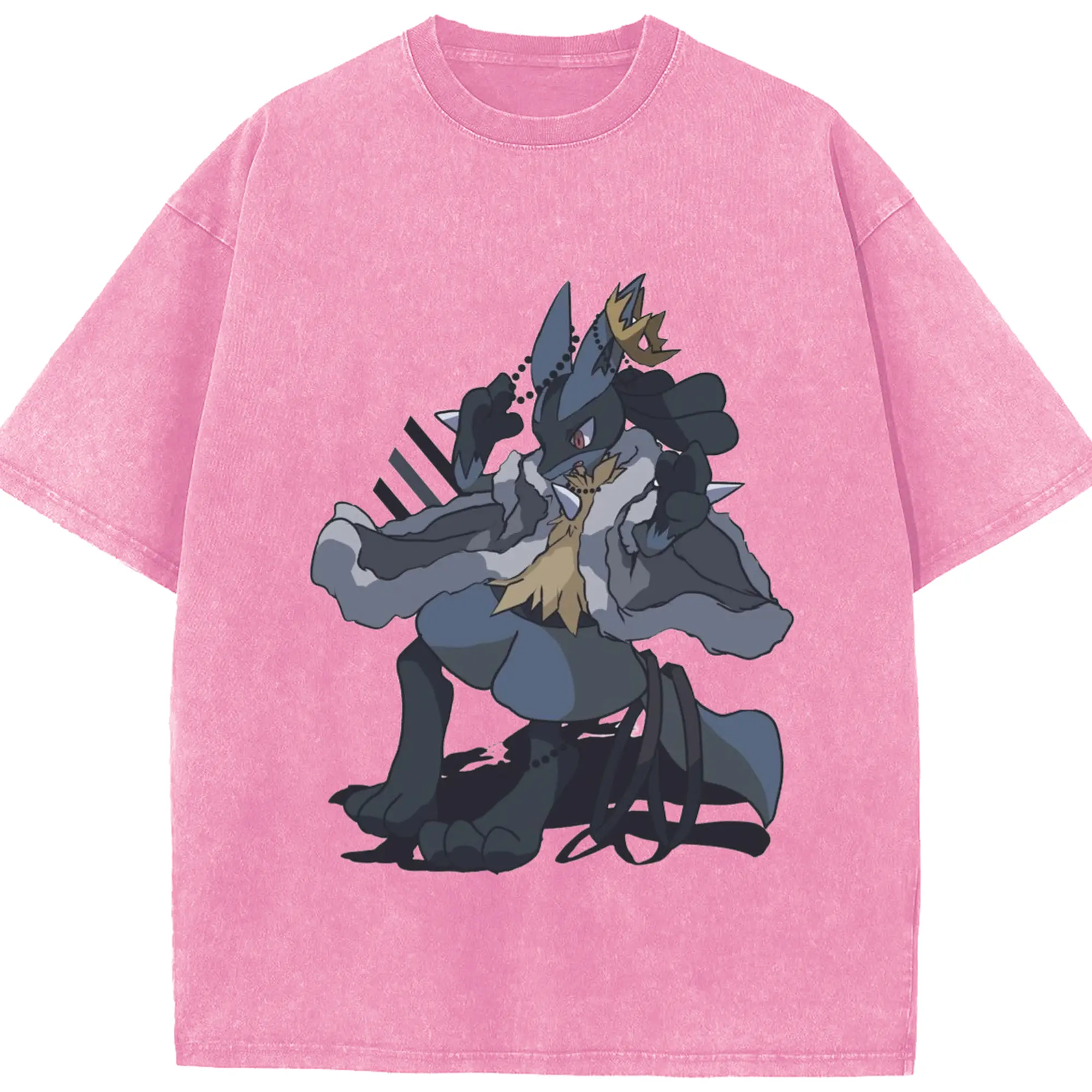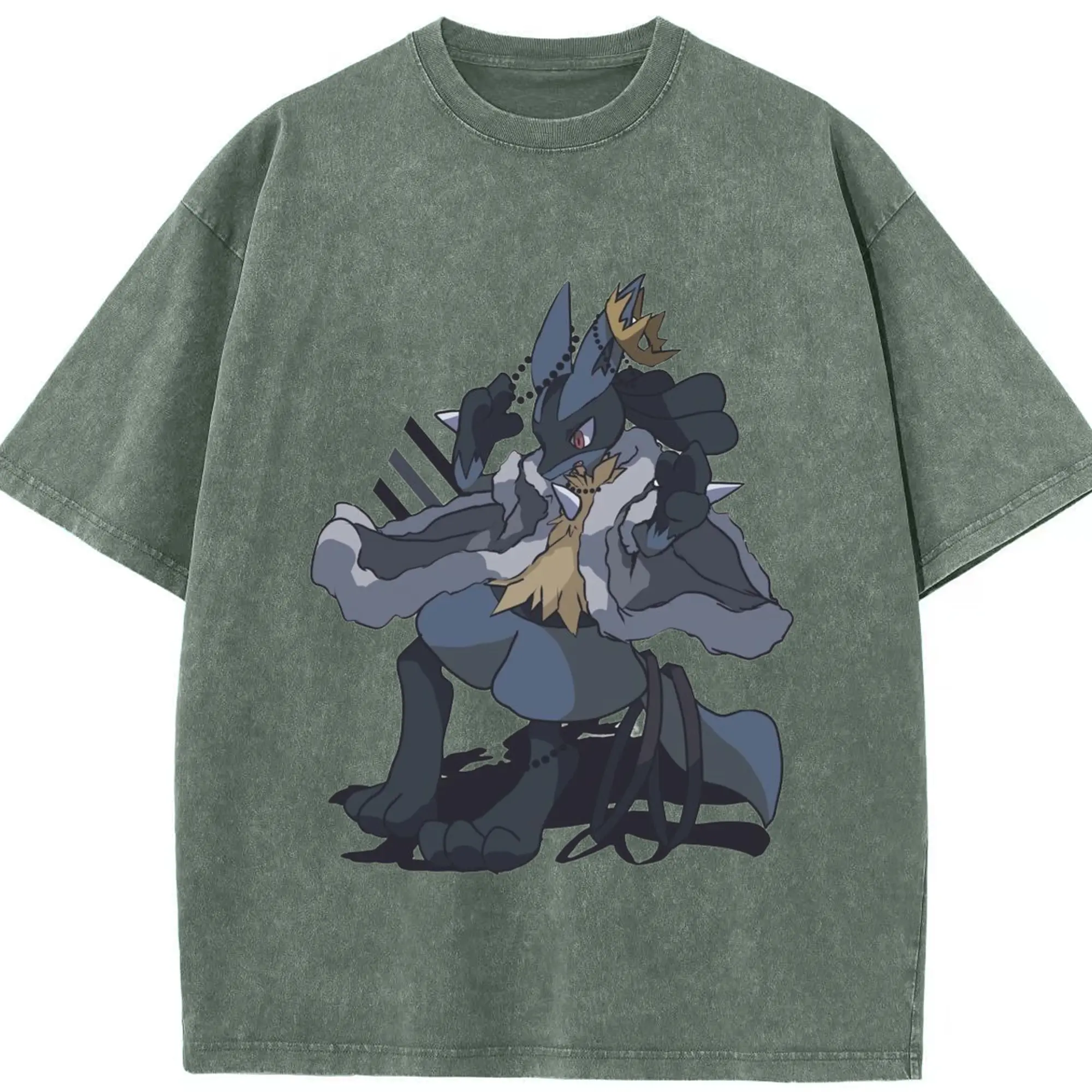 Pokemon Lucario graphic t shirt - Washed Vintage Look 230g Cotton Oversized T-Shirt With Front Heat Transfer Print – Soft, Lightweight, Stylish Fit – Comfortable Casual Wear For Sports & Everyday Use