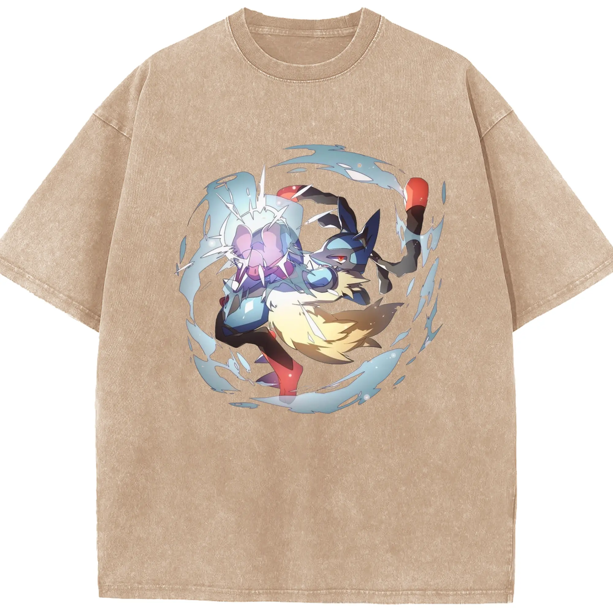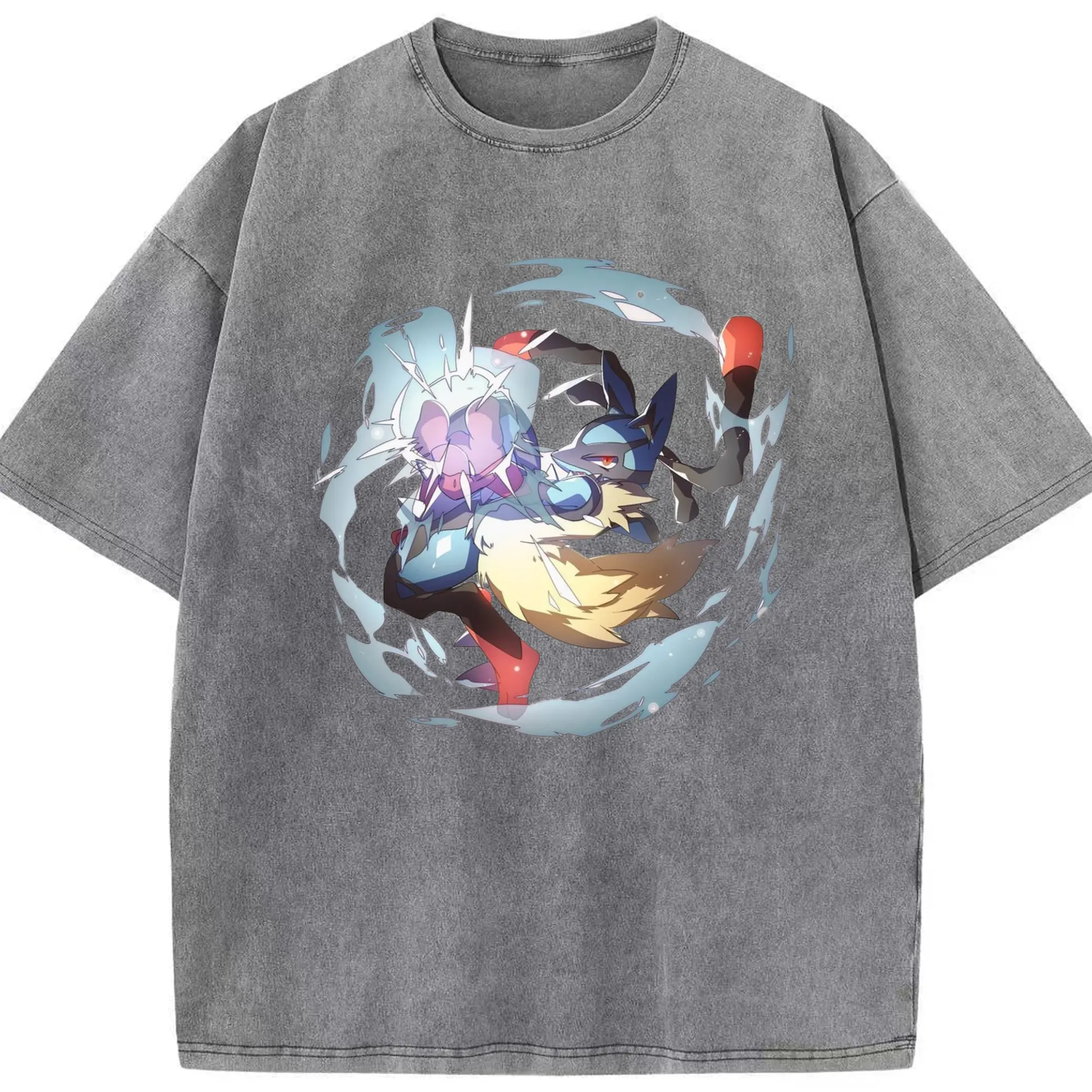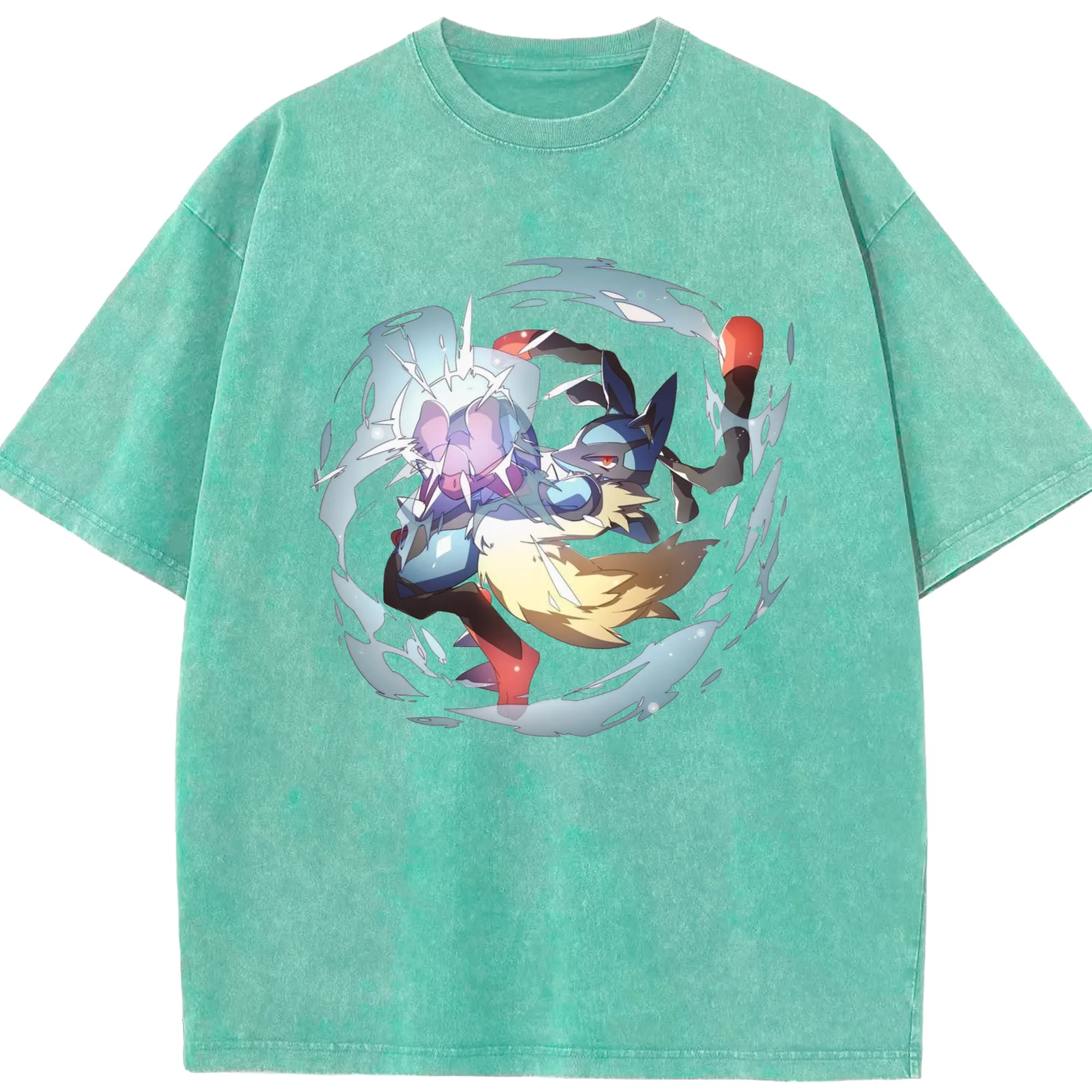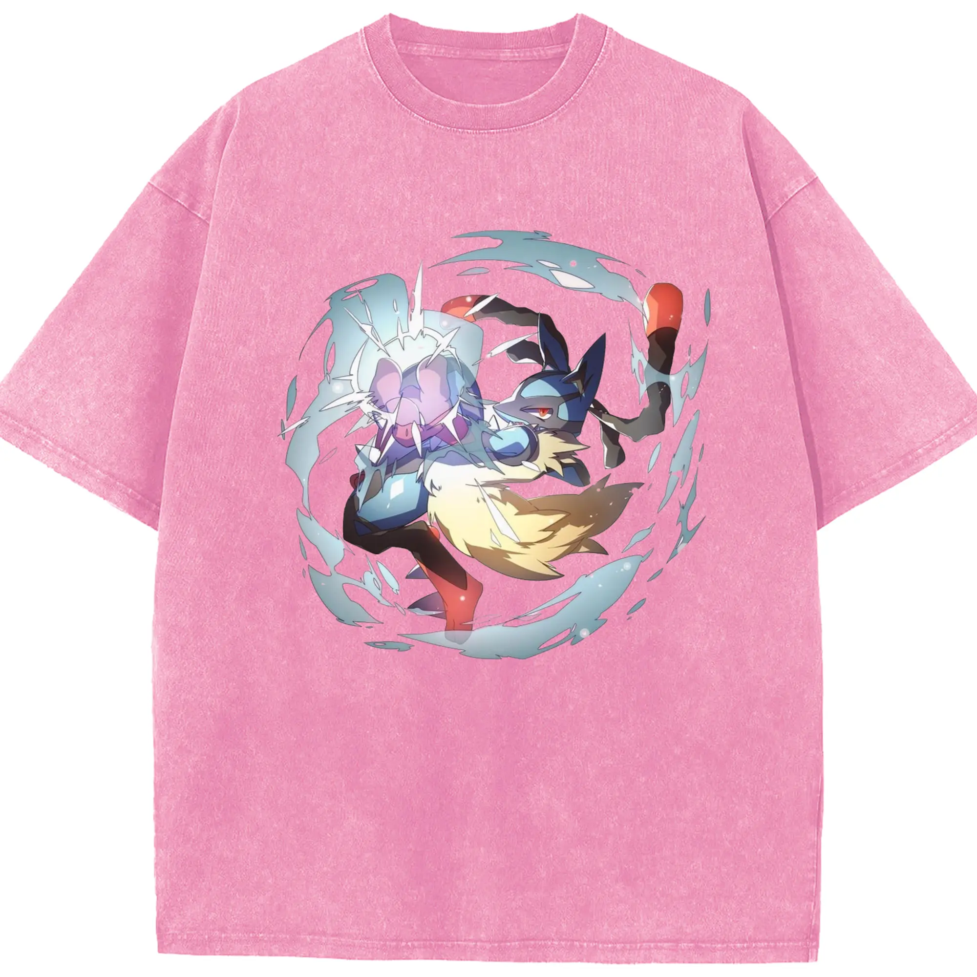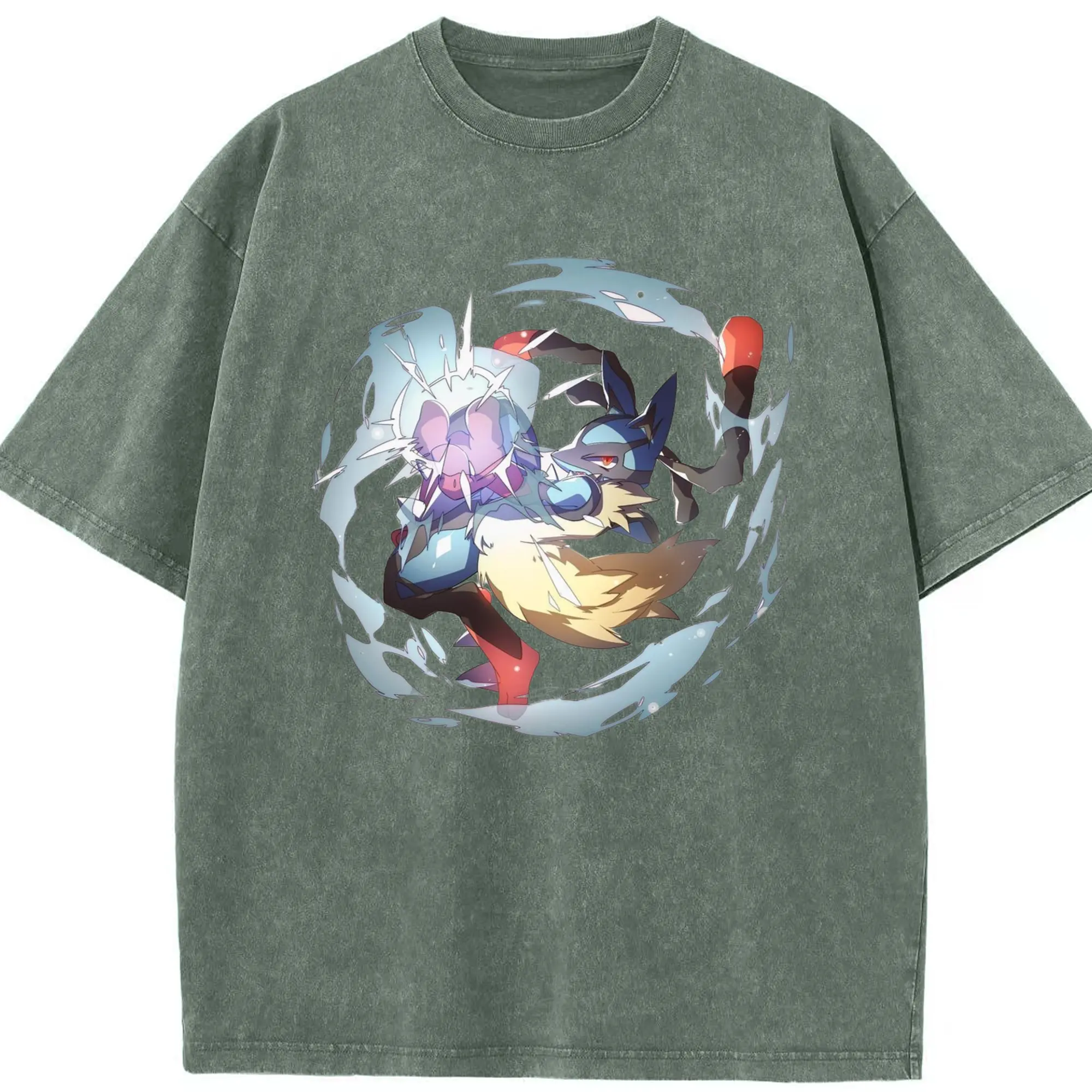 Pokemon mage lucario tee shir - Washed Vintage Look 230g Cotton Oversized T-Shirt With Front Heat Transfer Print – Soft, Lightweight, Stylish Fit – Comfortable Casual Wear For Sports & Everyday Use