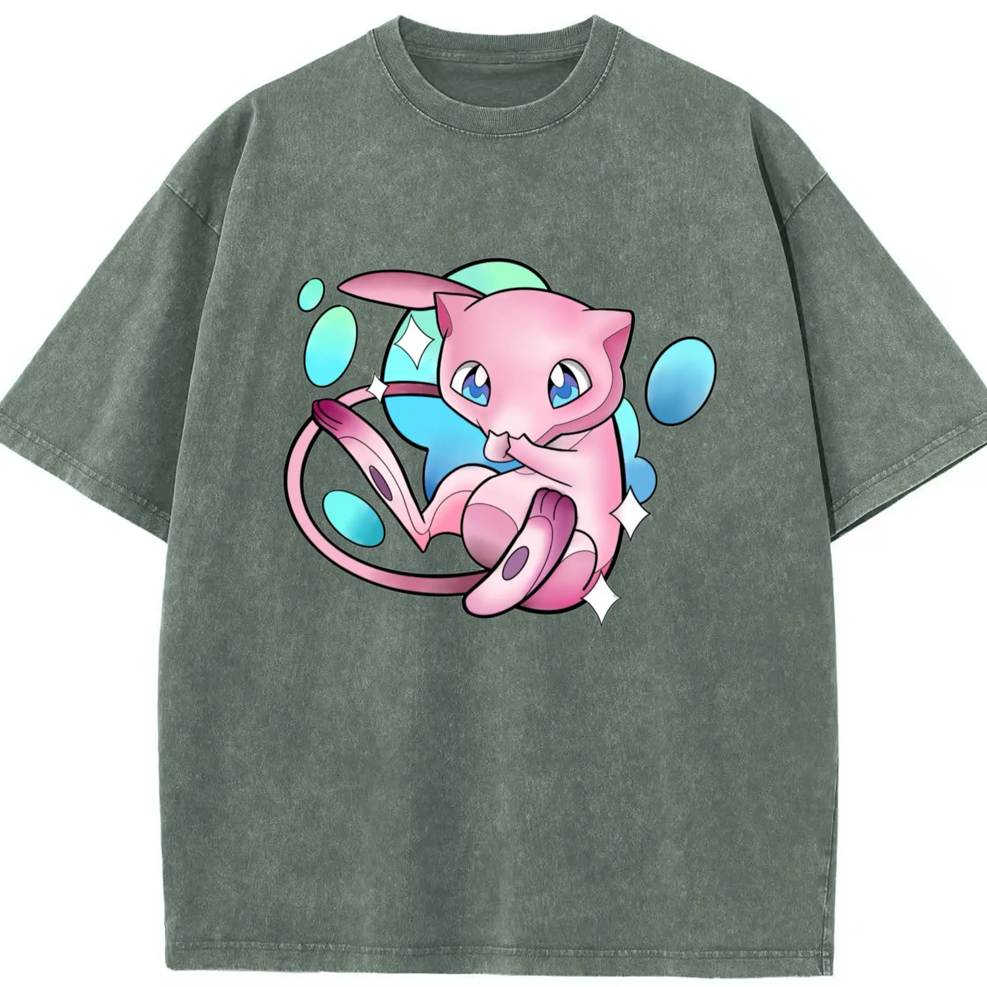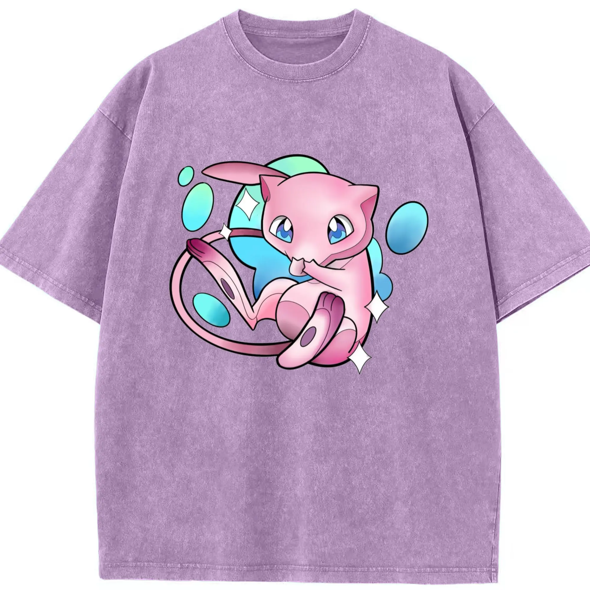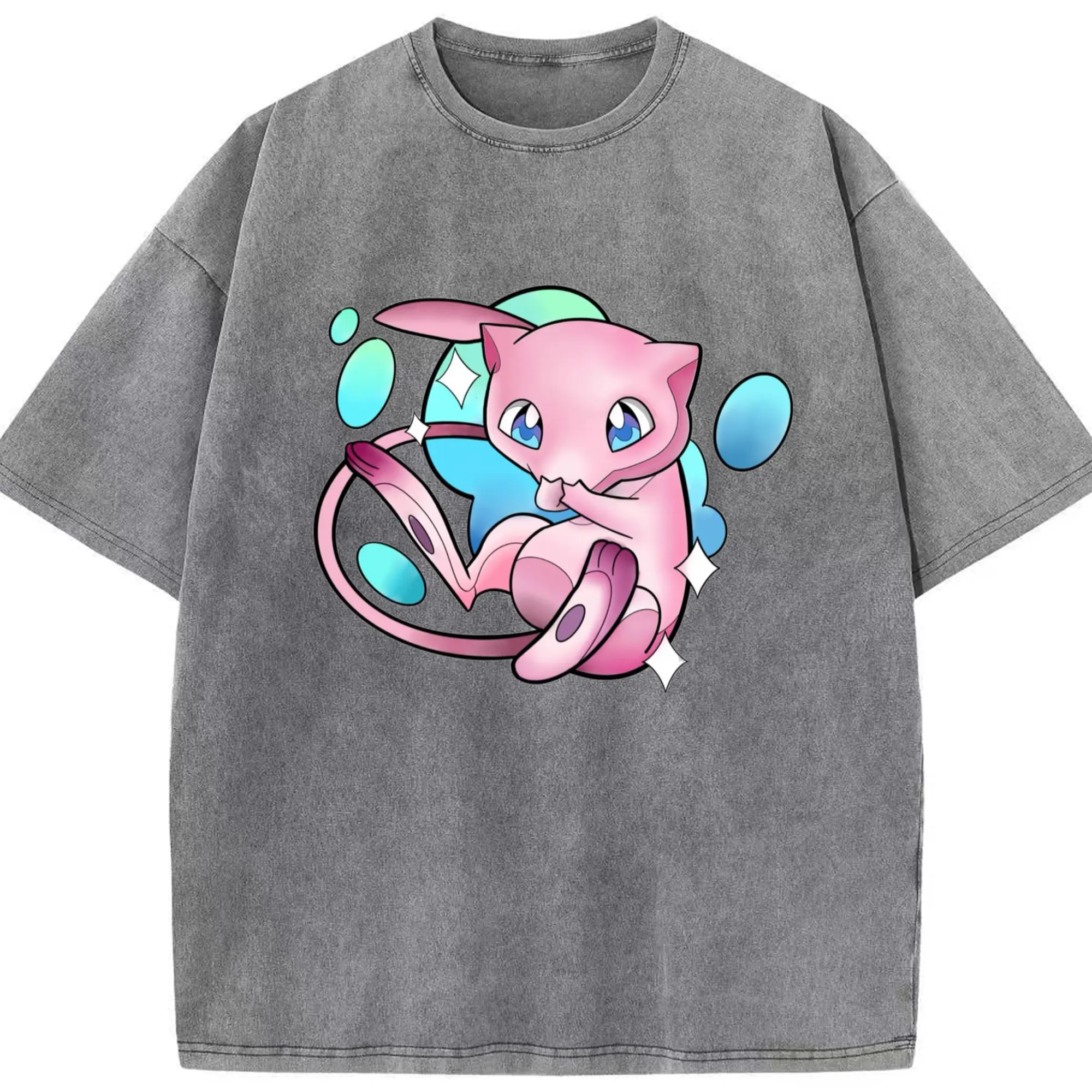 Pokemon Mew art T-Shirt - Washed Vintage Look 230g Cotton Oversized T-Shirt With Front Heat Transfer Print – Soft, Lightweight, Stylish Fit – Comfortable Casual Wear For Sports & Everyday Use