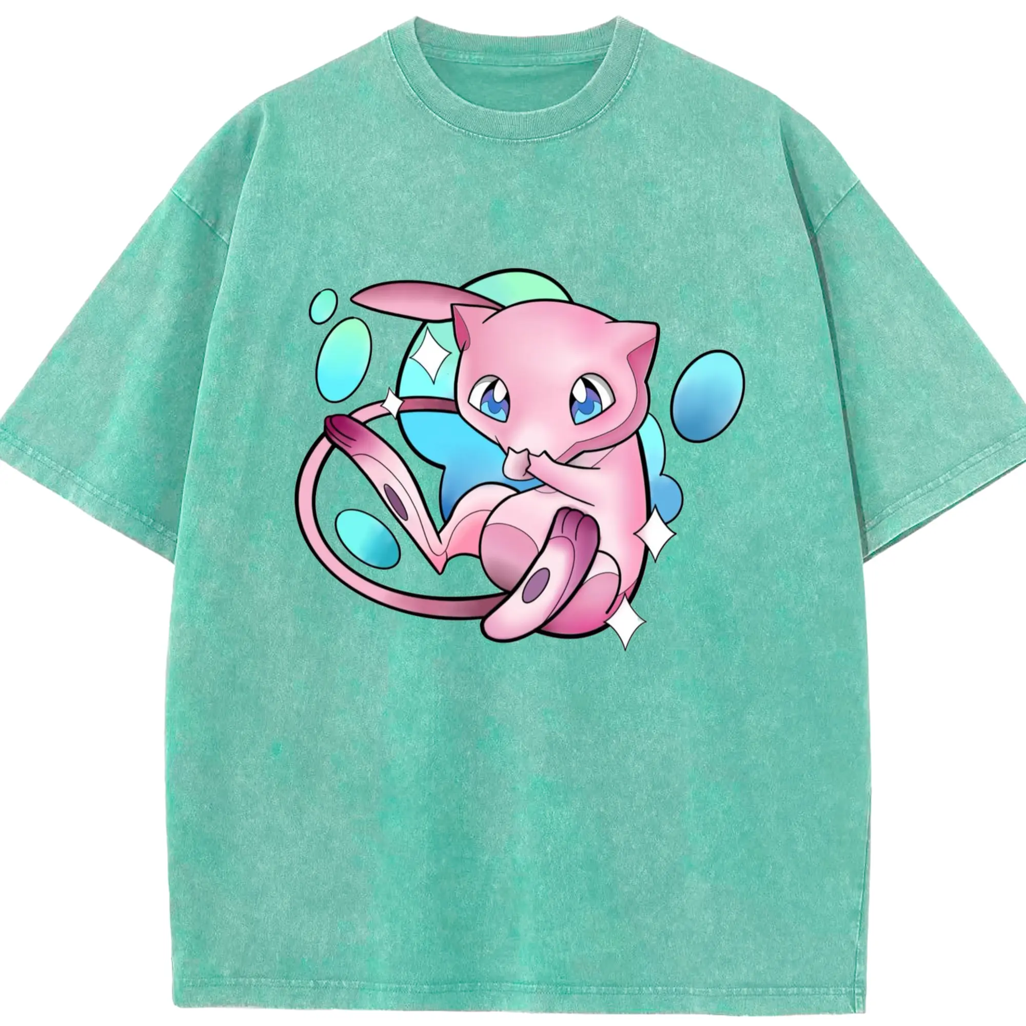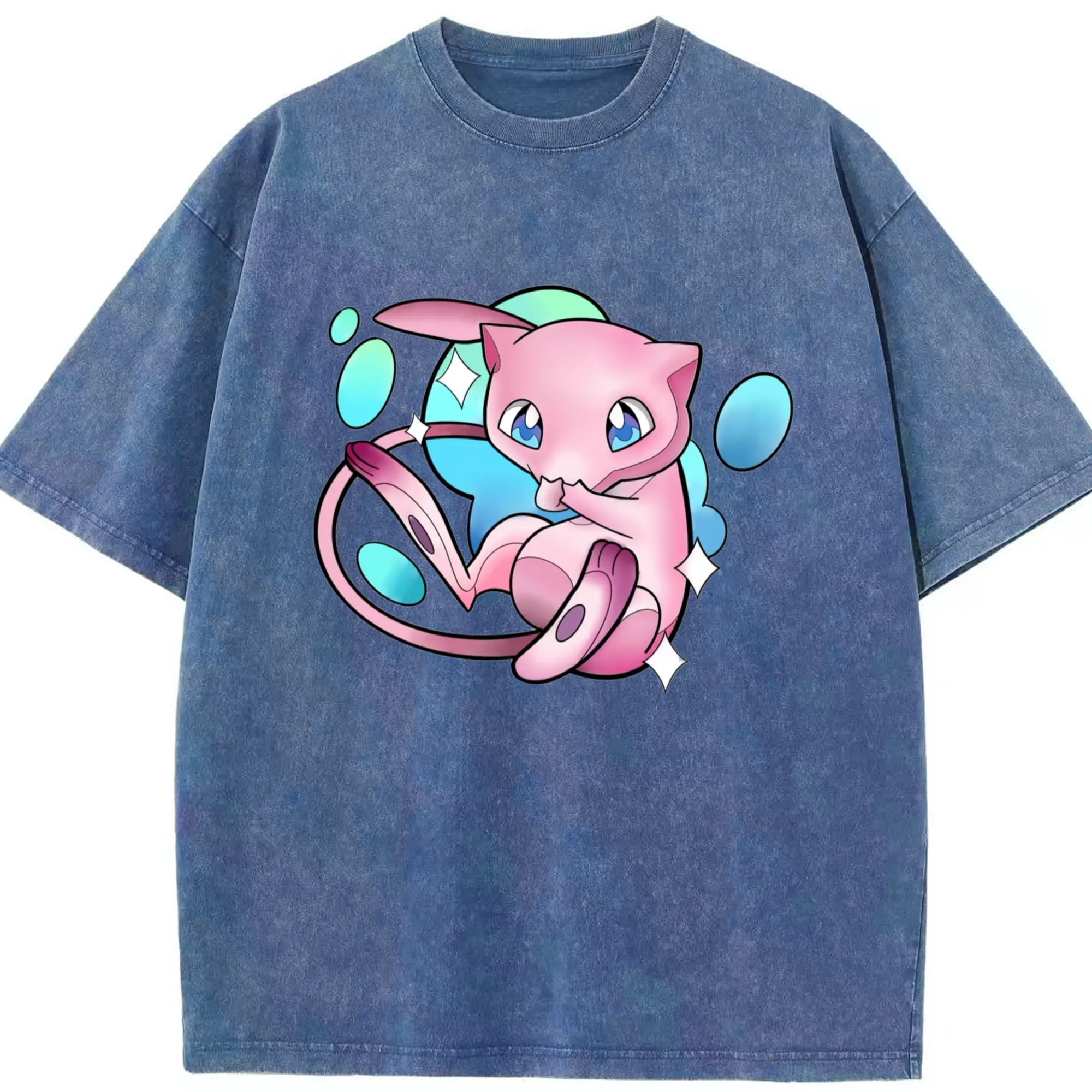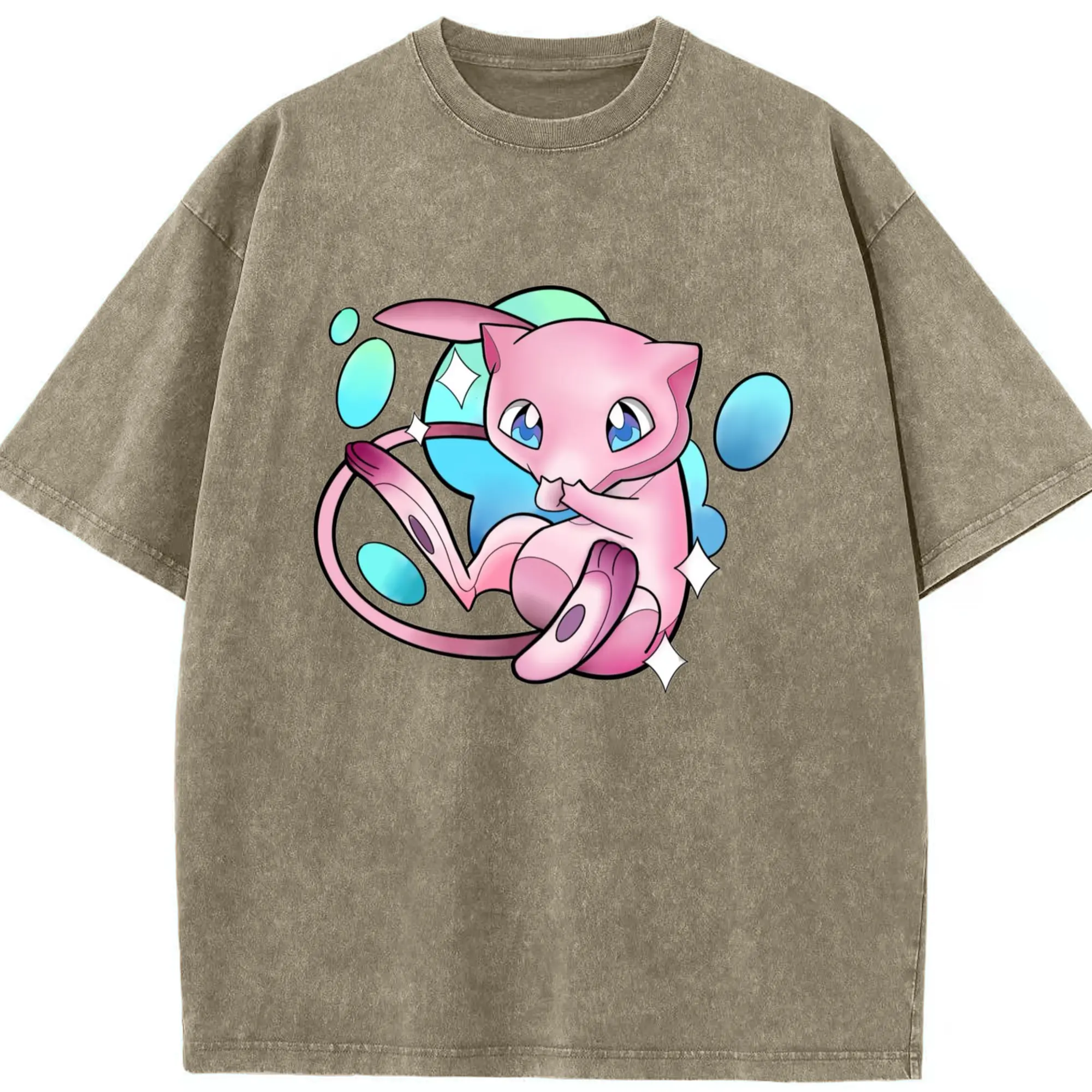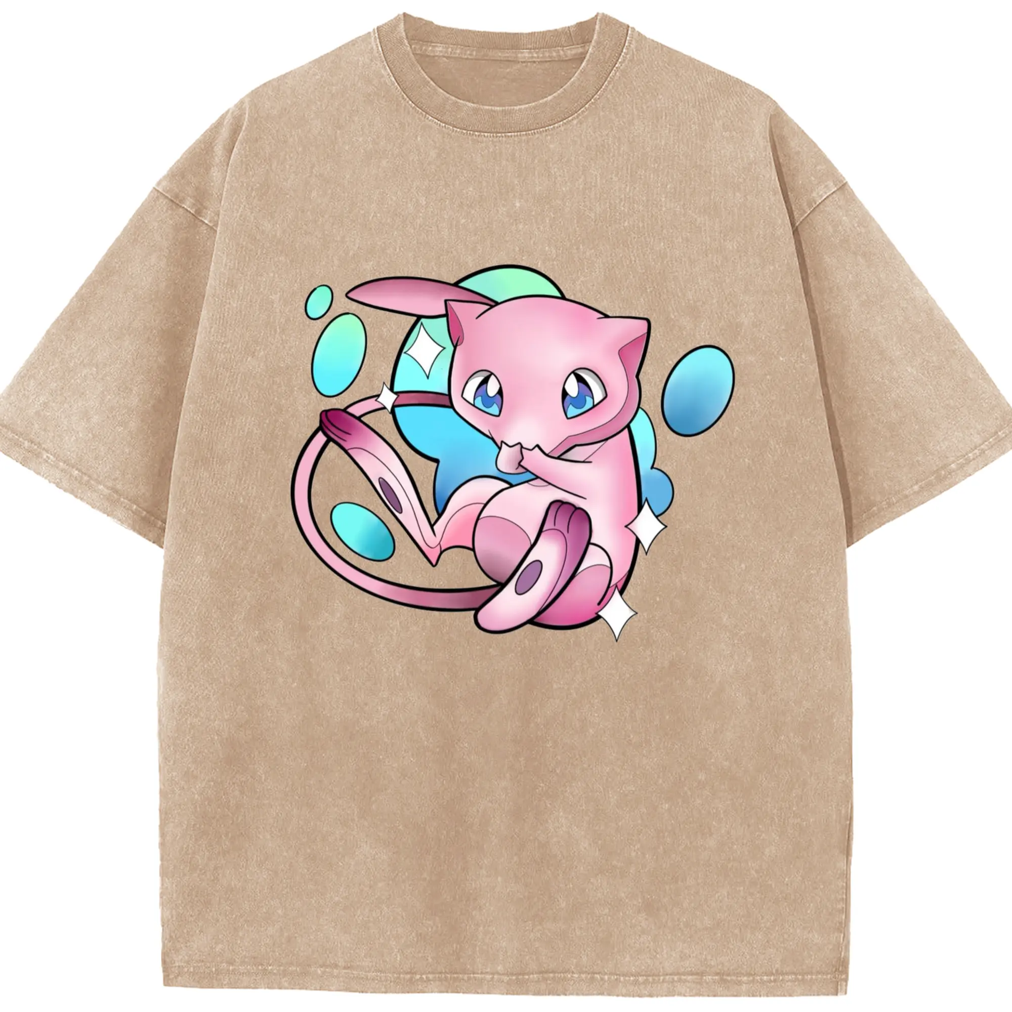 Pokemon Mew art T-Shirt - Washed Vintage Look 230g Cotton Oversized T-Shirt With Front Heat Transfer Print – Soft, Lightweight, Stylish Fit – Comfortable Casual Wear For Sports & Everyday Use