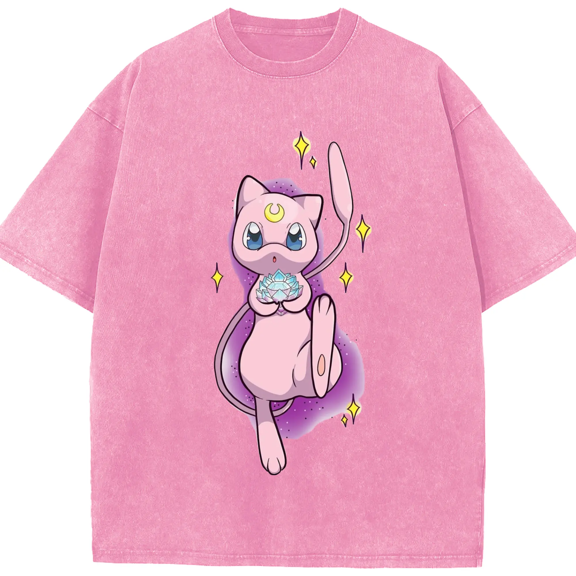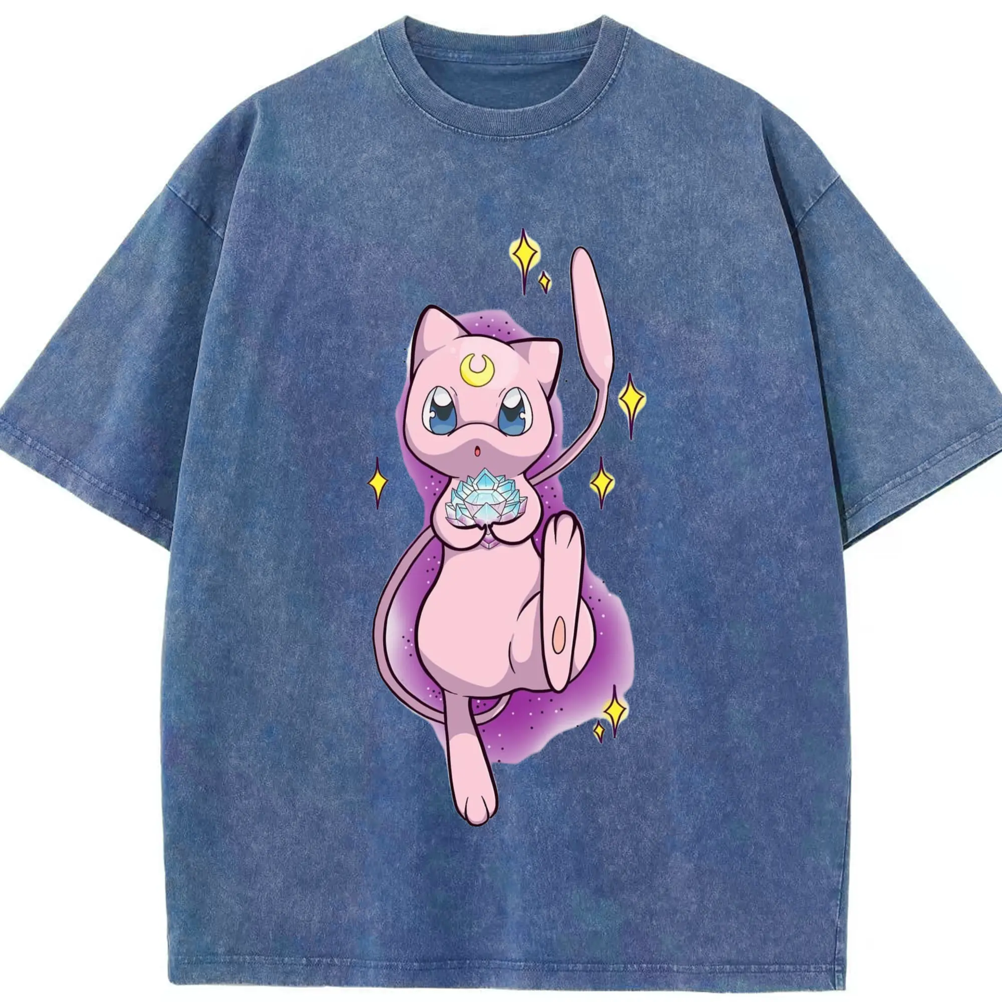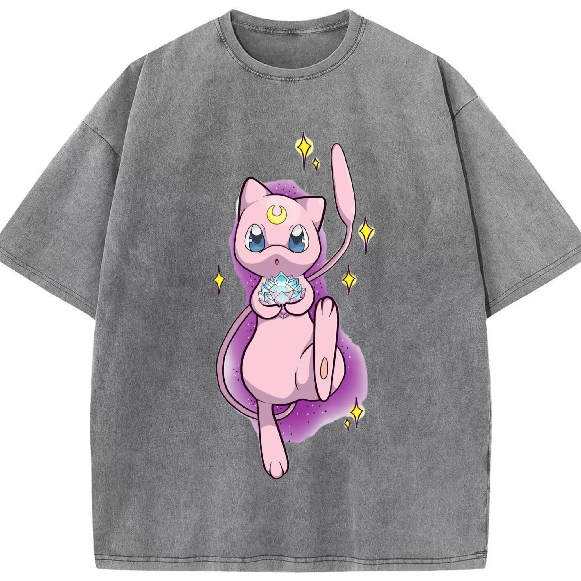 Pokemon mew t-shirt - Washed Vintage Look 230g Cotton Oversized T-Shirt With Front Heat Transfer Print – Soft, Lightweight, Stylish Fit – Comfortable Casual Wear For Sports & Everyday Use