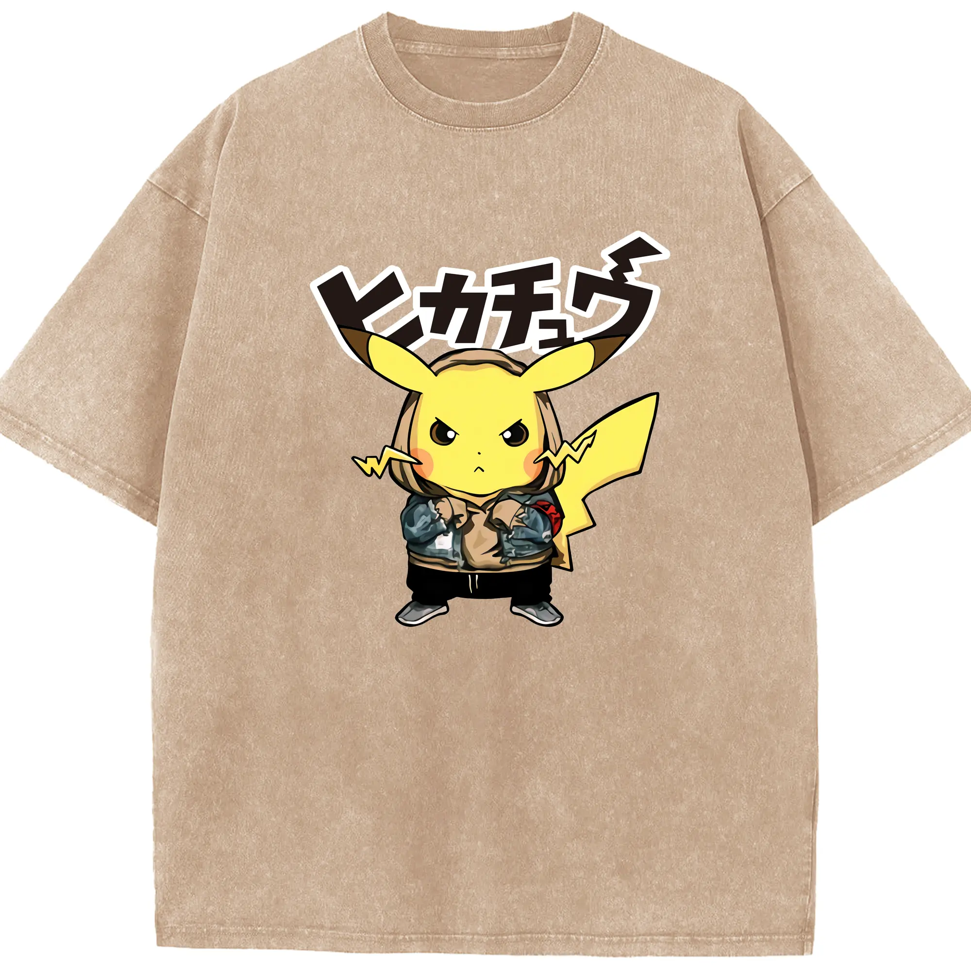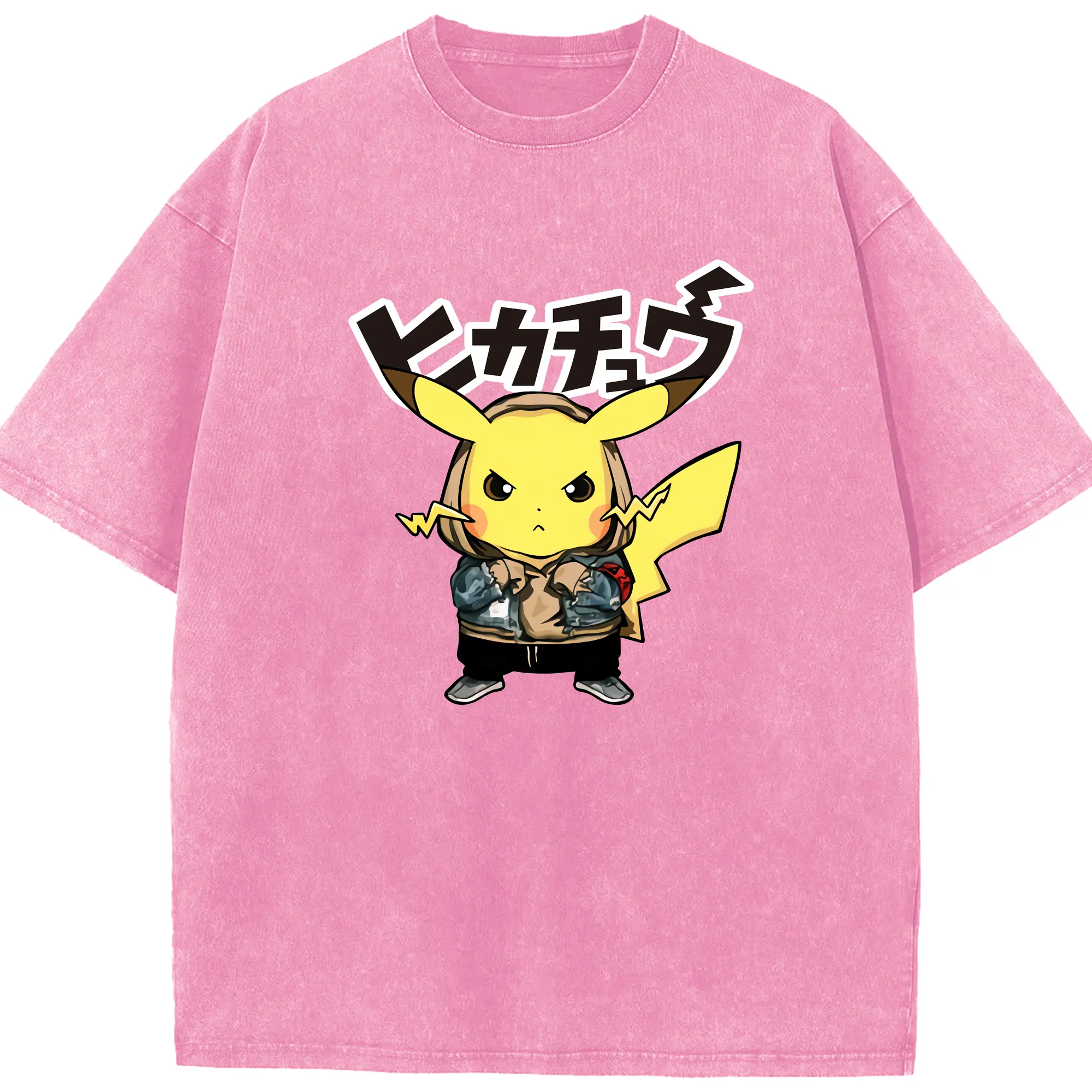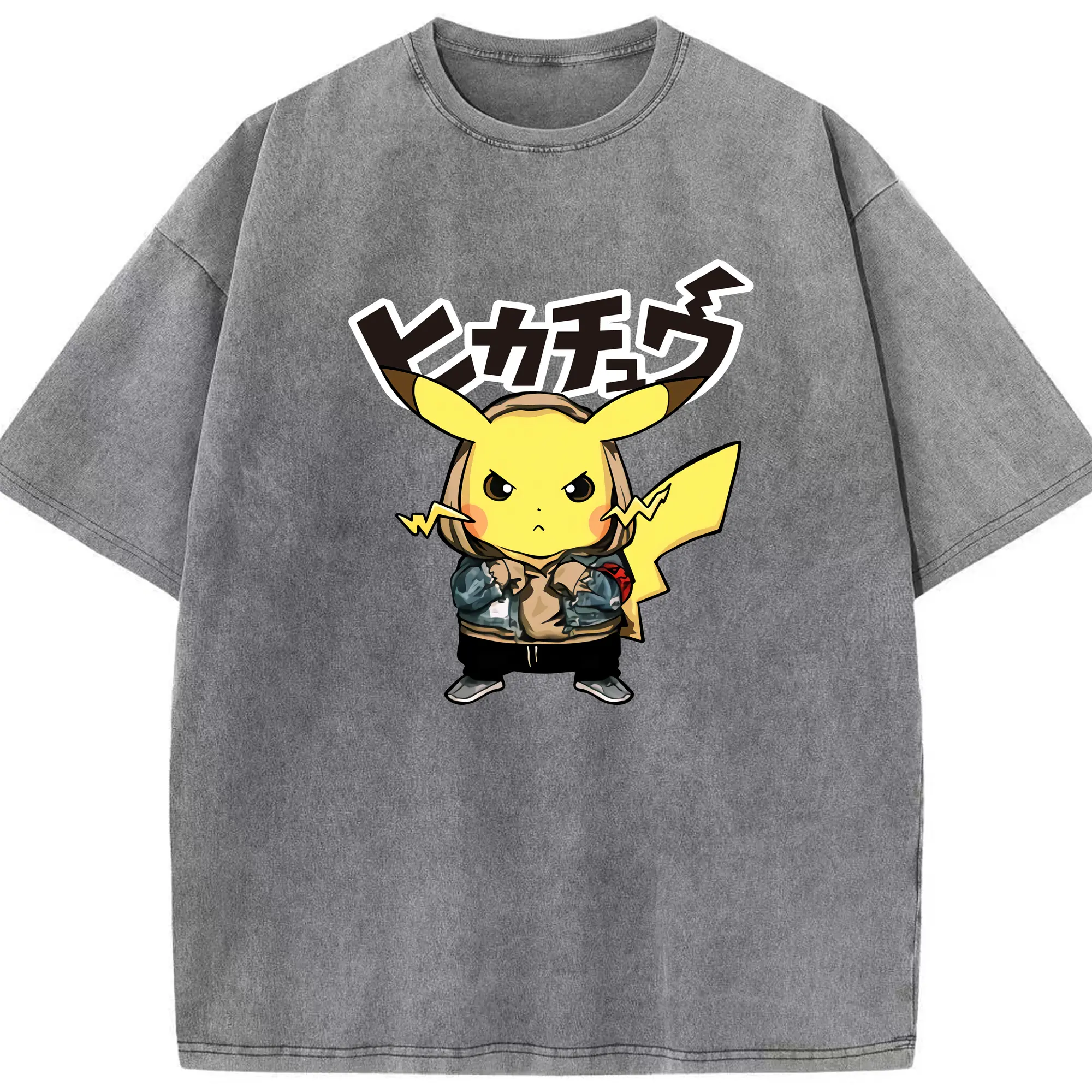 Pokemon Pikachu graphic t-shirt - Washed Vintage Look 230g Cotton Oversized T-Shirt With Front Heat Transfer Print – Soft, Lightweight, Stylish Fit – Comfortable Casual Wear For Sports & Everyday Use