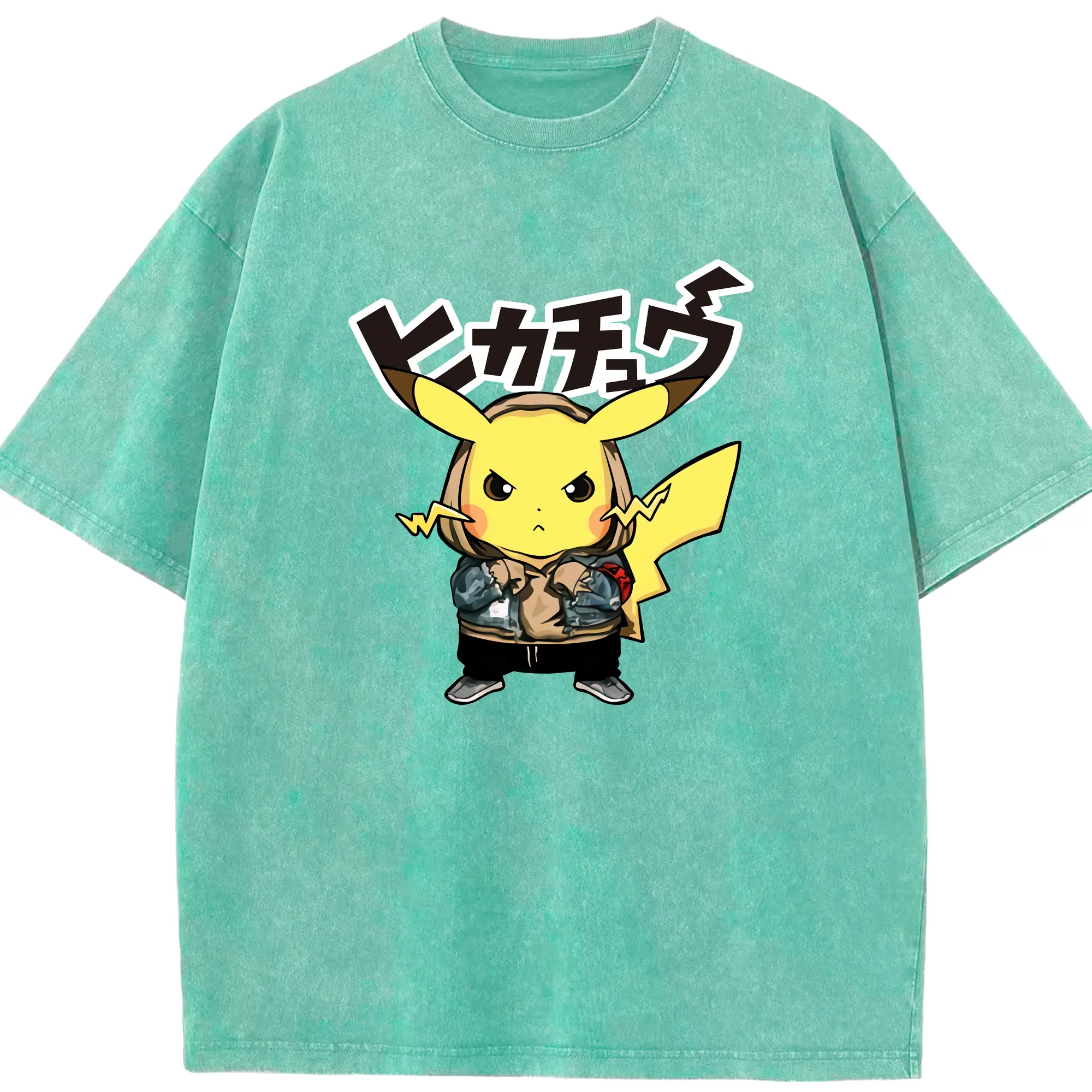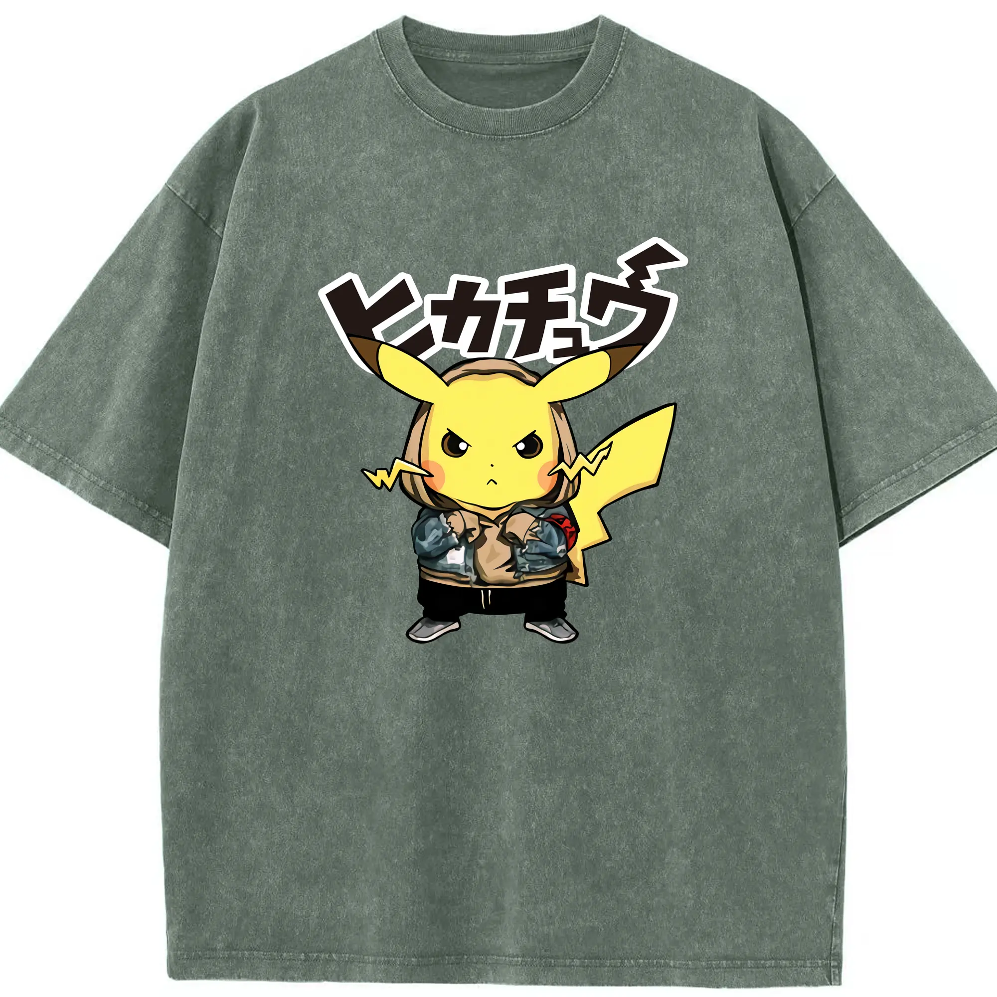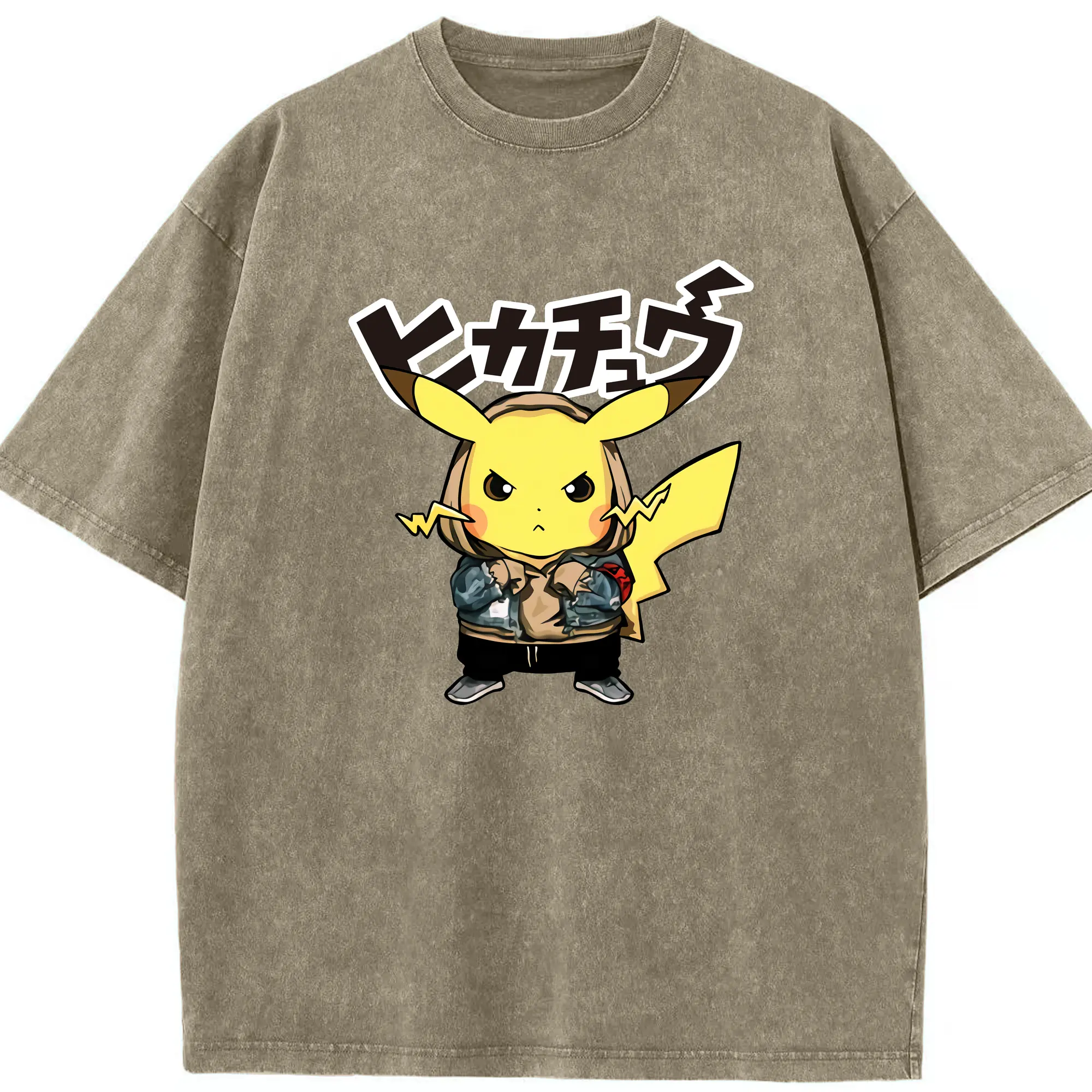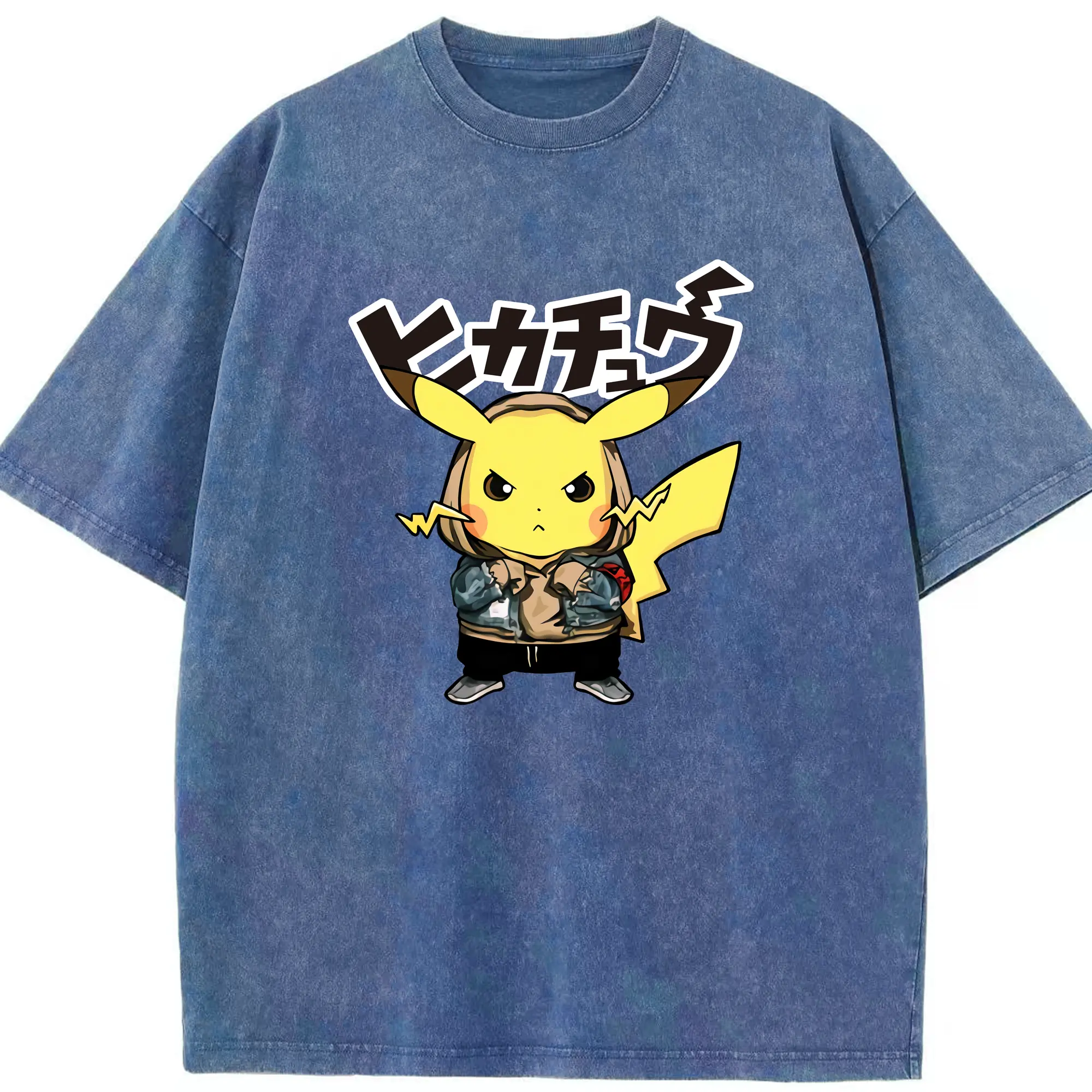 Pokemon Pikachu graphic t-shirt - Washed Vintage Look 230g Cotton Oversized T-Shirt With Front Heat Transfer Print – Soft, Lightweight, Stylish Fit – Comfortable Casual Wear For Sports & Everyday Use