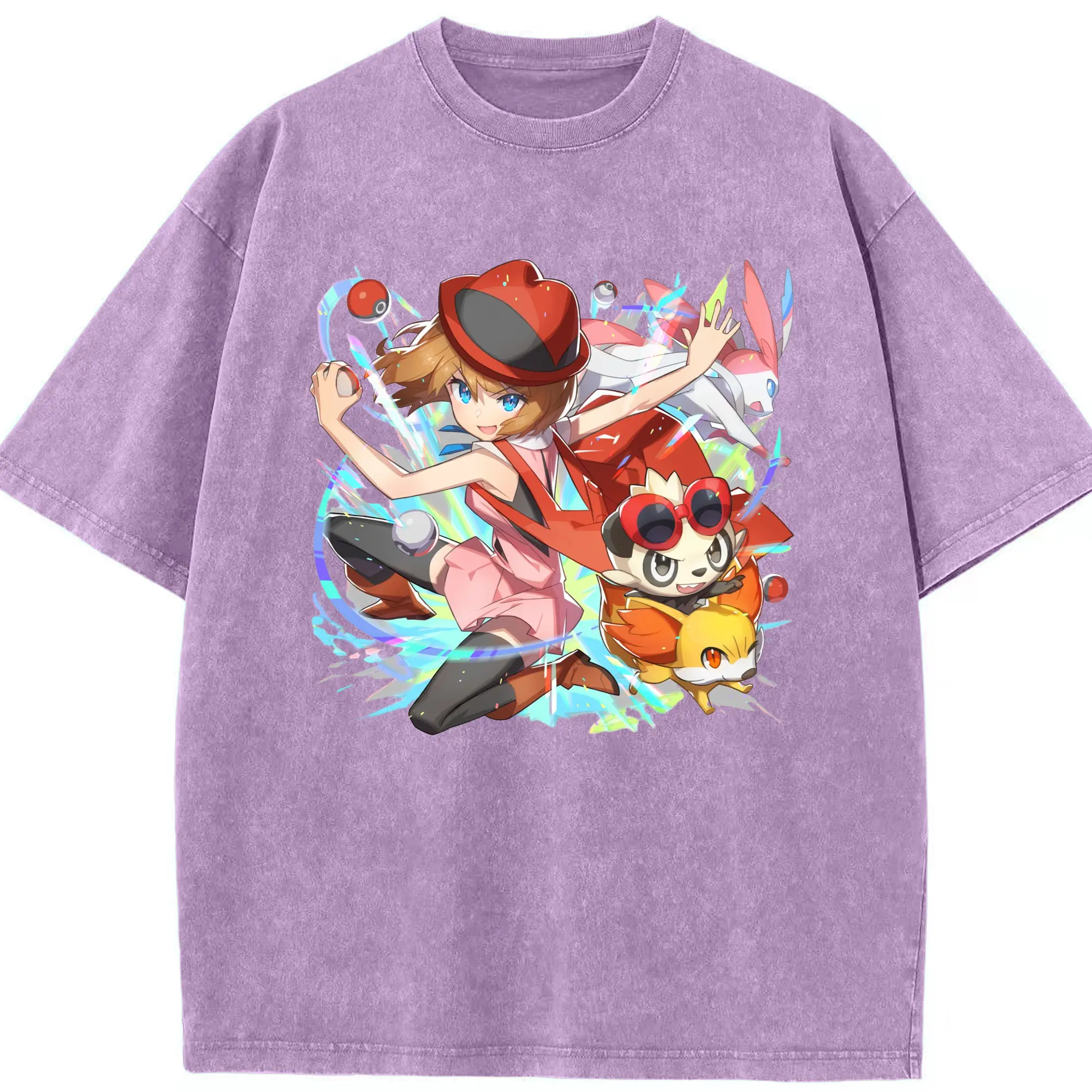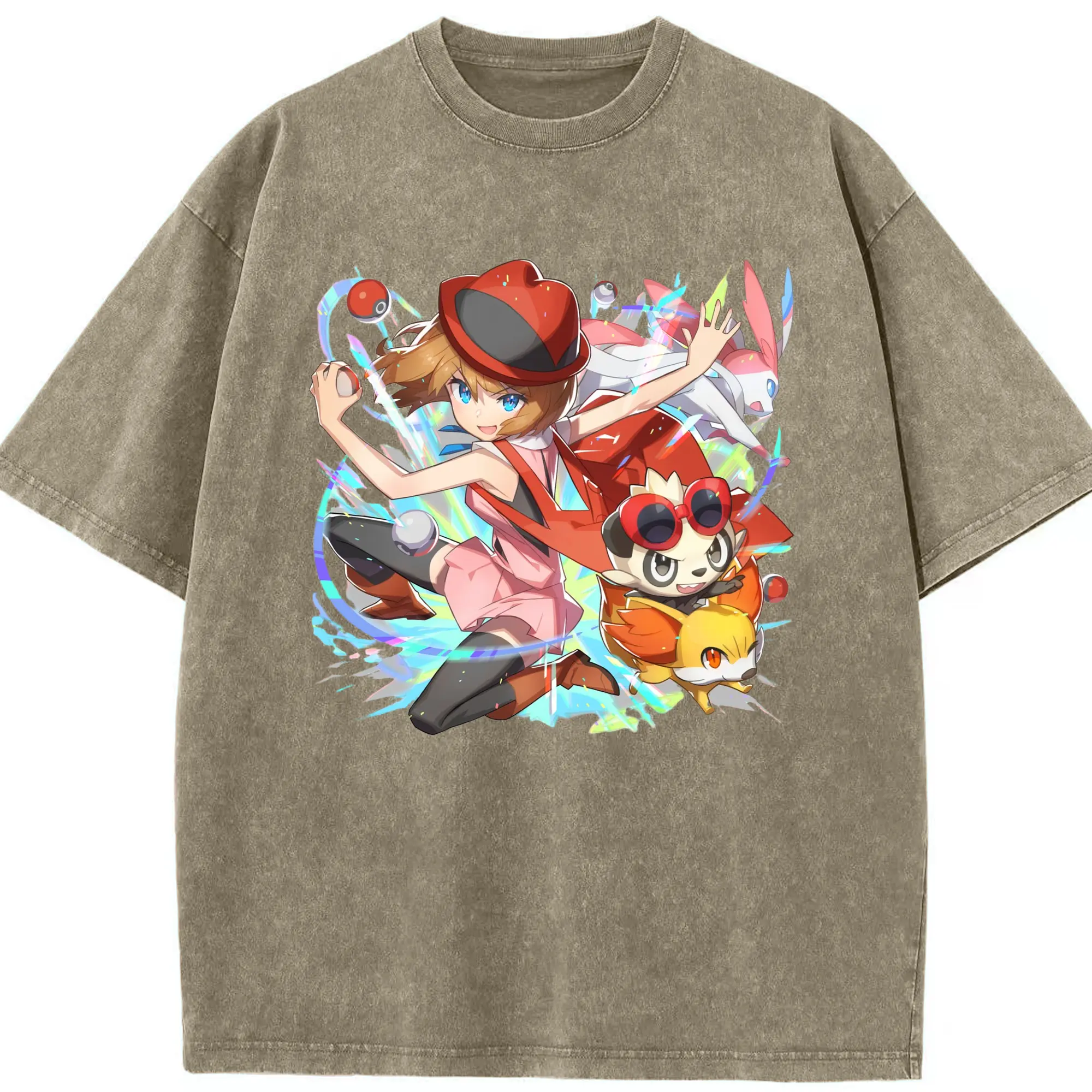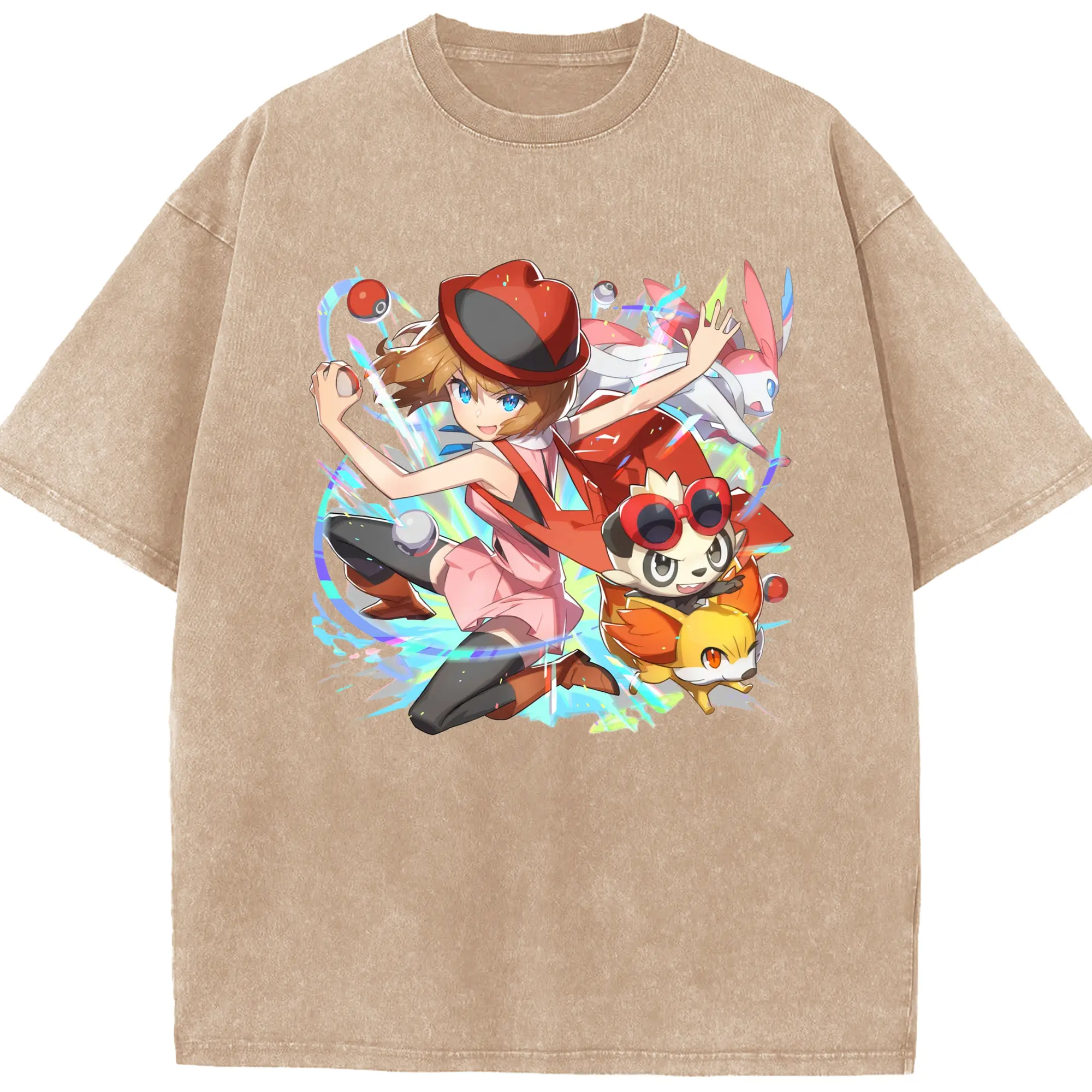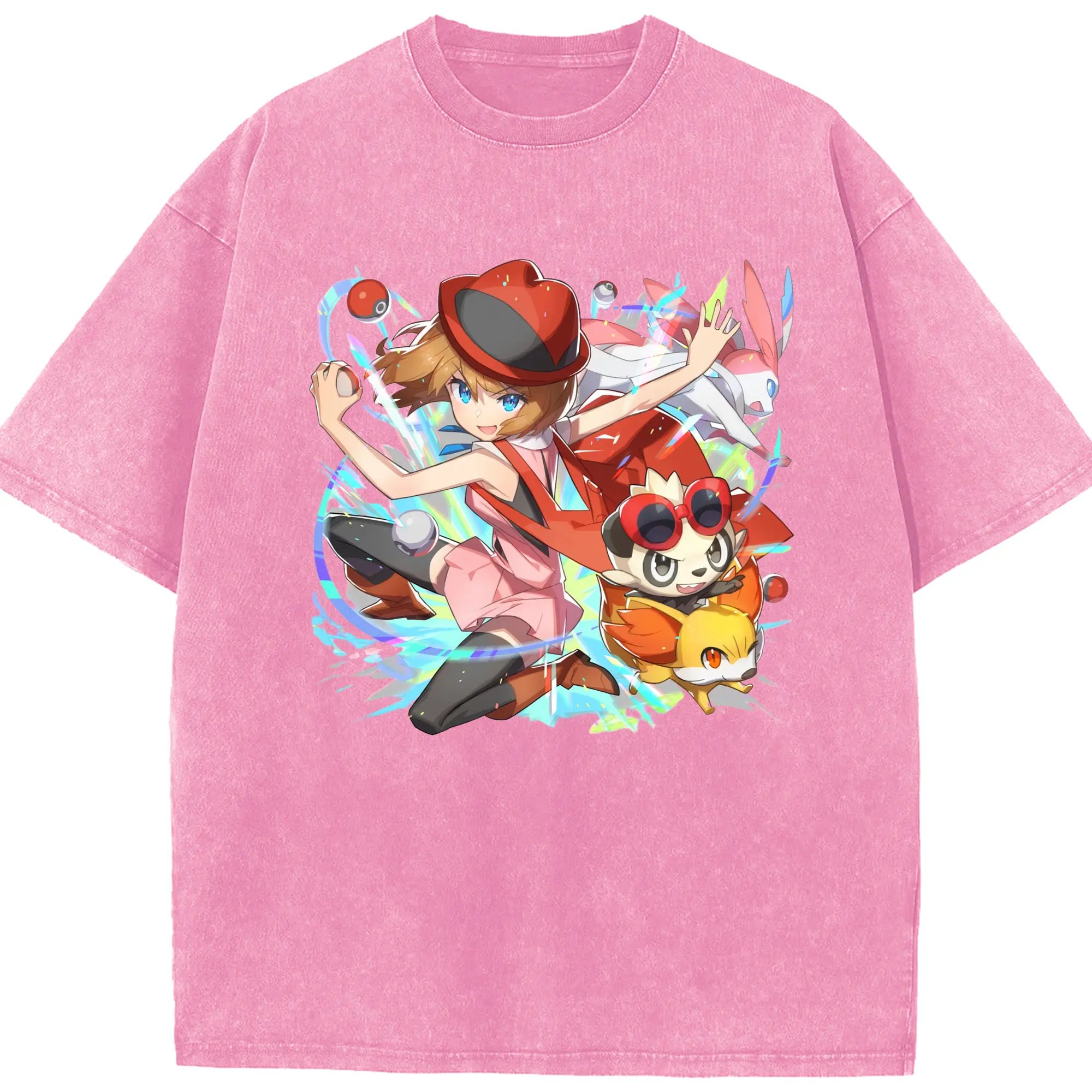 Pokemon Serena Men's T-Shirts - Washed Vintage Look 230g Cotton Oversized T-Shirt With Front Heat Transfer Print – Soft, Lightweight, Stylish Fit – Comfortable Casual Wear For Sports & Everyday Use