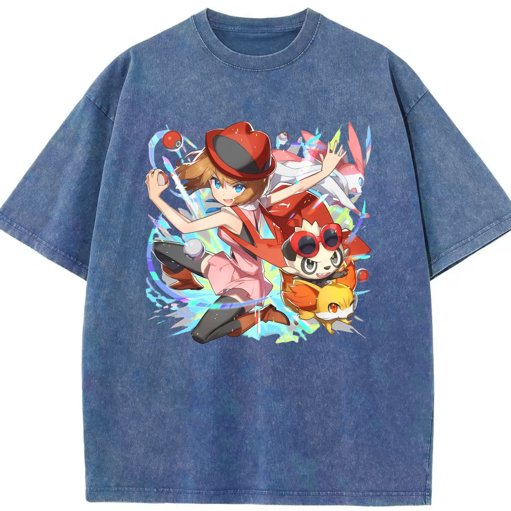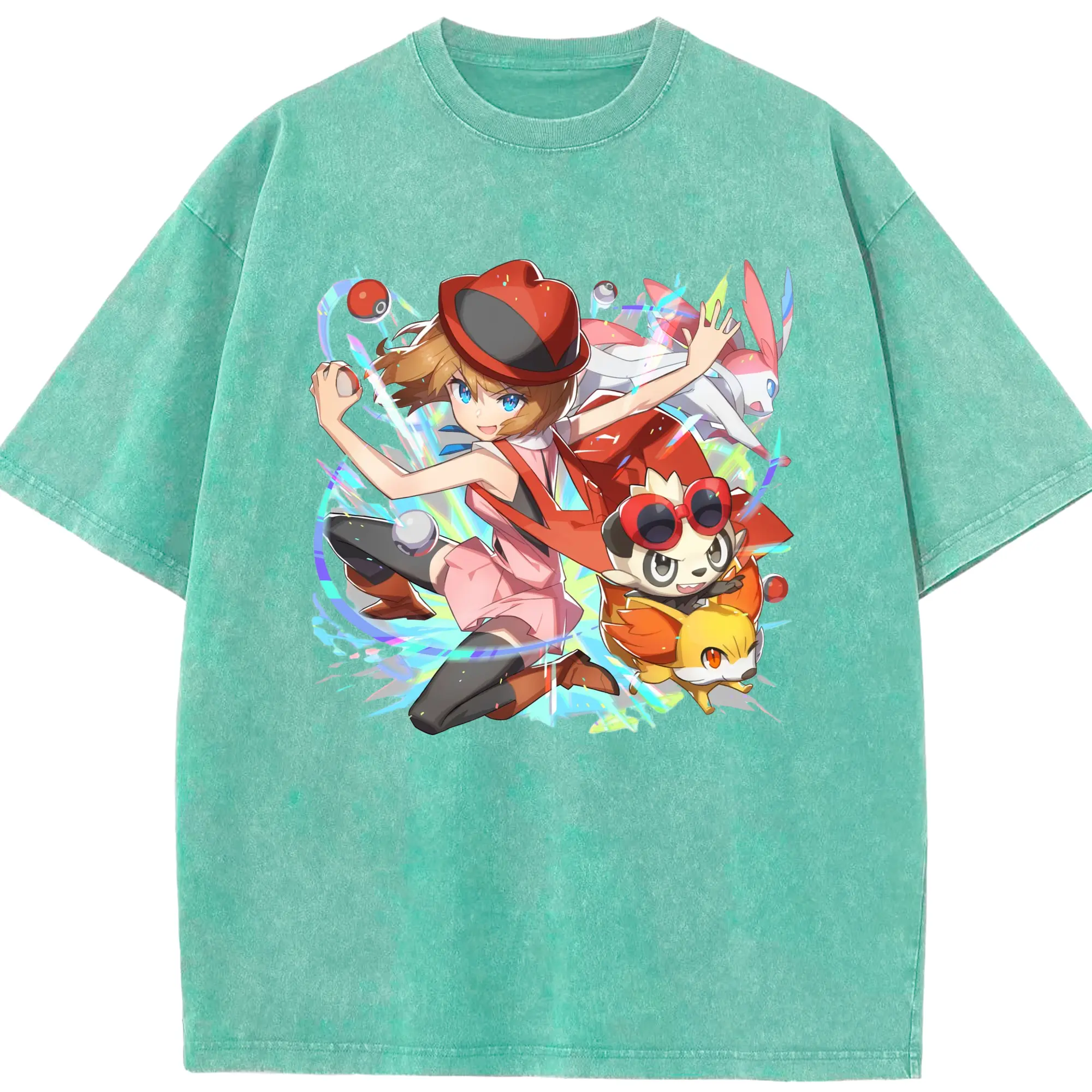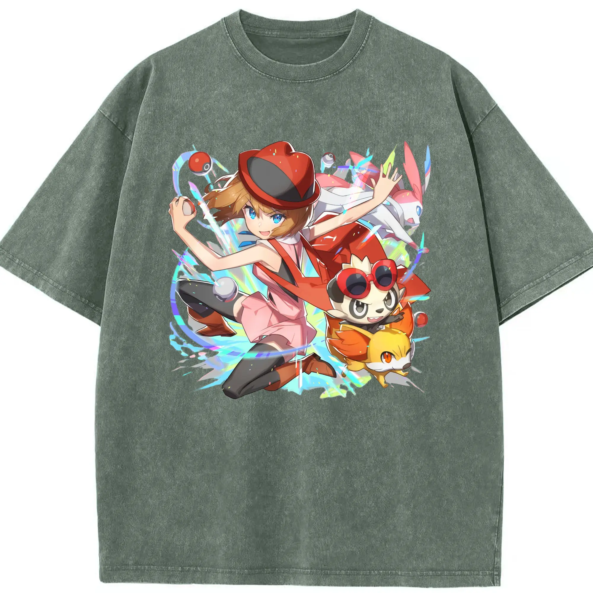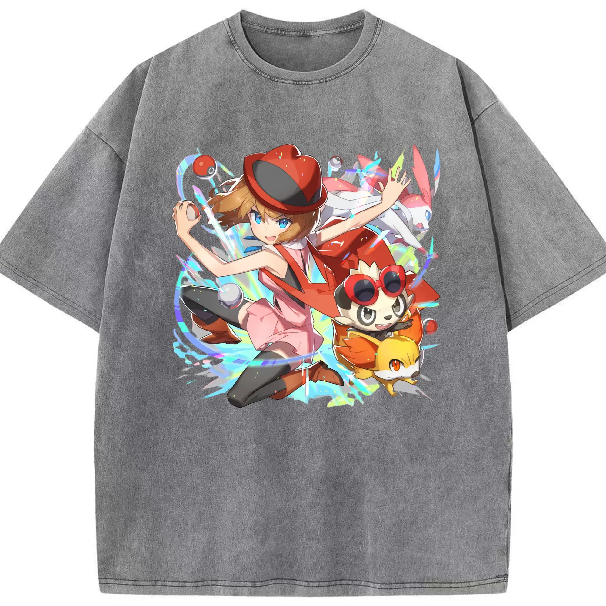 Pokemon Serena Men's T-Shirts - Washed Vintage Look 230g Cotton Oversized T-Shirt With Front Heat Transfer Print – Soft, Lightweight, Stylish Fit – Comfortable Casual Wear For Sports & Everyday Use
