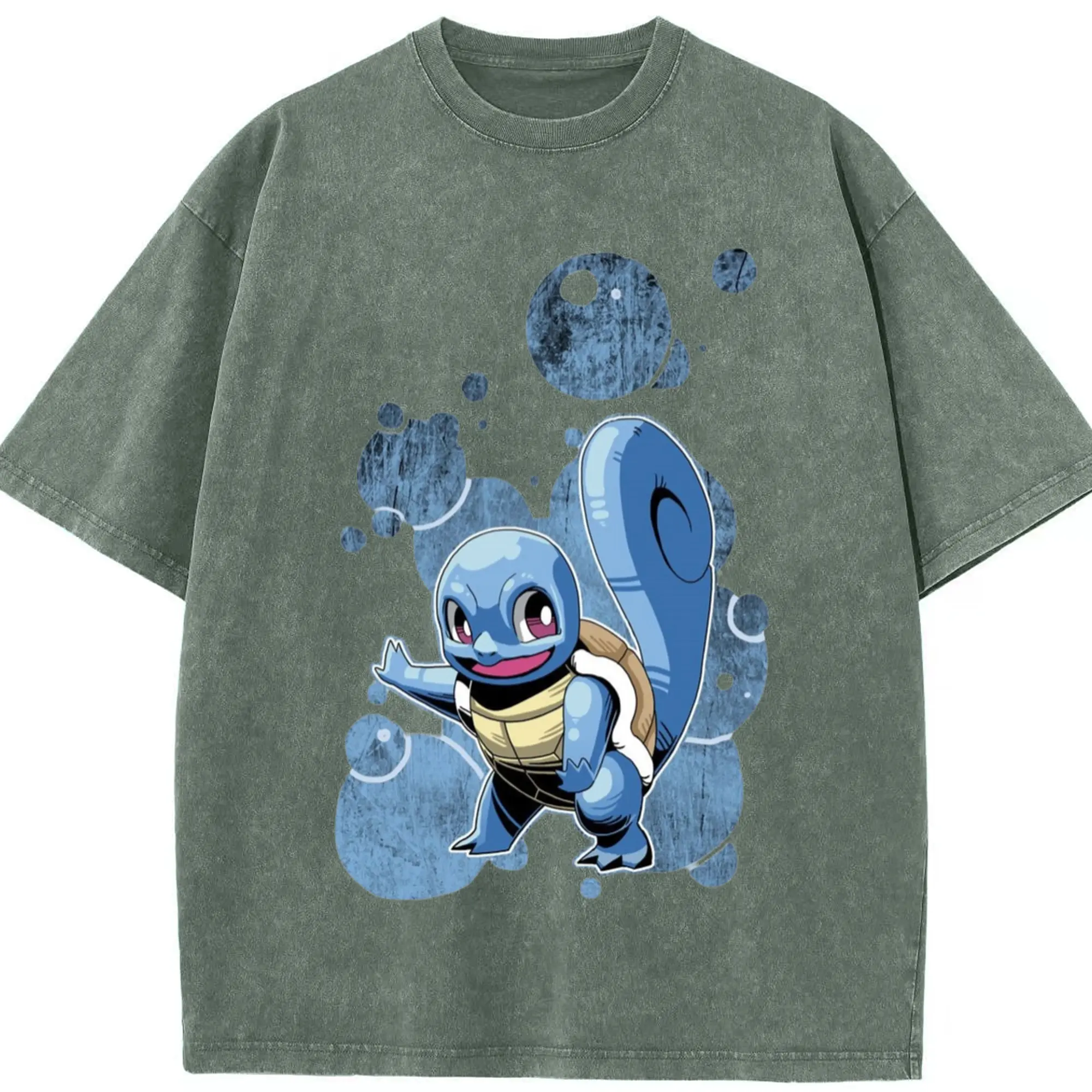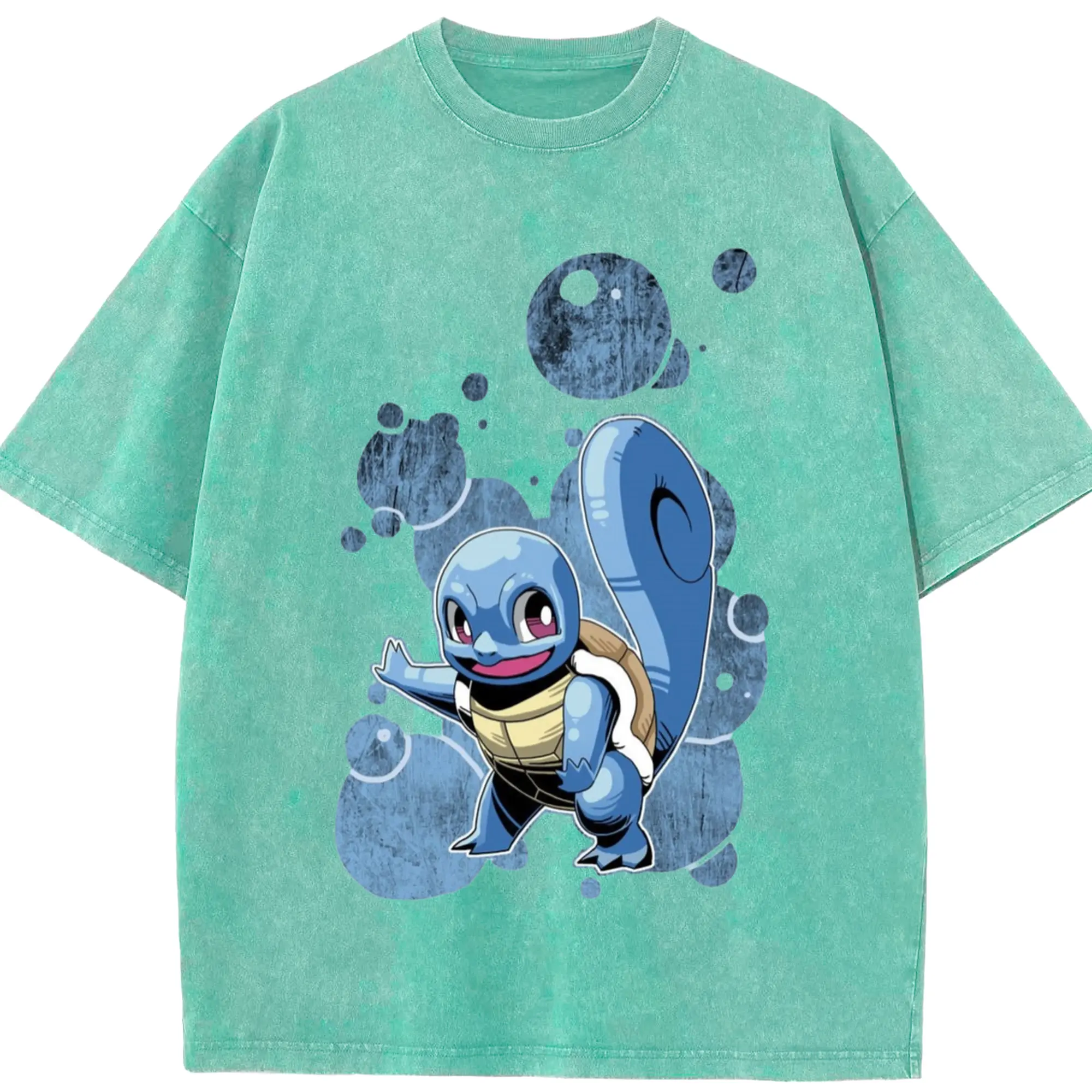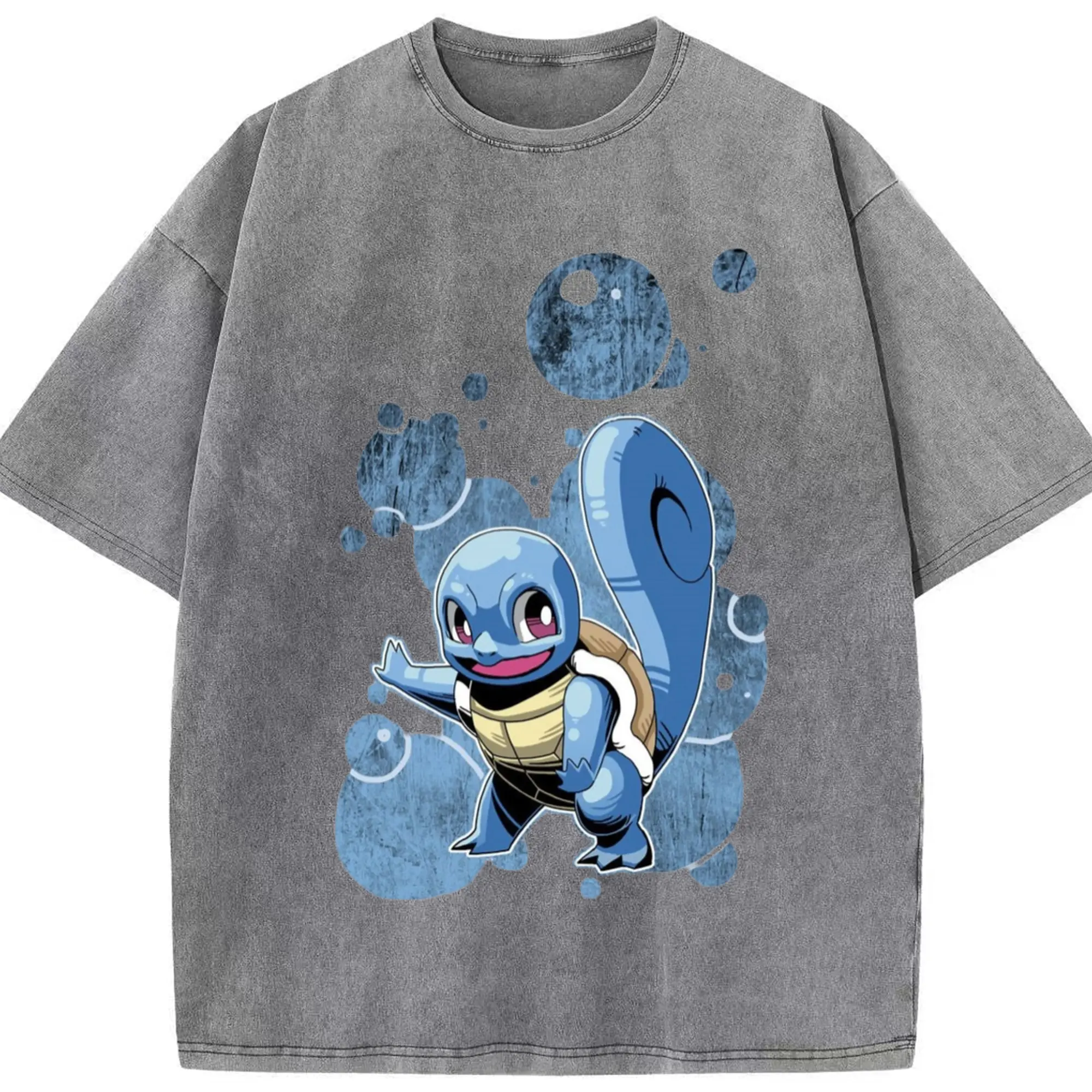 Pokemon squirtle graphic tee - Washed Vintage Look 230g Cotton Oversized T-Shirt With Front Heat Transfer Print – Soft, Lightweight, Stylish Fit – Comfortable Casual Wear For Sports & Everyday Use