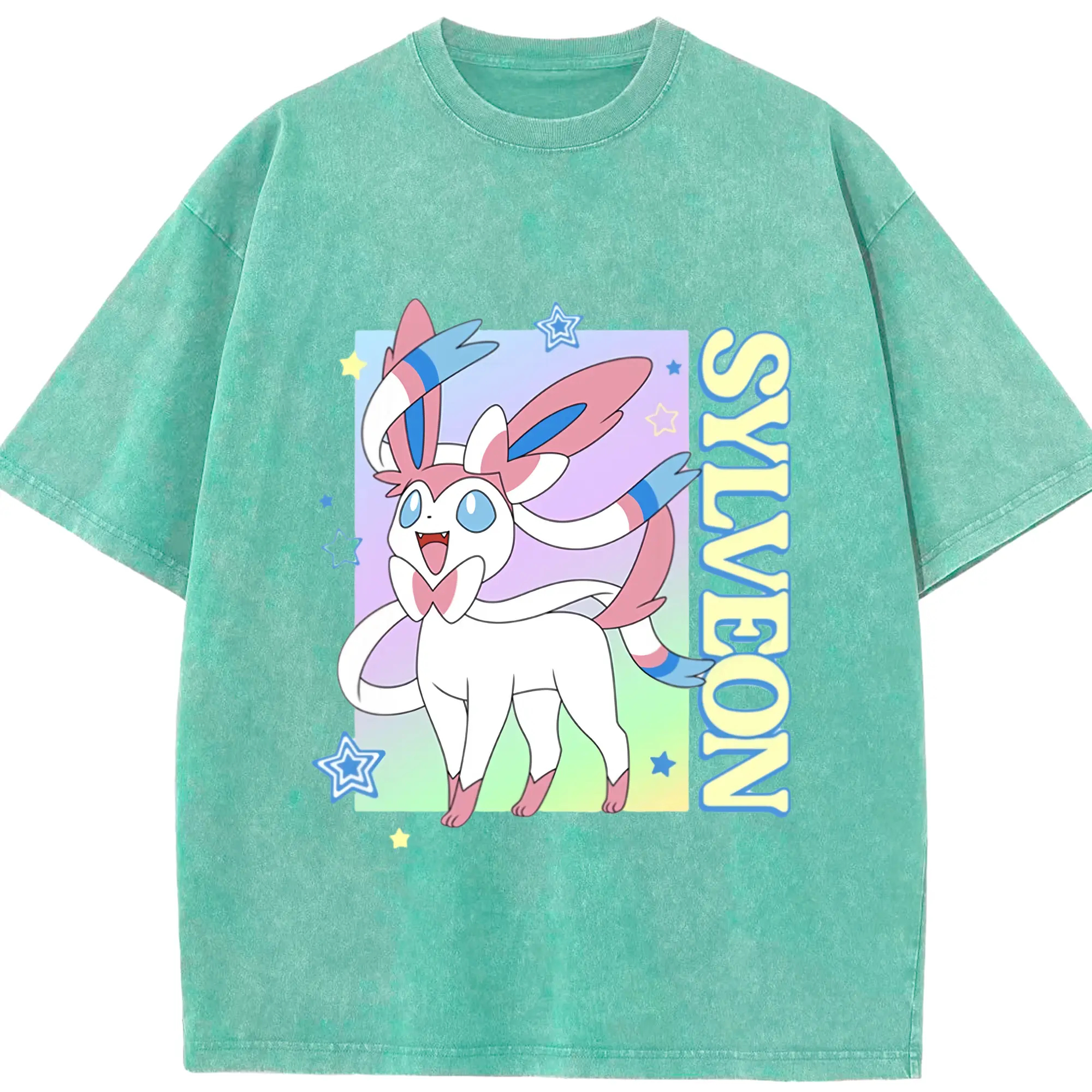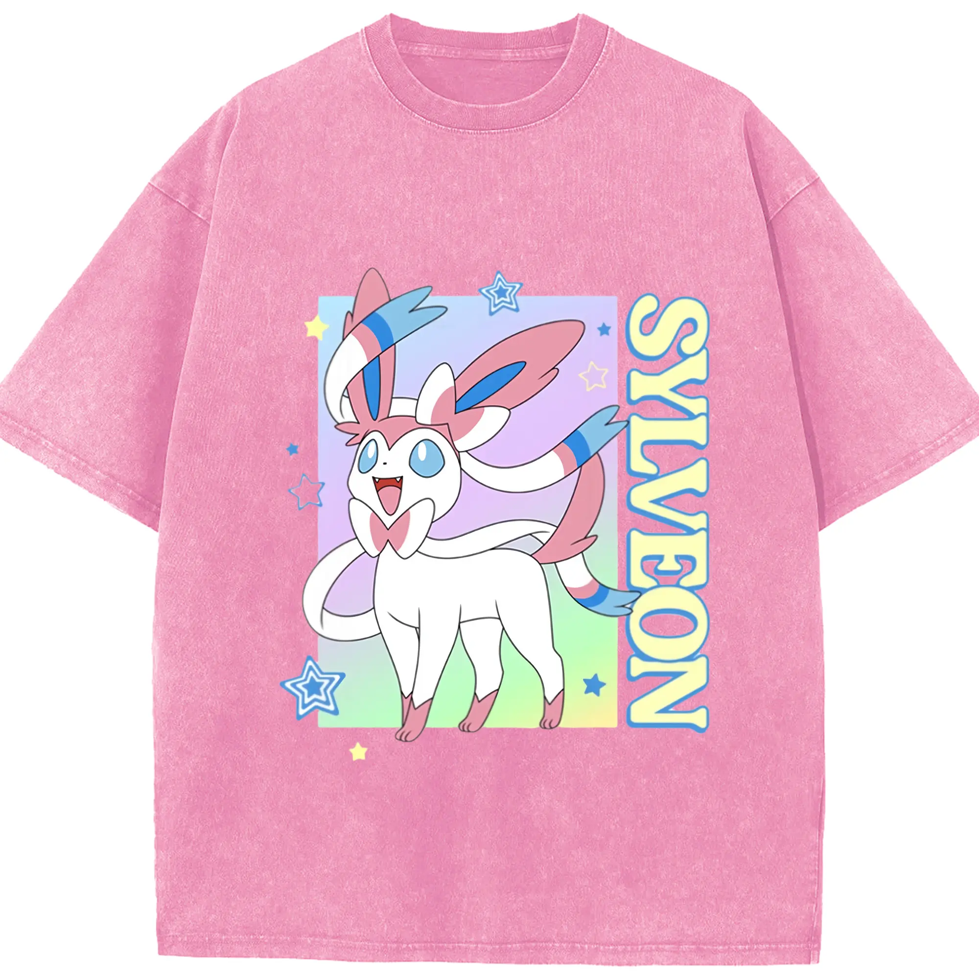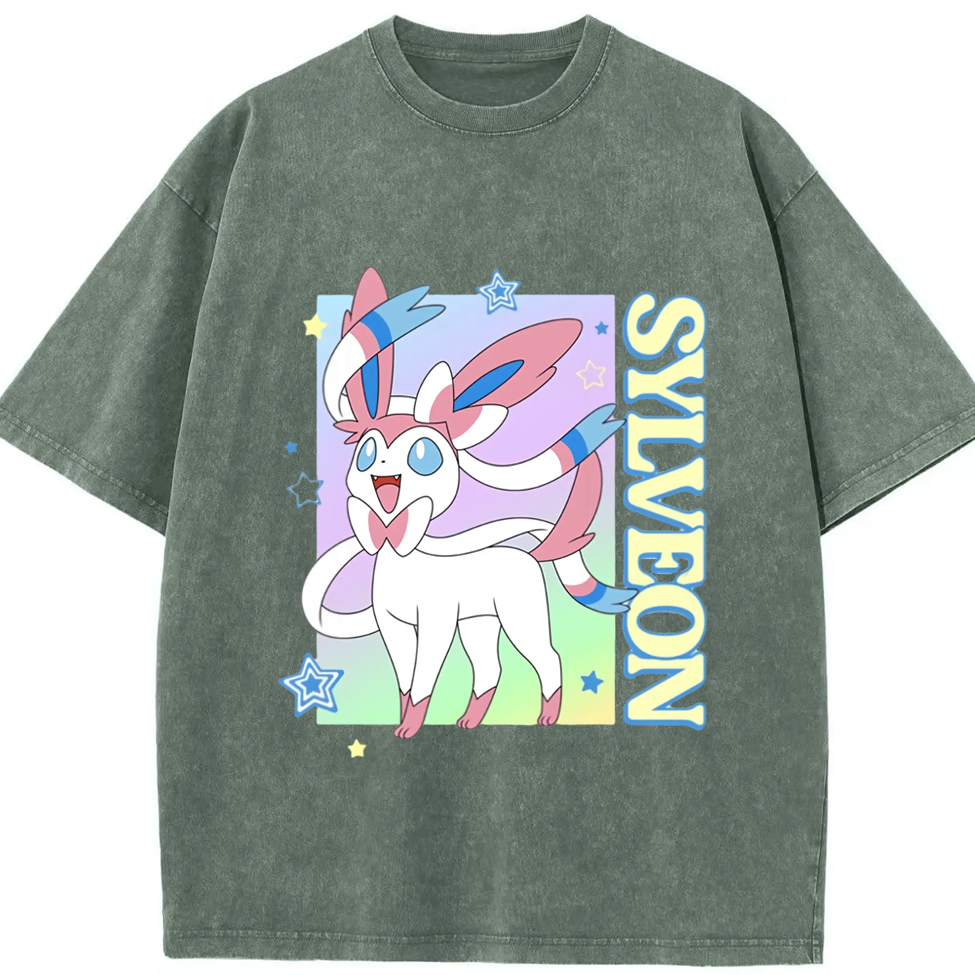 Pokemon sylveon classic t shirt - Washed Vintage Look 230g Cotton Oversized T-Shirt With Front Heat Transfer Print – Soft, Lightweight, Stylish Fit – Comfortable Casual Wear For Sports & Everyday Use