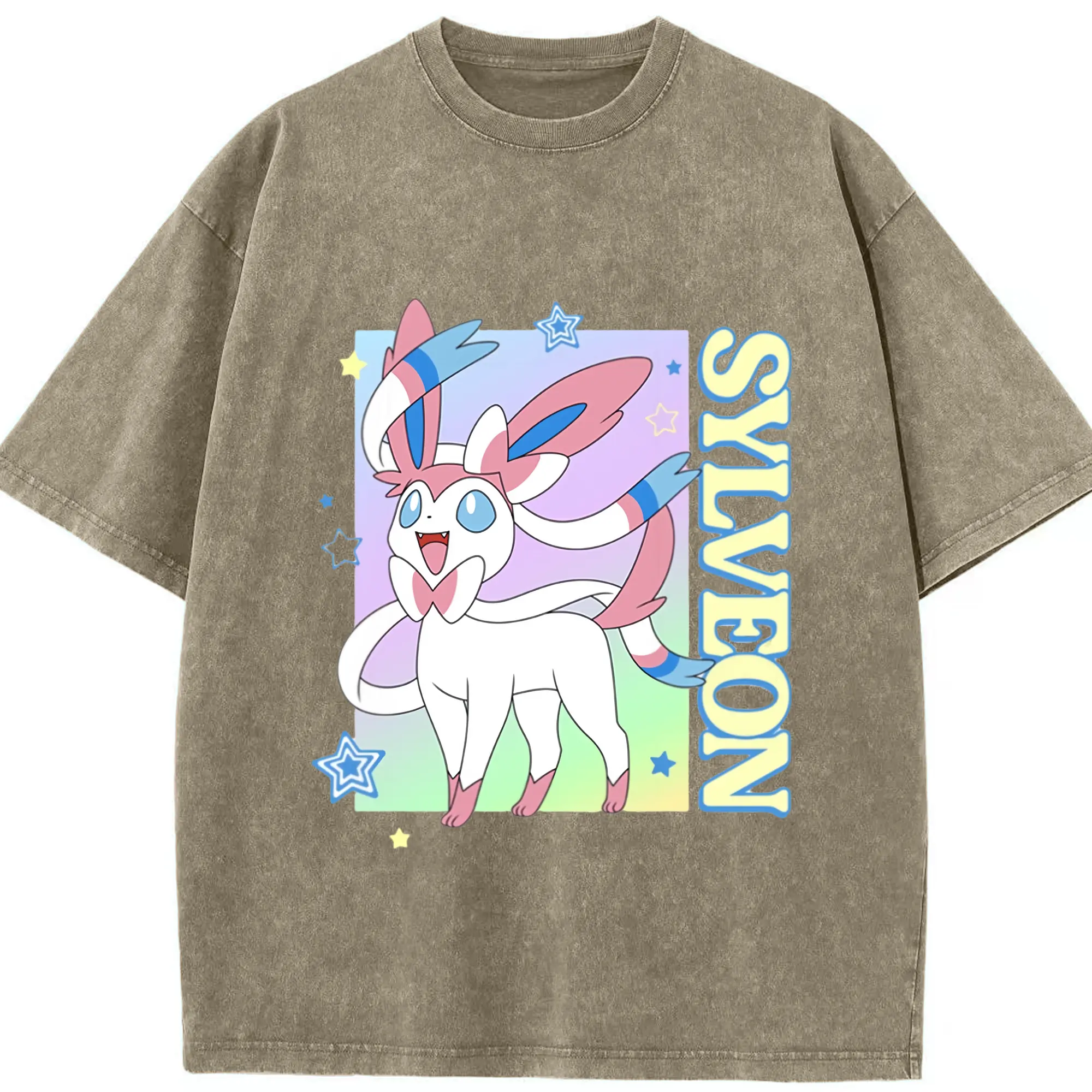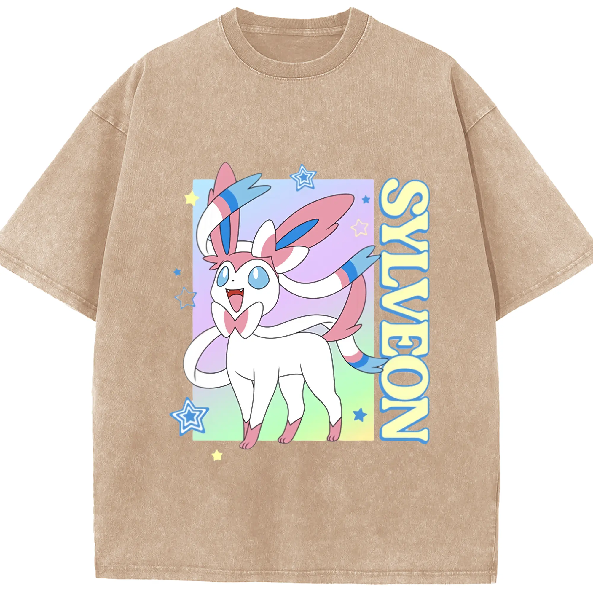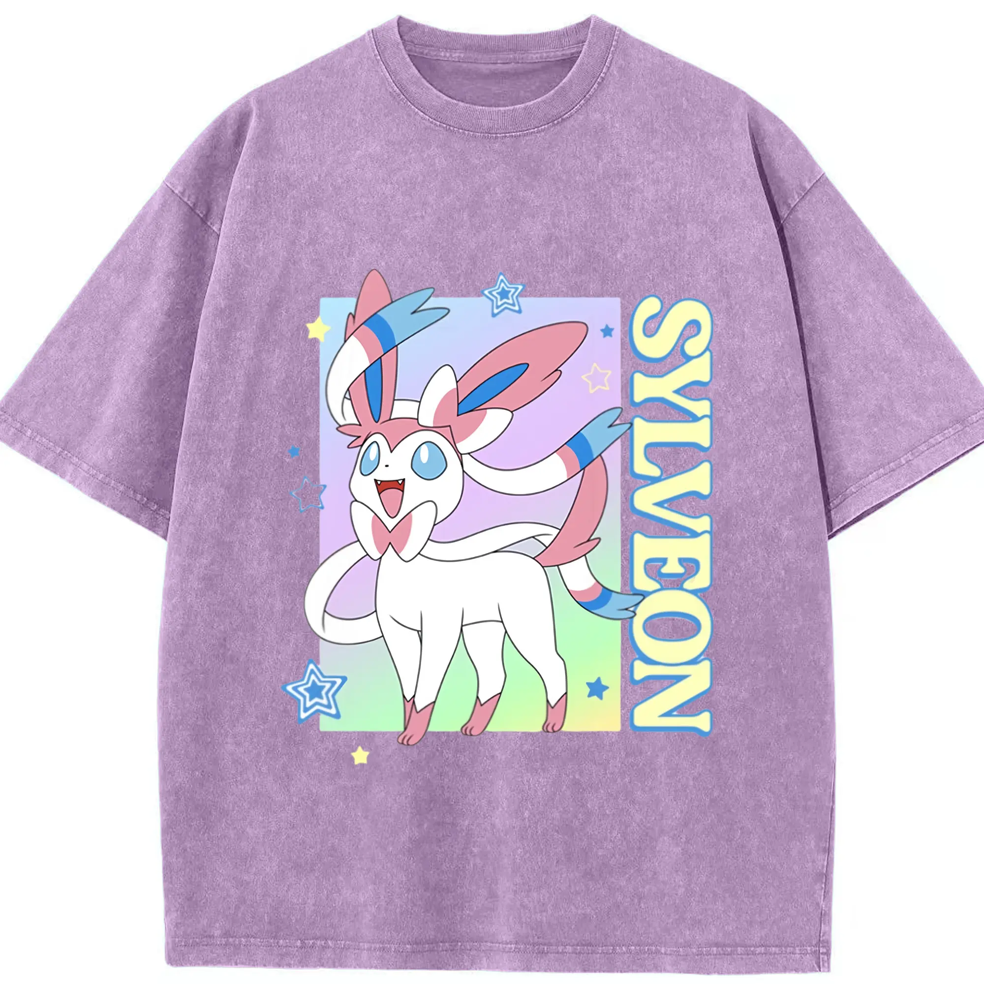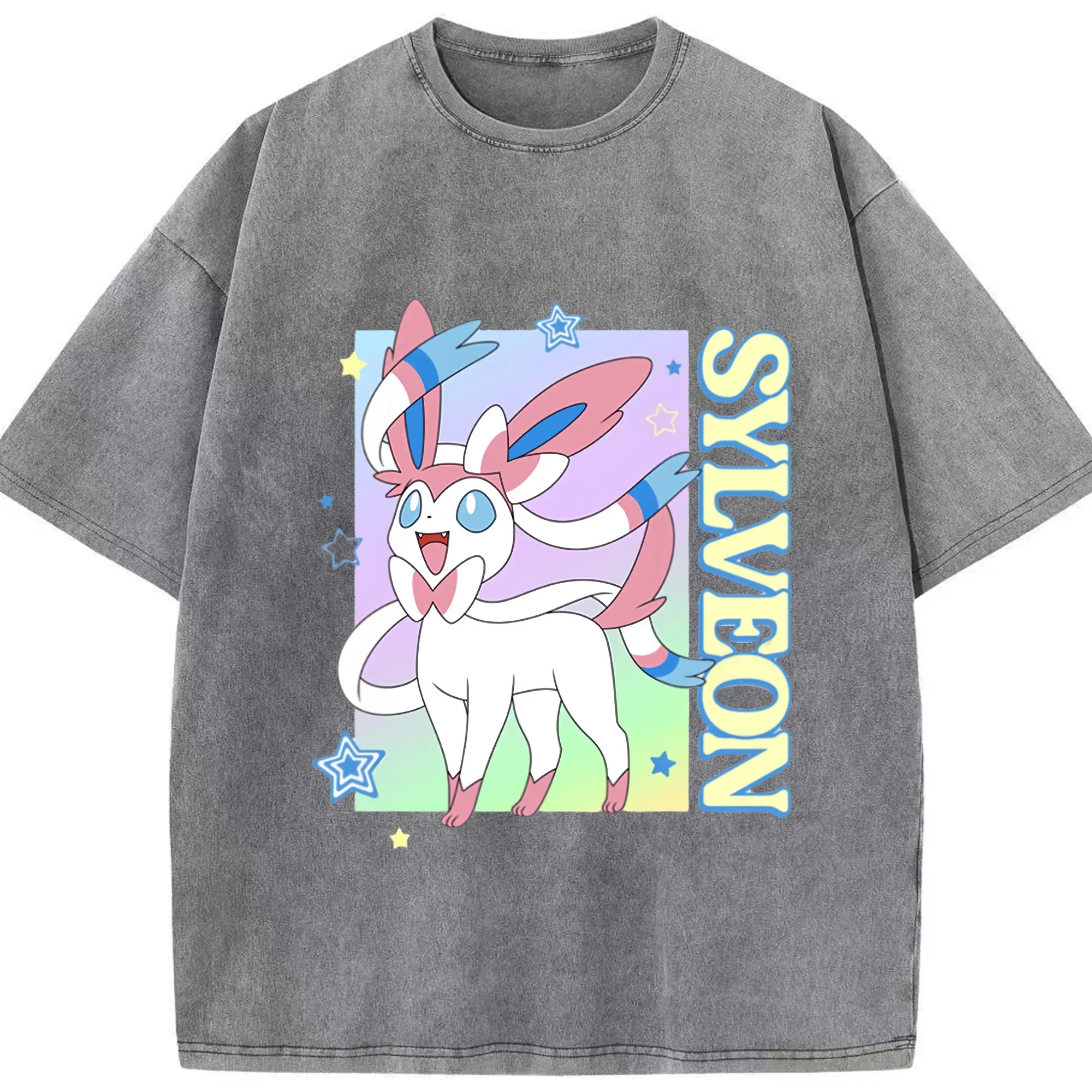 Pokemon sylveon classic t shirt - Washed Vintage Look 230g Cotton Oversized T-Shirt With Front Heat Transfer Print – Soft, Lightweight, Stylish Fit – Comfortable Casual Wear For Sports & Everyday Use