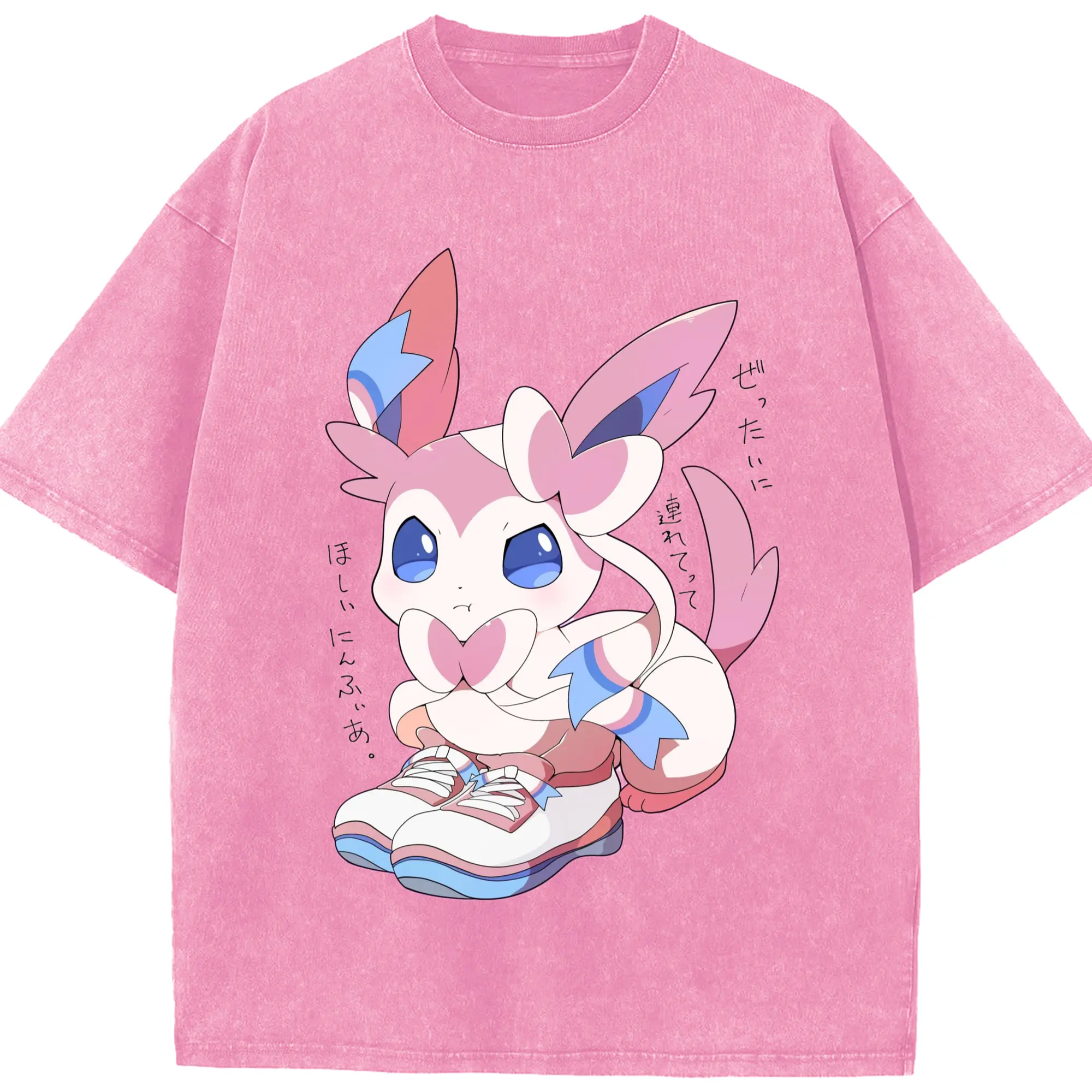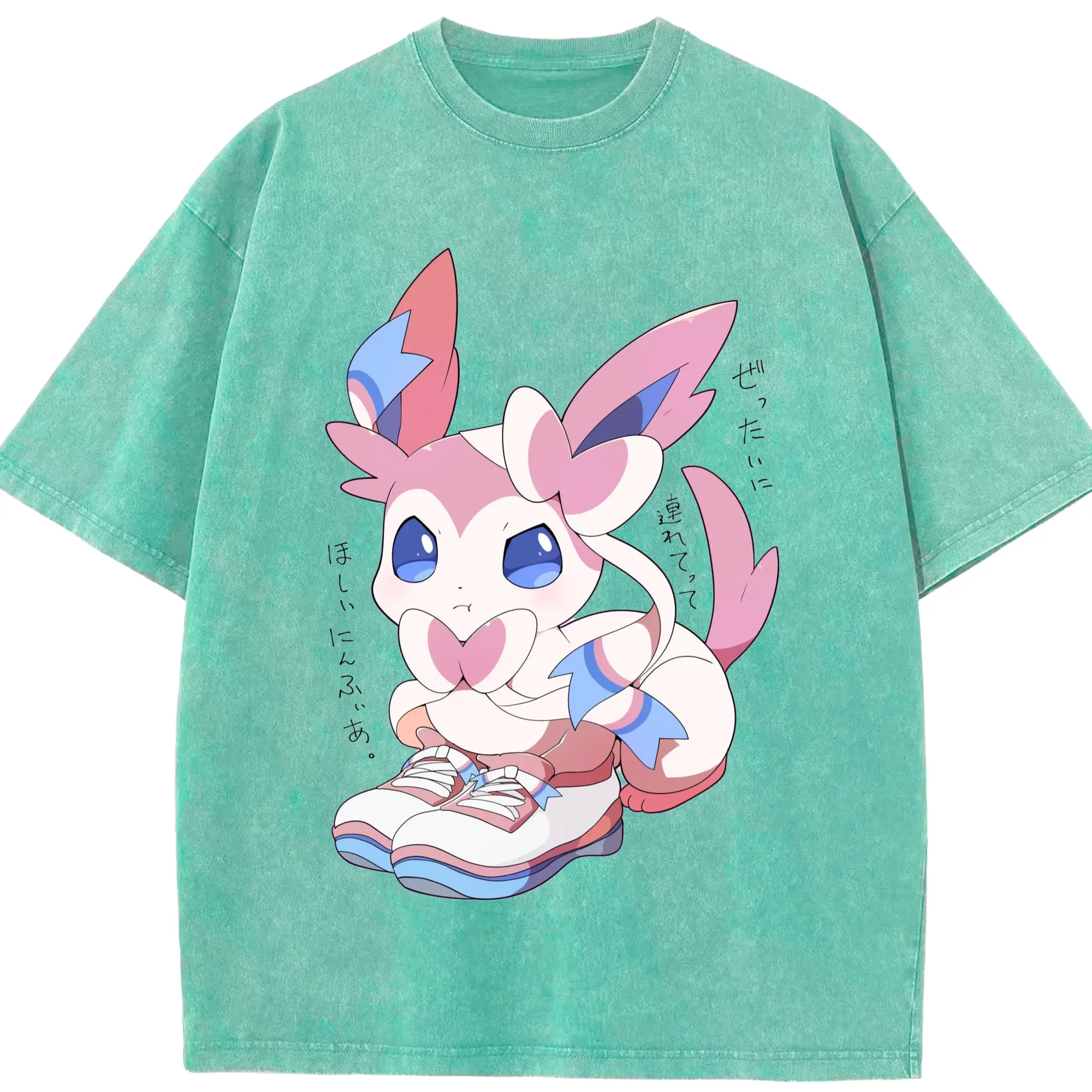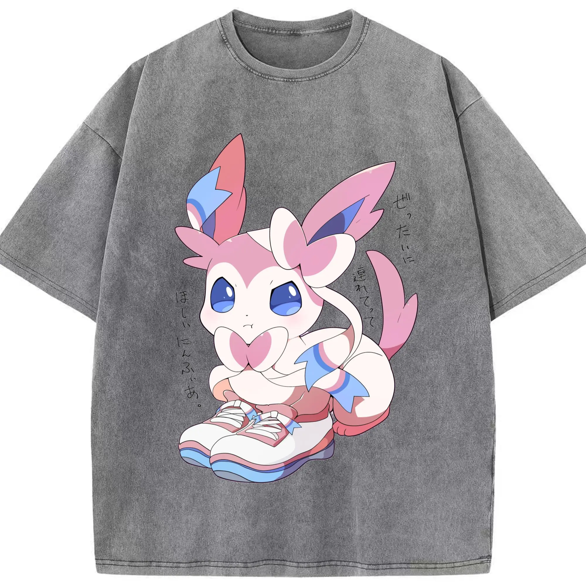 Pokemon sylveon graphic tee - Washed Vintage Look 230g Cotton Oversized T-Shirt With Front Heat Transfer Print – Soft, Lightweight, Stylish Fit – Comfortable Casual Wear For Sports & Everyday Use
