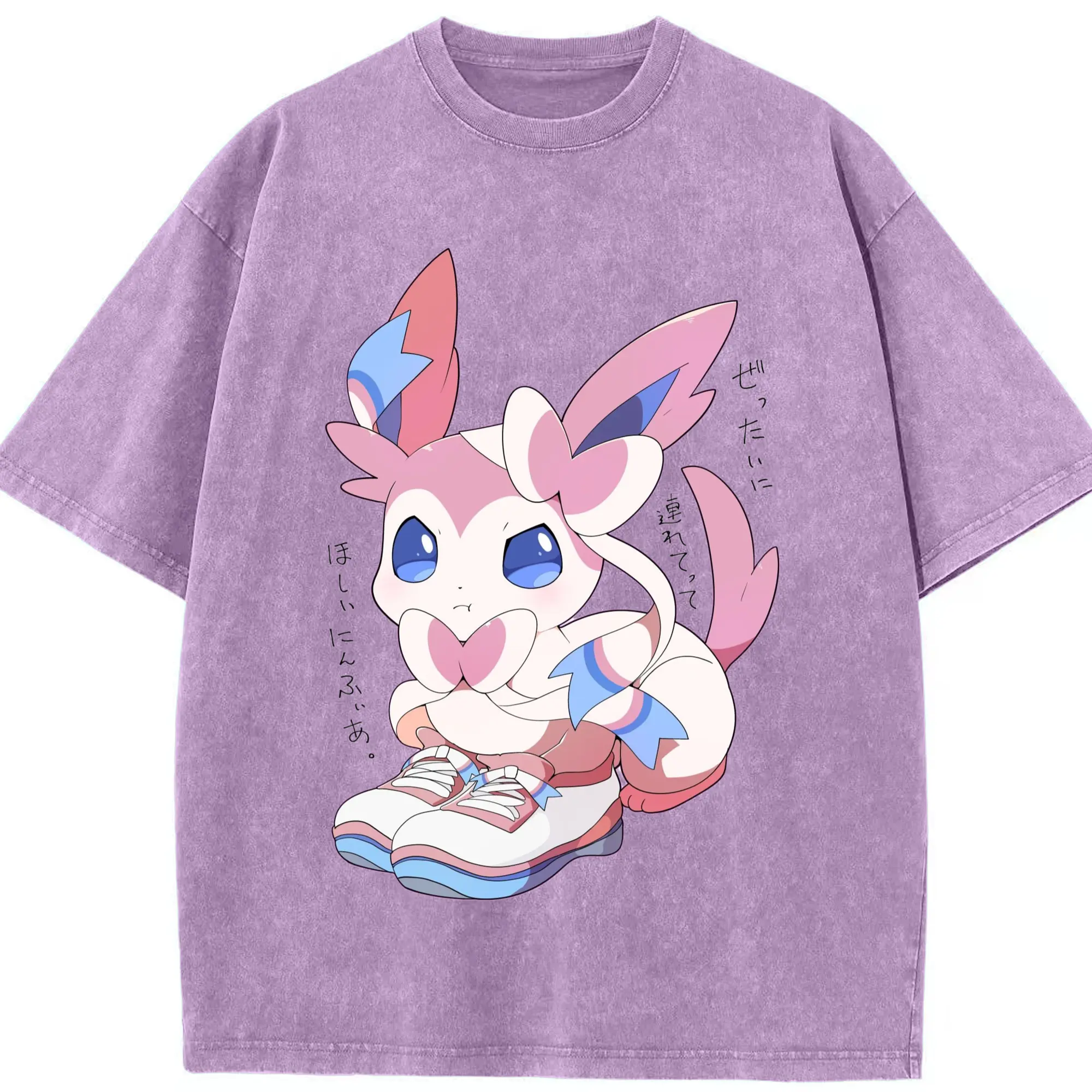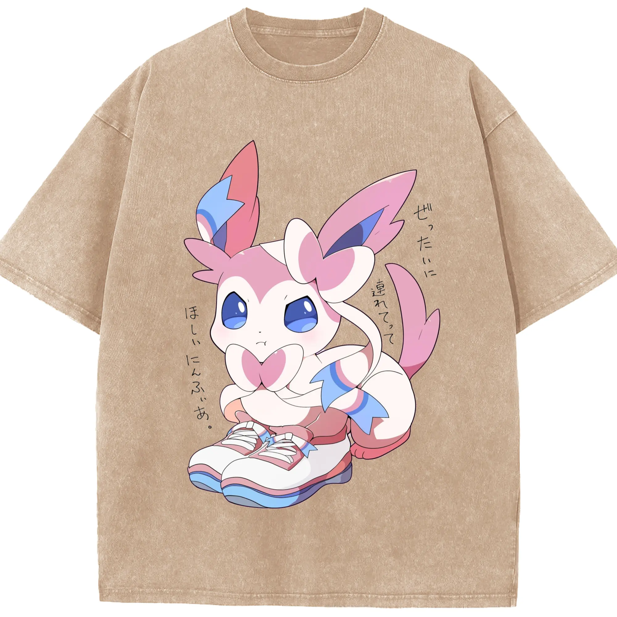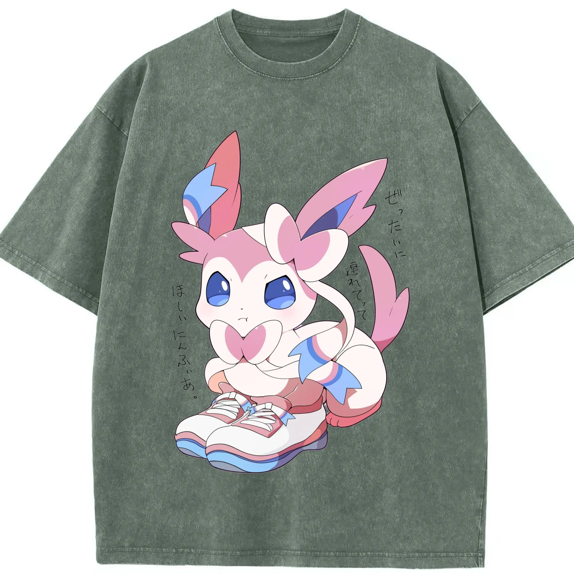 Pokemon sylveon graphic tee - Washed Vintage Look 230g Cotton Oversized T-Shirt With Front Heat Transfer Print – Soft, Lightweight, Stylish Fit – Comfortable Casual Wear For Sports & Everyday Use