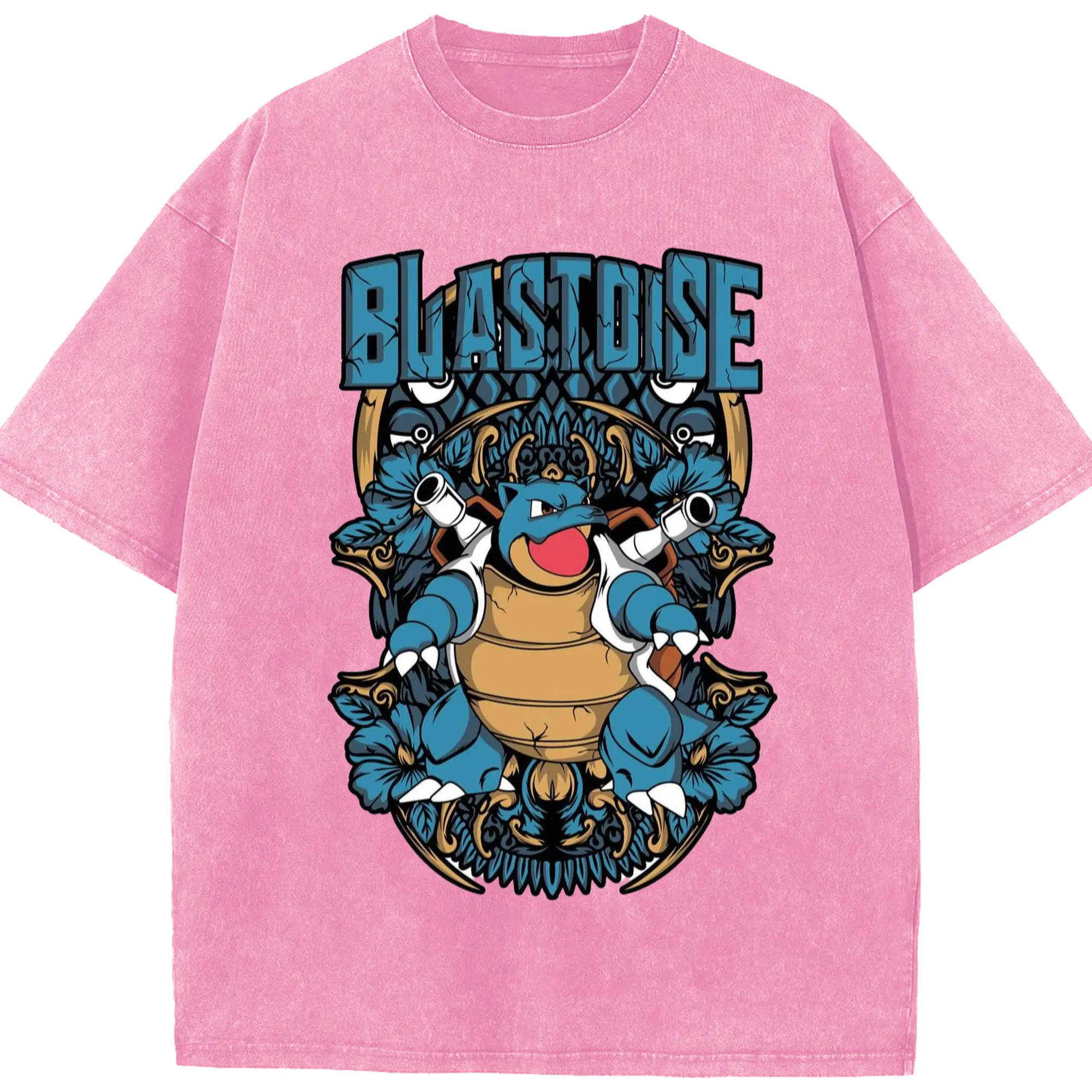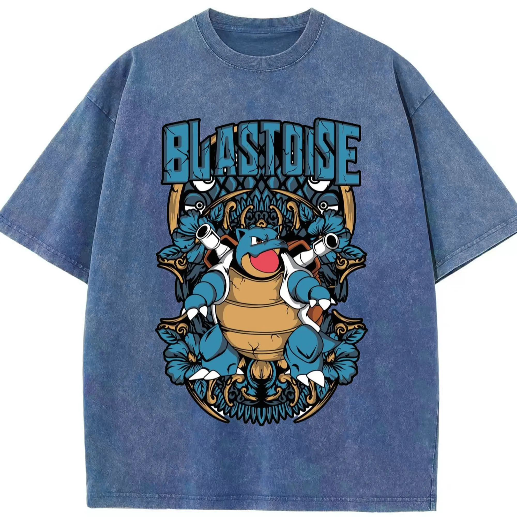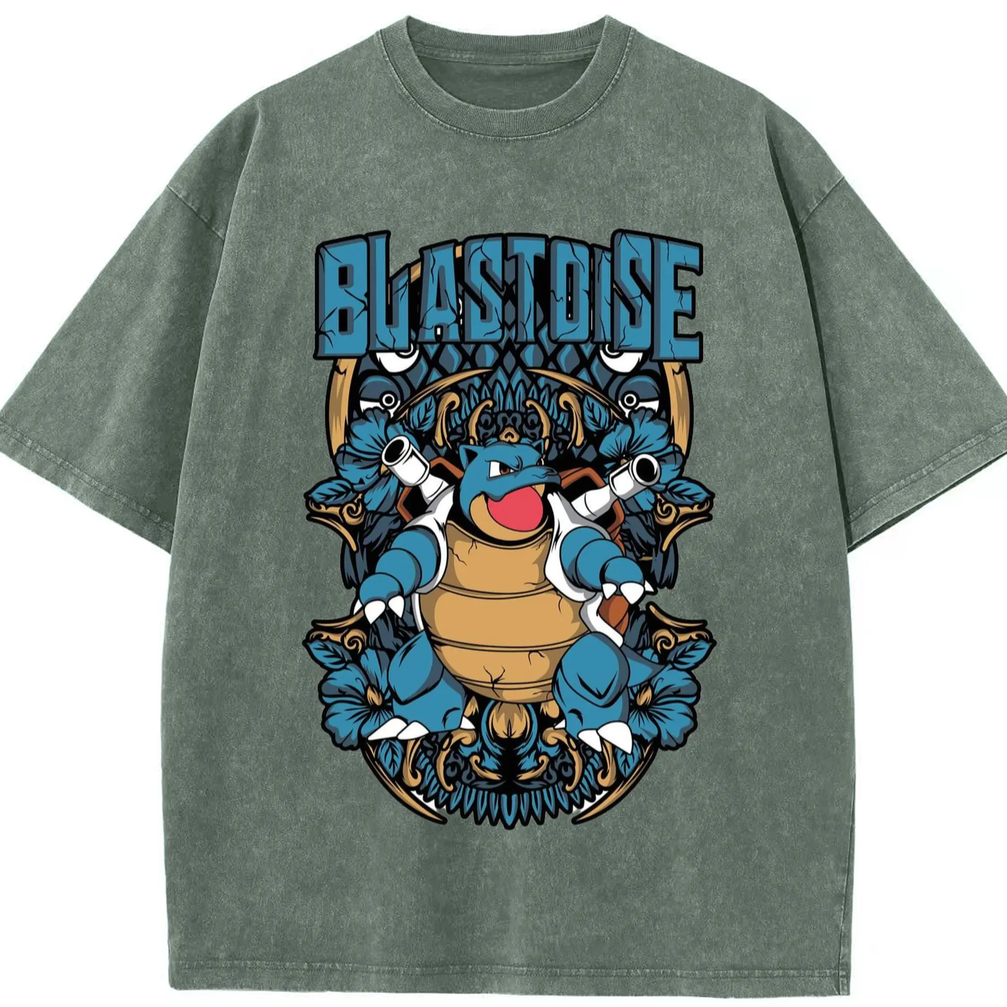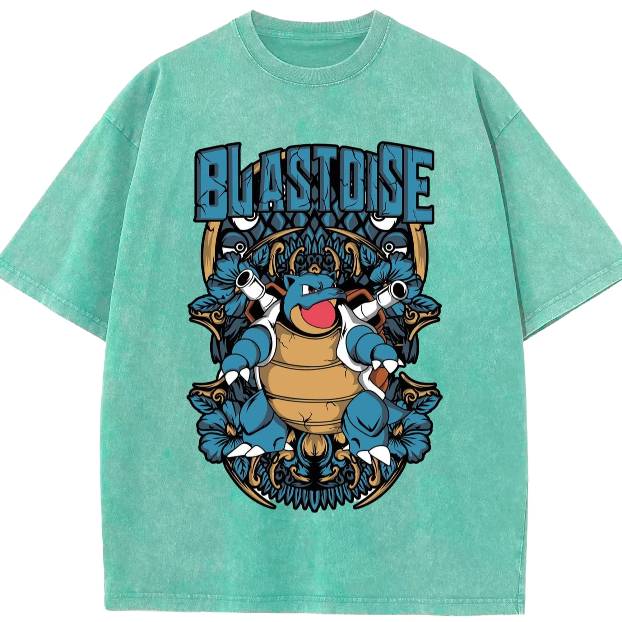 Retro pokemen blastoise tee - Washed Vintage Look 230g Cotton Oversized T-Shirt With Front Heat Transfer Print – Soft, Lightweight, Stylish Fit – Comfortable Casual Wear For Sports & Everyday Use