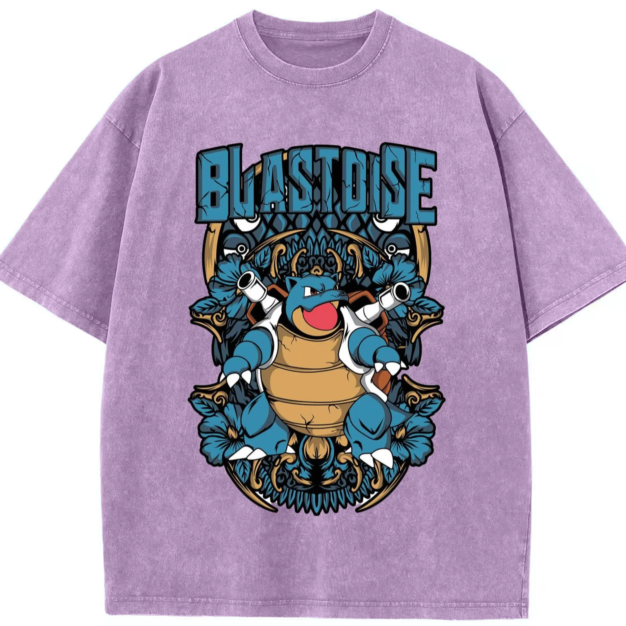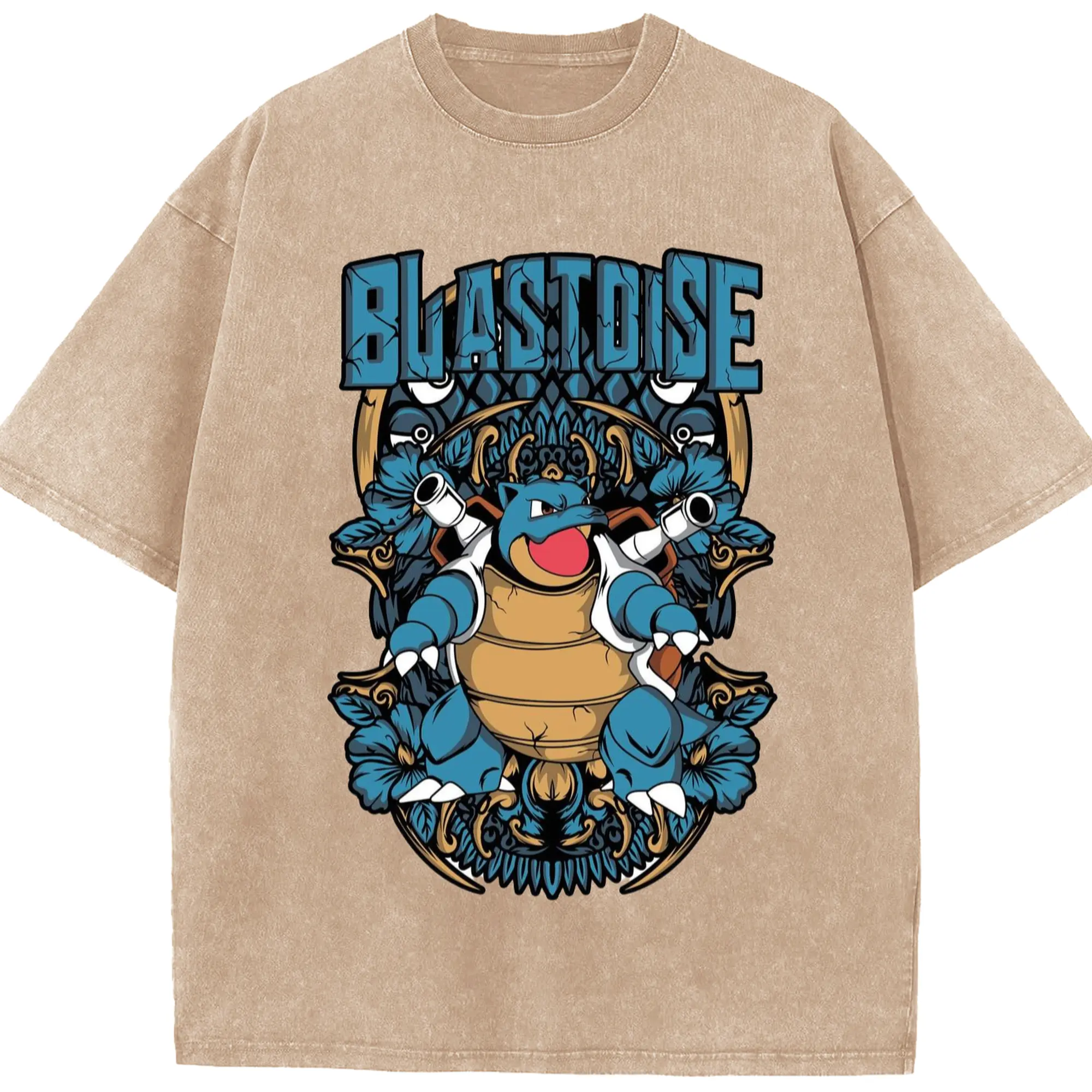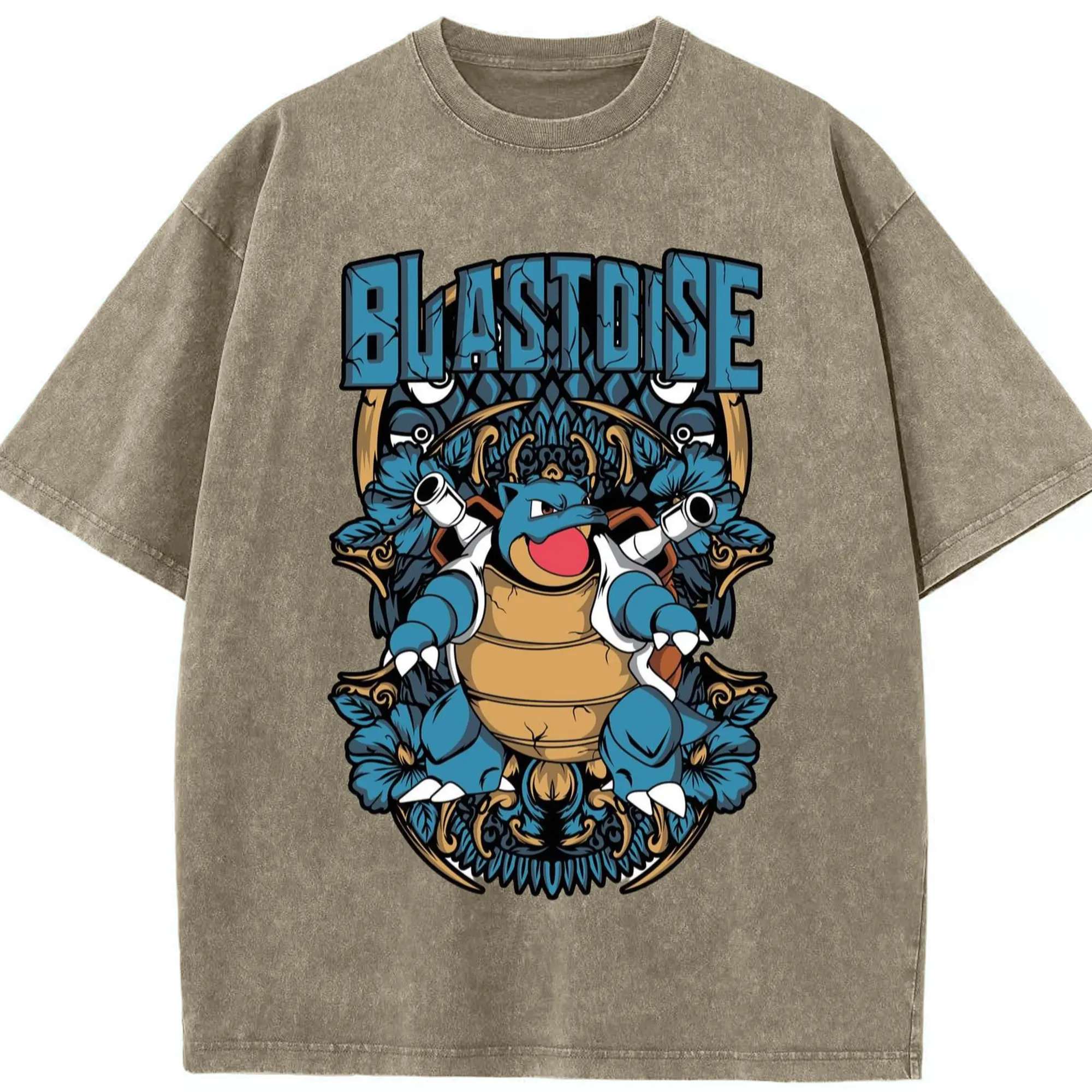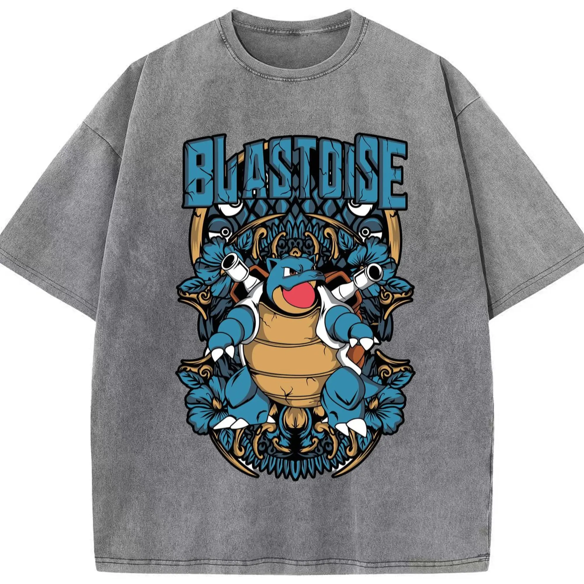 Retro pokemen blastoise tee - Washed Vintage Look 230g Cotton Oversized T-Shirt With Front Heat Transfer Print – Soft, Lightweight, Stylish Fit – Comfortable Casual Wear For Sports & Everyday Use