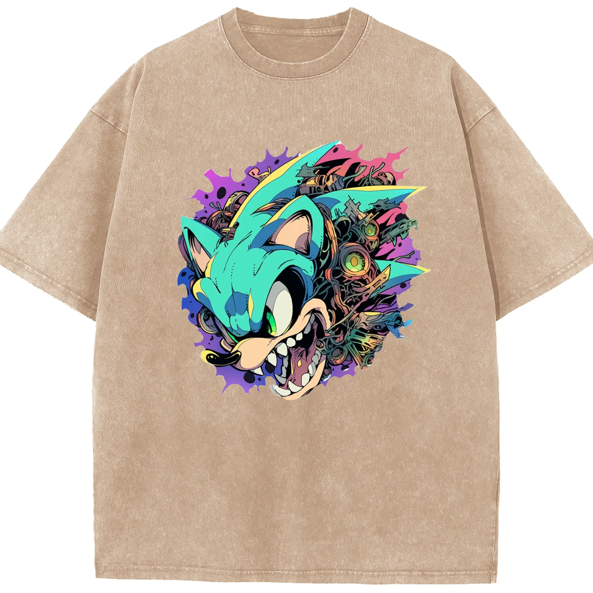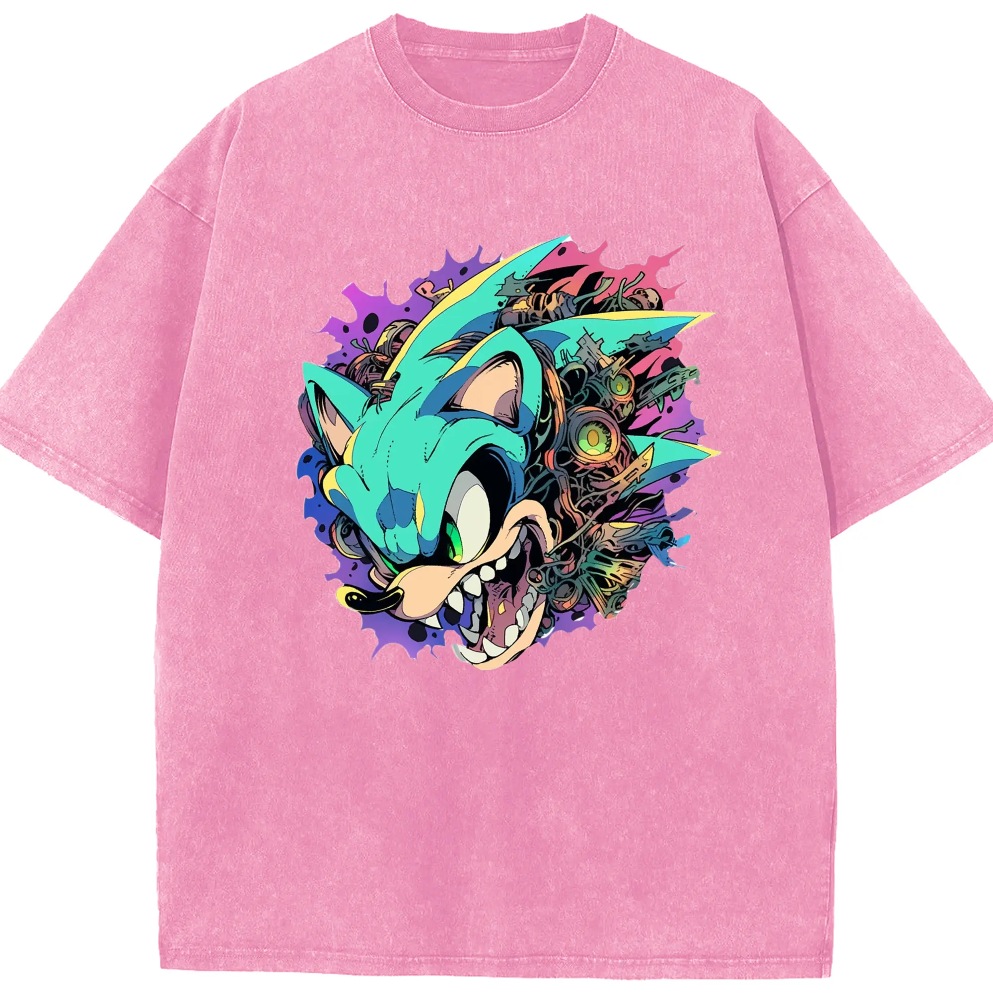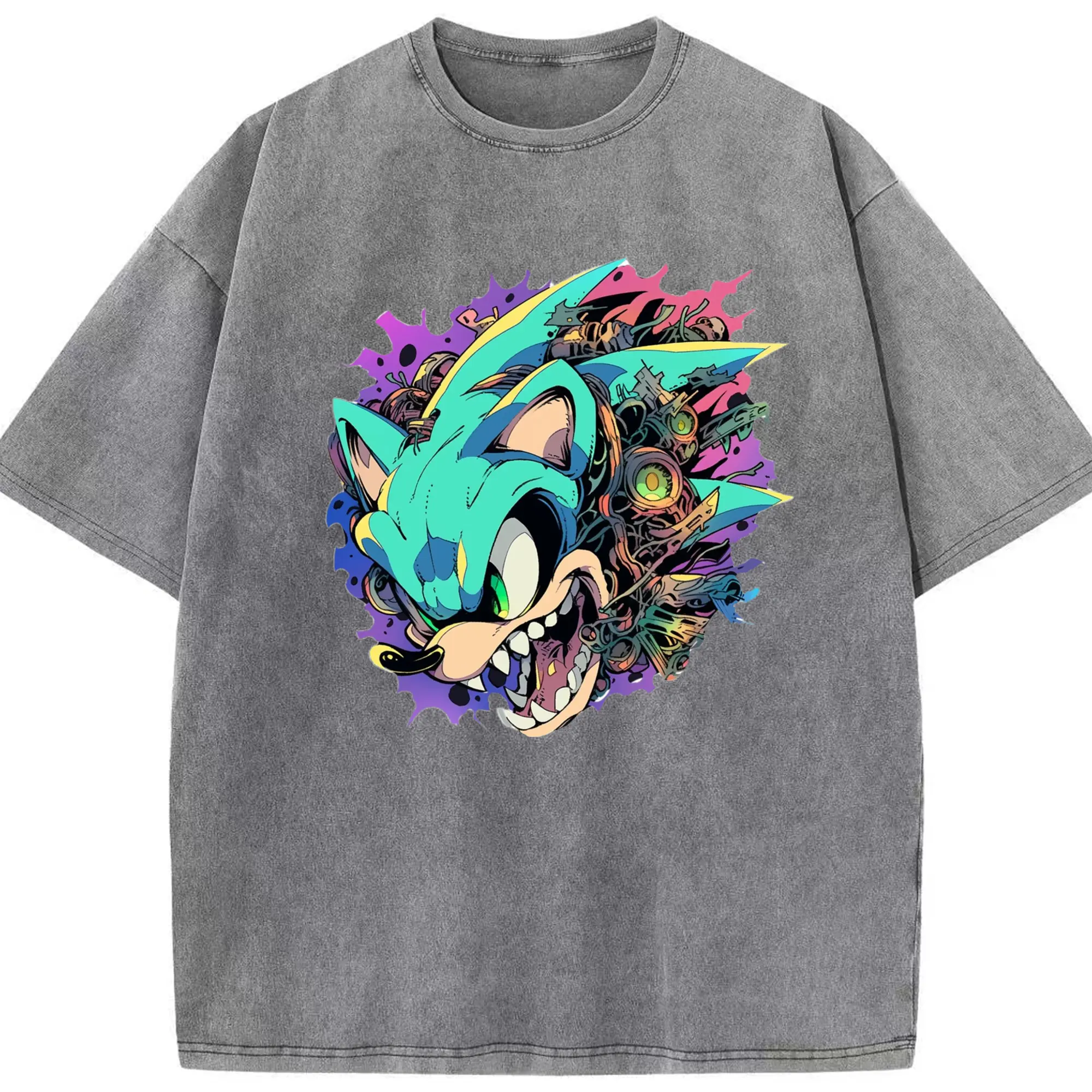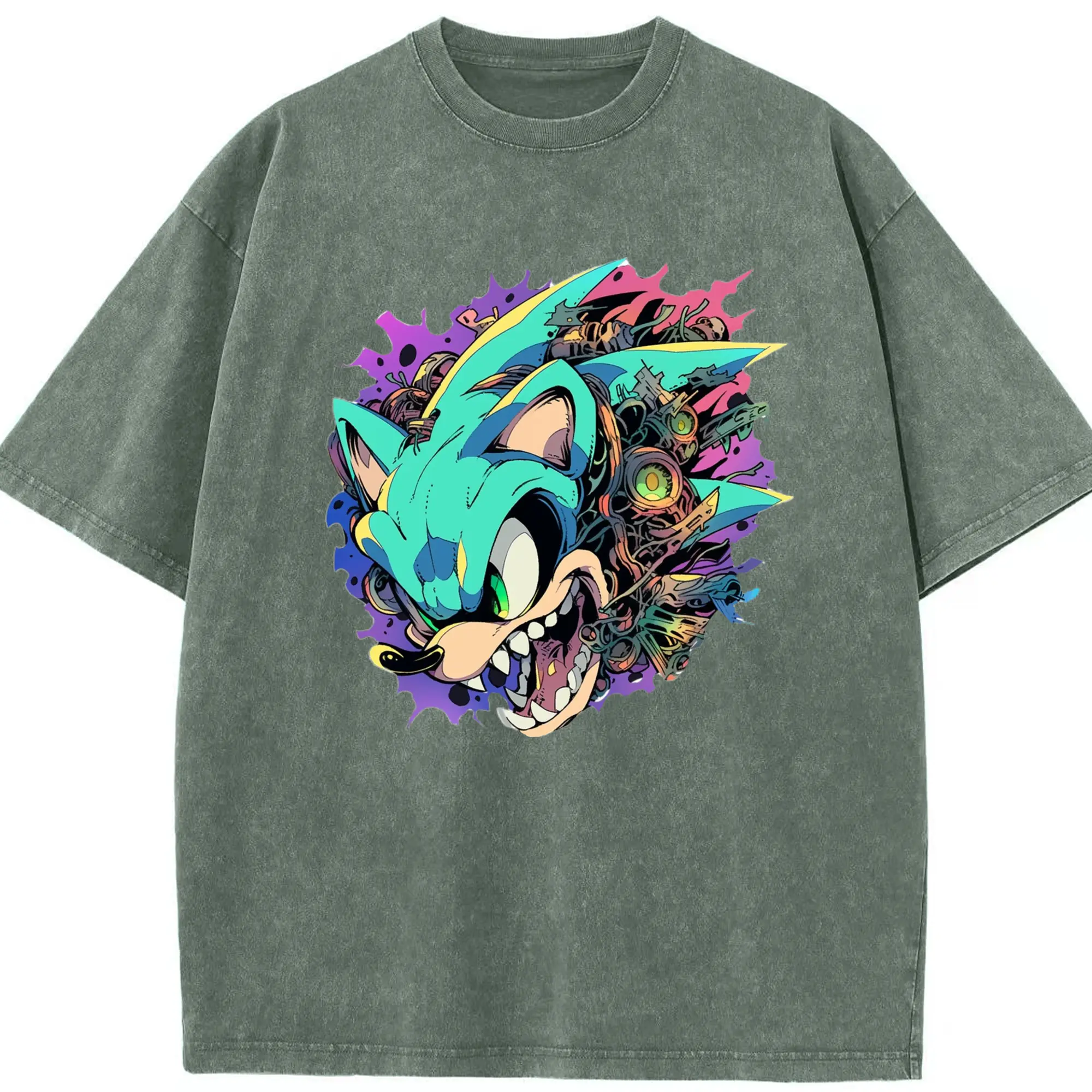 Sonic Collage Cyberpunk Graphic Tee - Washed Vintage Look 230g Cotton Oversized T-Shirt With Front Heat Transfer Print – Soft, Lightweight, Stylish Fit – Comfortable Casual Wear For Sports & Everyday Use