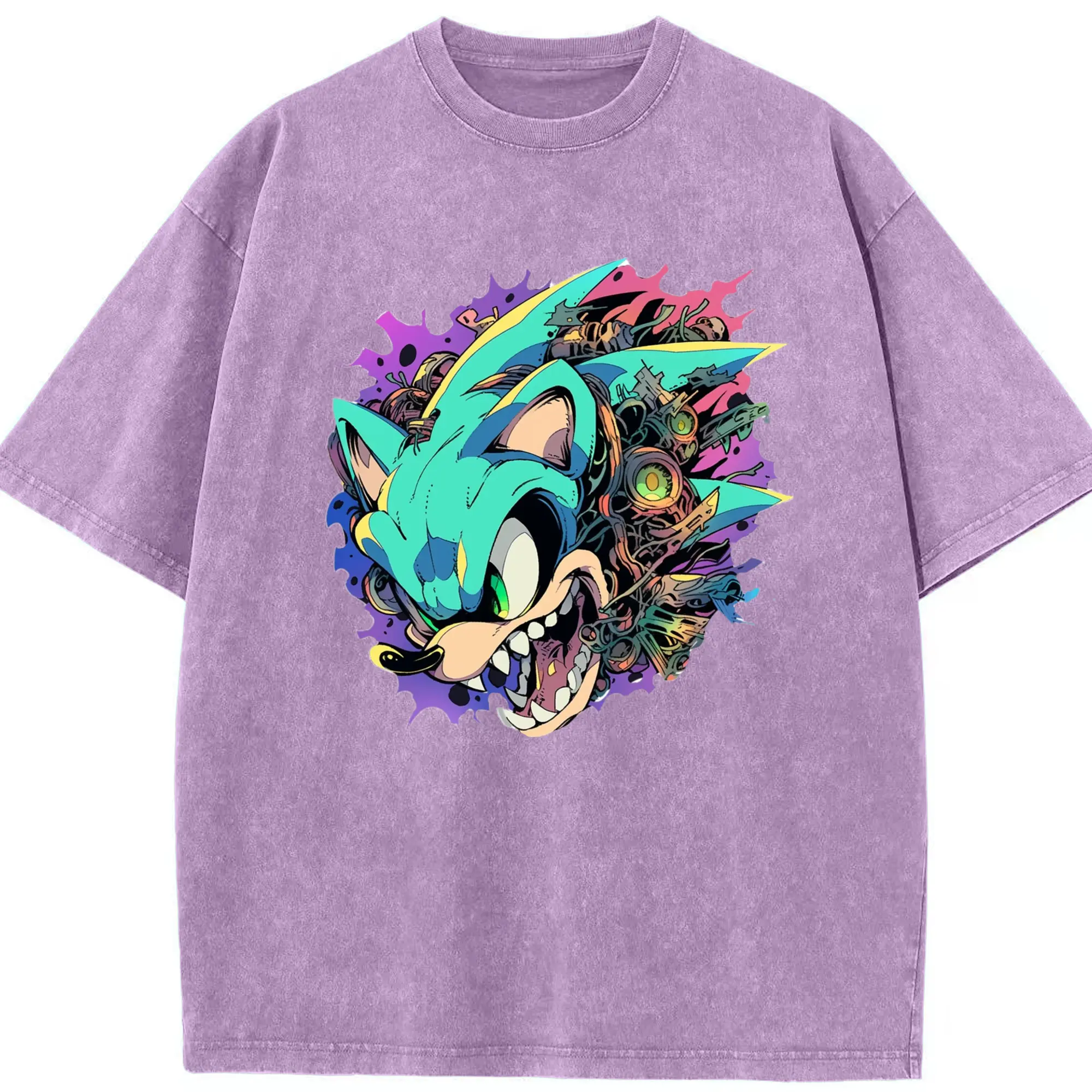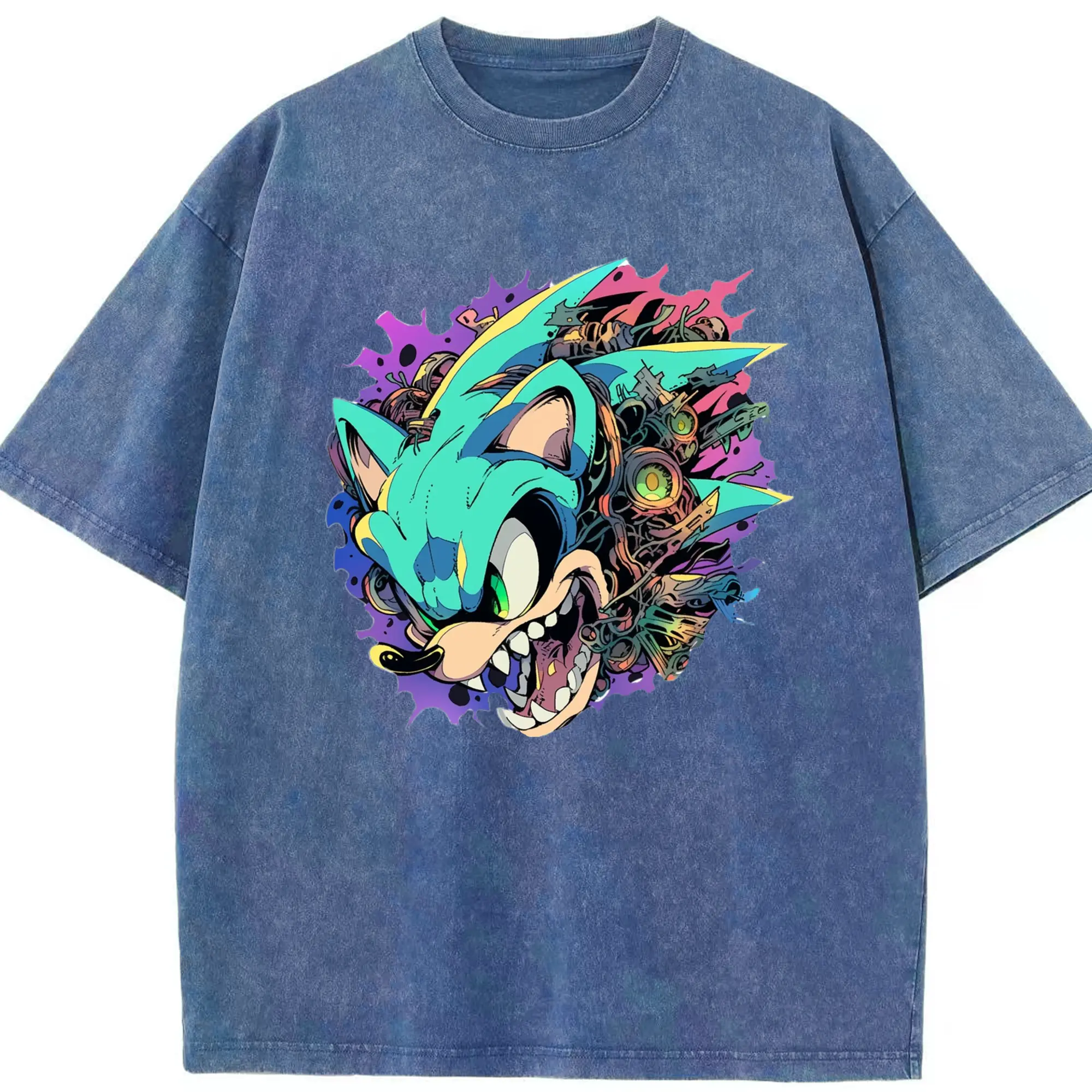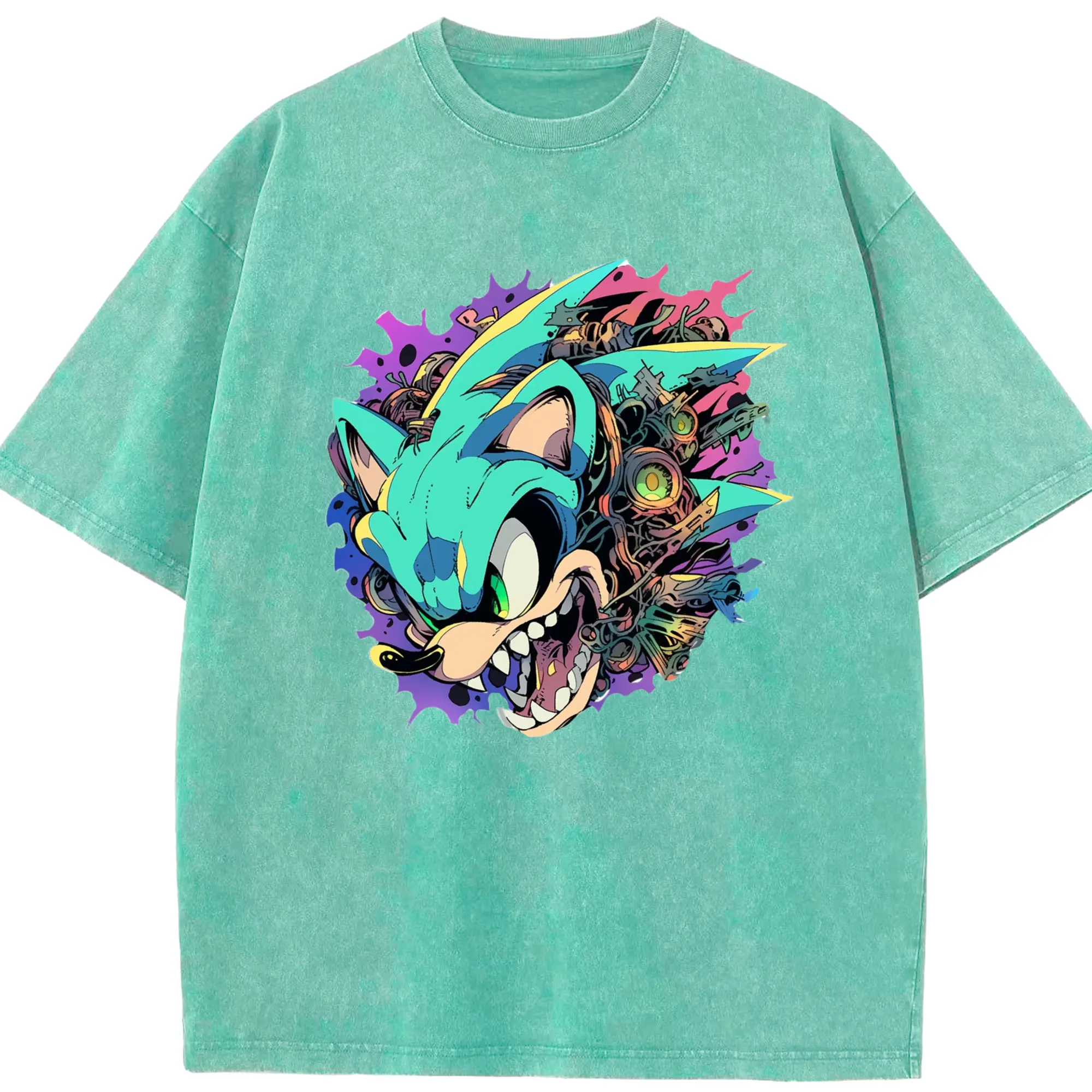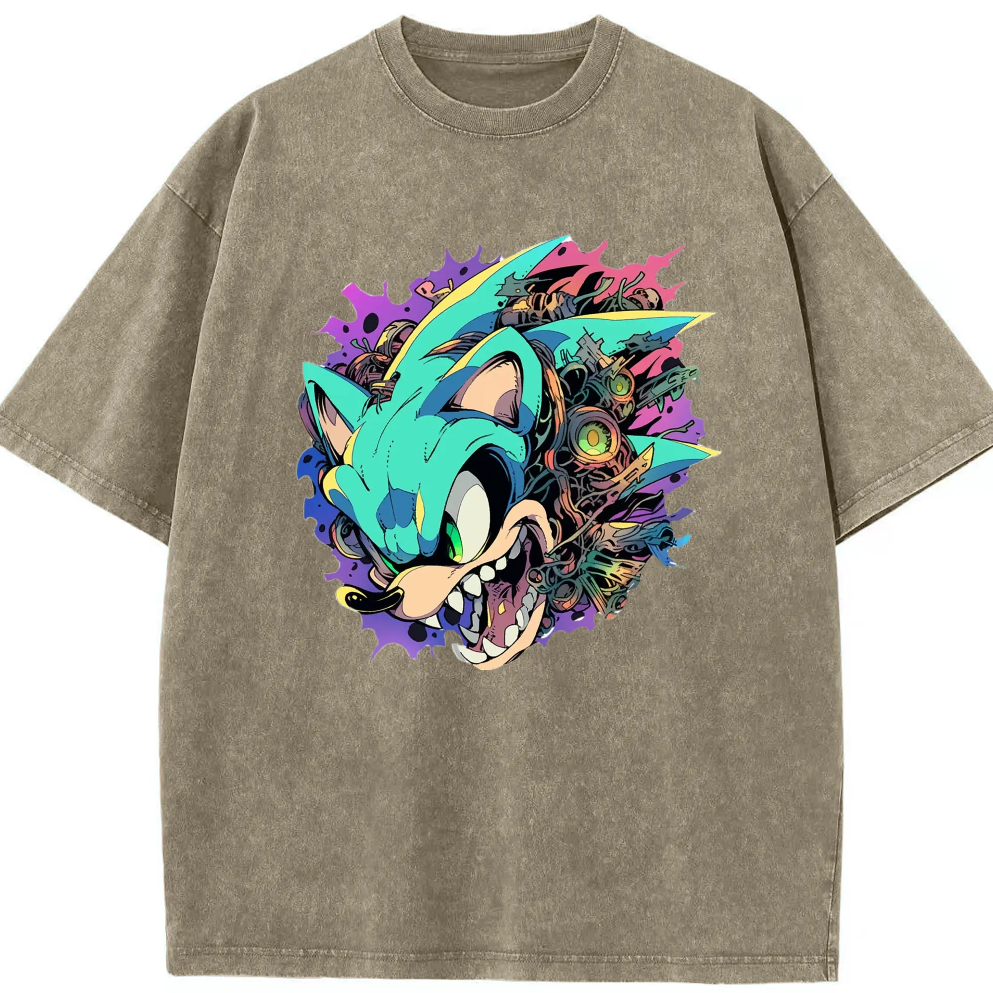 Sonic Collage Cyberpunk Graphic Tee - Washed Vintage Look 230g Cotton Oversized T-Shirt With Front Heat Transfer Print – Soft, Lightweight, Stylish Fit – Comfortable Casual Wear For Sports & Everyday Use
