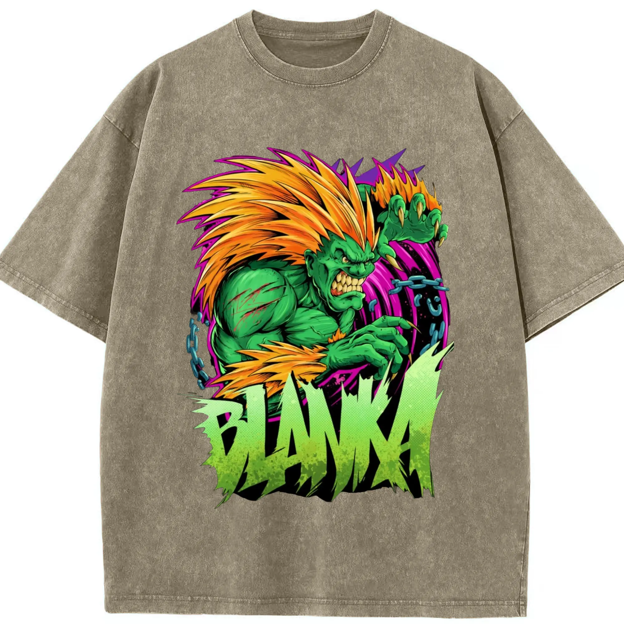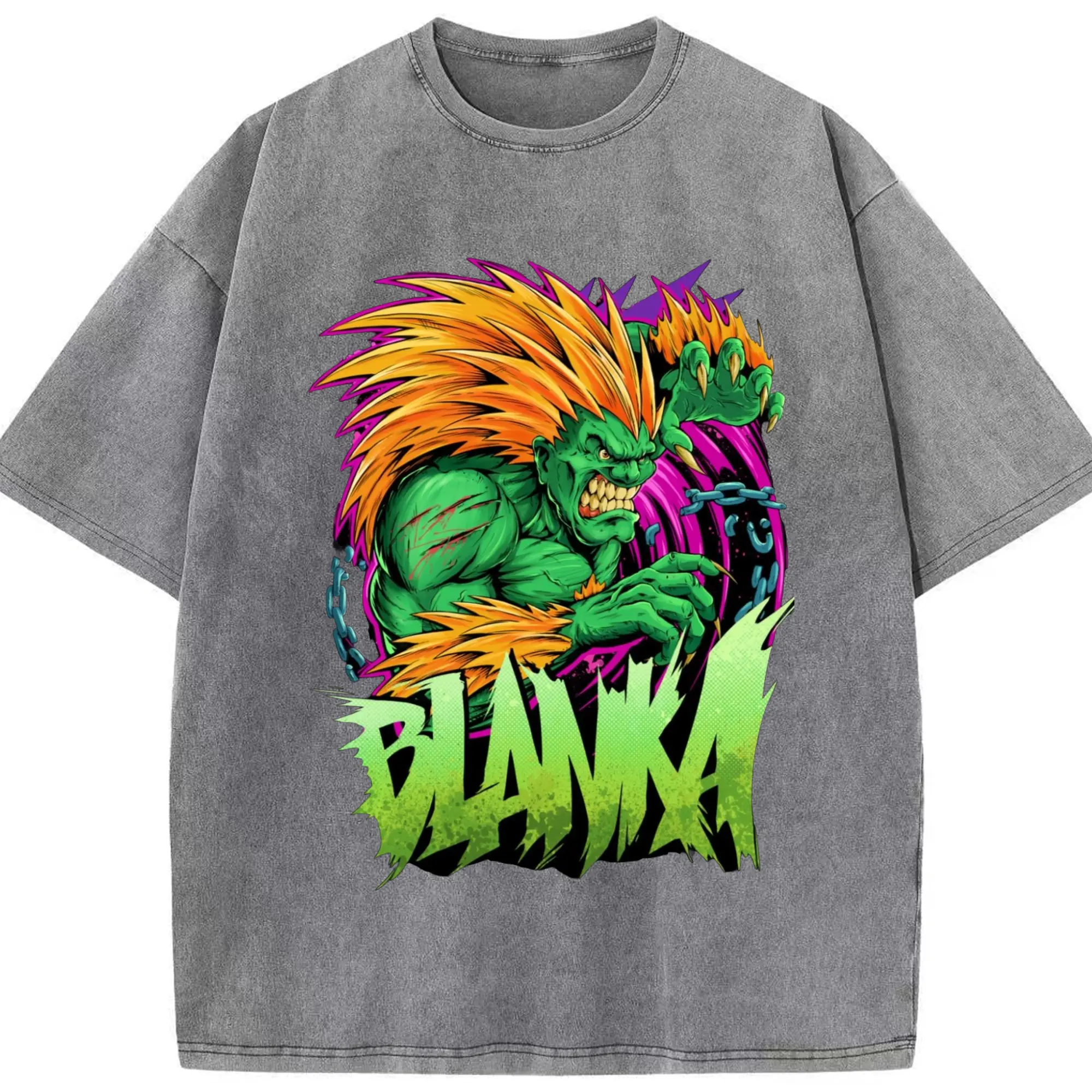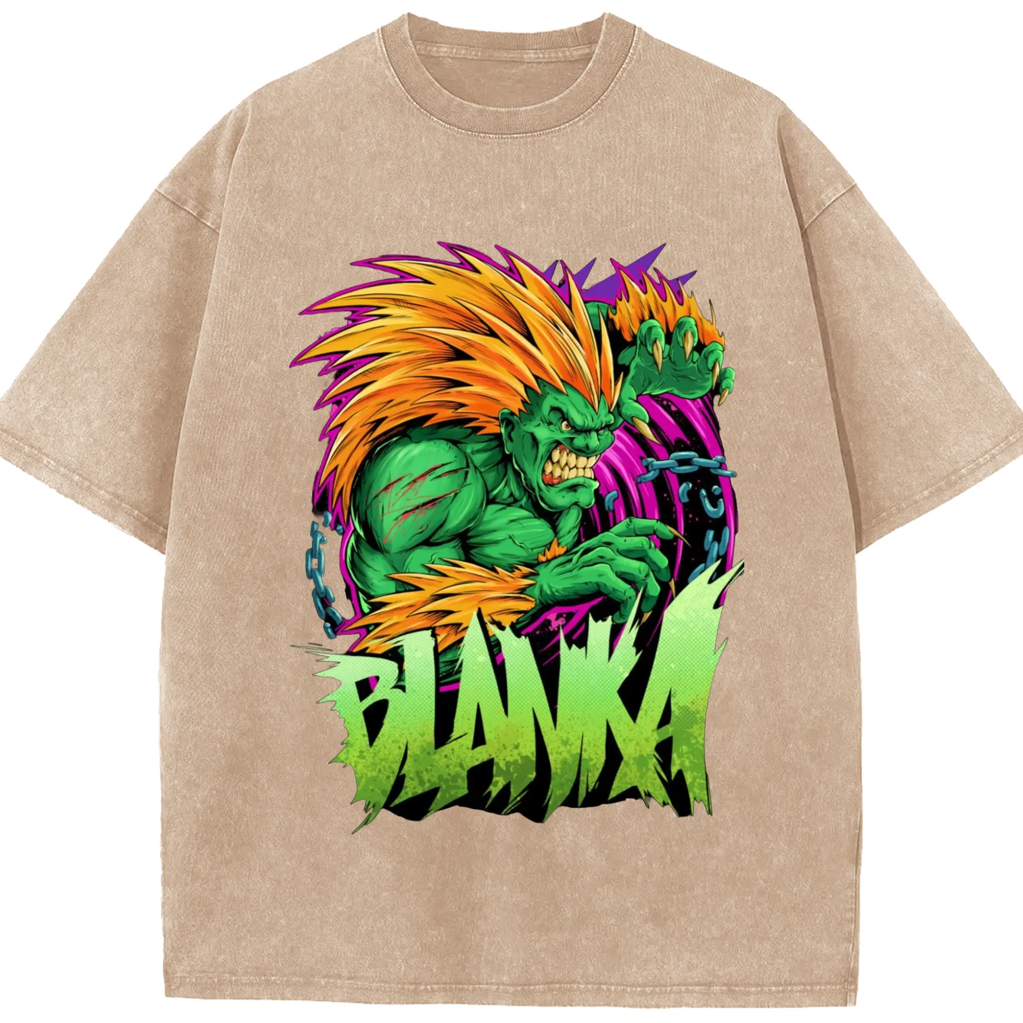Street fighter blanka t shirt​ - Washed Vintage Look 230g Cotton Oversized T-Shirt With Front Heat Transfer Print – Soft, Lightweight, Stylish Fit – Comfortable Casual Wear For Sports & Everyday Use
