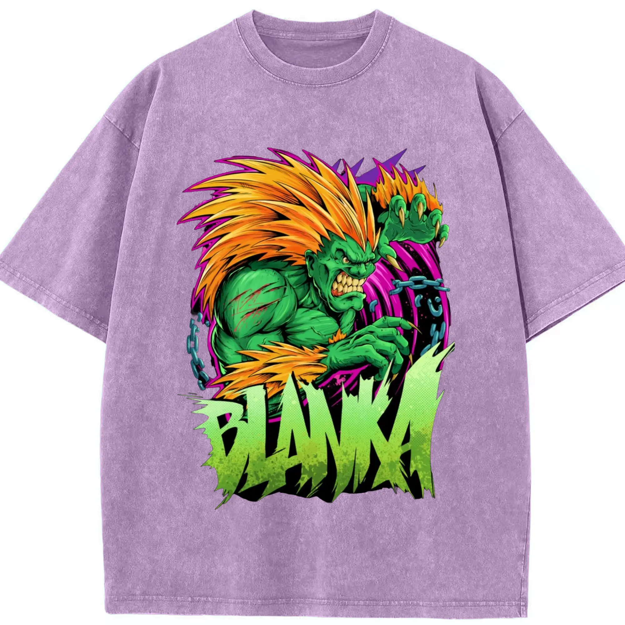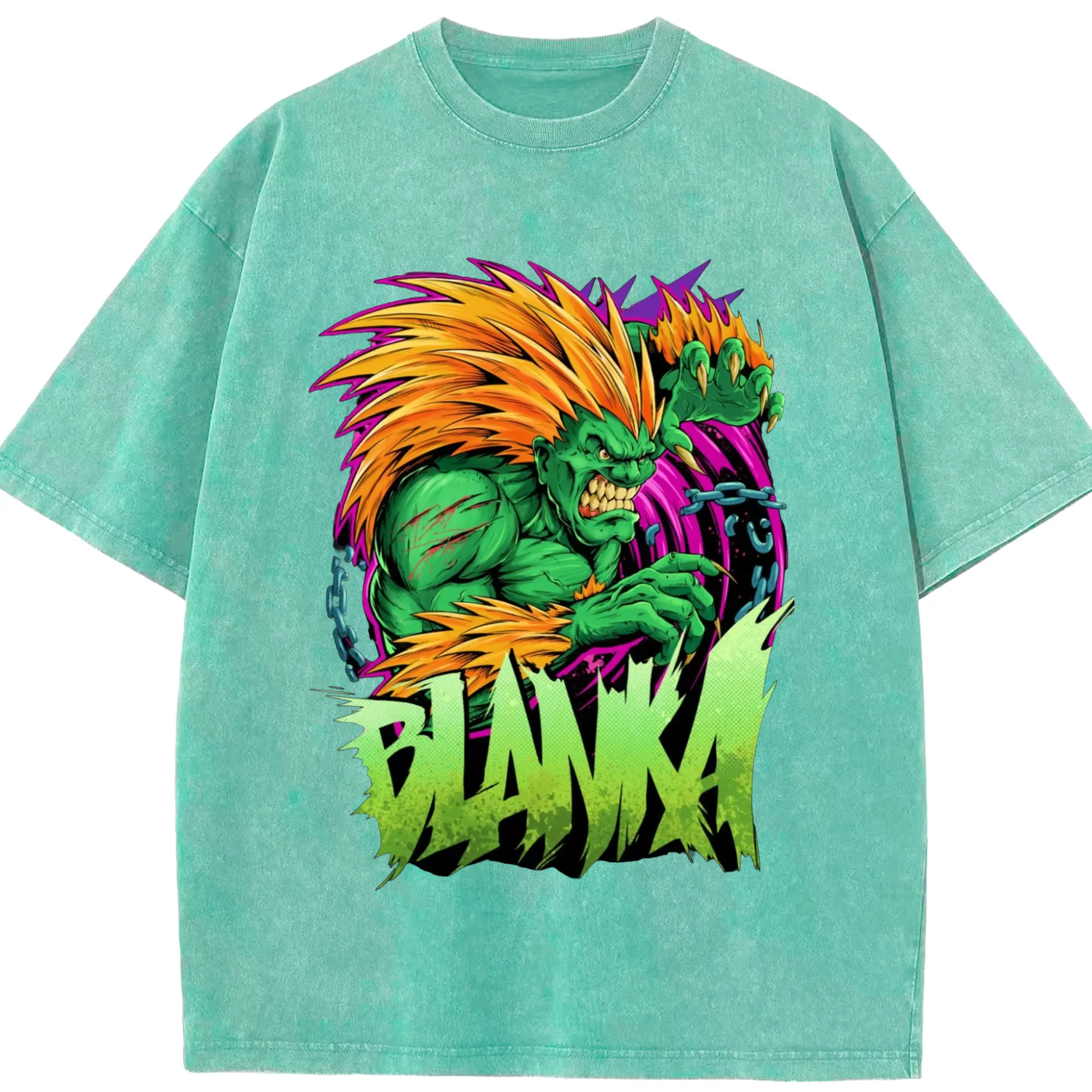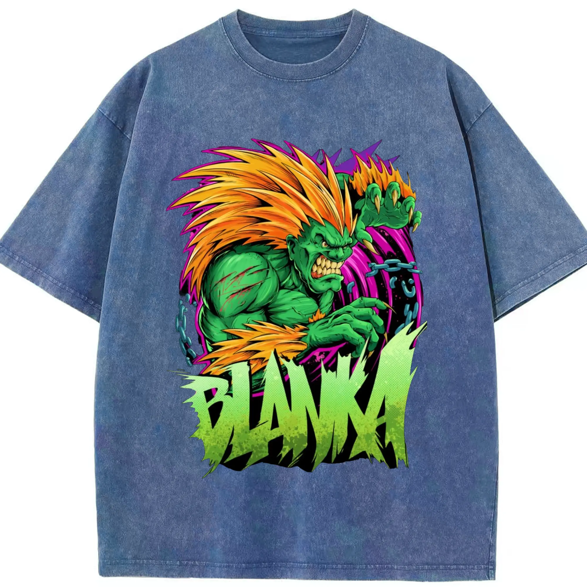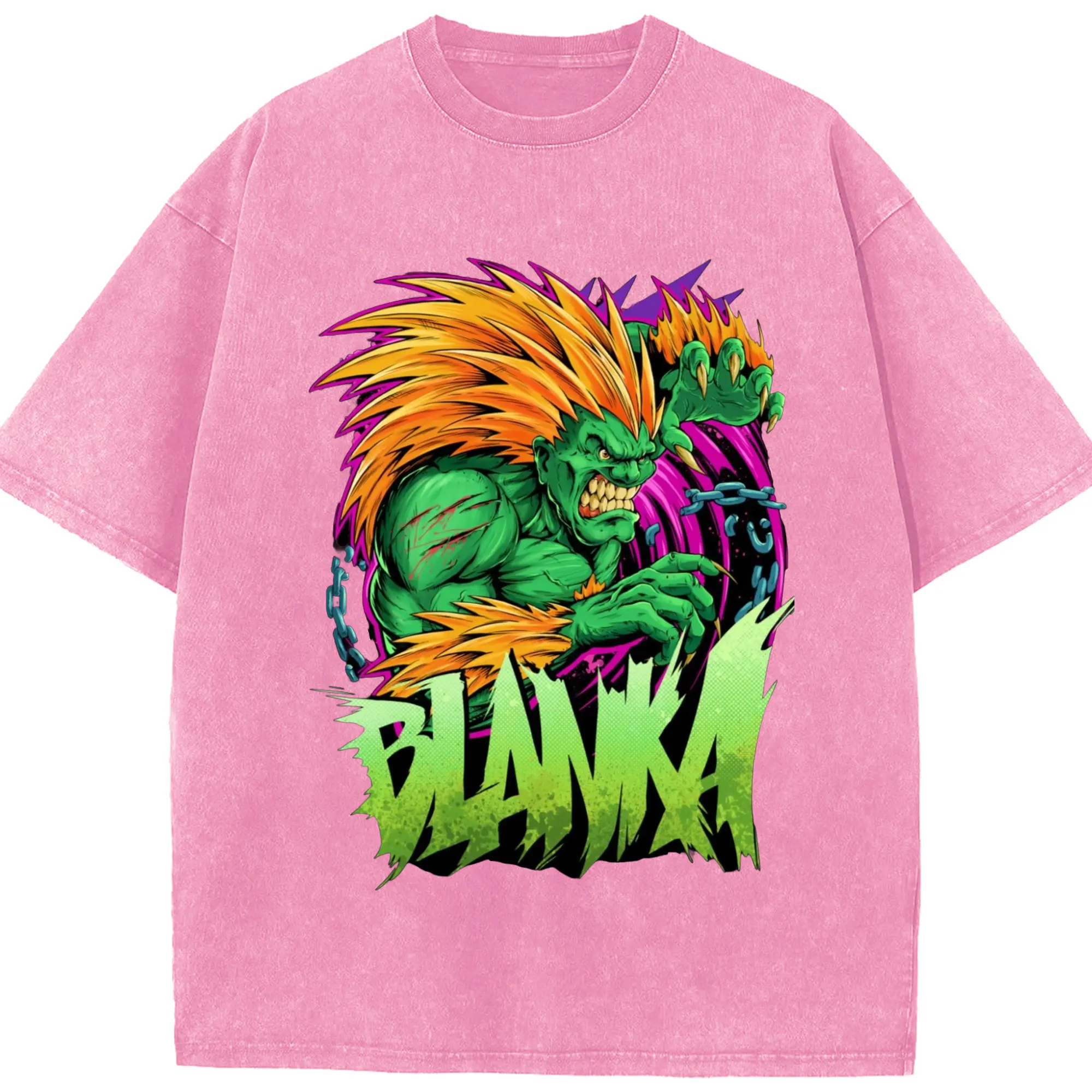 Street fighter blanka t shirt​ - Washed Vintage Look 230g Cotton Oversized T-Shirt With Front Heat Transfer Print – Soft, Lightweight, Stylish Fit – Comfortable Casual Wear For Sports & Everyday Use