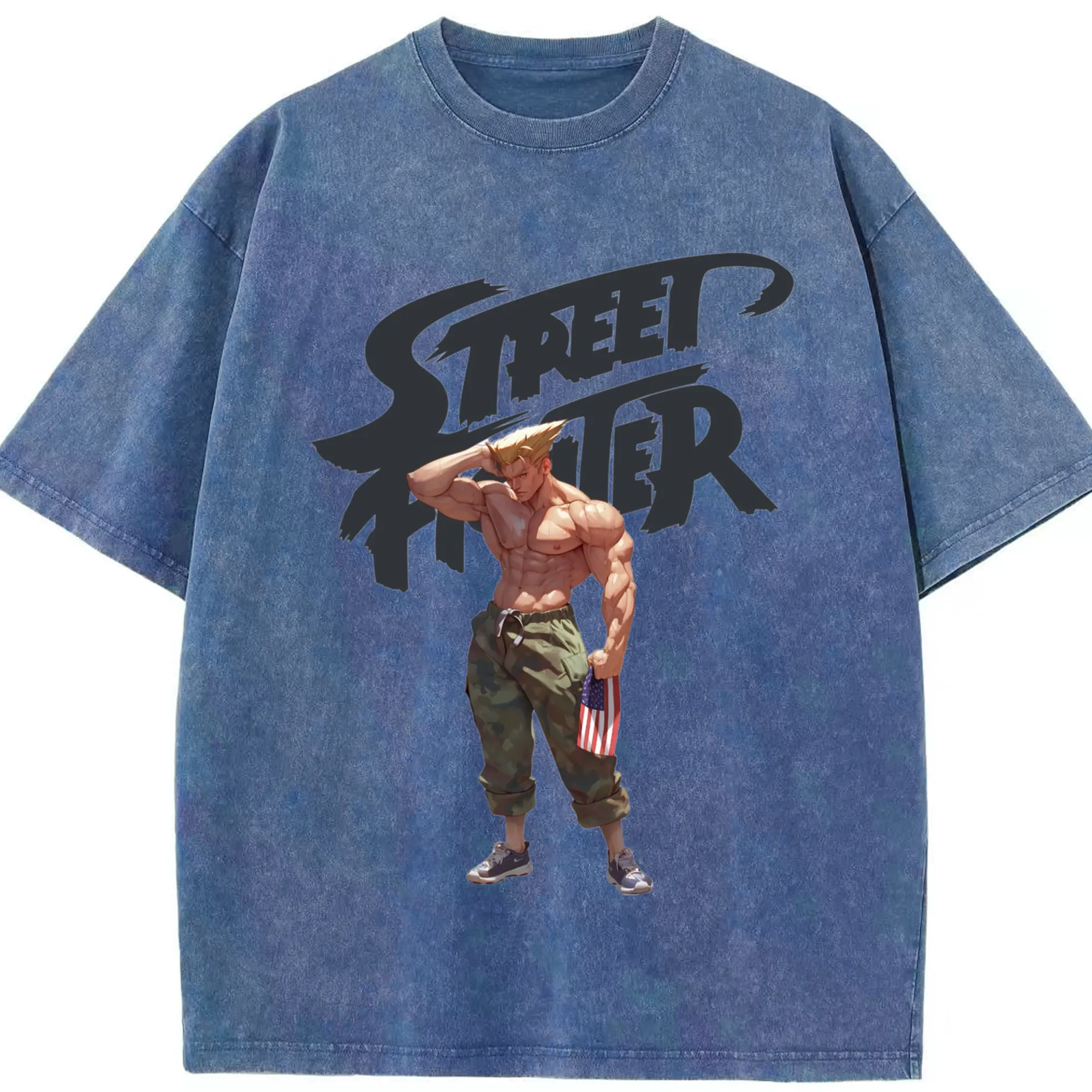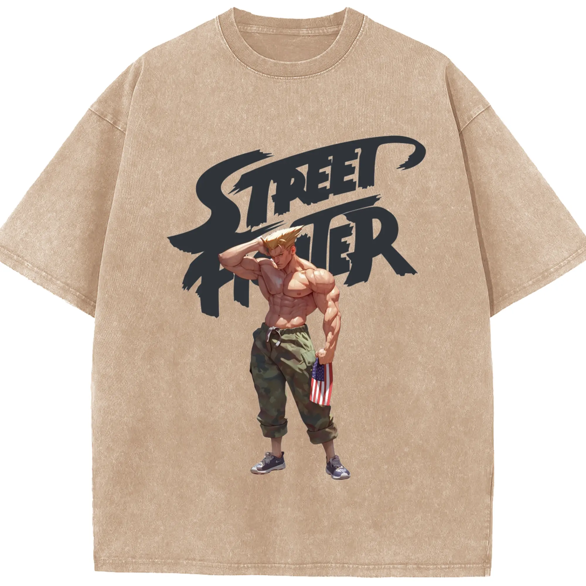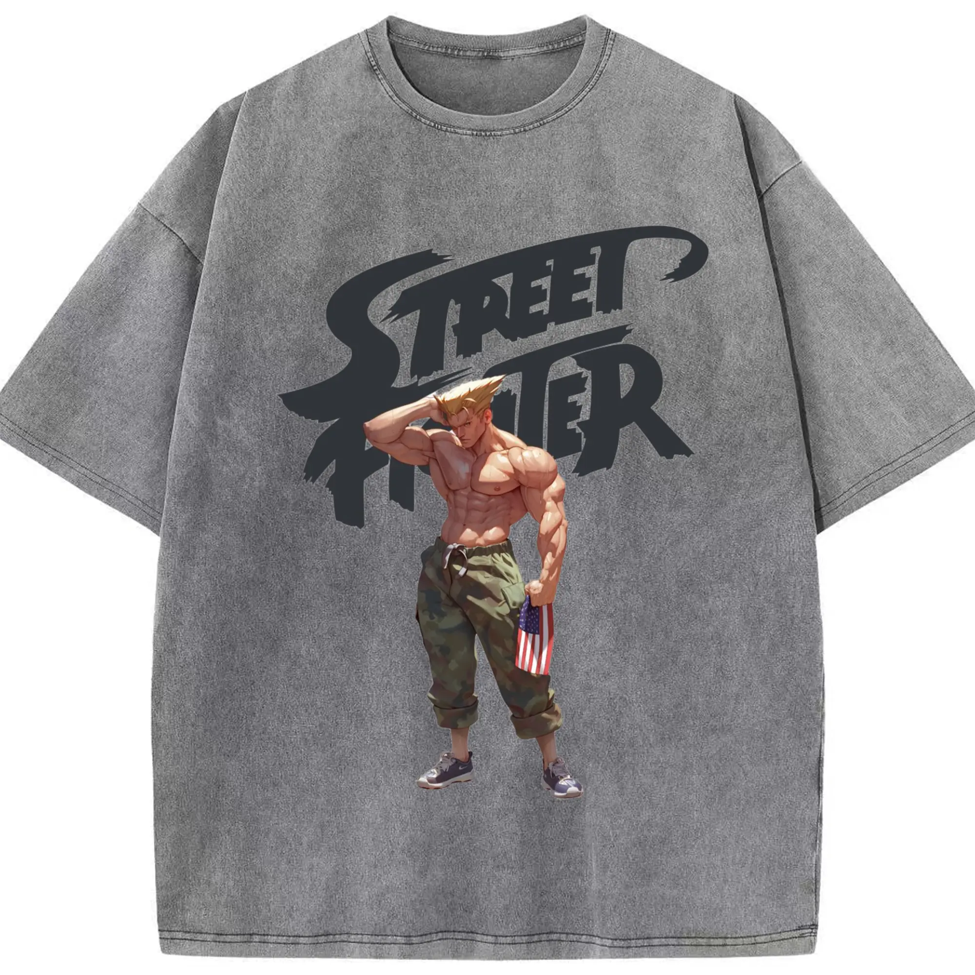 Street fighter guile tee - Washed Vintage Look 230g Cotton Oversized T-Shirt With Front Heat Transfer Print – Soft, Lightweight, Stylish Fit – Comfortable Casual Wear For Sports & Everyday Use