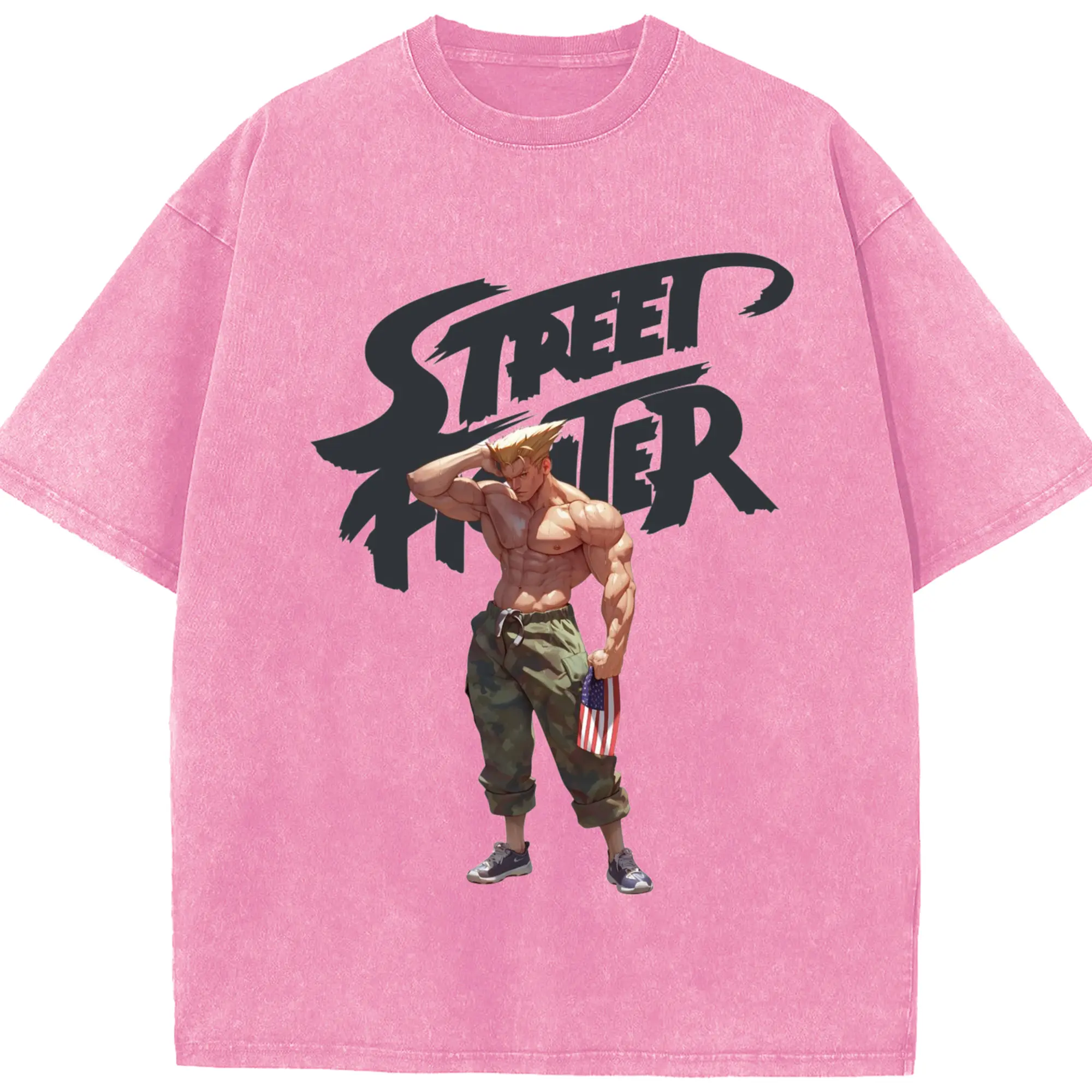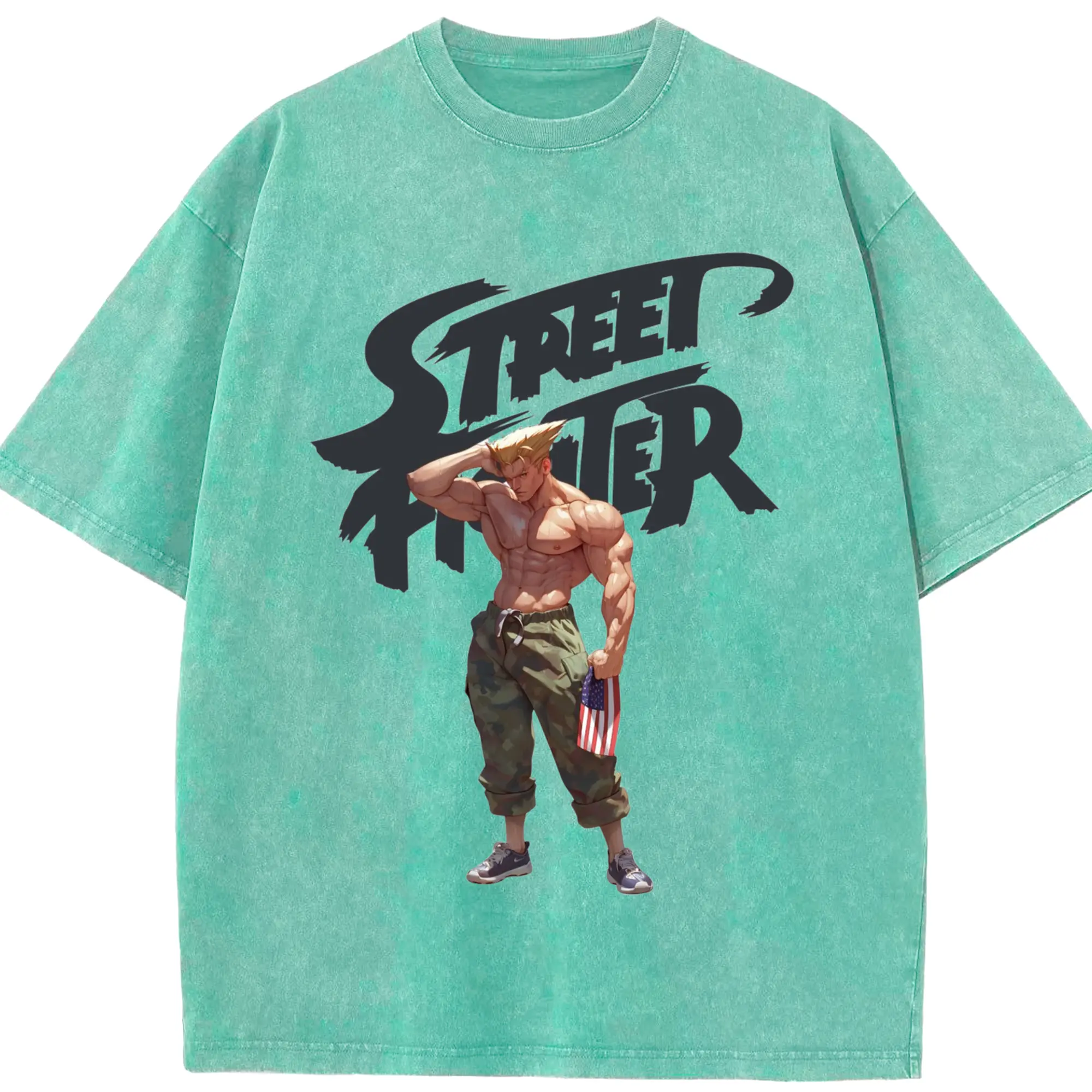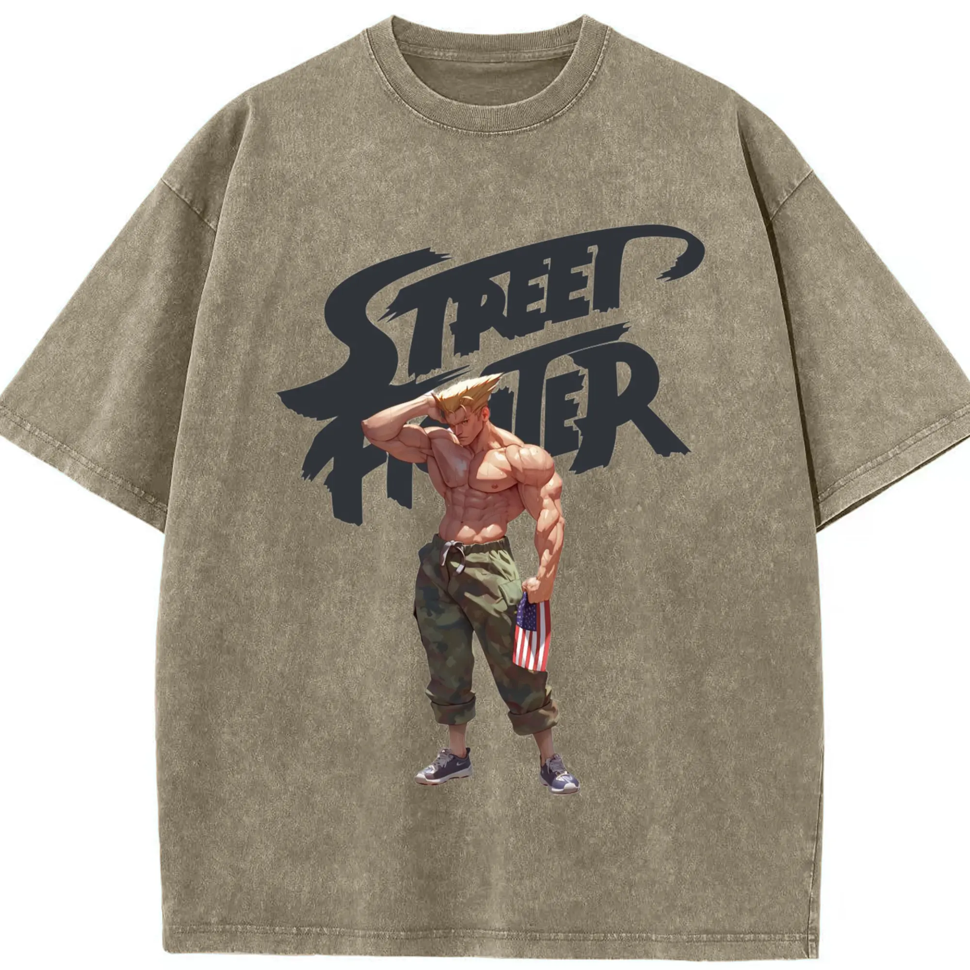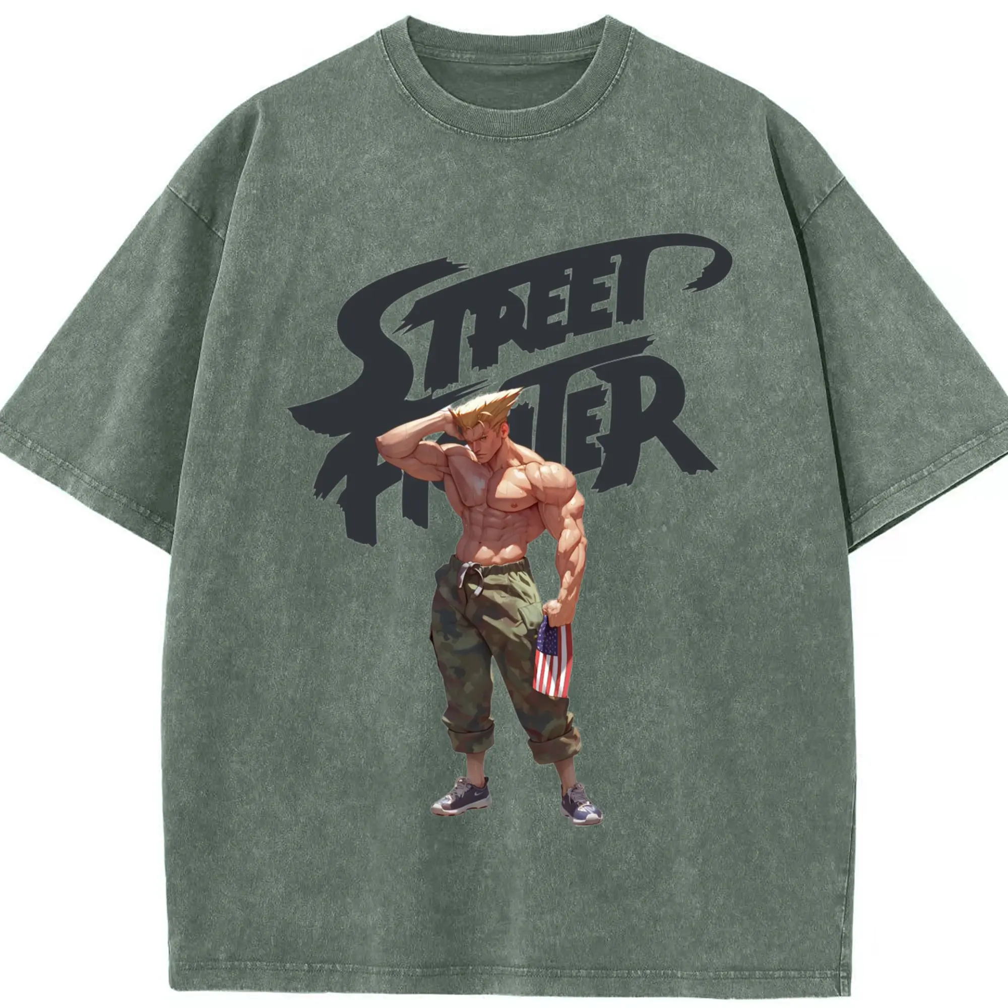Street fighter guile tee - Washed Vintage Look 230g Cotton Oversized T-Shirt With Front Heat Transfer Print – Soft, Lightweight, Stylish Fit – Comfortable Casual Wear For Sports & Everyday Use