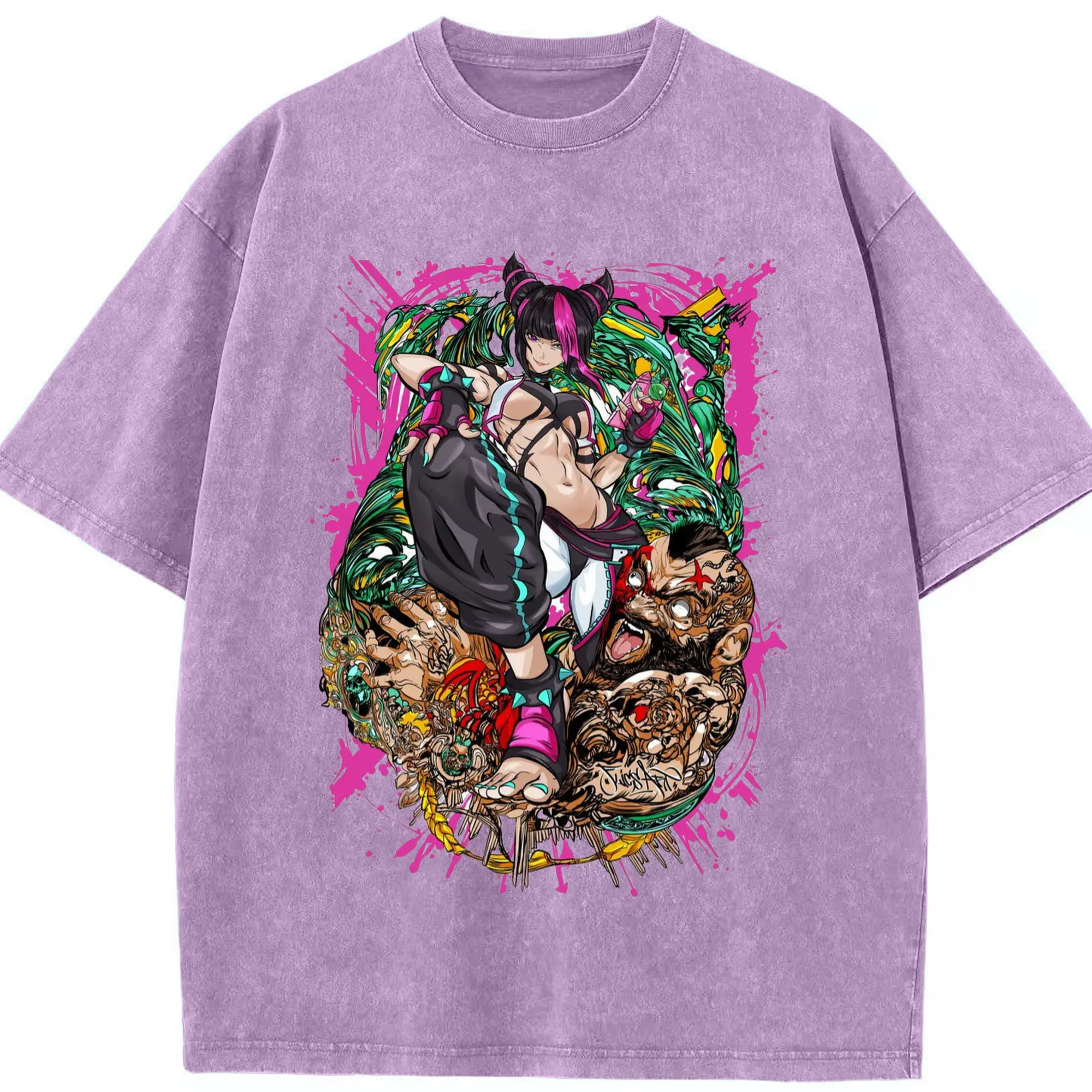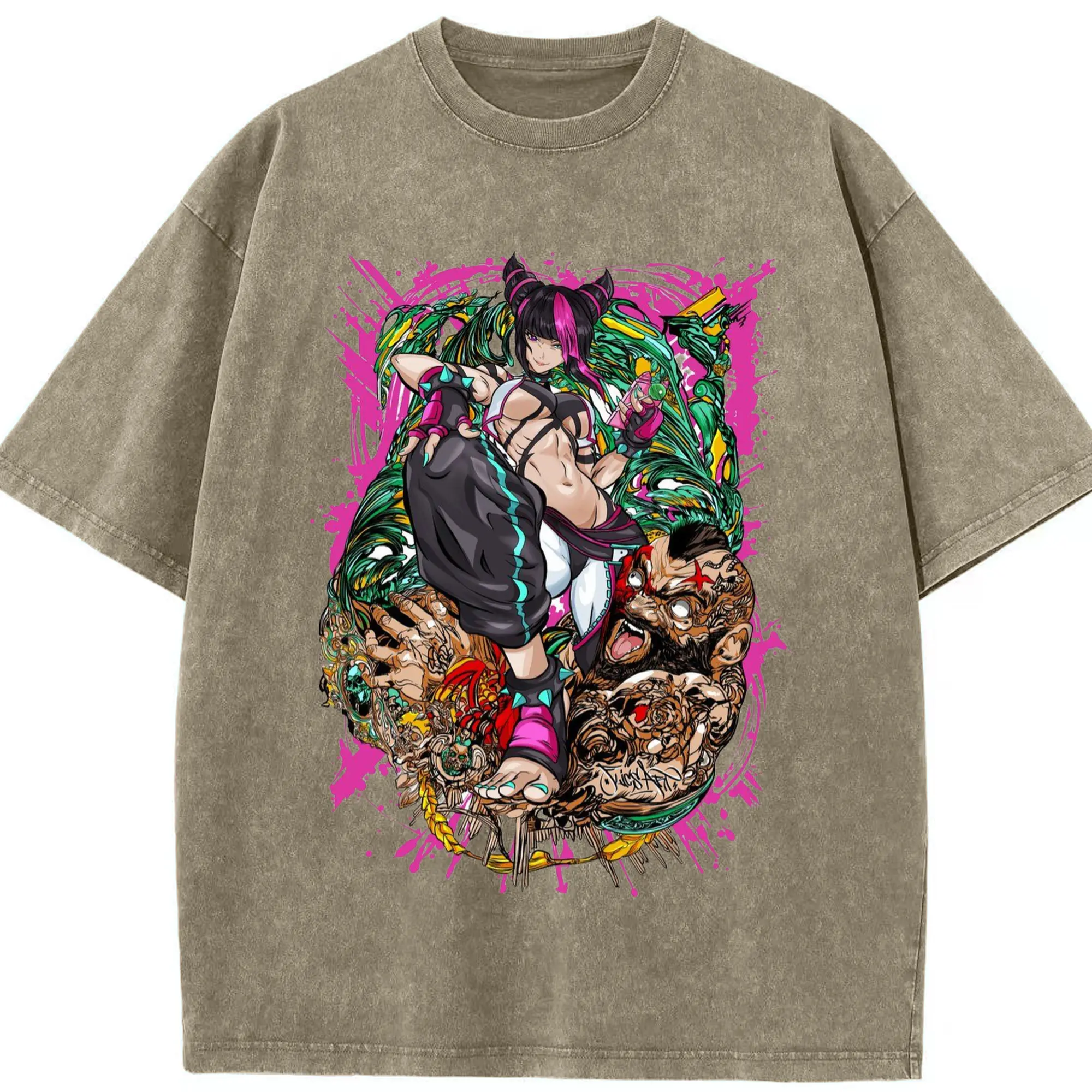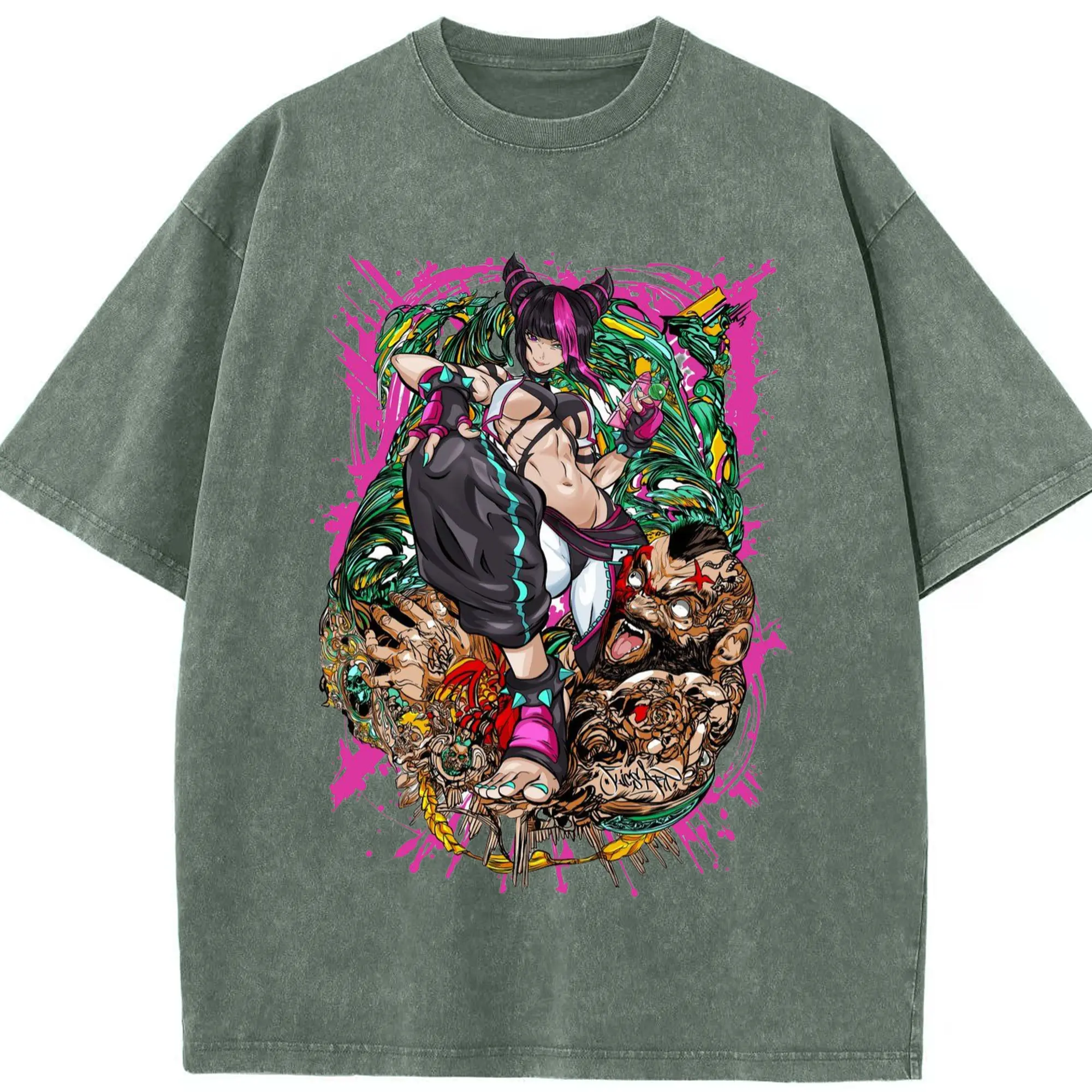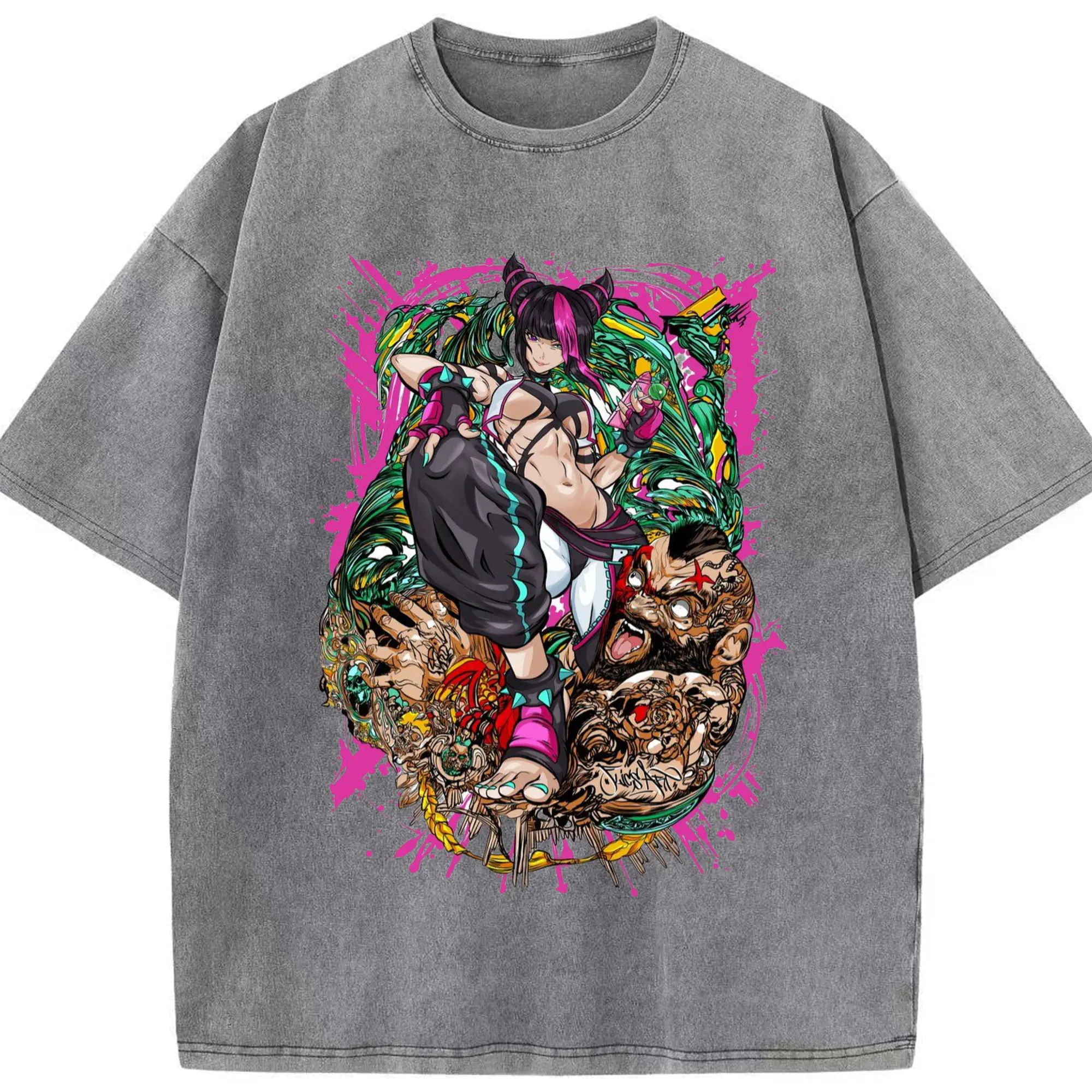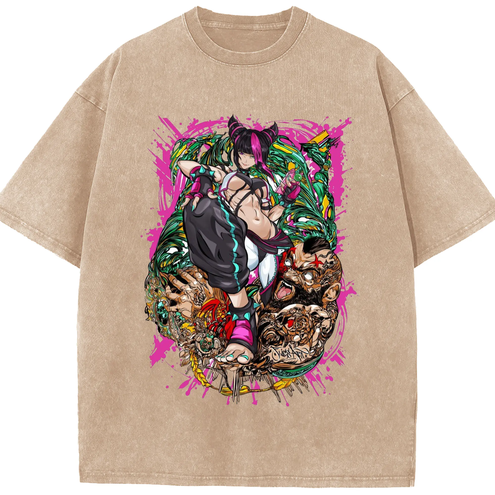 Street fighter juri collage shirt - Washed Vintage Look 230g Cotton Oversized T-Shirt With Front Heat Transfer Print – Soft, Lightweight, Stylish Fit – Comfortable Casual Wear For Sports & Everyday Use
