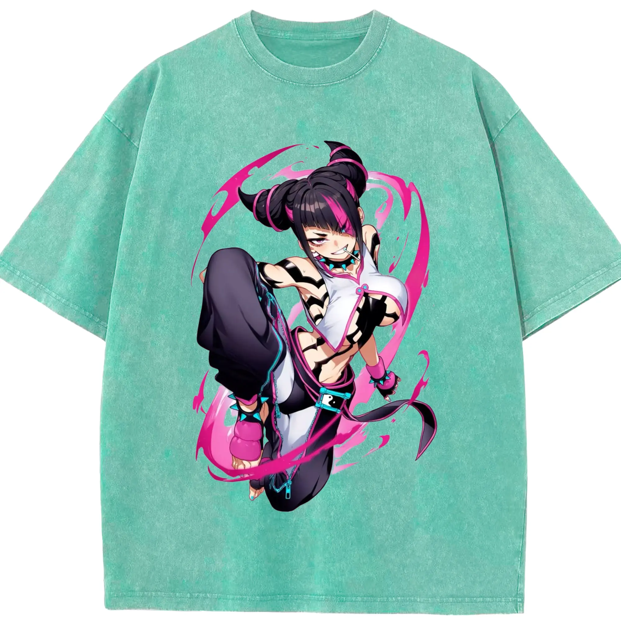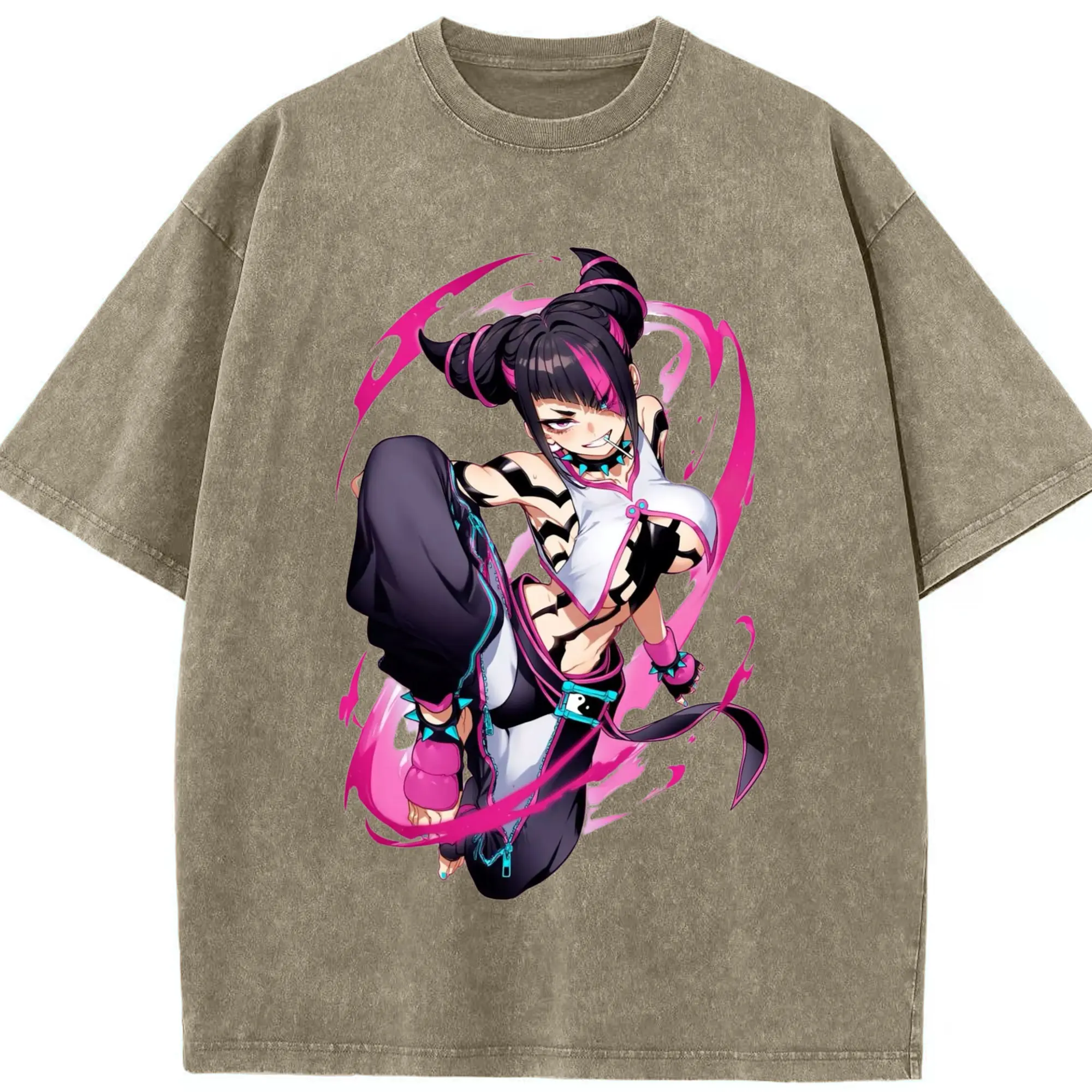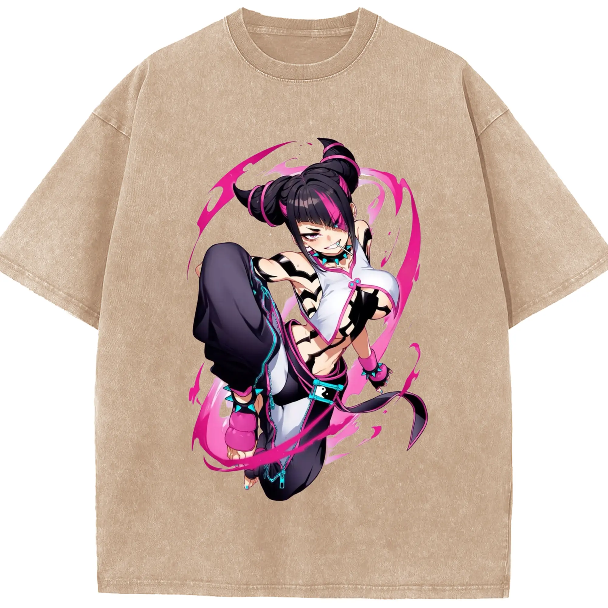 Street fighter juri shirt - Washed Vintage Look 230g Cotton Oversized T-Shirt With Front Heat Transfer Print – Soft, Lightweight, Stylish Fit – Comfortable Casual Wear For Sports & Everyday Use