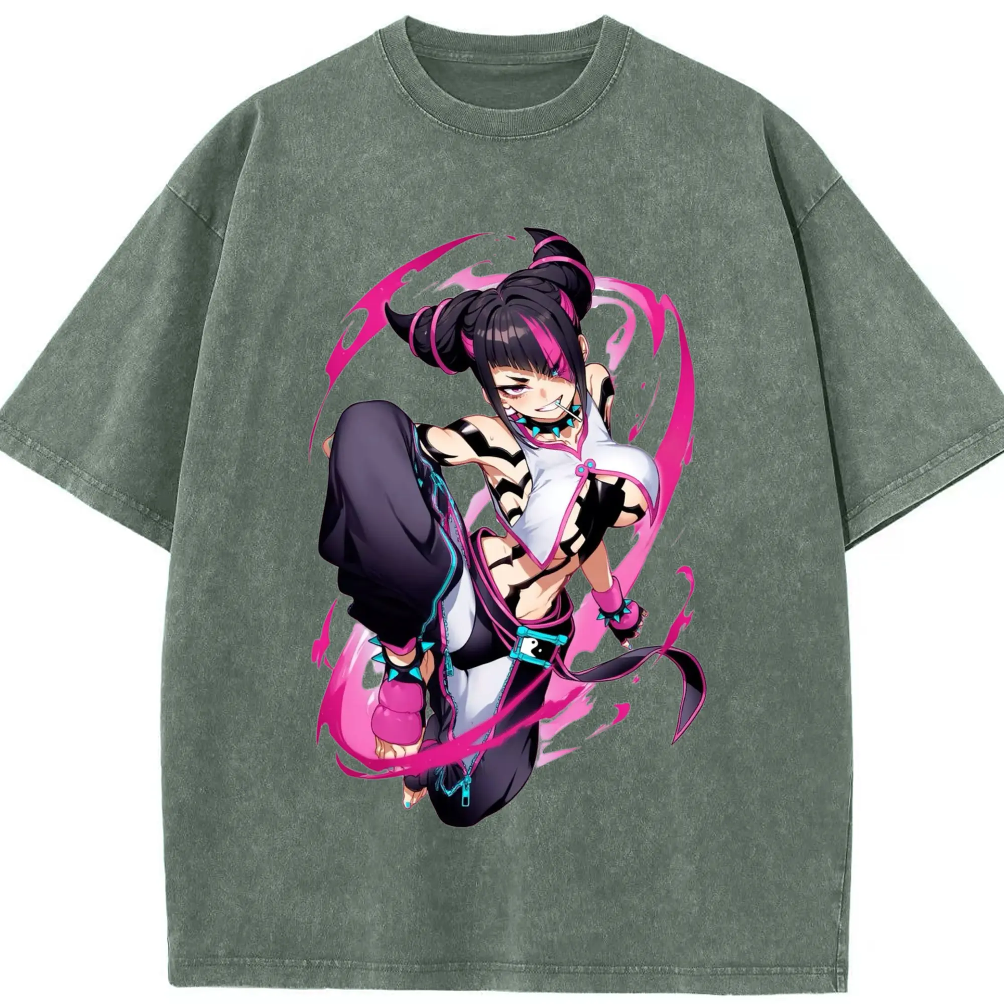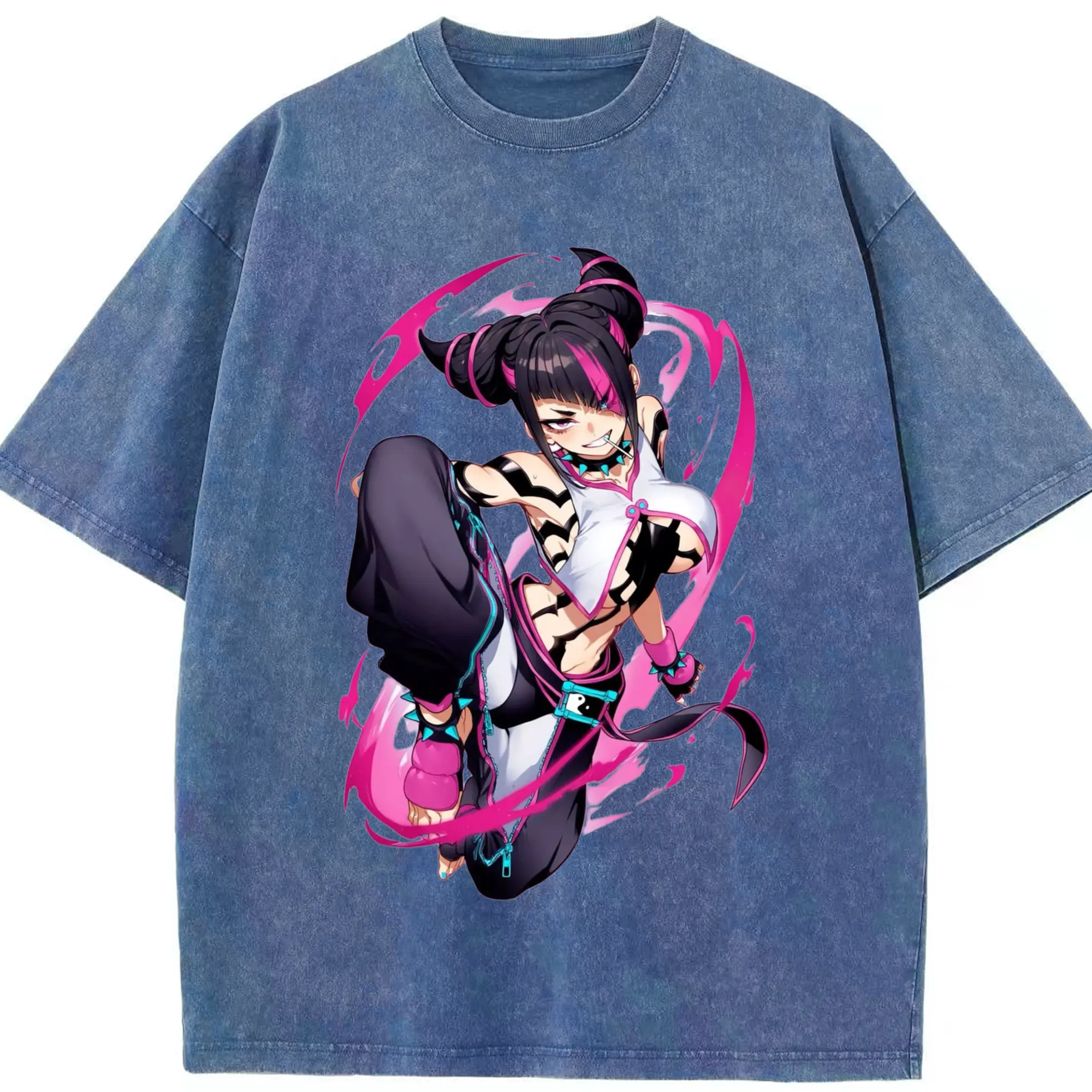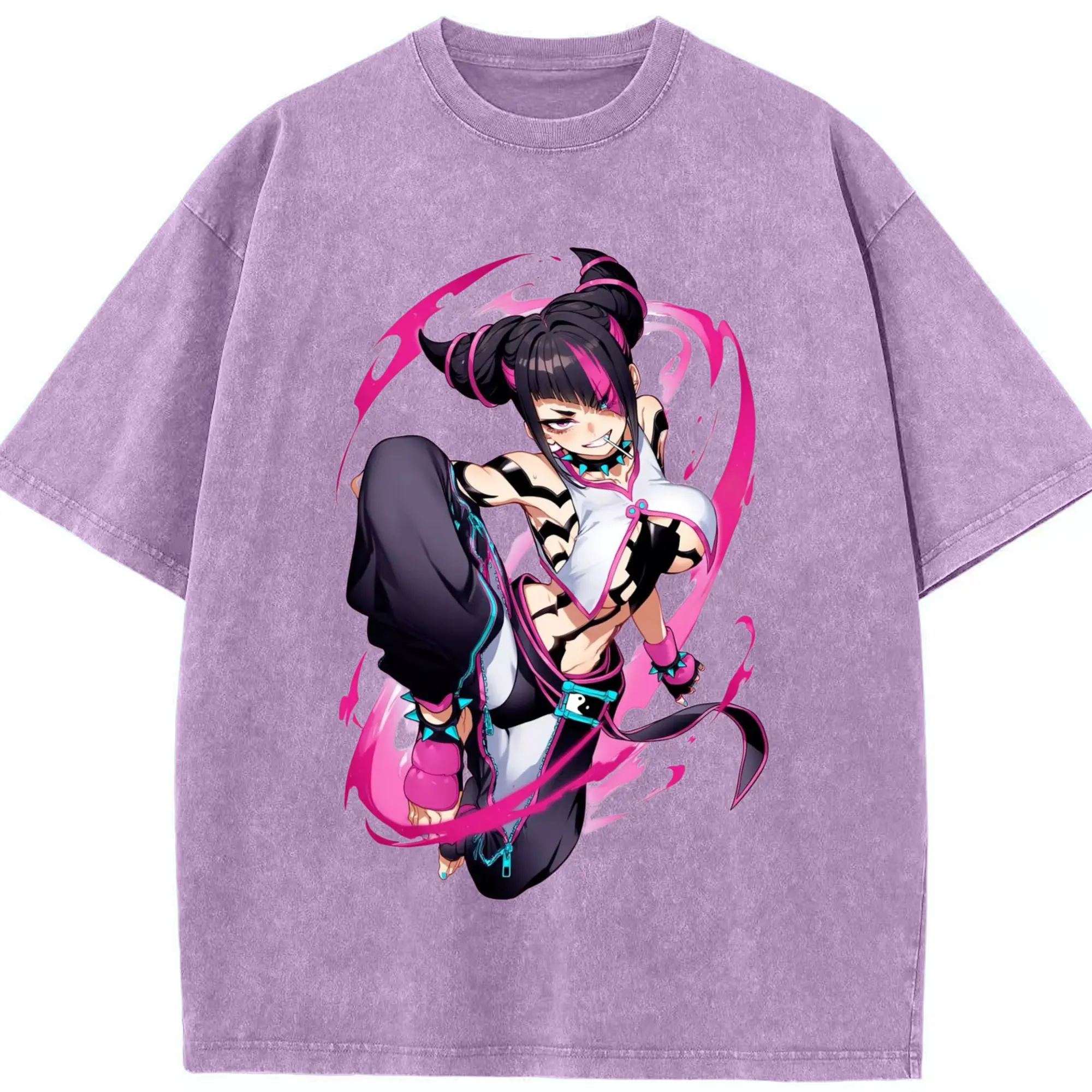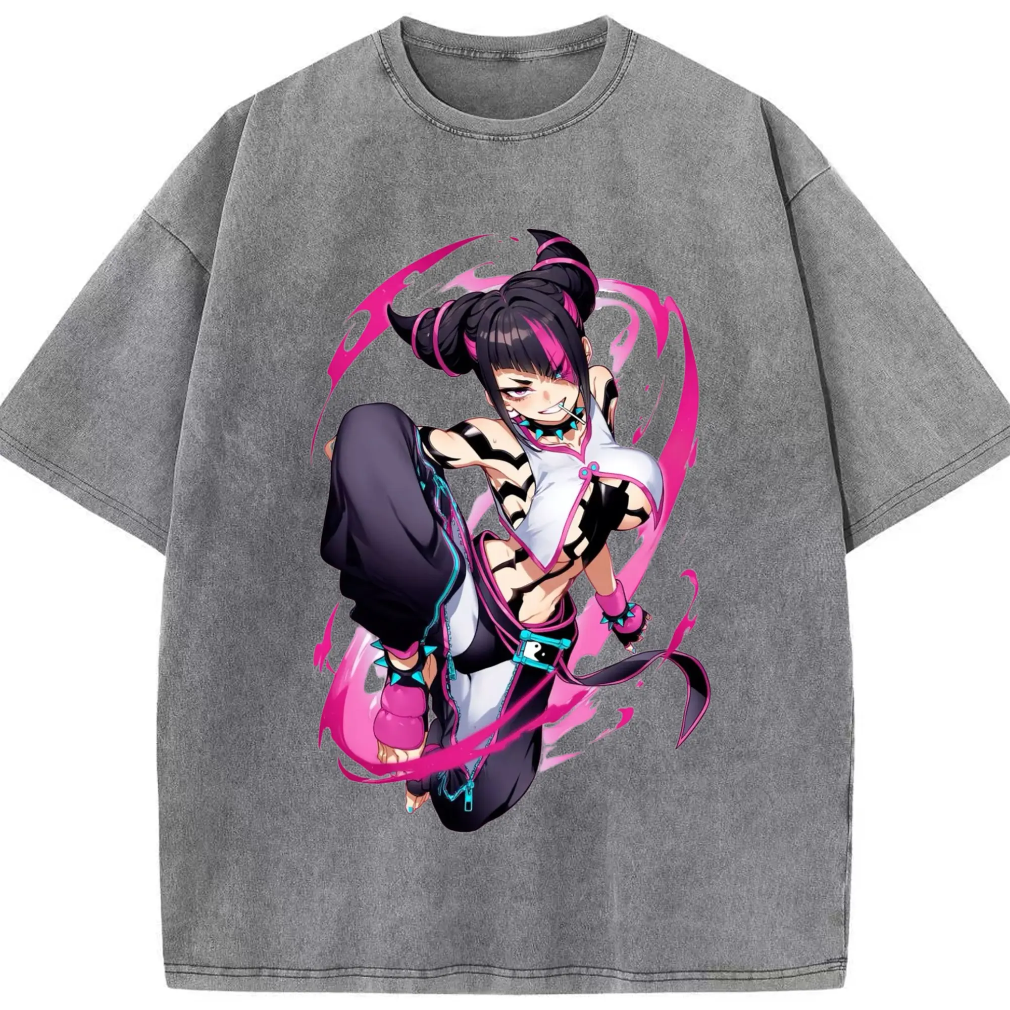 Street fighter juri shirt - Washed Vintage Look 230g Cotton Oversized T-Shirt With Front Heat Transfer Print – Soft, Lightweight, Stylish Fit – Comfortable Casual Wear For Sports & Everyday Use