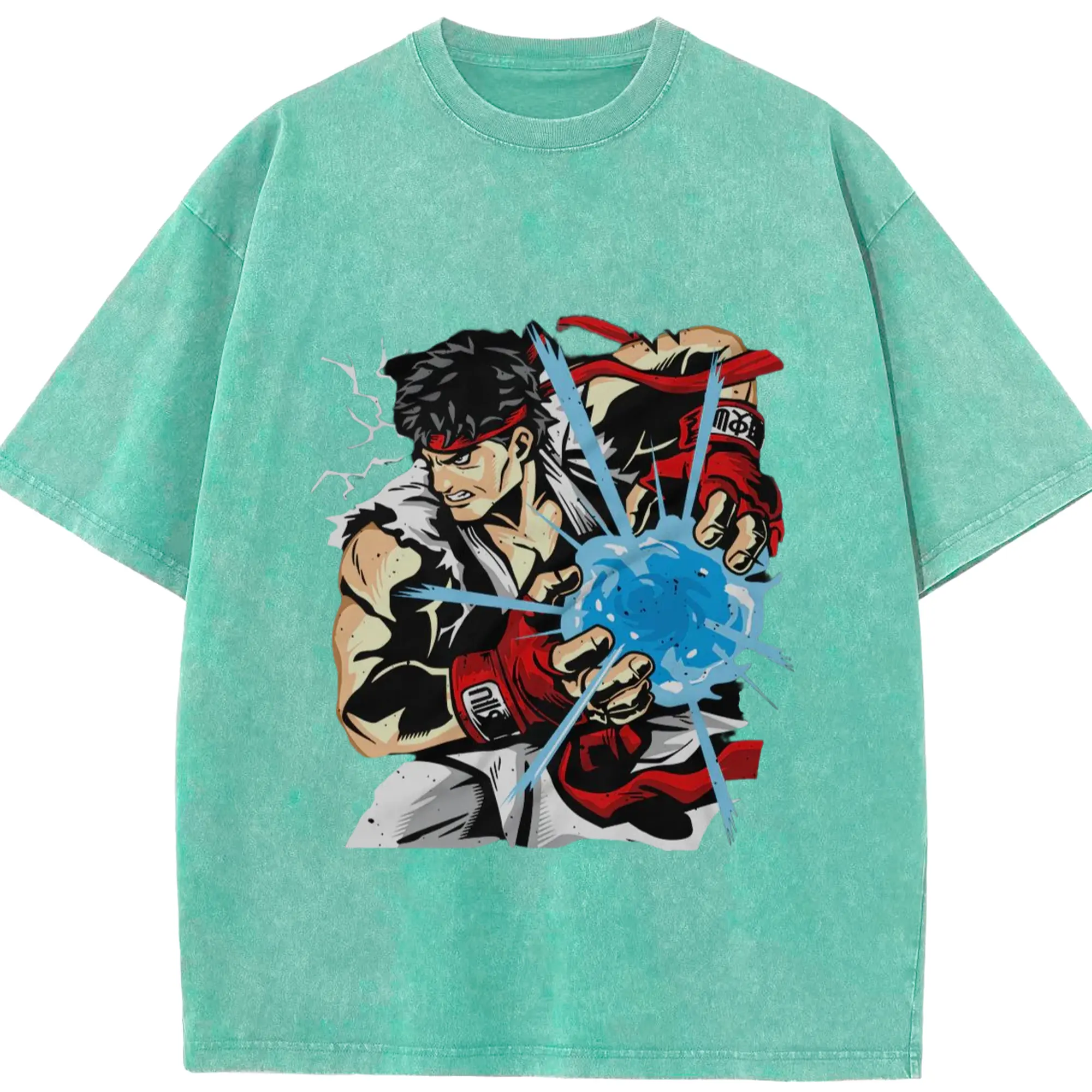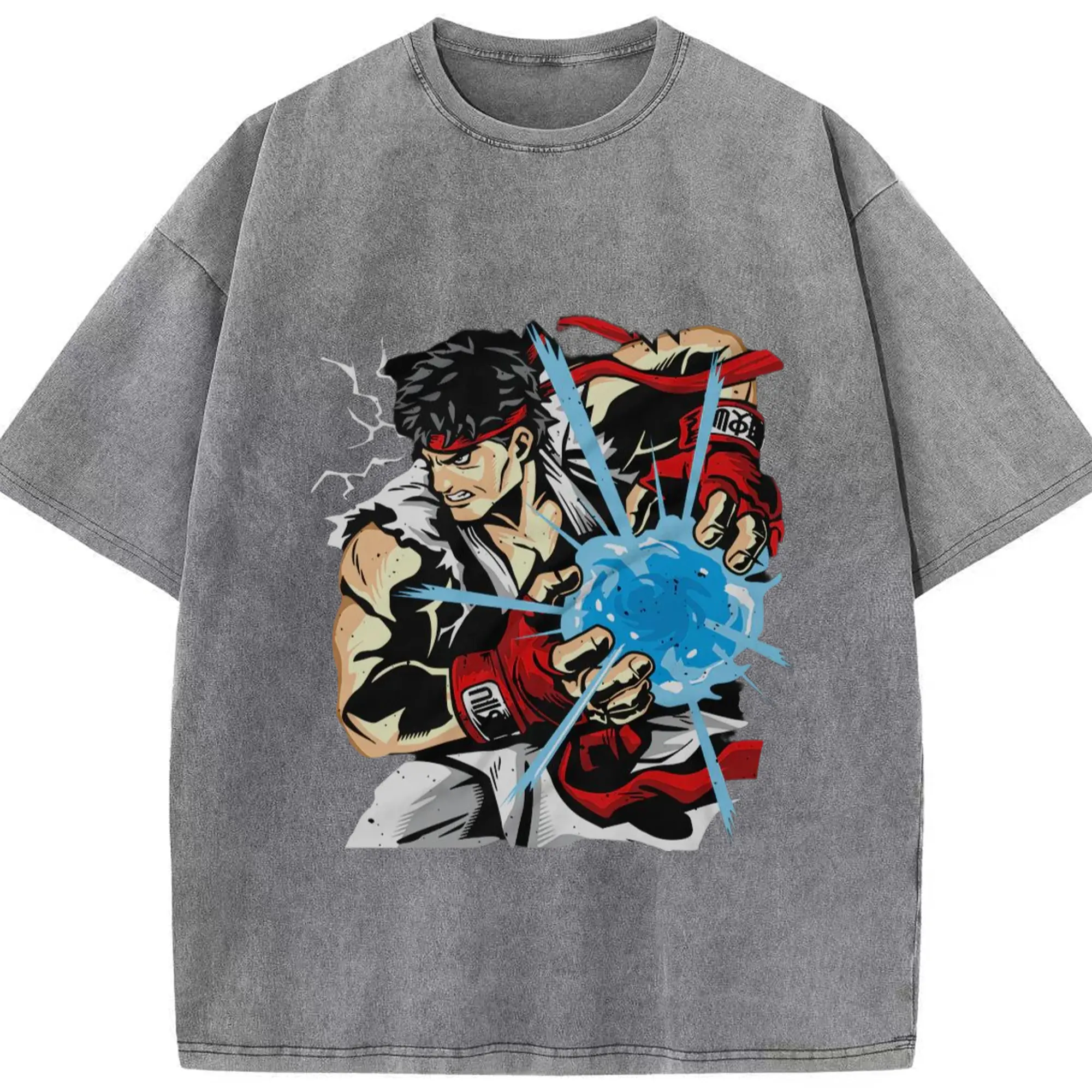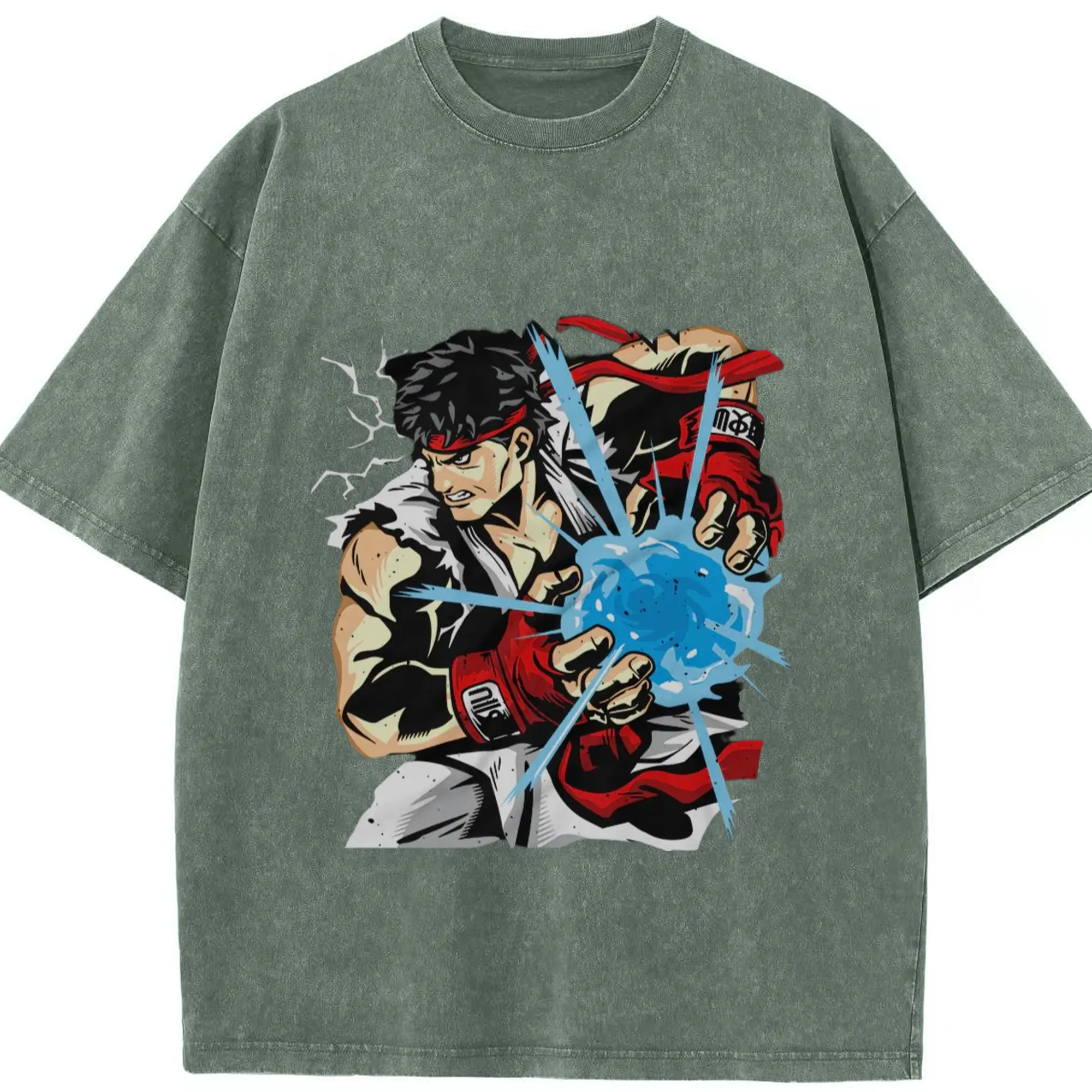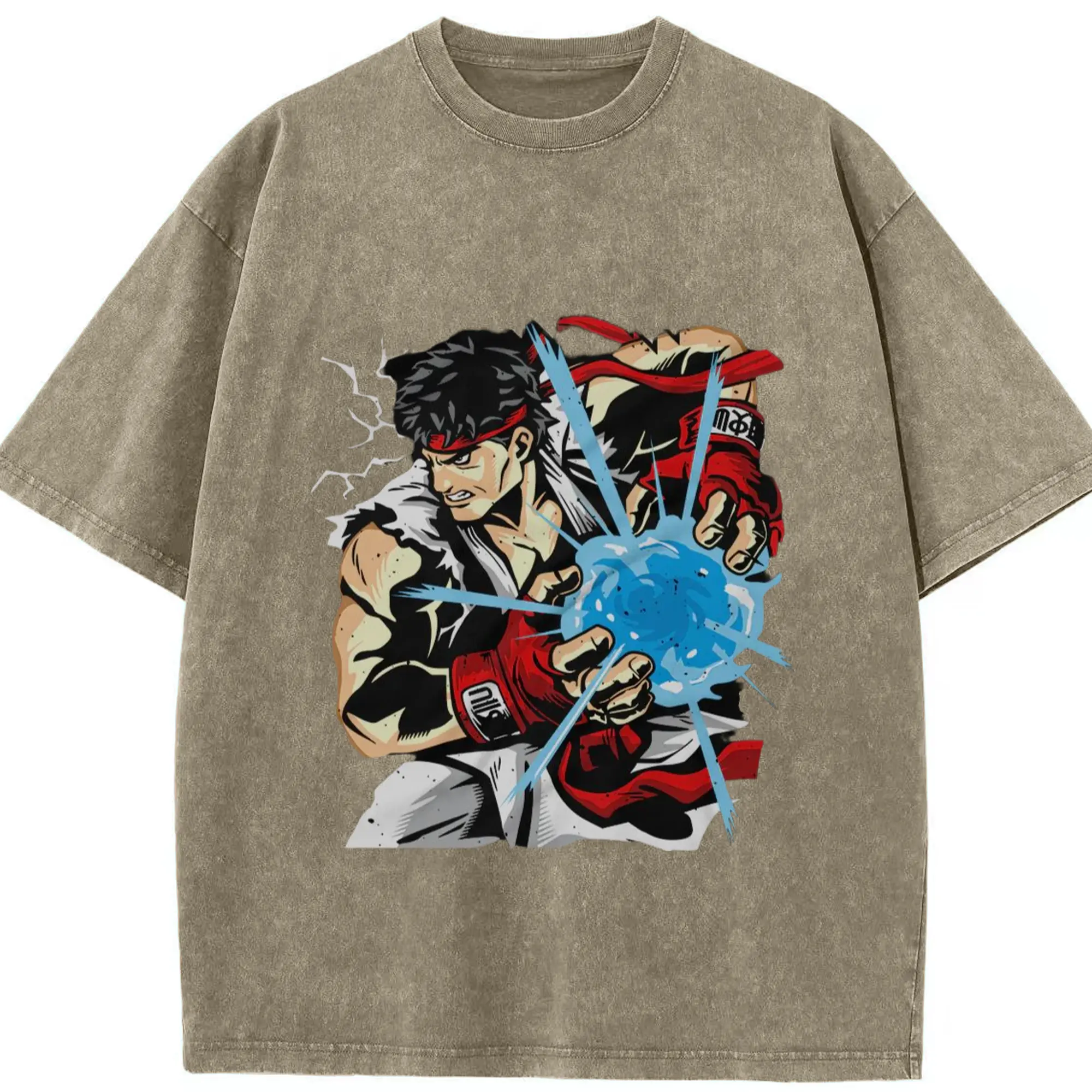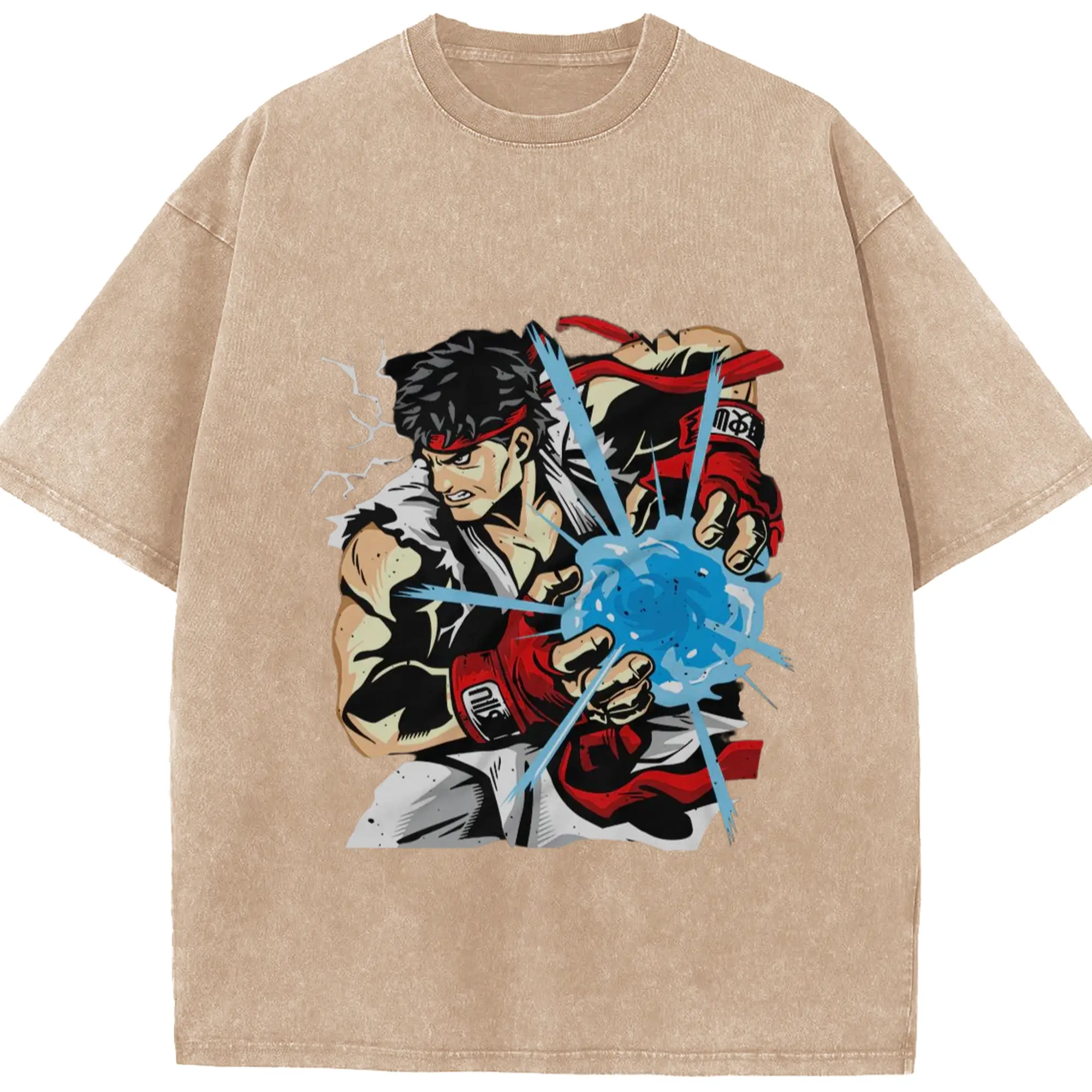 Street fighter ryu art shirt​ - Washed Vintage Look 230g Cotton Oversized T-Shirt With Front Heat Transfer Print – Soft, Lightweight, Stylish Fit – Comfortable Casual Wear For Sports & Everyday Use
