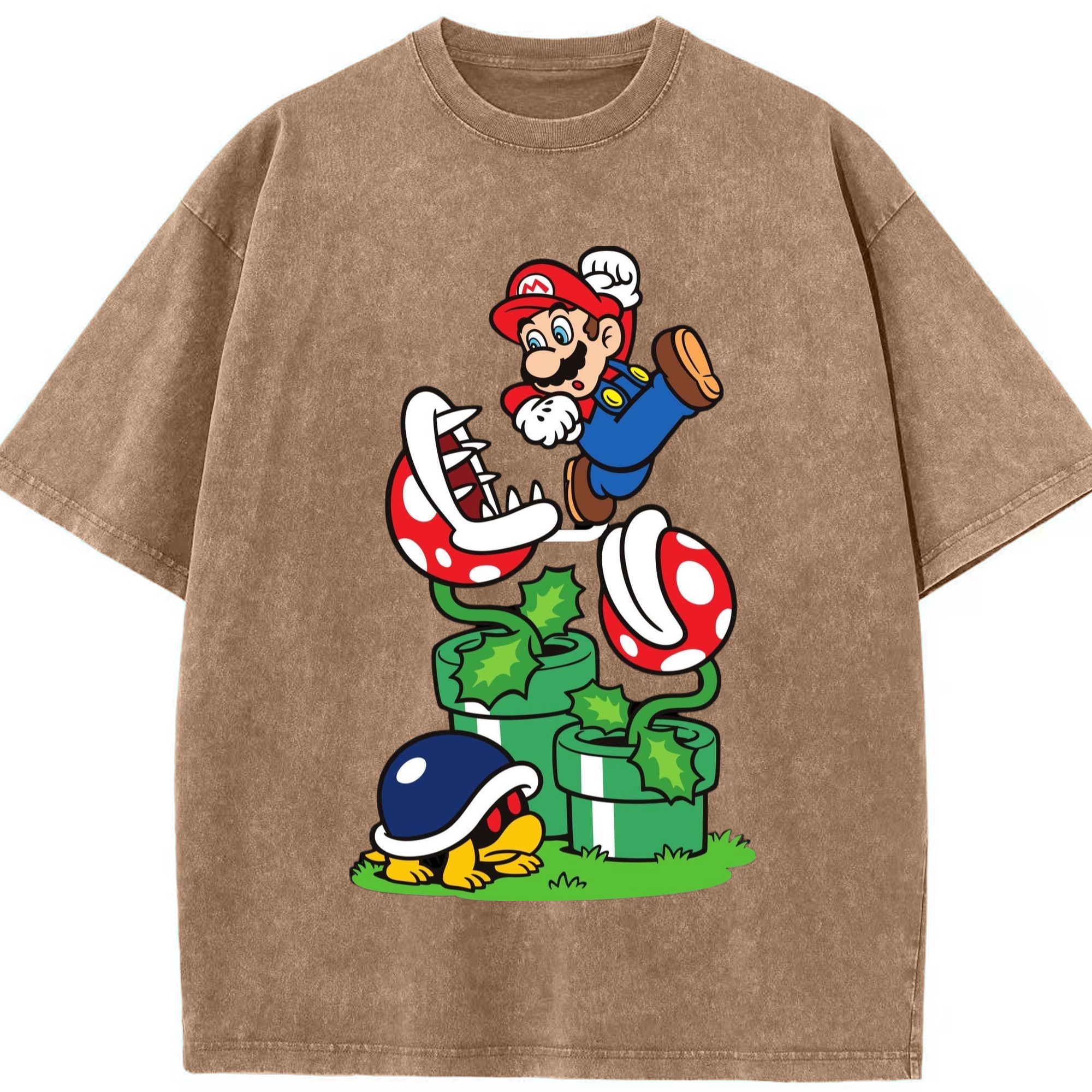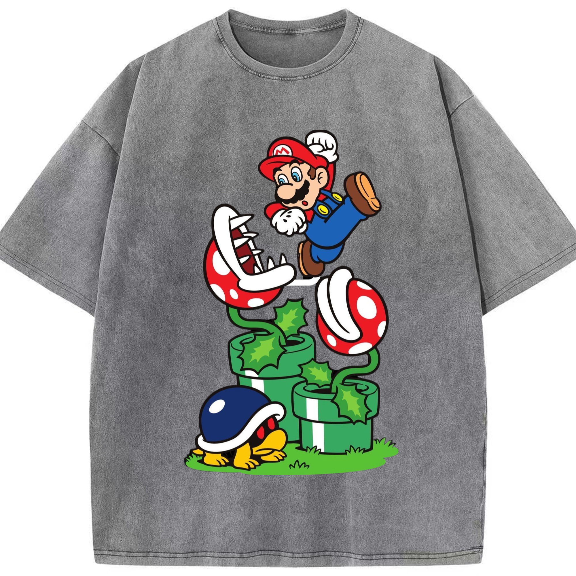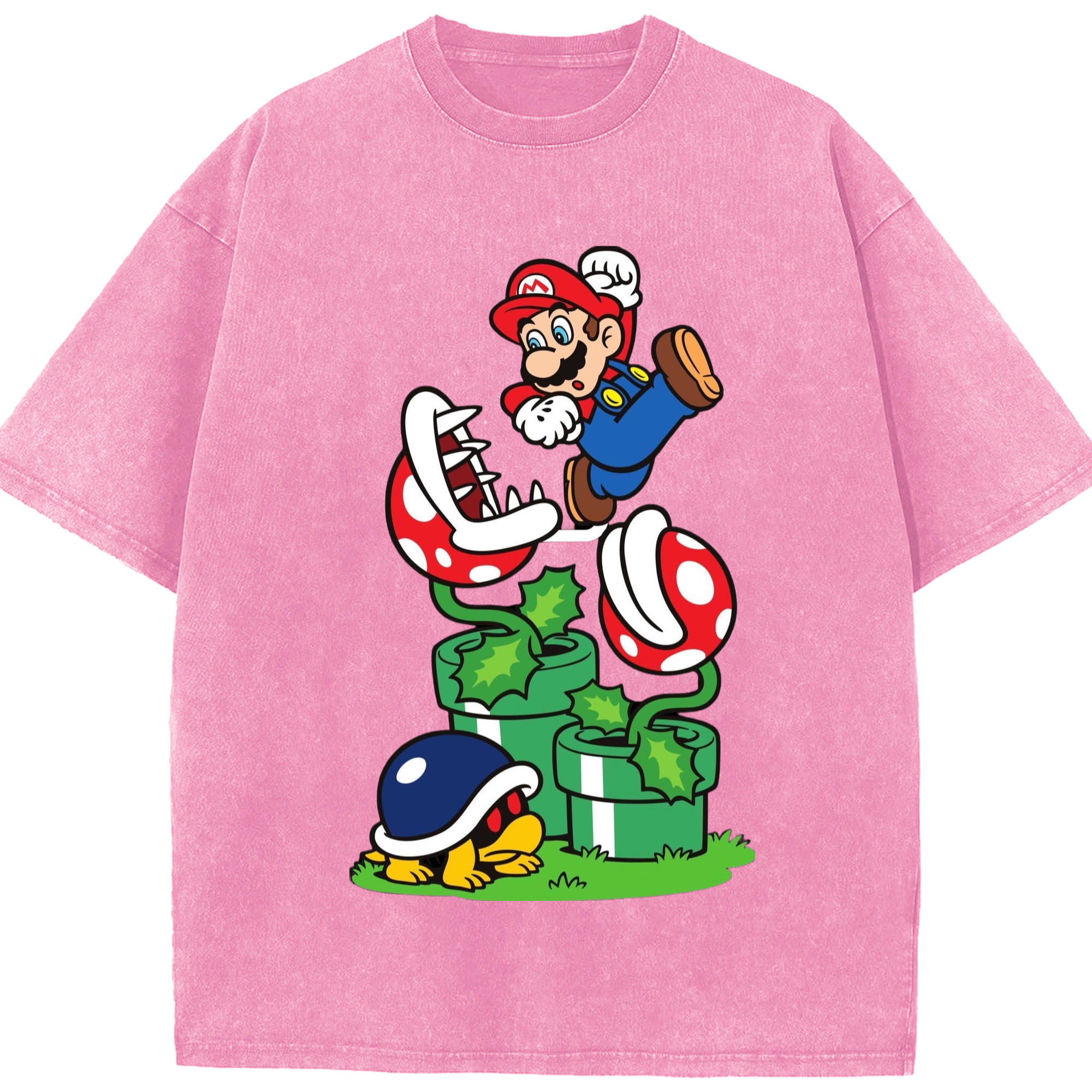 Super Mario 'jumping' Tee - Washed Vintage Look 230g Cotton Oversized T-Shirt With Front Heat Transfer Print – Soft, Lightweight, Stylish Fit – Comfortable Casual Wear For Sports & Everyday Use