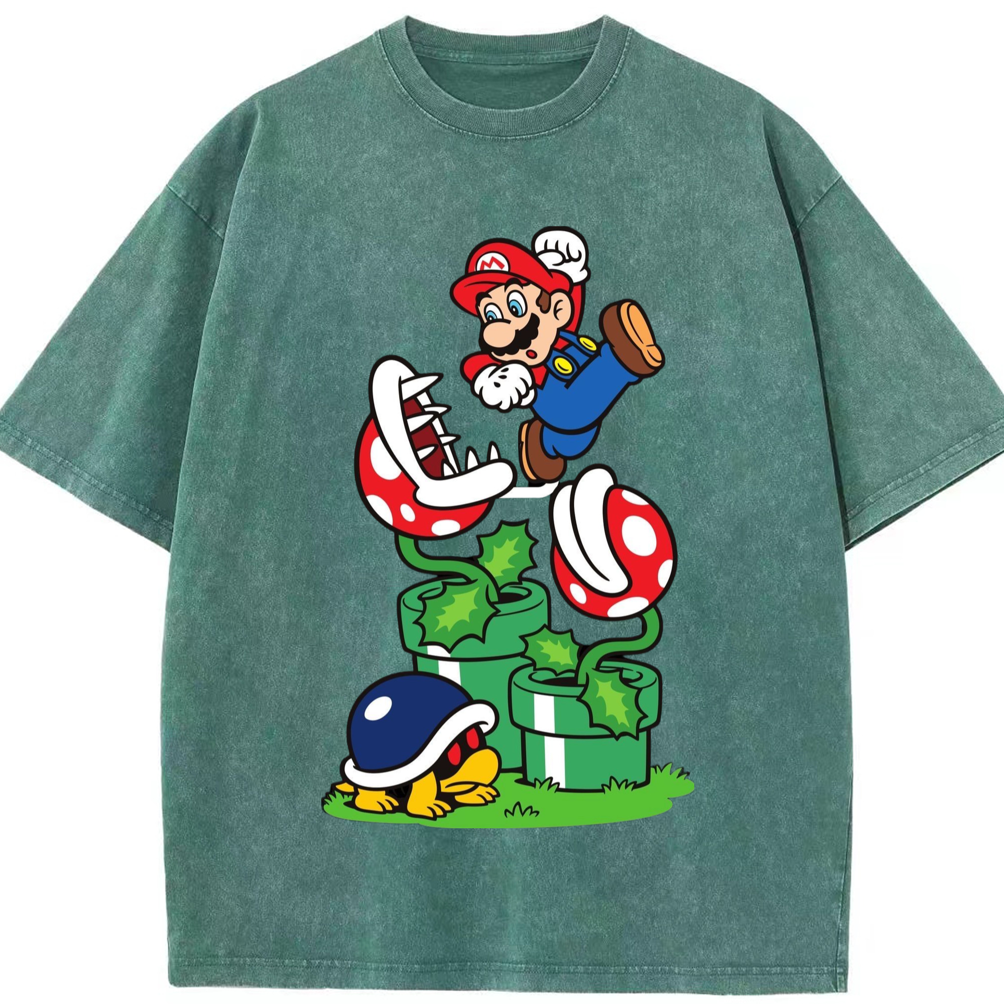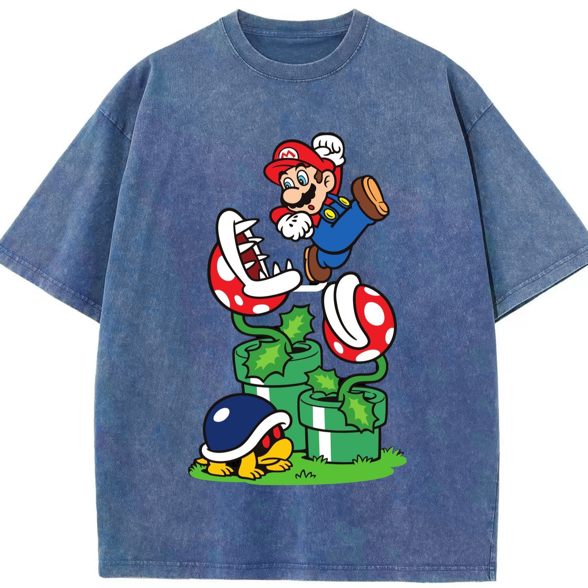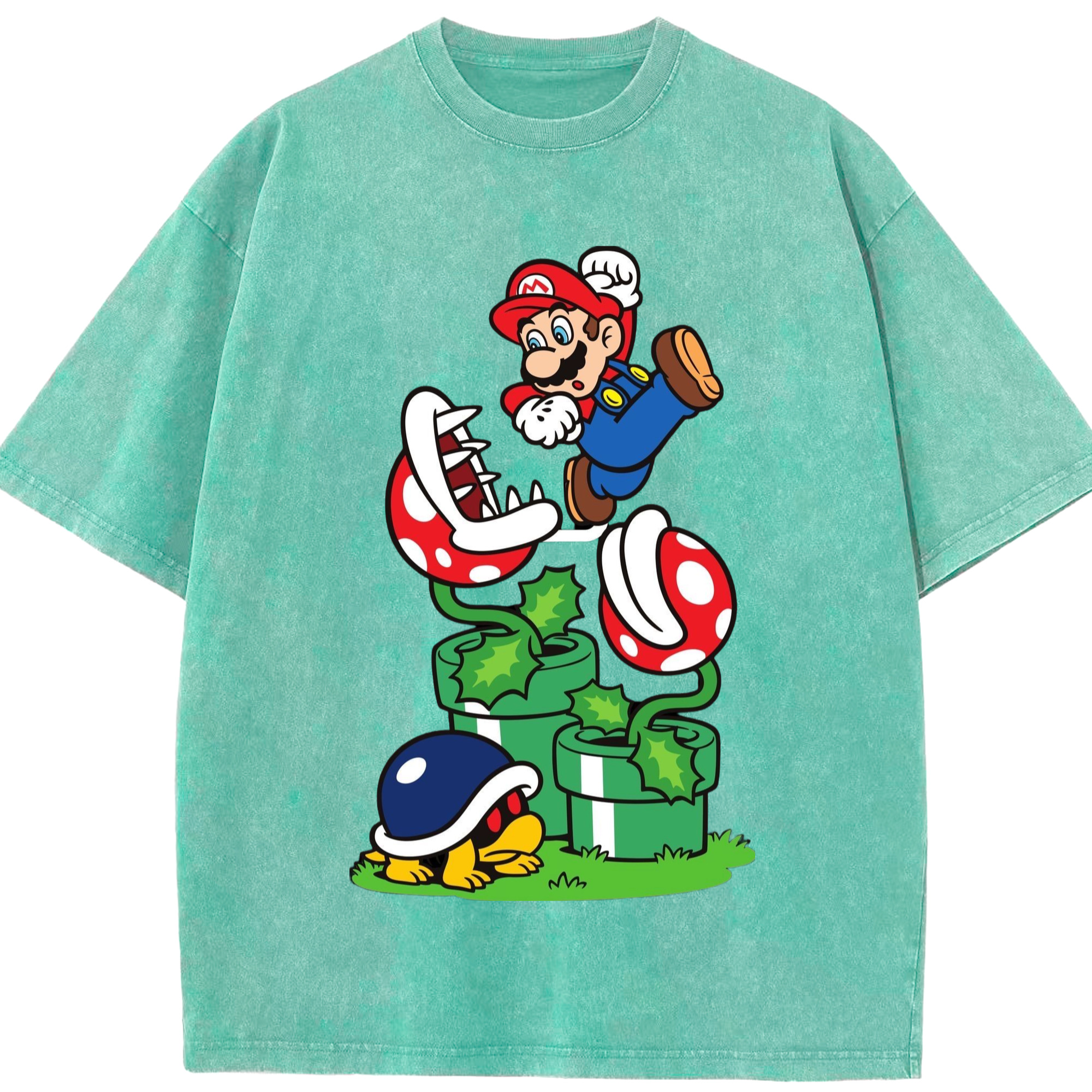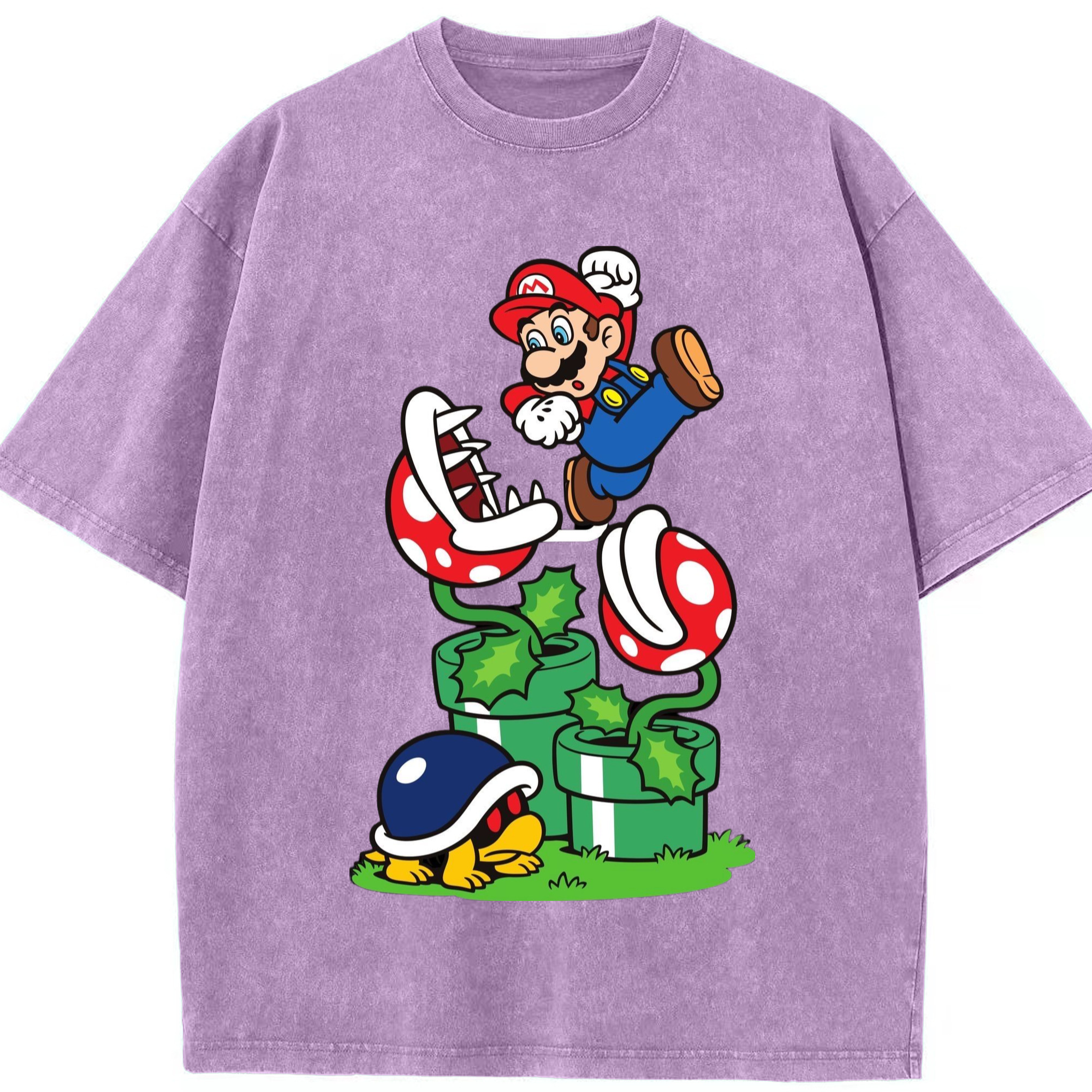 Super Mario 'jumping' Tee - Washed Vintage Look 230g Cotton Oversized T-Shirt With Front Heat Transfer Print – Soft, Lightweight, Stylish Fit – Comfortable Casual Wear For Sports & Everyday Use