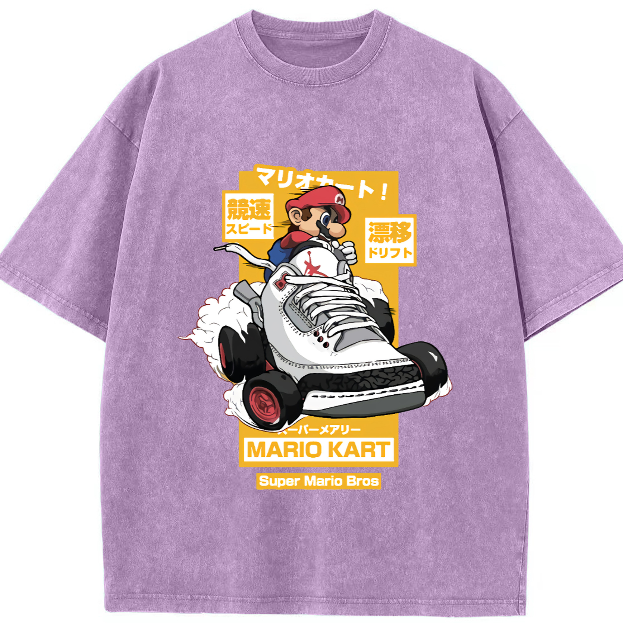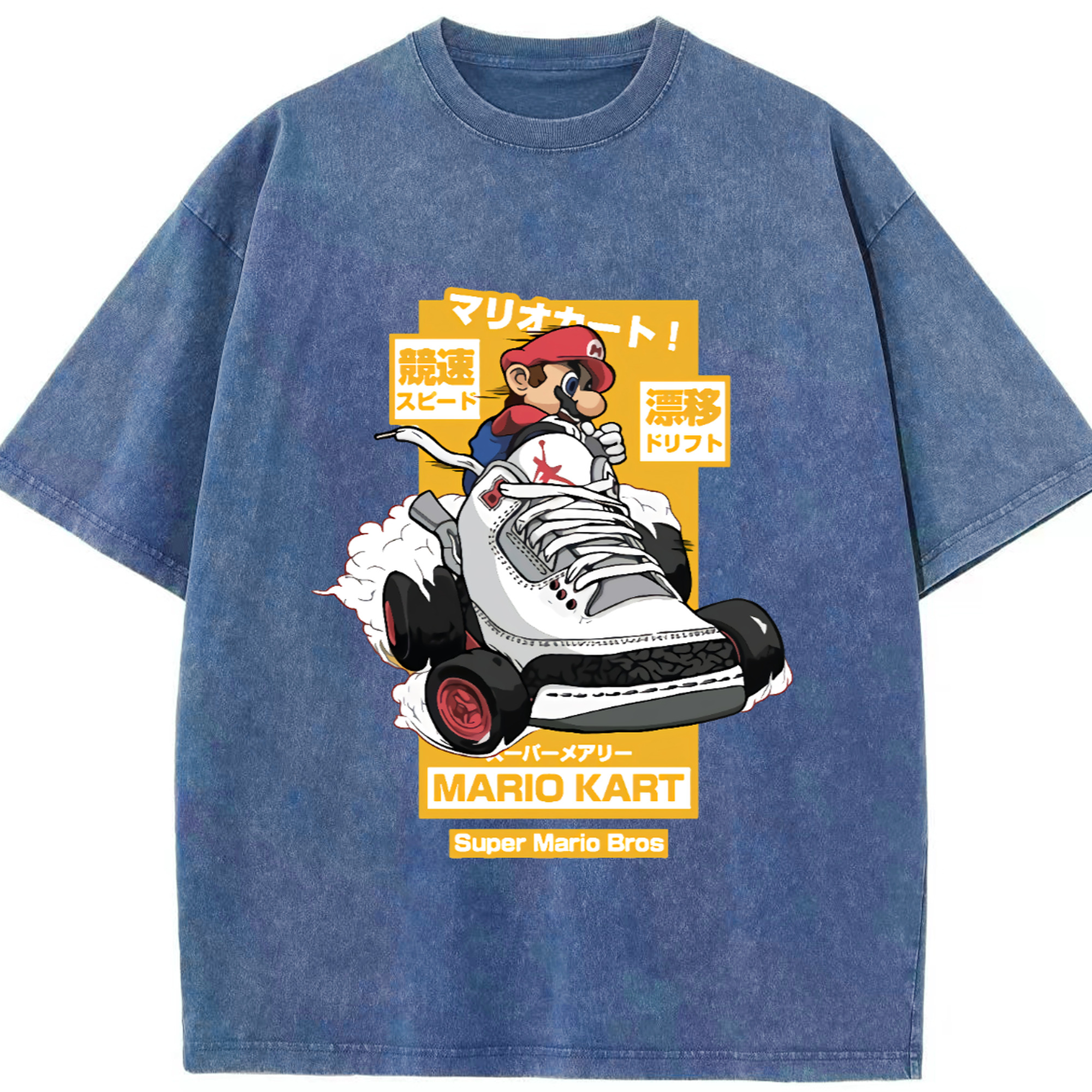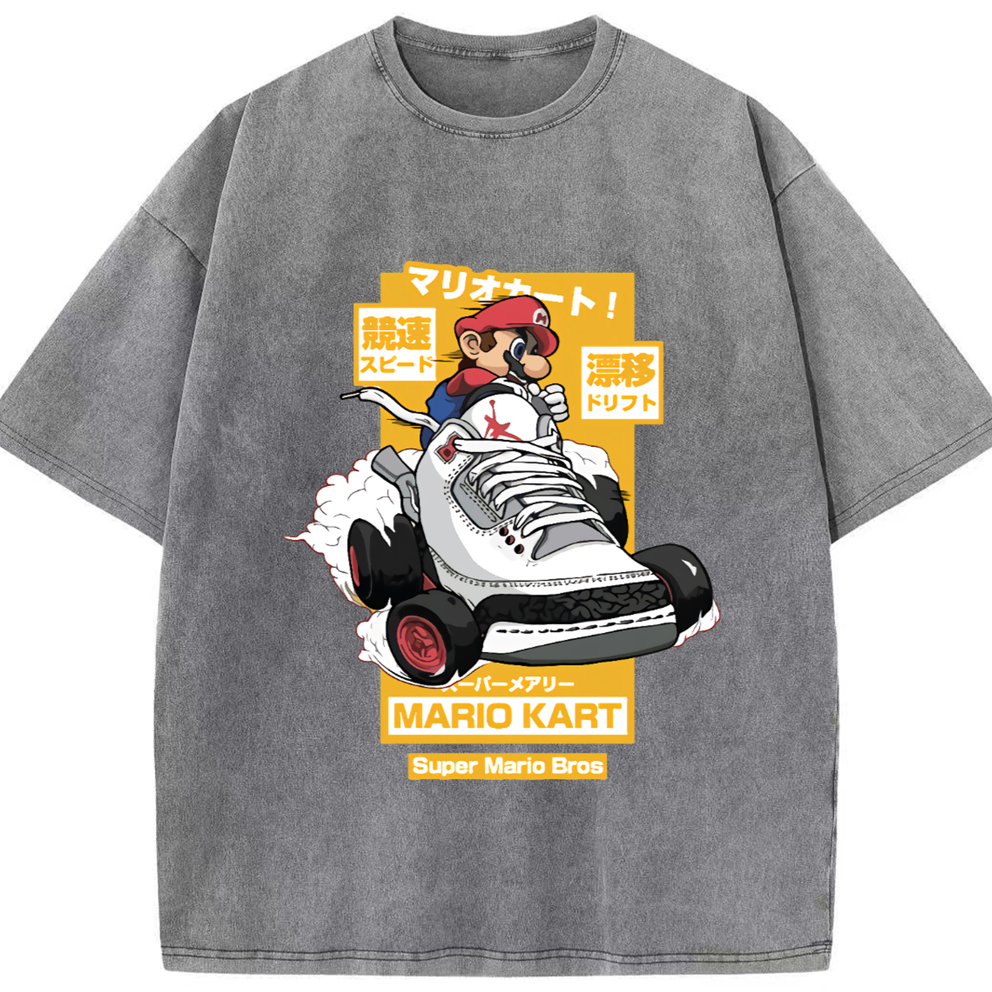 Super Mario 'Shoe car' kart Shirts - Washed Vintage Look 230g Cotton Oversized T-Shirt With Front Heat Transfer Print – Soft, Lightweight, Stylish Fit – Comfortable Casual Wear For Sports & Everyday Use