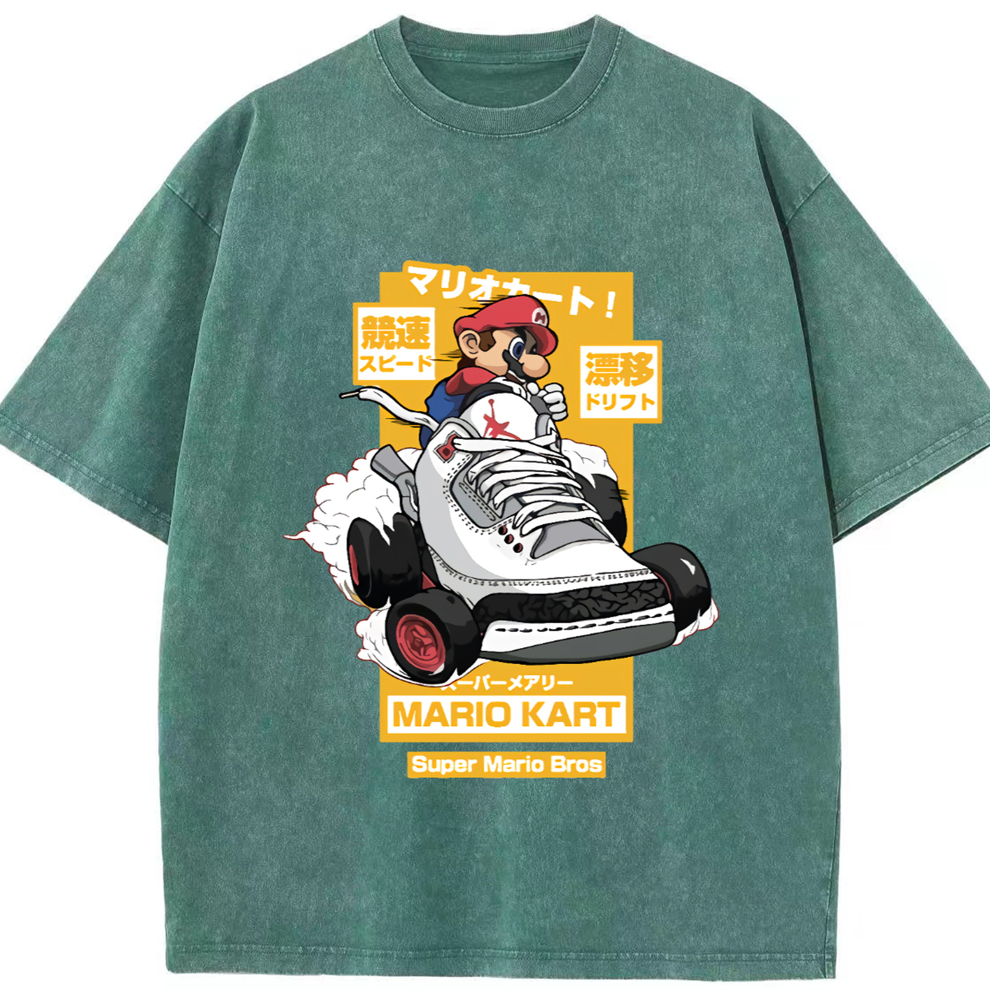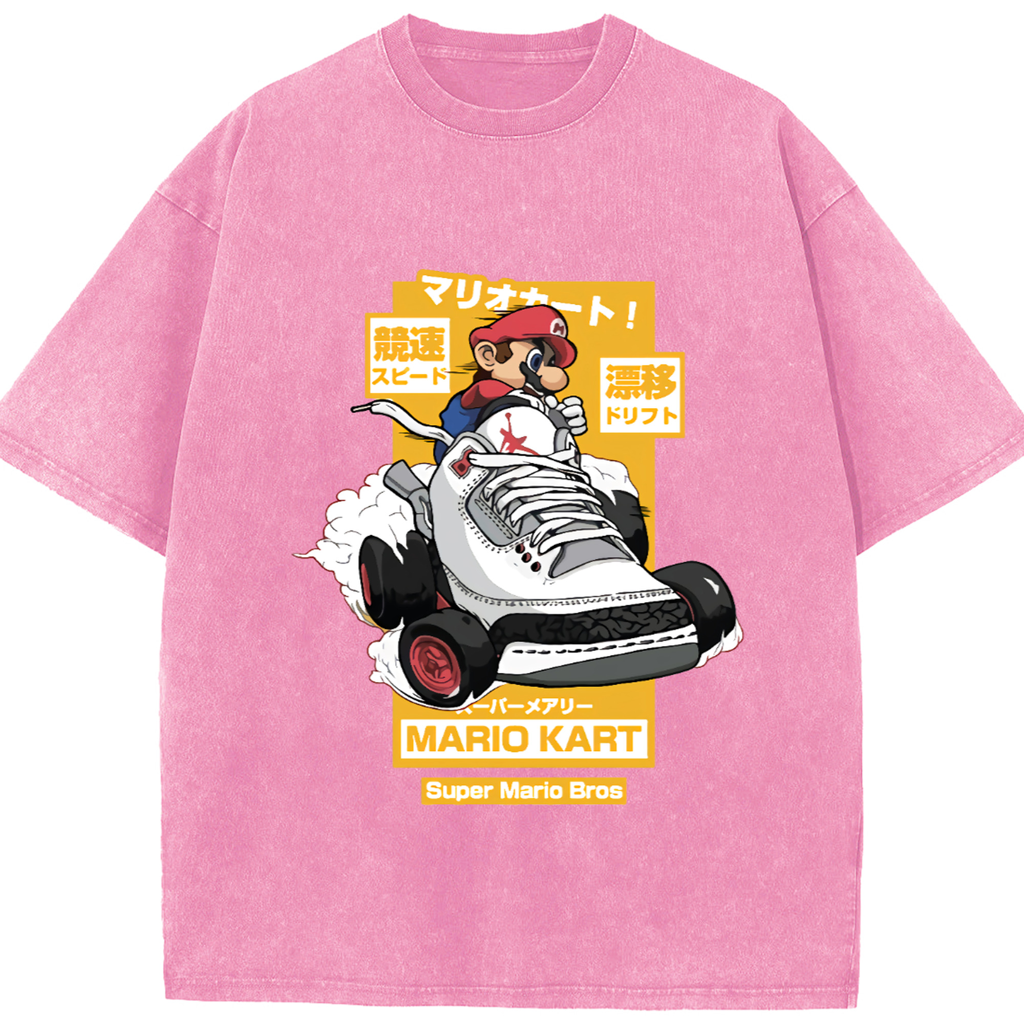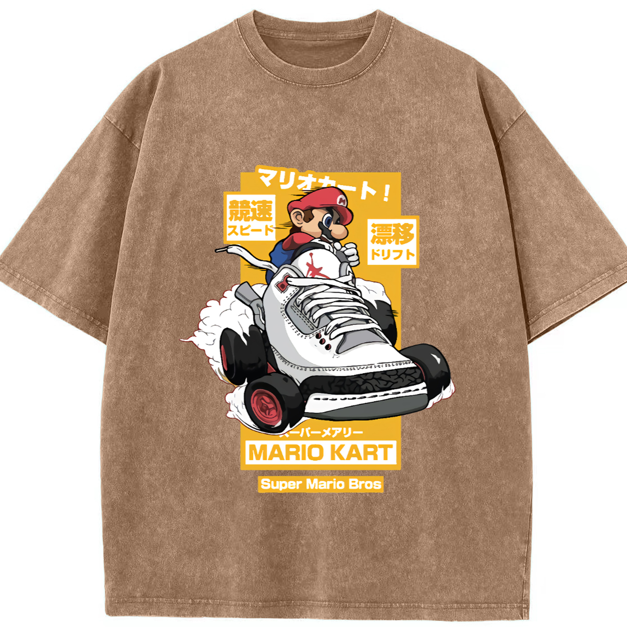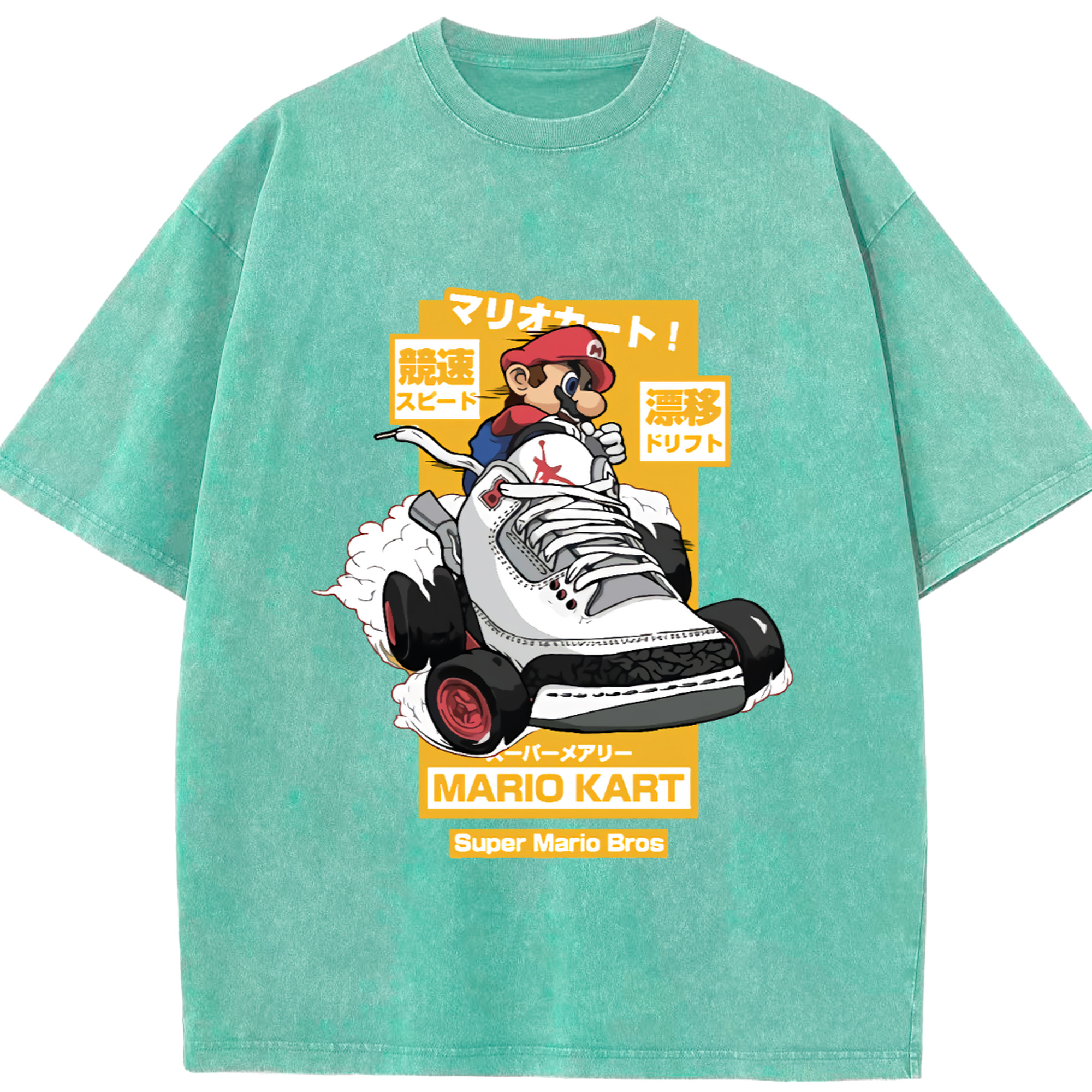 Super Mario 'Shoe car' kart Shirts - Washed Vintage Look 230g Cotton Oversized T-Shirt With Front Heat Transfer Print – Soft, Lightweight, Stylish Fit – Comfortable Casual Wear For Sports & Everyday Use