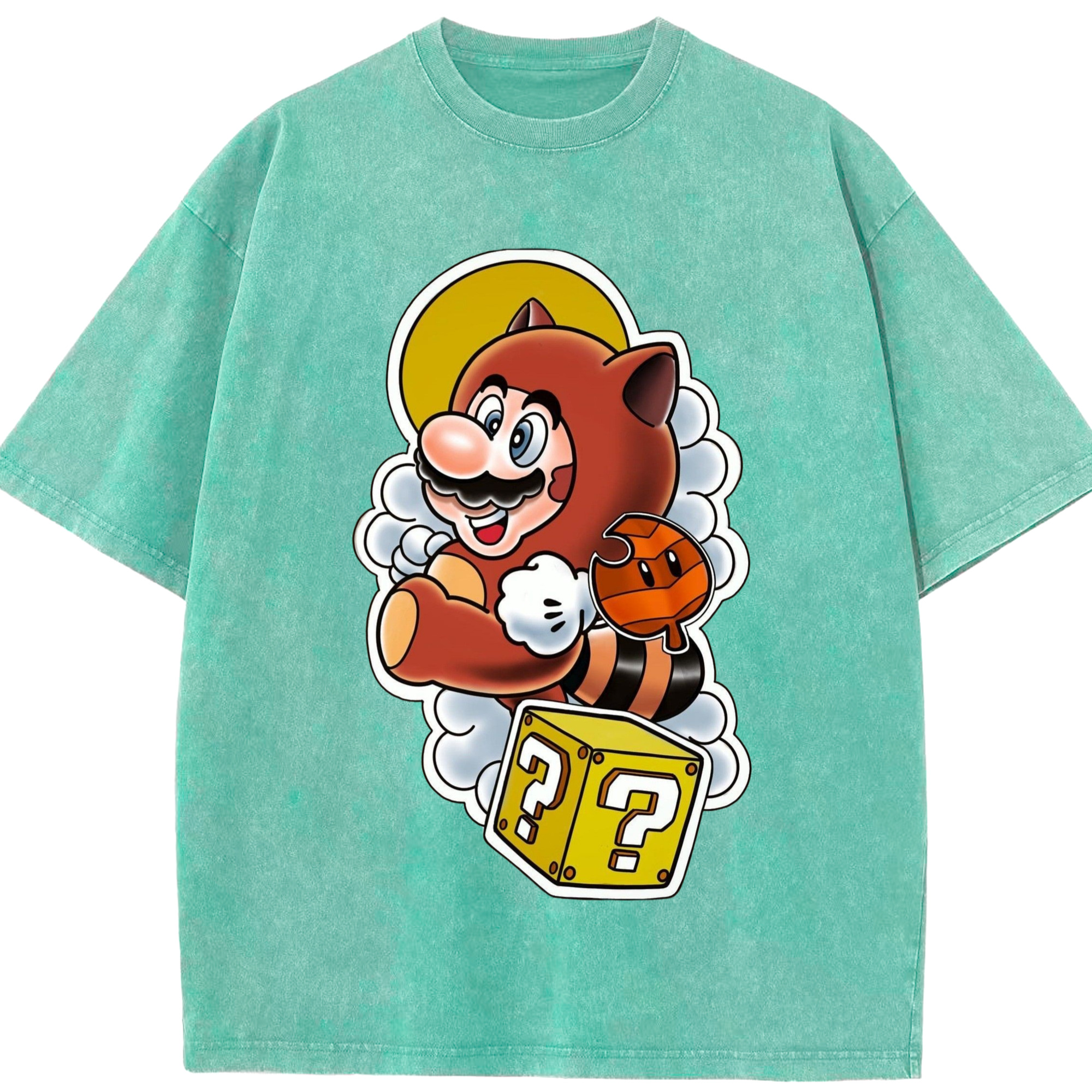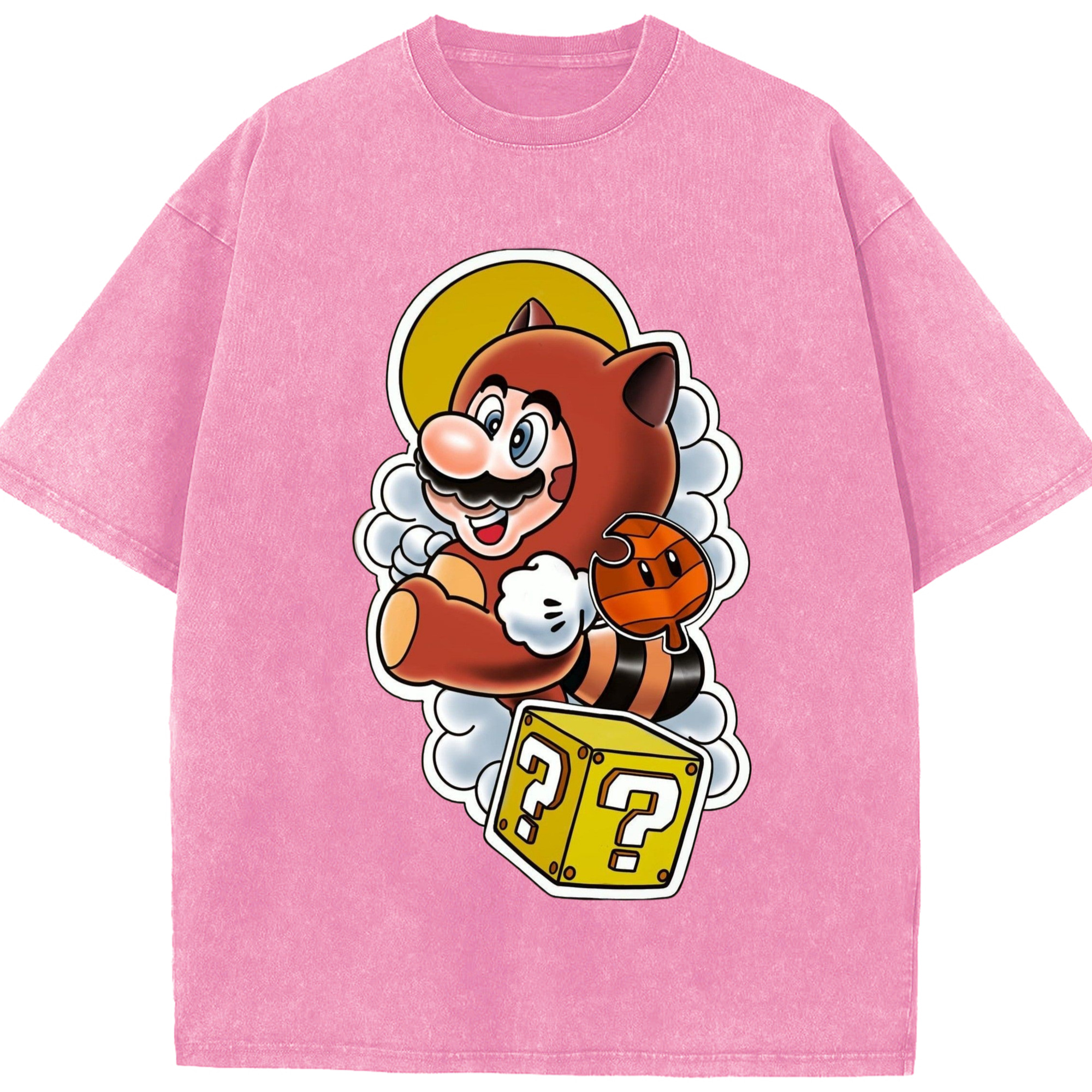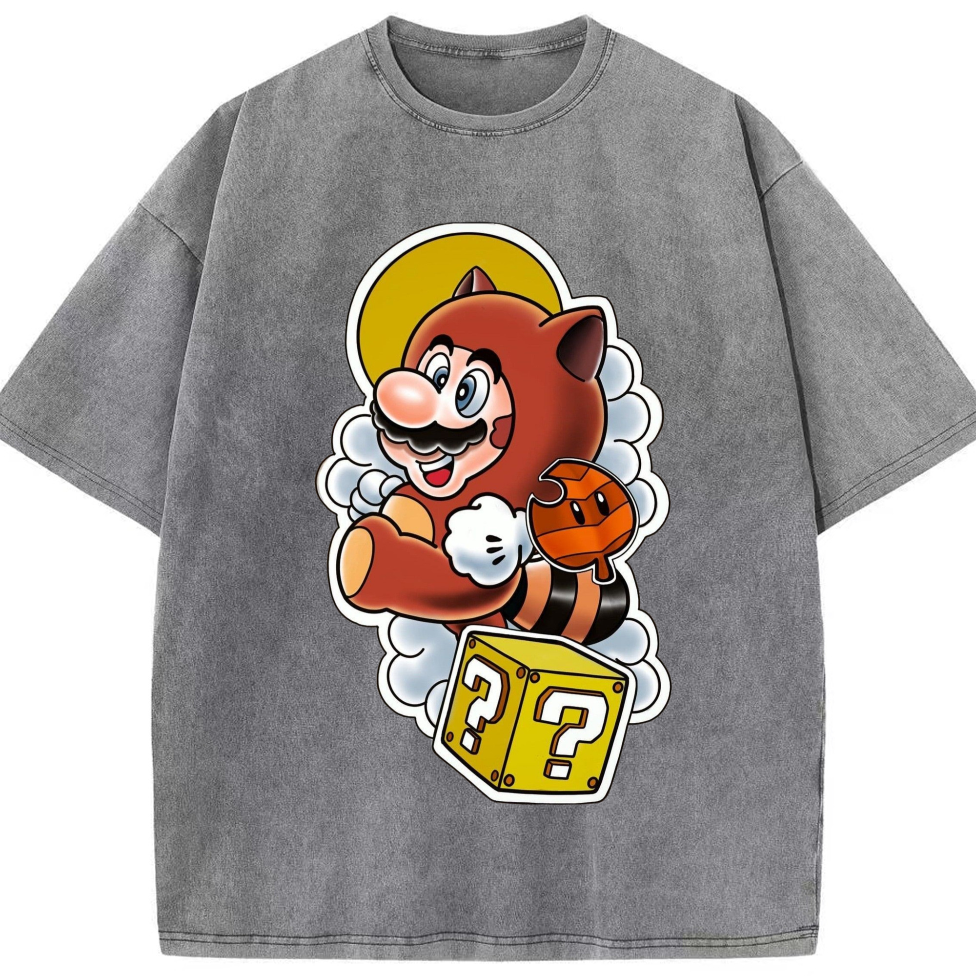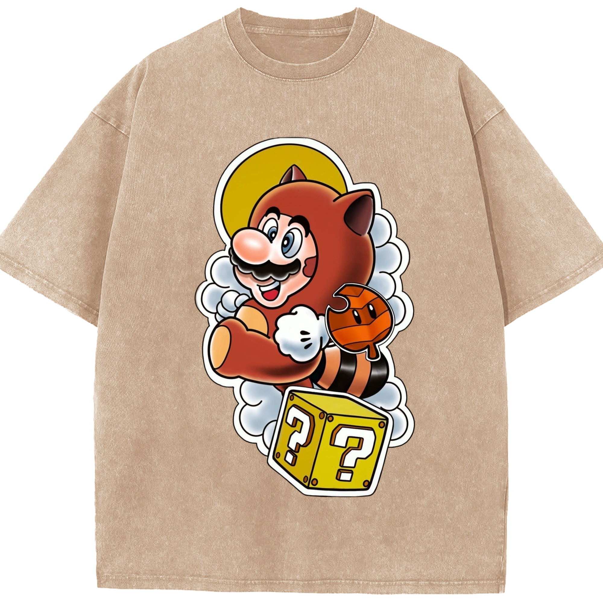 Super Mario raccoon T-shirt - Washed Vintage Look 230g Cotton Oversized T-Shirt With Front Heat Transfer Print – Soft, Lightweight, Stylish Fit – Comfortable Casual Wear For Sports & Everyday Use