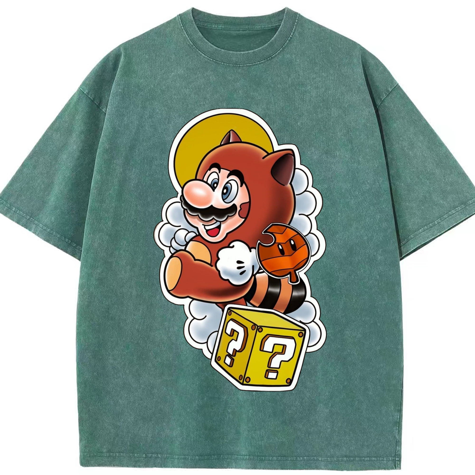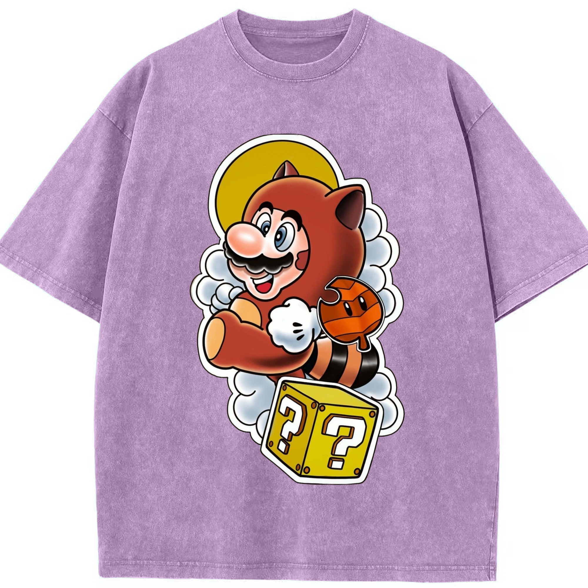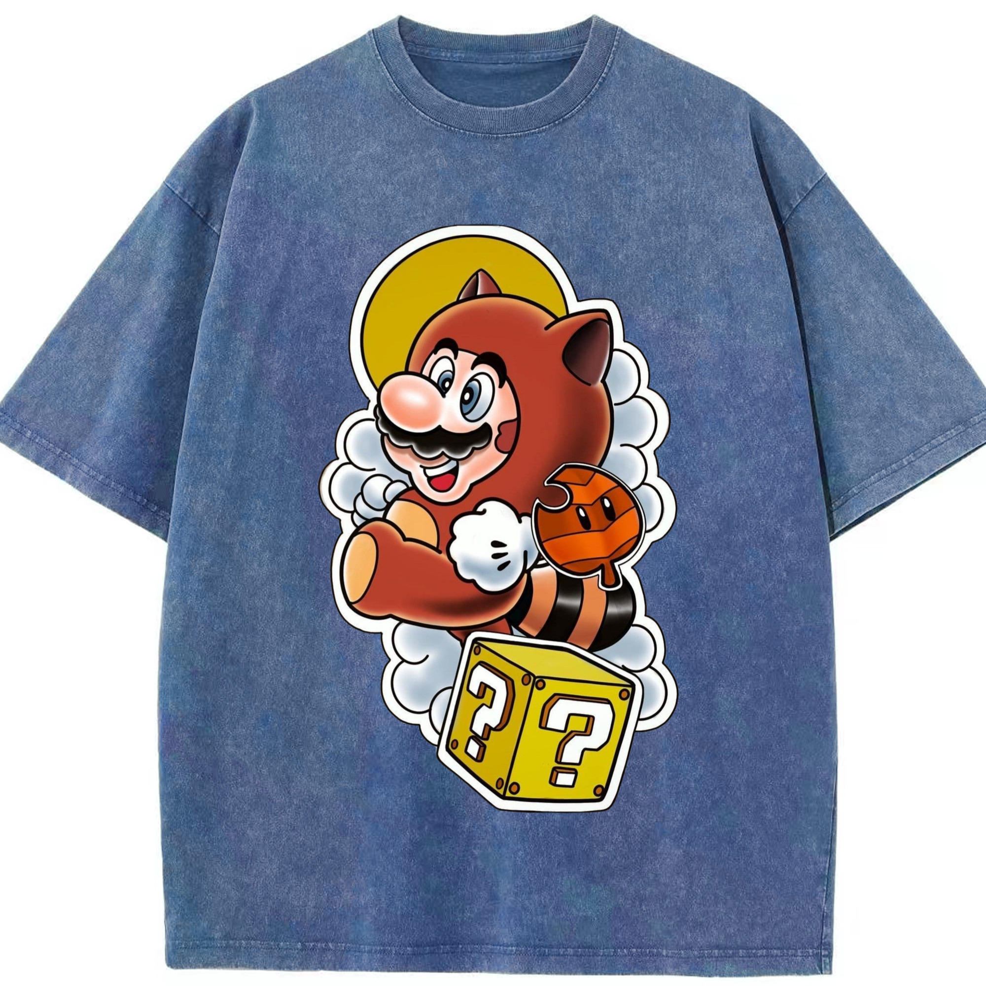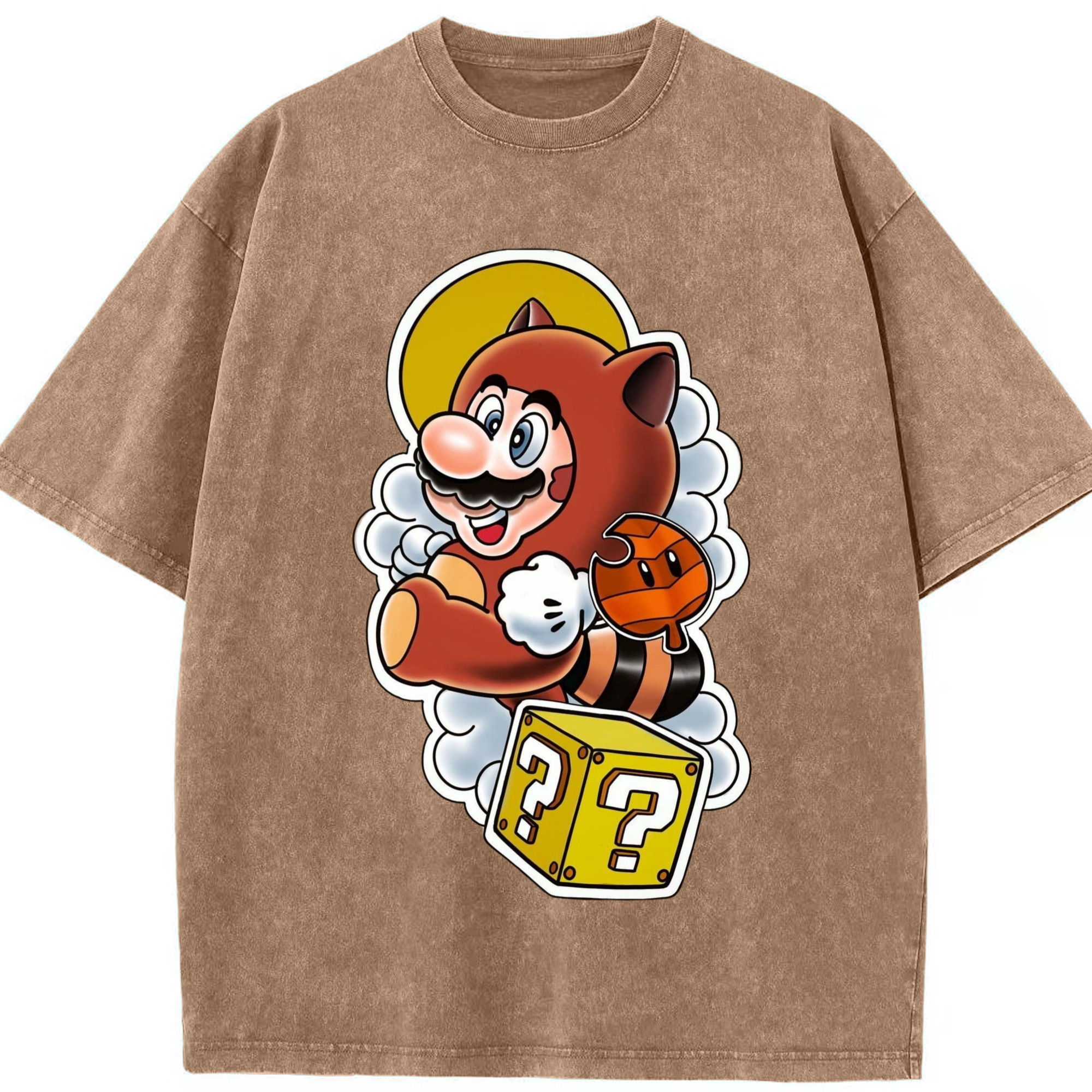 Super Mario raccoon T-shirt - Washed Vintage Look 230g Cotton Oversized T-Shirt With Front Heat Transfer Print – Soft, Lightweight, Stylish Fit – Comfortable Casual Wear For Sports & Everyday Use